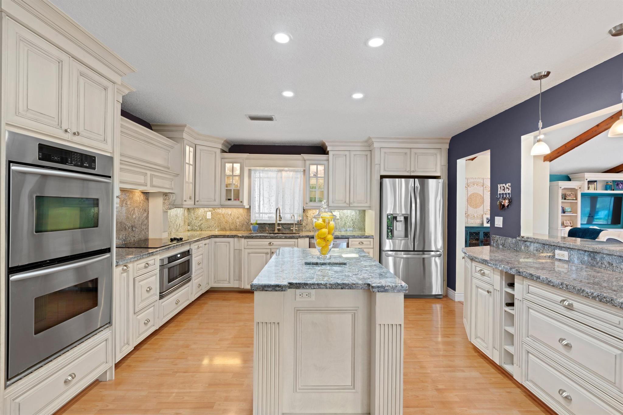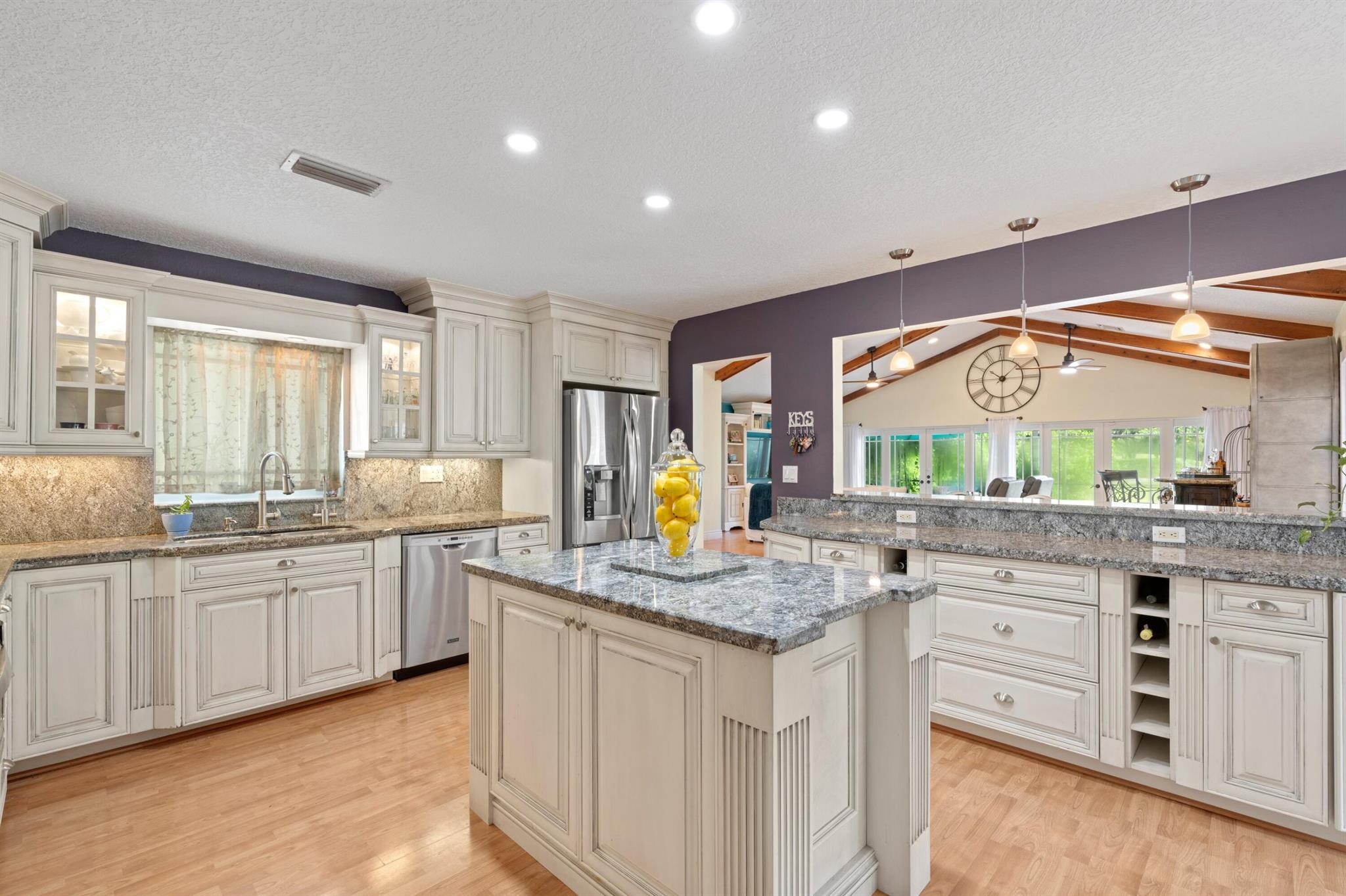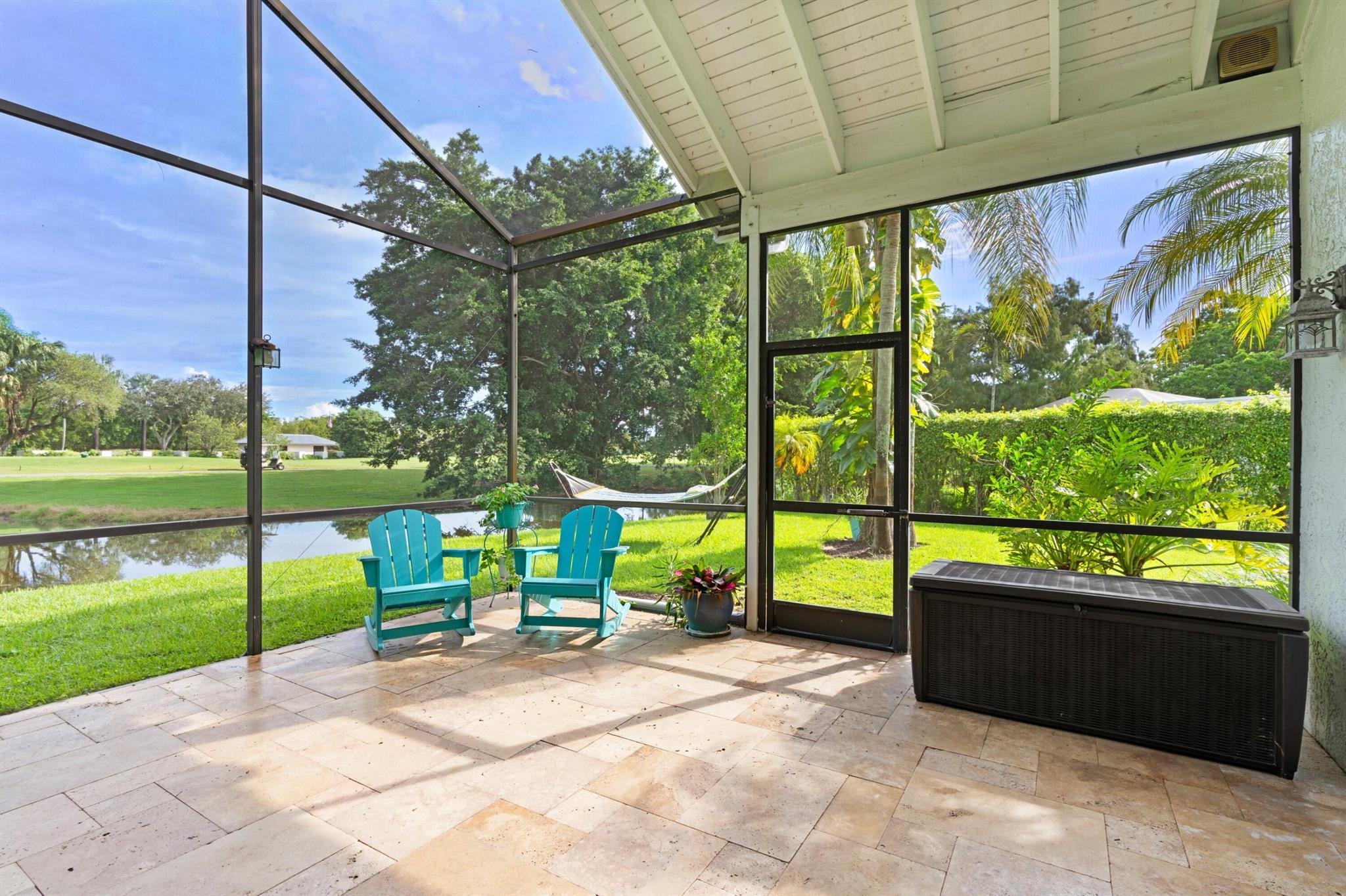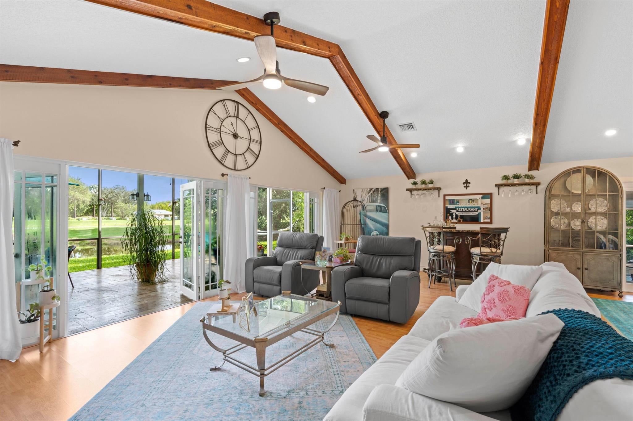 Experience life in a beautiful golf and tennis community without the steep membership fees. This gorgeous 3-bedroom, 2.5-bathroom home delivers breathtaking lakefront views and elegant interiors, ideal for relaxation and entertainment. Located on a quarter-acre lot, there's ample space for a pool. The kitchen is a chef's paradise, featuring top-notch stainless appliances, including double ovens, a huge pantry, and a large island that serves as a central gathering point. The open-concept living area is accented with high wood beam ceilings, offering a spacious ambiance while framing picturesque lake views through a screened patio. For safety and uninterrupted enjoyment, the home boasts impact glass windows and doors. The primary suite is a luxurious retreat, complete with ample closet