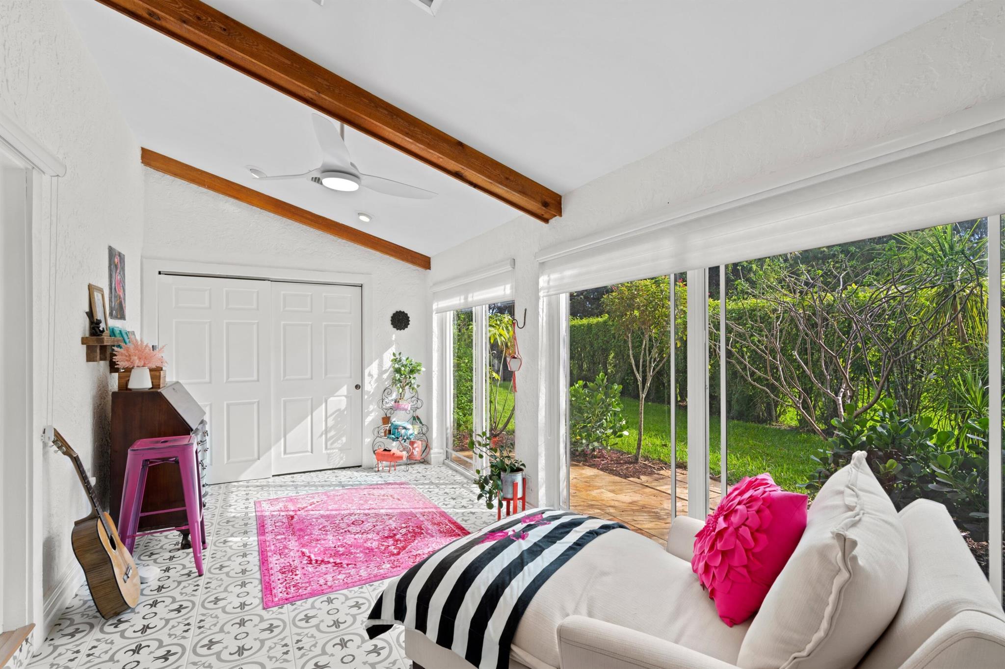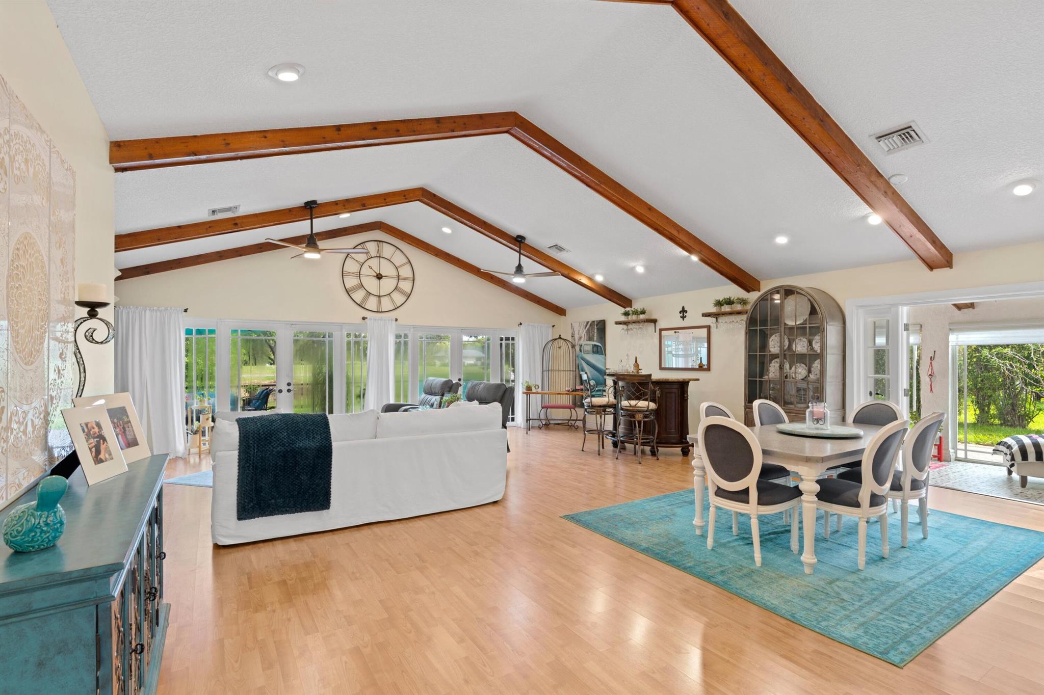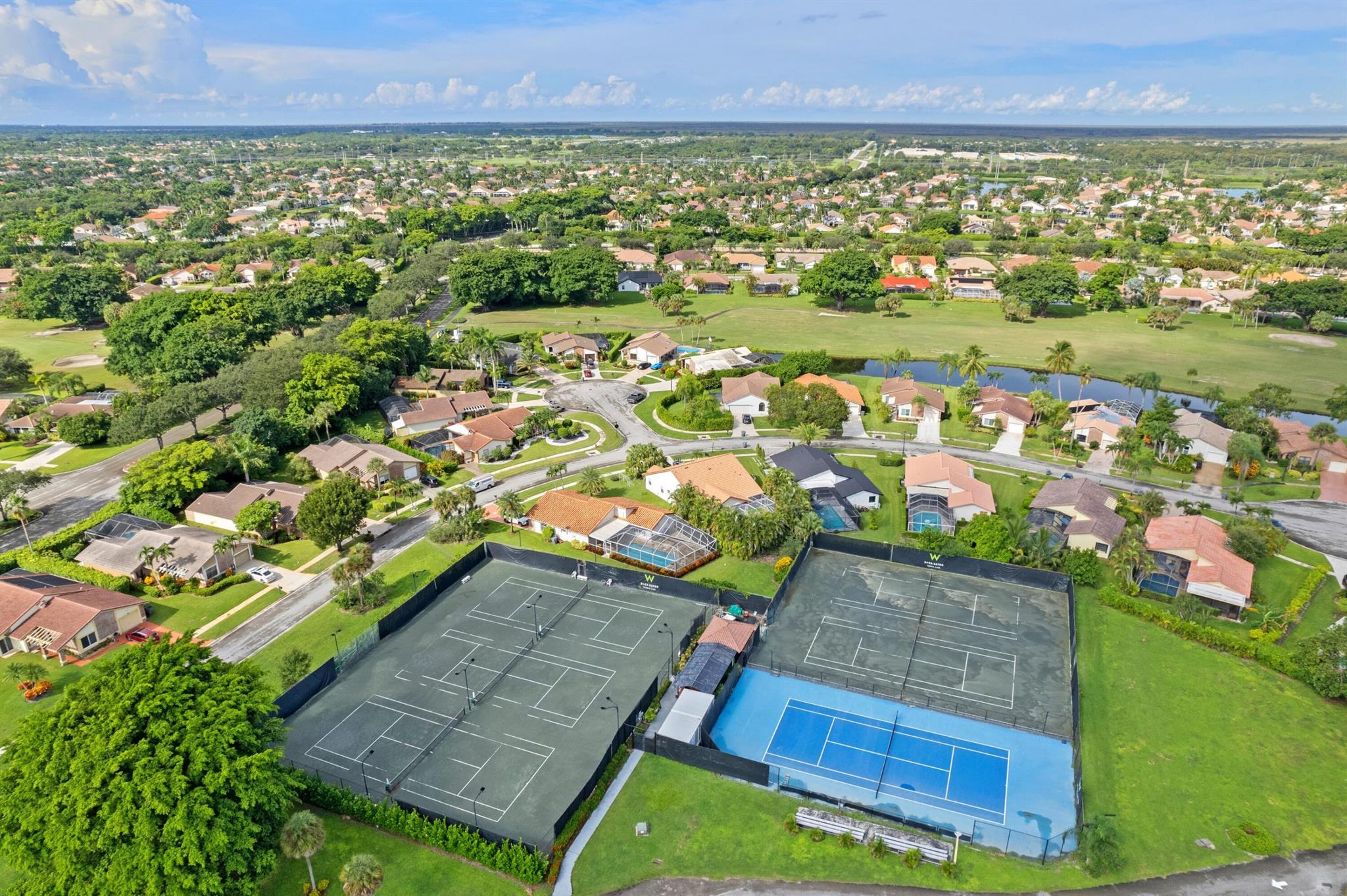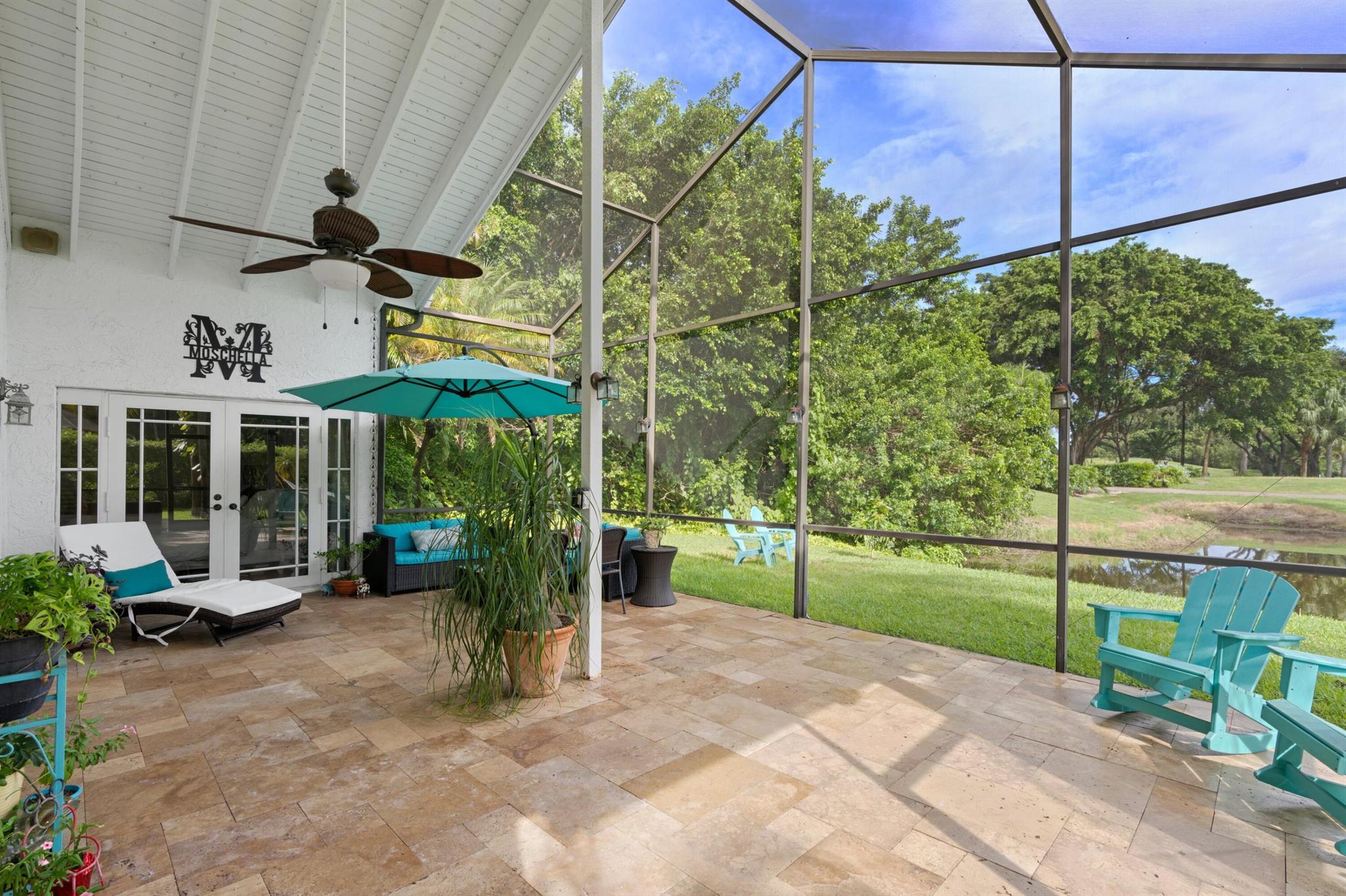 Experience life in a beautiful golf and tennis community without the steep membership fees. This gorgeous 3-bedroom, 2.5-bathroom home delivers breathtaking lakefront views and elegant interiors, ideal for relaxation and entertainment. Located on a quarter-acre lot, there's ample space for a pool. The kitchen is a chef's paradise, featuring top-notch stainless appliances, including double ovens, a huge pantry, and a large island that serves as a central gathering point. The open-concept living area is accented with high wood beam ceilings, offering a spacious ambiance while framing picturesque lake views through a screened patio. For safety and uninterrupted enjoyment, the home boasts impact glass windows and doors. The primary suite is a luxurious retreat, complete with ample closet