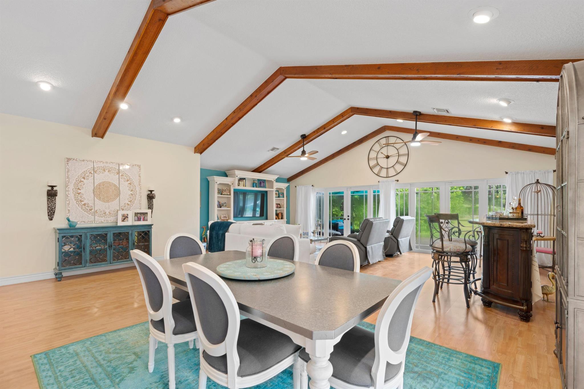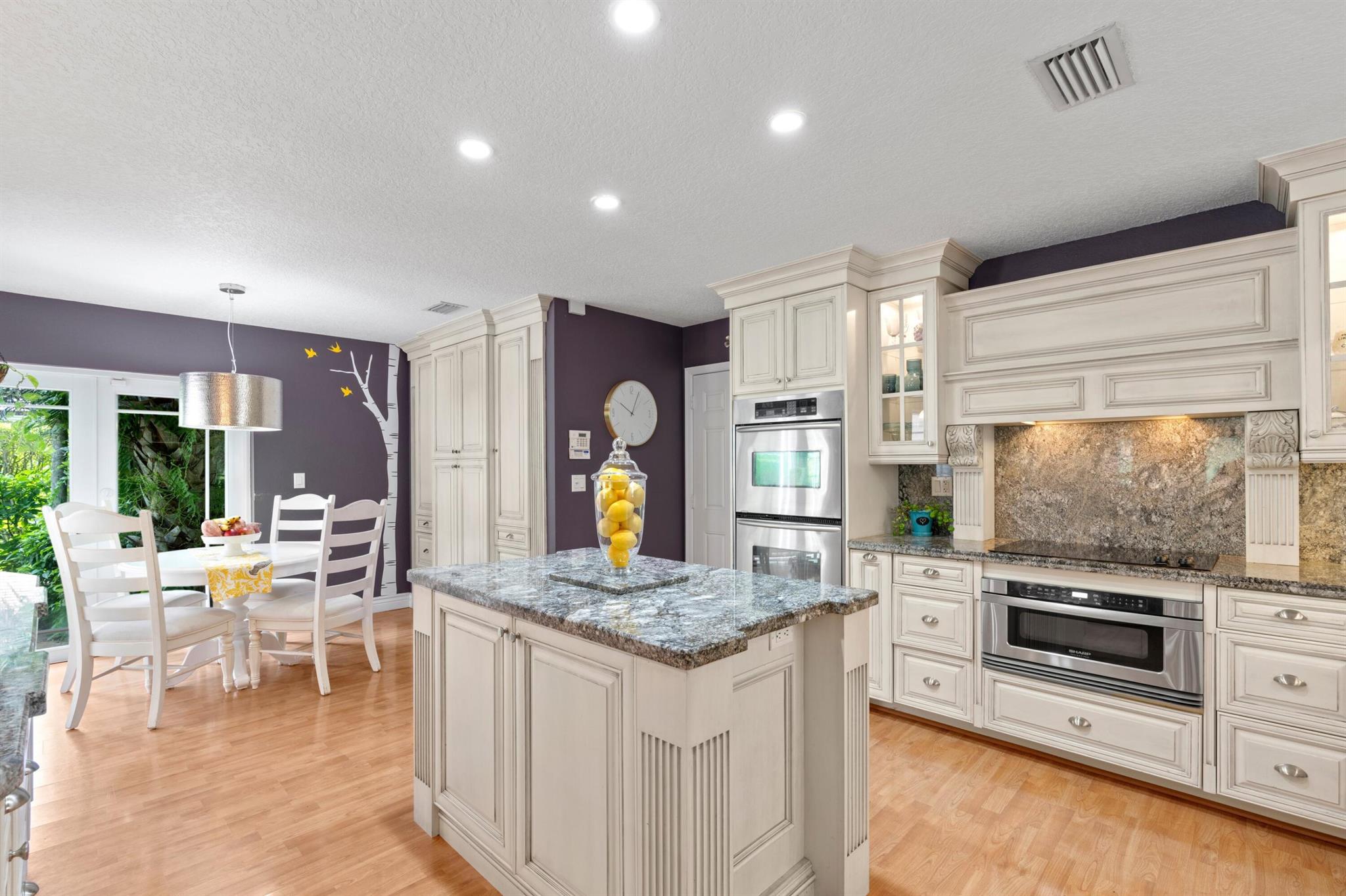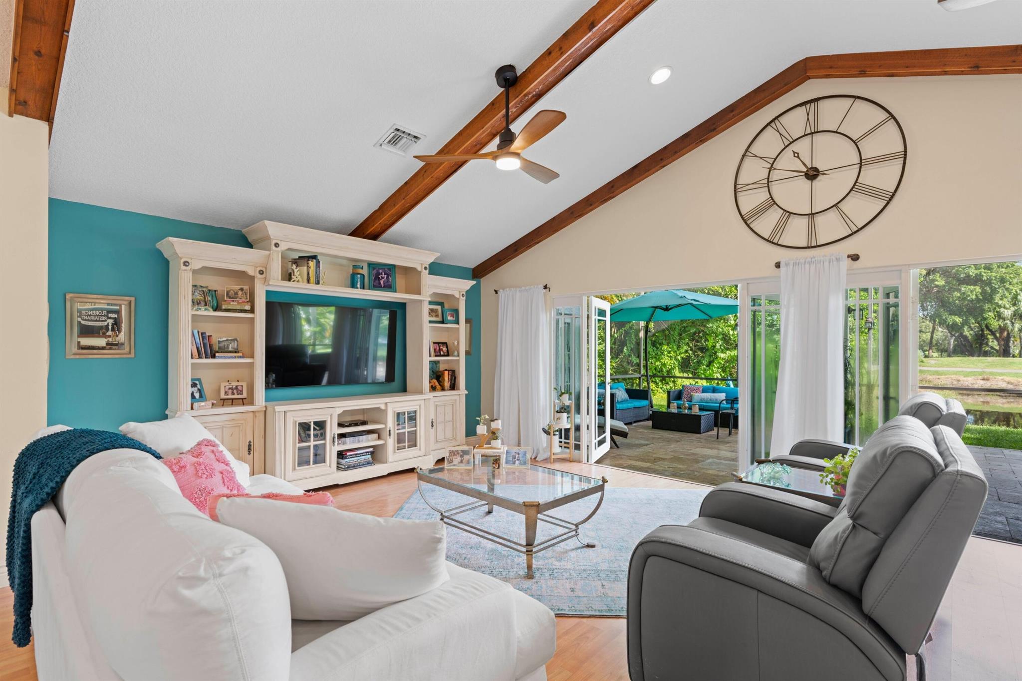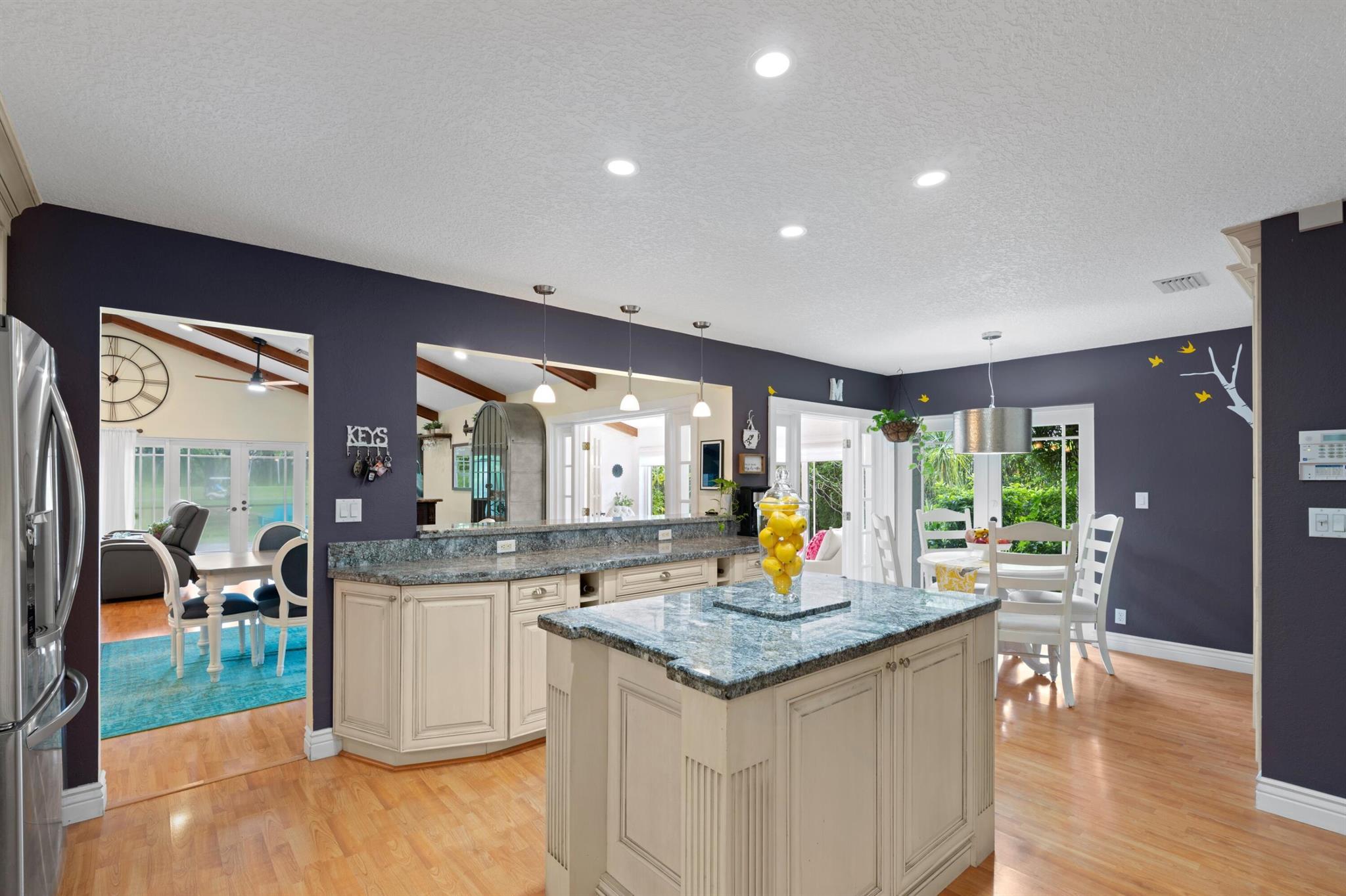 Experience life in a beautiful golf and tennis community without the steep membership fees. This gorgeous 3-bedroom, 2.5-bathroom home delivers breathtaking lakefront views and elegant interiors, ideal for relaxation and entertainment. Located on a quarter-acre lot, there's ample space for a pool. The kitchen is a chef's paradise, featuring top-notch stainless appliances, including double ovens, a huge pantry, and a large island that serves as a central gathering point. The open-concept living area is accented with high wood beam ceilings, offering a spacious ambiance while framing picturesque lake views through a screened patio. For safety and uninterrupted enjoyment, the home boasts impact glass windows and doors. The primary suite is a luxurious retreat, complete with ample closet