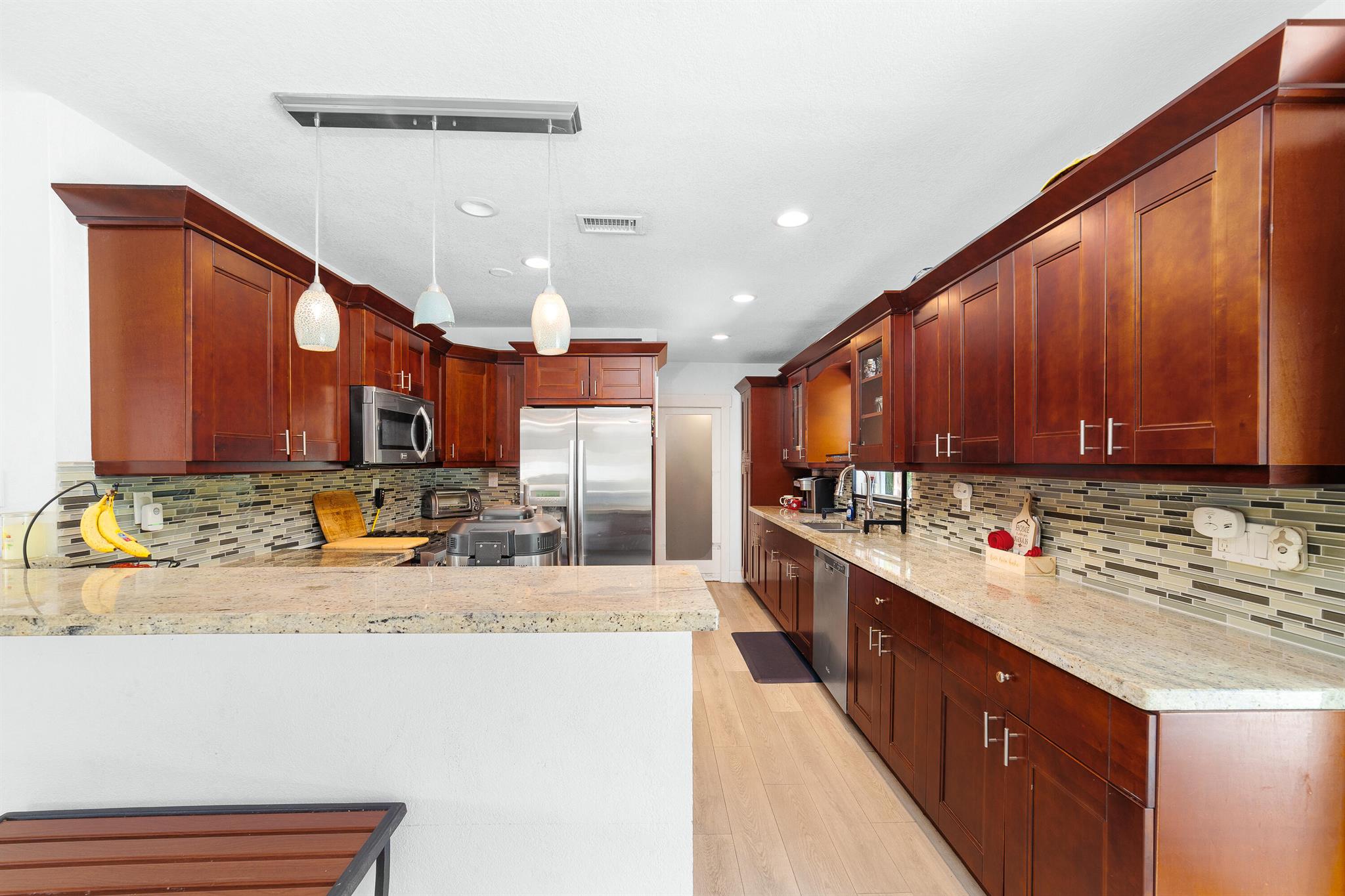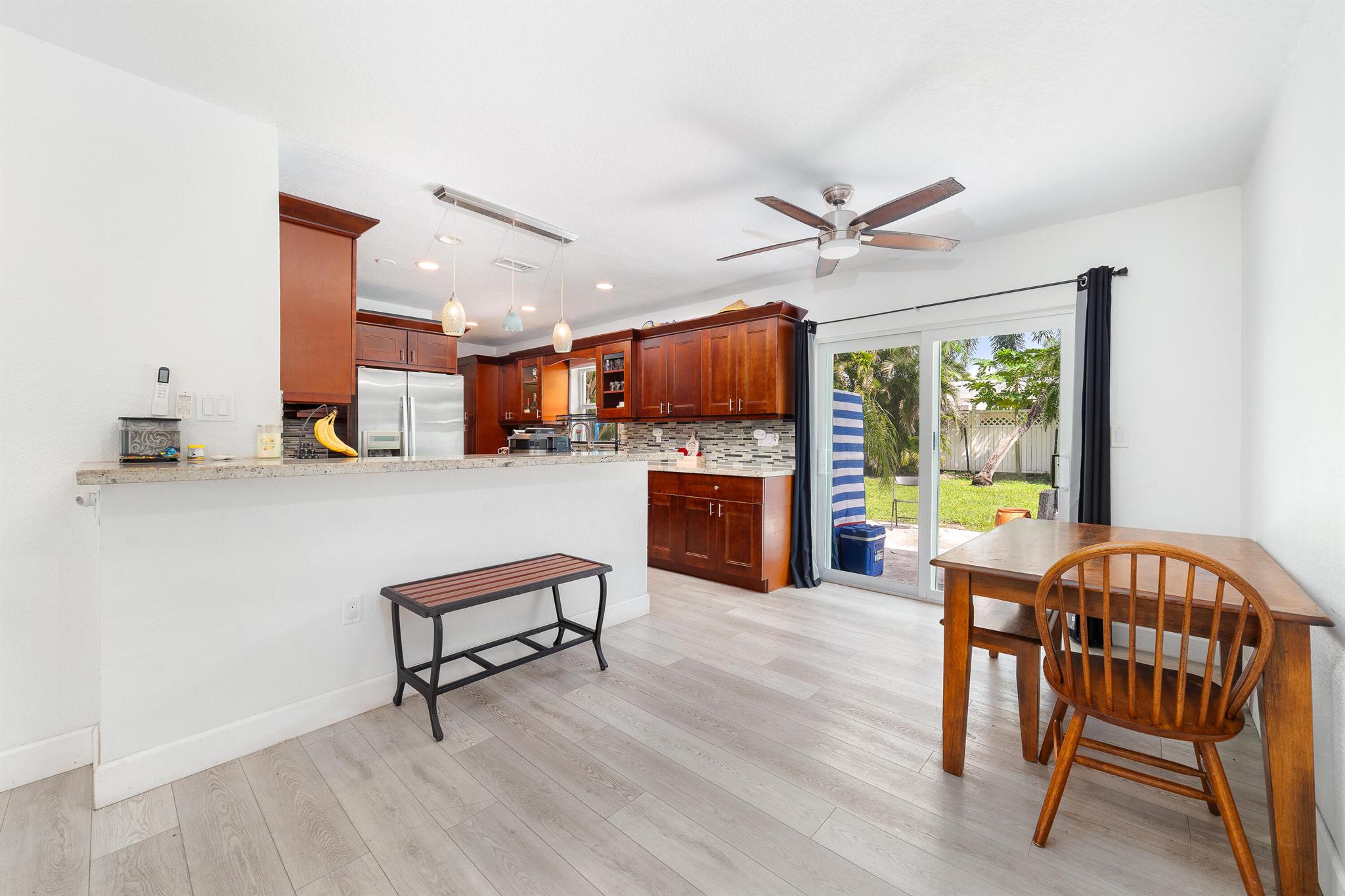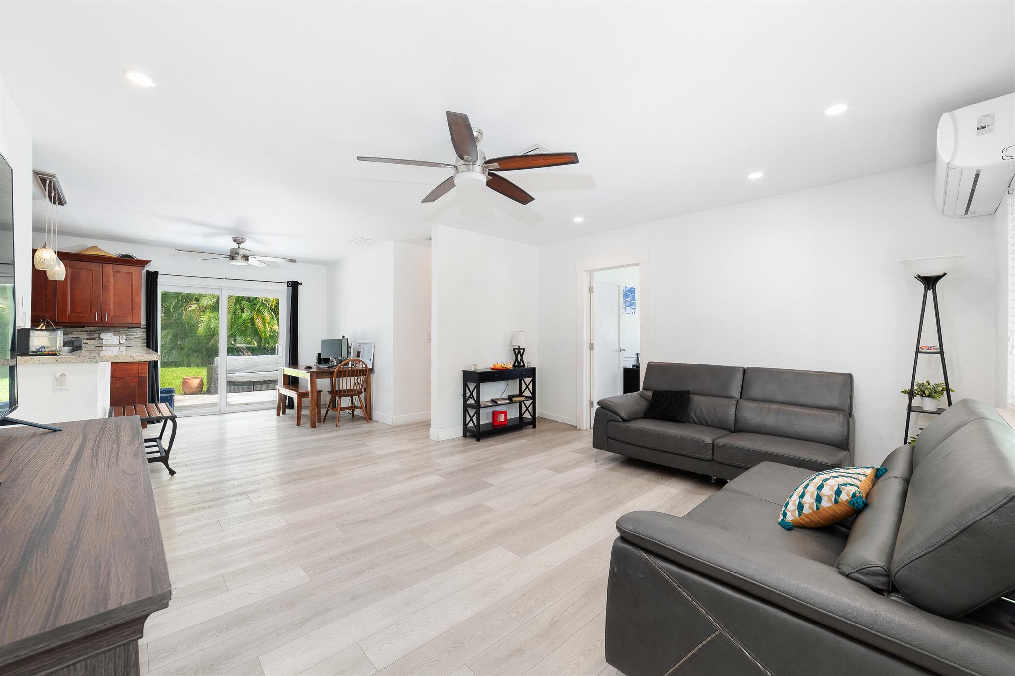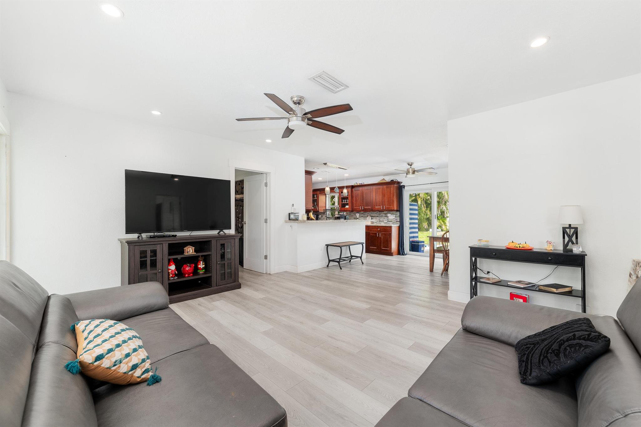 This stunning, fully renovated 3-bedroom, 2-bathroom home is located on a cul-de-sac. The home features an open floor plan, allowing an abundance of natural light. The gourmet kitchen showcases custom cherry cabinetry, granite countertops, a stylish tile backsplash, and all stainless steel appliances, including a double sink. The new custom vinyl flooring throughout the home adds a sleek and contemporary touch, while the separate laundry room adds convenience. Full impact doors and windows not only enhance the home's safety but also contribute to energy efficiency, helping reduce insurance and cooling costs. Home has central a/c and mini splits to further save energy!