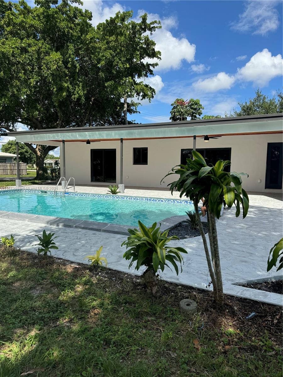 Stunning corner pool home, 2 bedrooms, 2 bathrooms, and a 1-car garage, which can easily convert into an additional room. Offering 1,687 sq. ft. of living space (1,530 under AC + 158 sqf of covered Patio with new Flat roof) the layout is perfect and comfortable for living and entertaining. Kitchen is equipped with new stainless steel appliances, and the expansive 10,666 sq. ft. backyard provides ample space for outdoor enjoyment. New Impact Windows and Doors. No HOA and all ages welcome. Located in a peaceful neighborhood, steps from a community park, and close to shopping and highways.