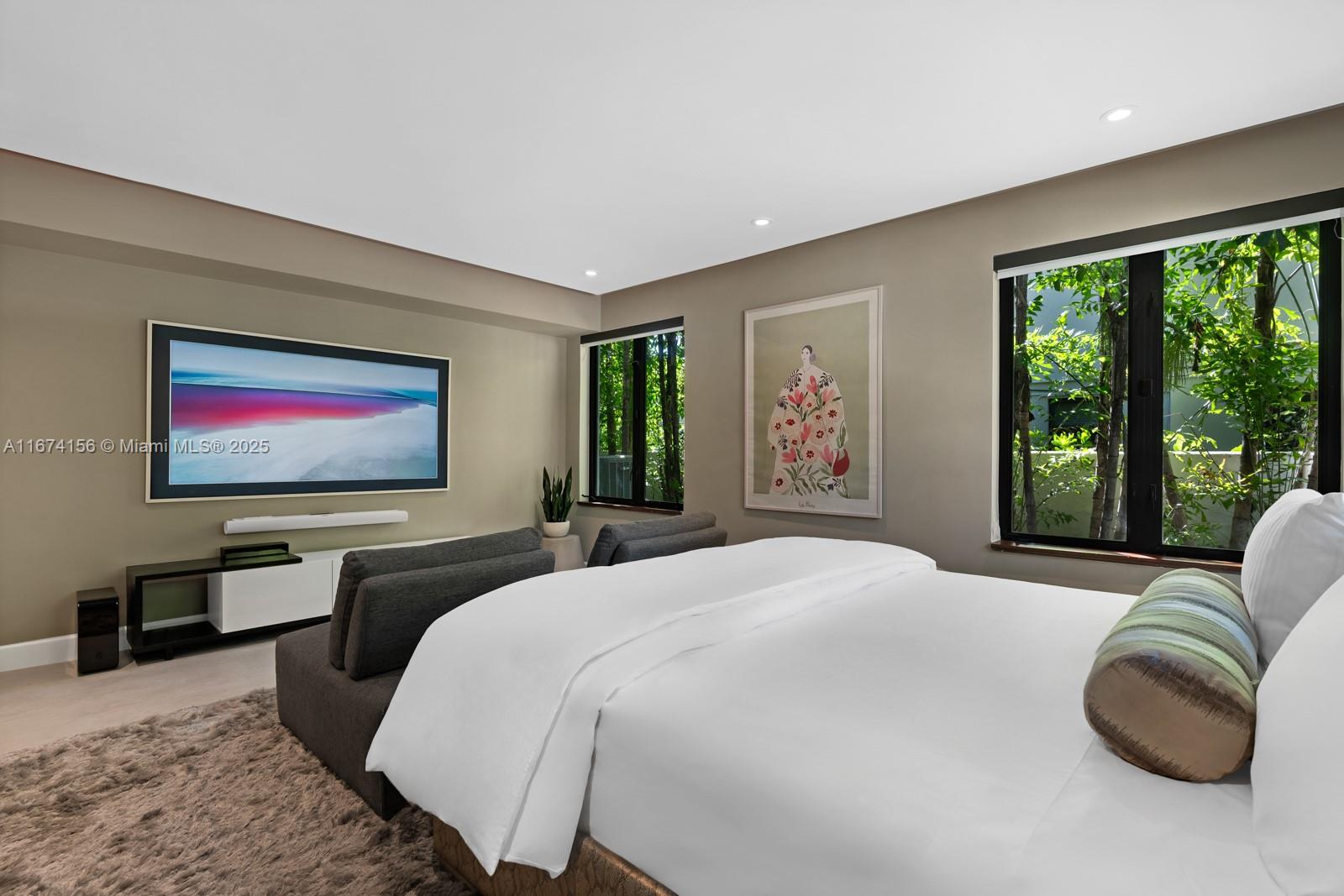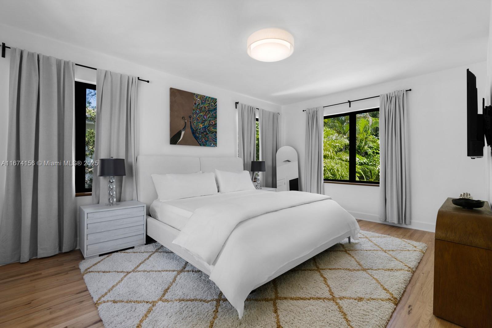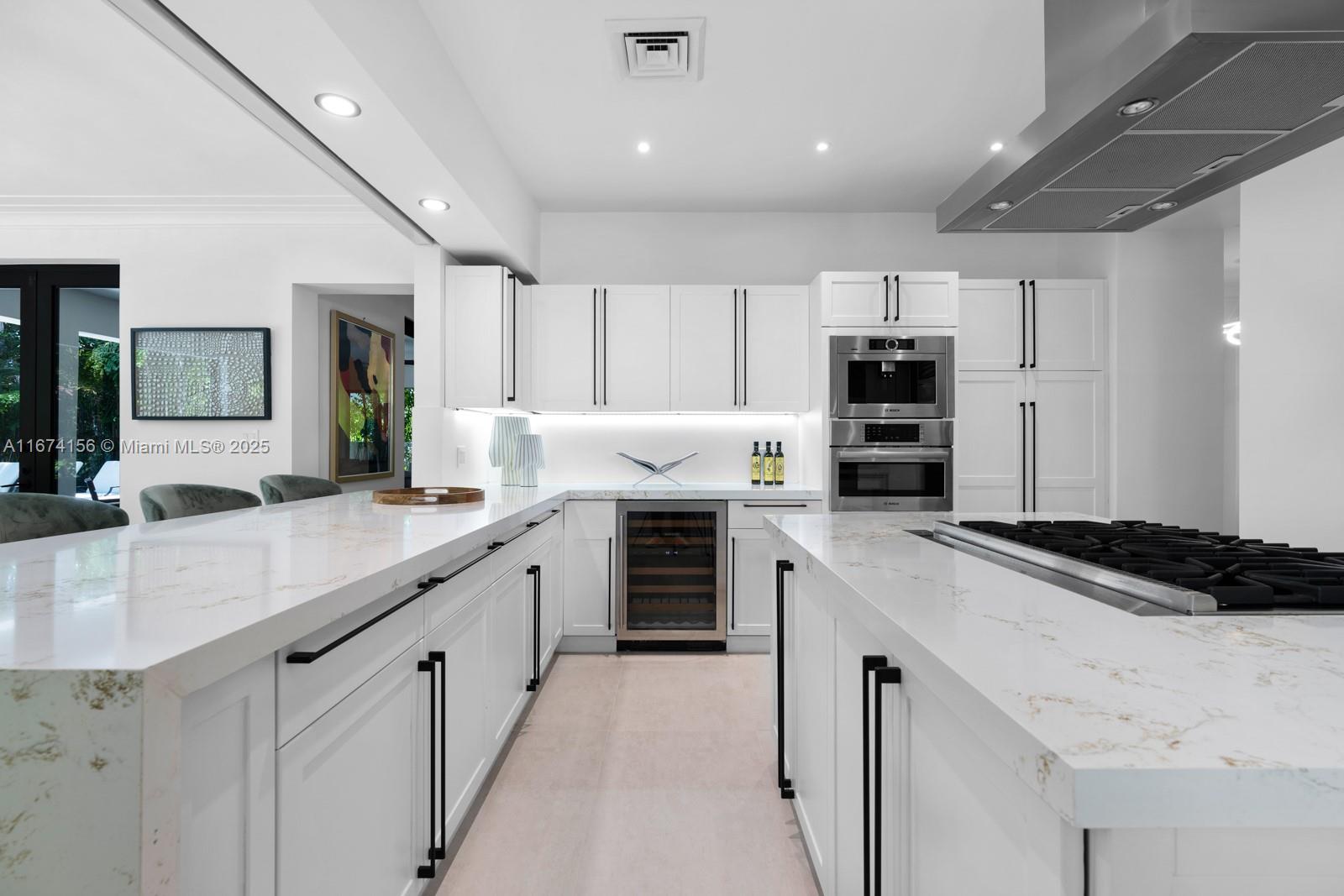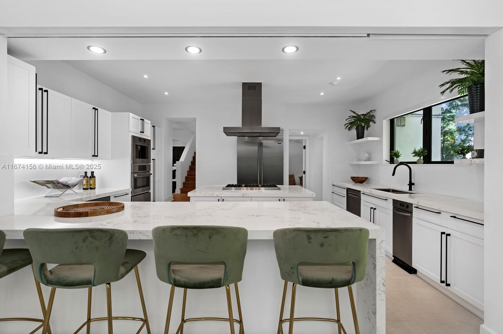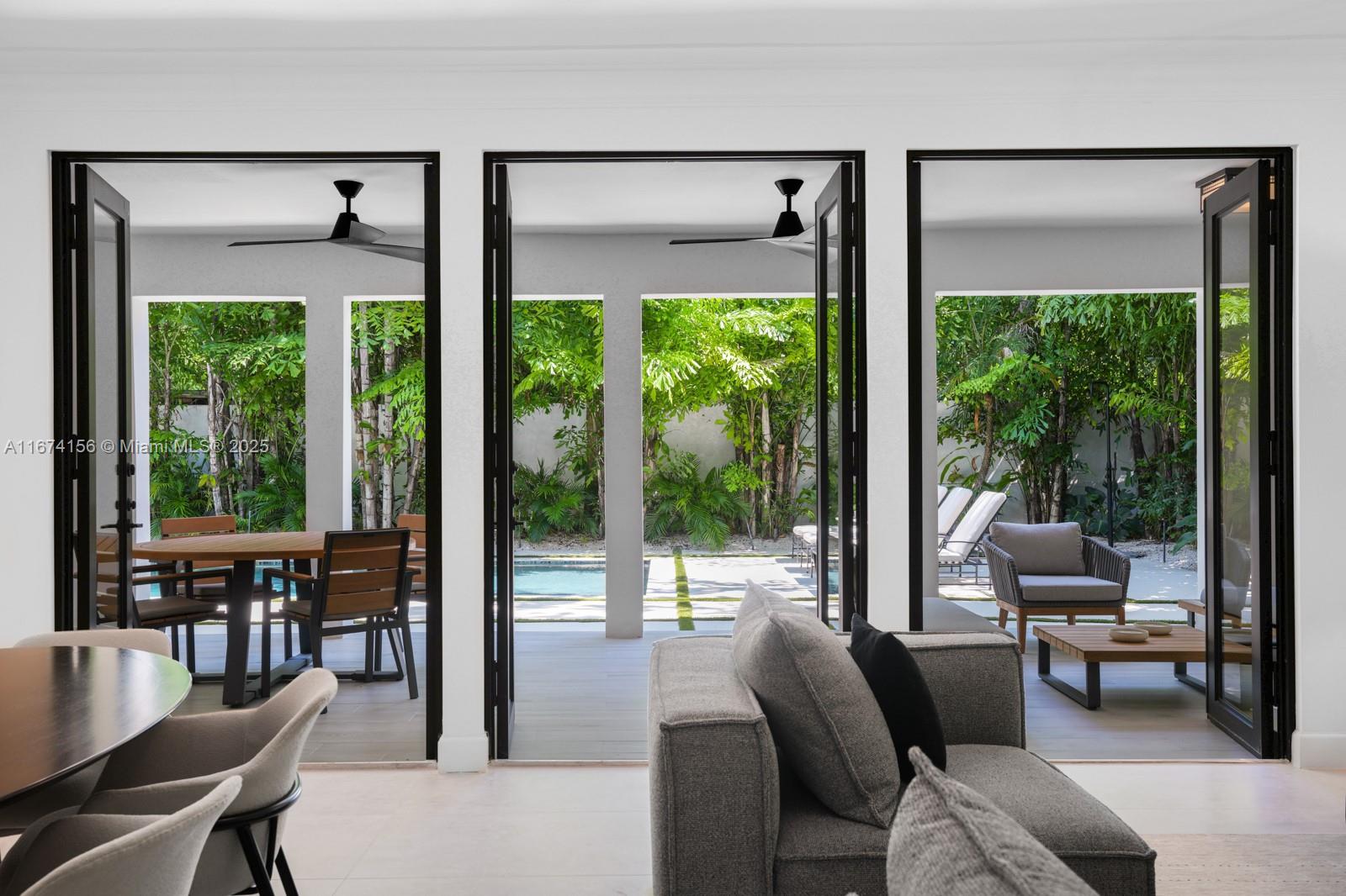 Step Inside With Me! This exquisite Mediterranean restoration is nestled on prestigious Upper North Bay Road, offering privacy and modern luxury. Behind the walled gate, you’ll find a spacious, family-friendly home featuring 5-bed/5-baths. The gourmet kitchen boasts Corian countertops, a large island with a Viking 6-burner gas stovetop, and opens to a sunlit TV room. The primary suite offers a walk-in closet, dual vanities, an oversized tub, and a cozy sitting/office nook. Outside, the lush, tropical backyard invites you to entertain on the expansive covered patio or relax in the heated saltwater pool. With hurricane impact windows, doors, and a 2-car AC garage plus ample parking, this home truly stands out.