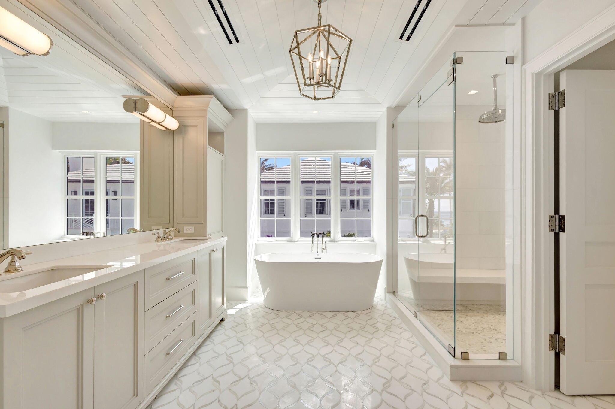 Spectacular New Oceanfront Estate on Billionaires Row - Introducing a newly constructed oceanfront compound on prestigious Billionaires Row, offering panoramic views of the Atlantic Ocean and a refined coastal living experience. This remarkable estate includes a main residence, guest house, and a private tunnel providing direct access to an oceanfront beach cabana. Bermuda-style architecture blends effortlessly with sleek transitional interiors, custom finishes, and curated furnishings throughout the property.Encompassing approximately 16,500+/- total square feet on .98+/- acres, the estate has 8 bedrooms, 12 full bathrooms, and 3 half baths. The main house features 5 bedrooms, 7 full bathrooms, 2 half bathrooms, 1 cabana bathroom, and a two-car garage. The guest house includes