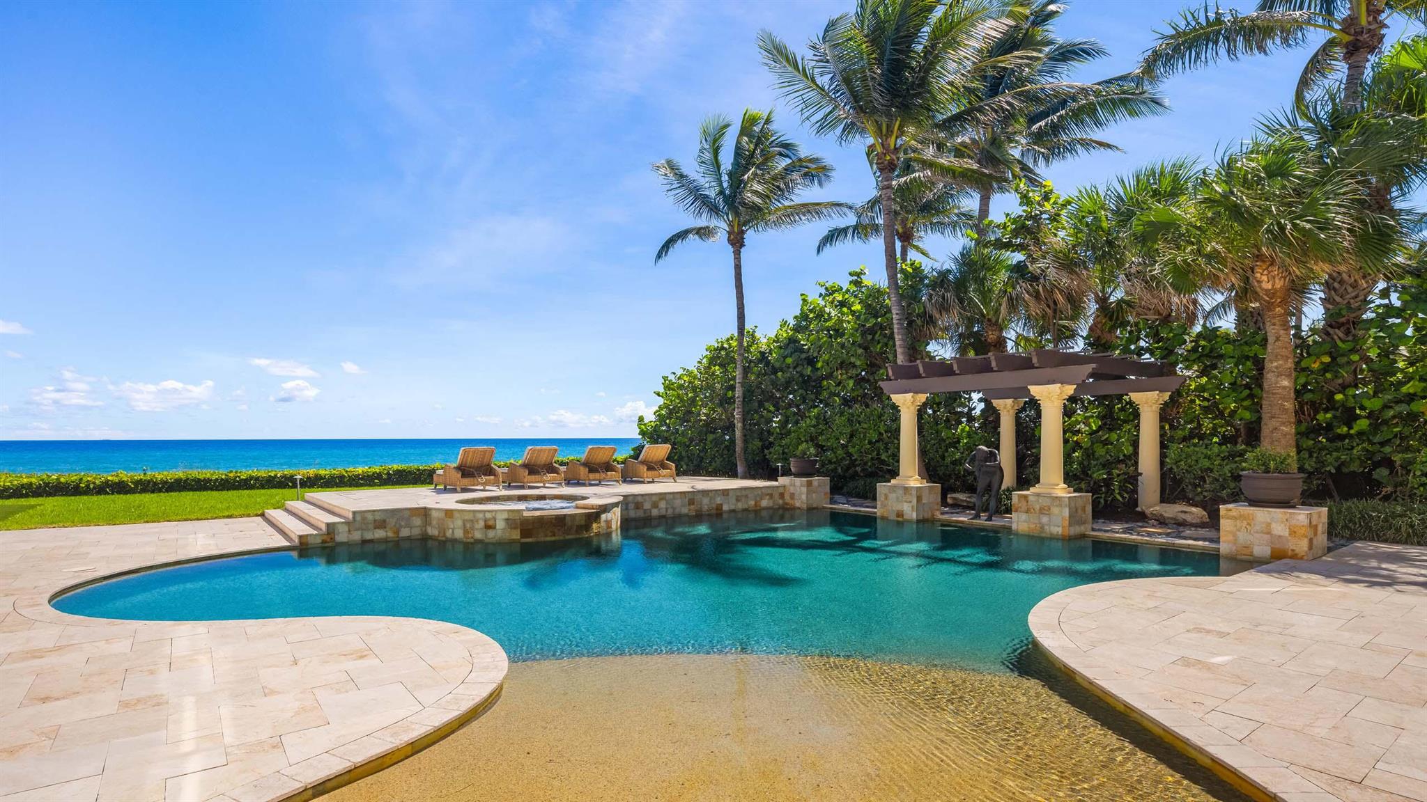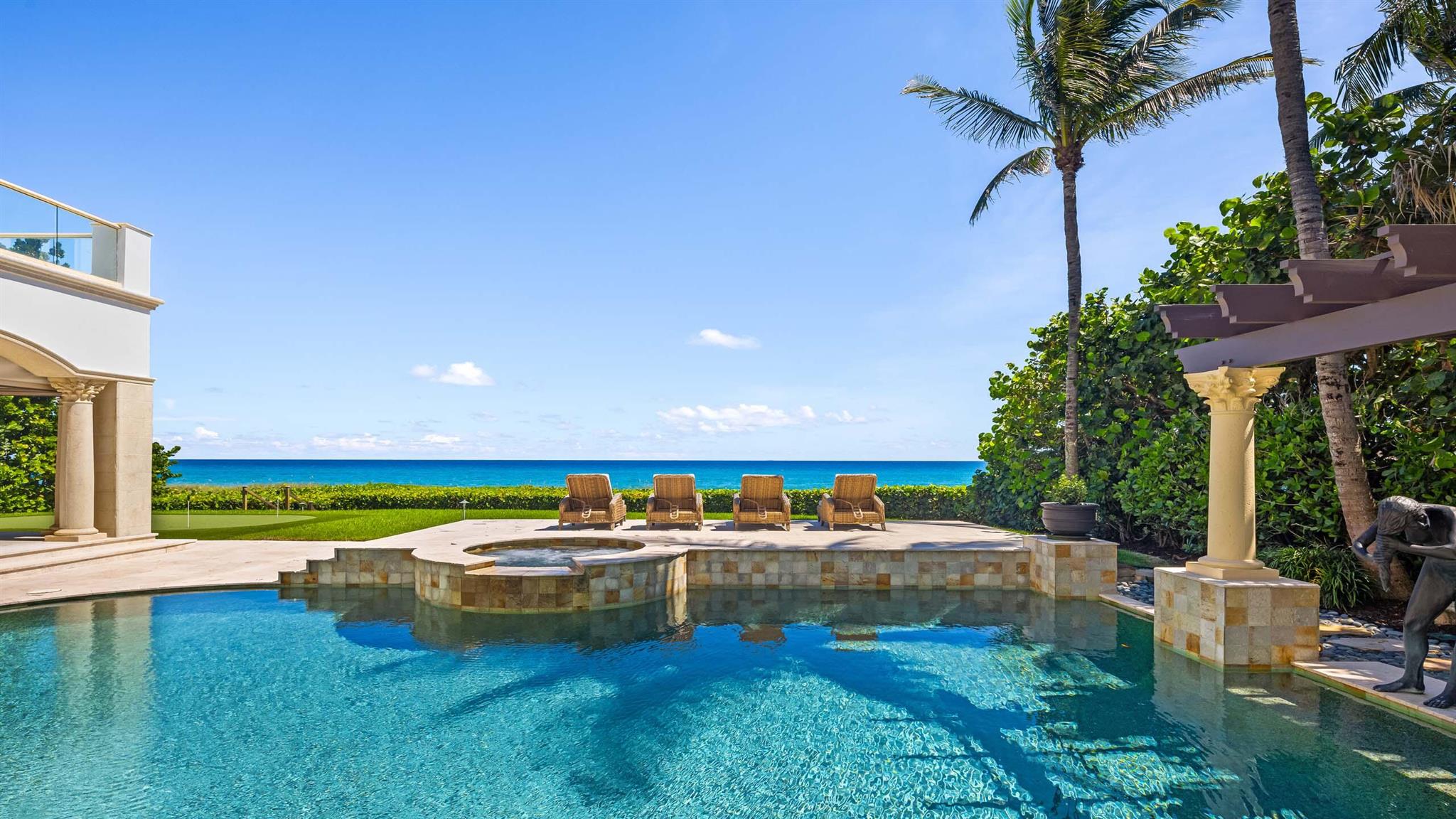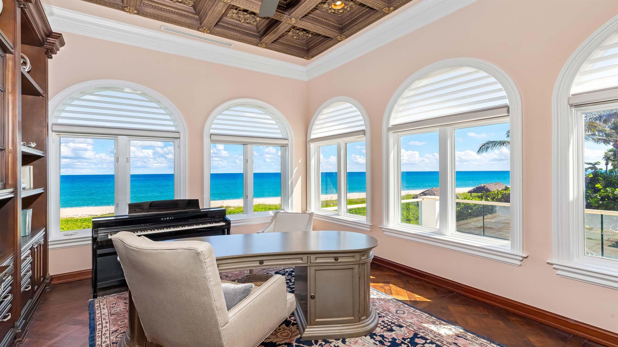 Introducing a one-of-a-kind oceanfront masterpiece in the prestigious Town of Highland Beach. Situated on 100 feet of direct ocean frontage with over 400 feet of depth, and almost 600 feet from the road to the water, this spectacular estate offers unparalleled luxury and privacy. Impeccable custom designer finishes elevate every aspect of this immaculate property. The residence boasts a stunning oceanfront pool complemented by a unique indoor pool and spa for year-round enjoyment. The expansive layout includes designer gourmet kitchen; two substantial offices that cater to modern work-from-home needs; state-of-the-art theater; and game room. With breathtaking views creating a sanctuary-like atmosphere and an oasis for relaxation, the primary suite has two separate baths with steam shower