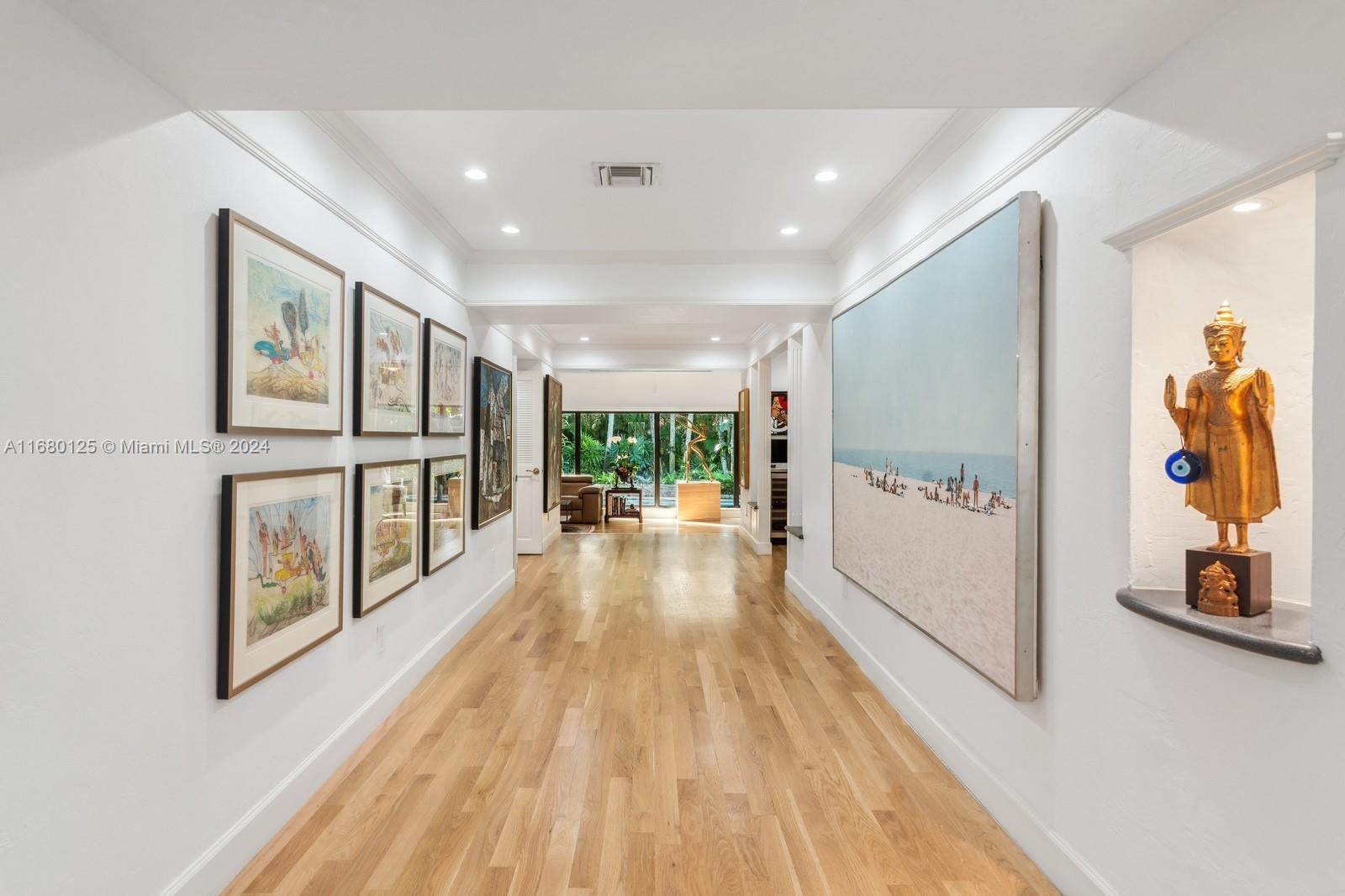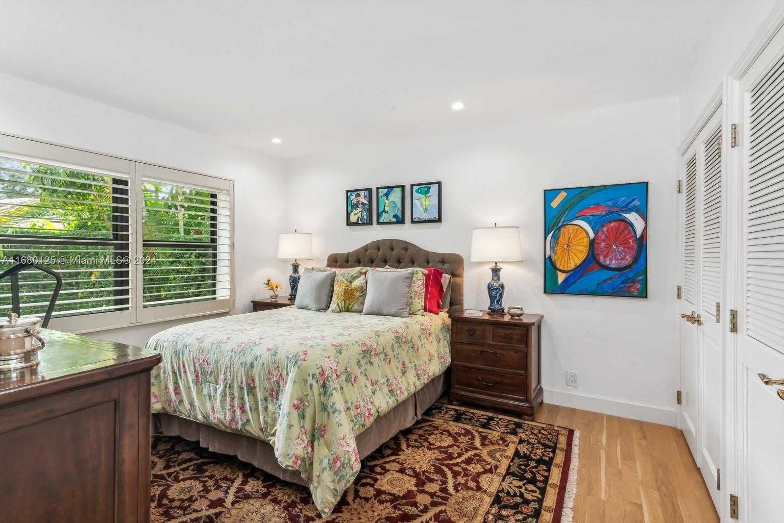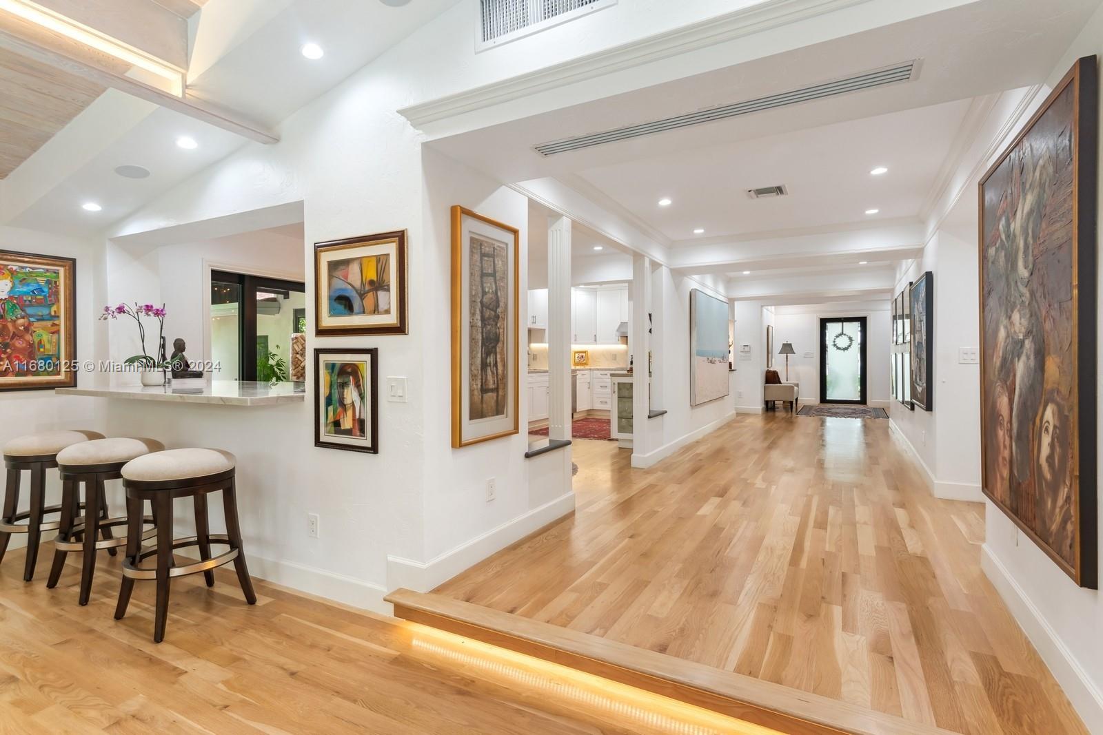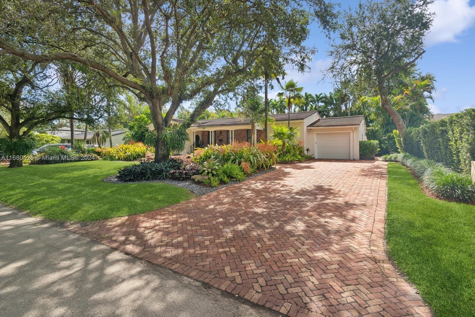 Wonderful opportunity to live in an oak canopied street and sought-after neighborhood, close to schools, shopping, transportation and an inspired lifestyle. The one-story home is nestled amidst lush, professionally designed greenery with a large brick driveway, paths and inviting front porch. The foyer opens to a wide and long gallery, just perfect to display your art or book collections. Beautiful light-filled living room with vaulted wood ceilings has glorious views of the free-form pool and lavish mature landscaping. Formal dining (or study, playroom, optional fourth bedroom). The spacious kitchen with its informal dining area leads to a covered outdoor terrace. One-car garage, impact glass and doors including garage, 30kw generator with a 500 gallon underground gas tank. Owner/agent.