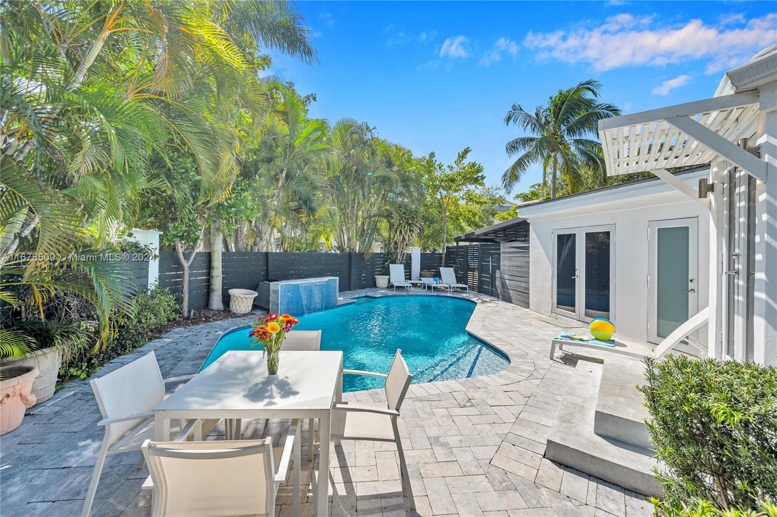 PRICE REDUCED! Tucked away in a quiet niche, this stylish and turn-key home could be yours. A retreat of light and open spaces, this 4 bedroom, 4 bathroom home has all the stylish conveniences you require. Vaulted ceilings sheathe the home with ample breadth. Cozy winters by the fireplace. Airy large bedrooms, contemporary bathrooms and expansive walk-in closets for your needs. French doors give access to your sparkling pool, an alcove of tranquility amongst the palm trees. Quiet nooks to regenerate and renew. Entertain friends and family year round at your pool side Tiki-Hut Bar and Summer Kitchen. Enjoy quick access to Las Olas' dining and entertainment. Relish the Florida lifestyle on the sought after beaches 5min away. Seize the opportunity to own this gem today!