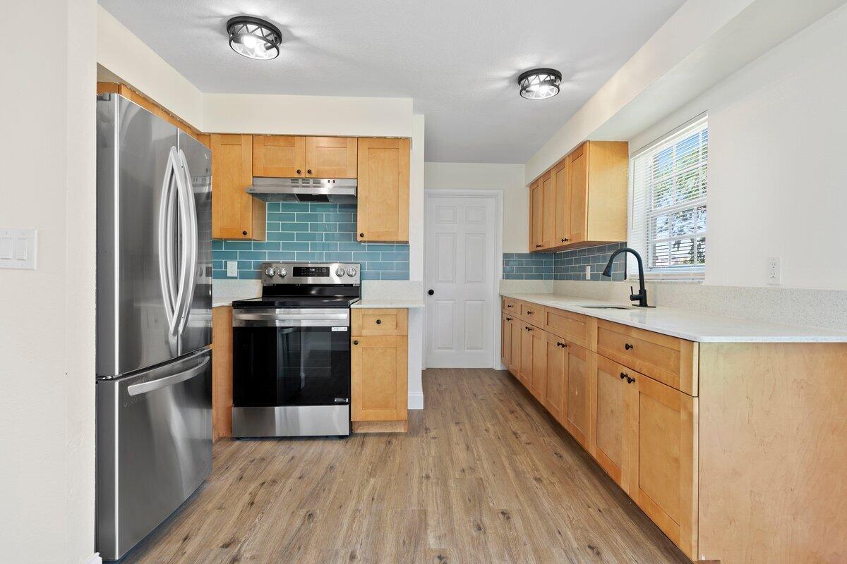 Discover modern comfort and style in this beautifully renovated 4-bedroom, 2-bath home in the heart of West Palm Beach. Every detail has been thoughtfully considered, from the brand-new roof and 2022 HVAC system to the fresh exterior and interior paint, ensuring a move-in-ready experience. Step inside to find spacious, sunlit rooms with new luxury vinyl wood flooring throughout, adding both elegance and durability.The newly updated kitchen is a standout, equipped with stainless steel appliances, sleek cabinetry, and plenty of counter space, making meal prep a breeze. Both bathrooms have been fully remodeled, offering a spa-like feel with contemporary finishes. Outside, the home's appeal continues with a new garage door and a stylish facade. This home perfectly combines modern upgrades