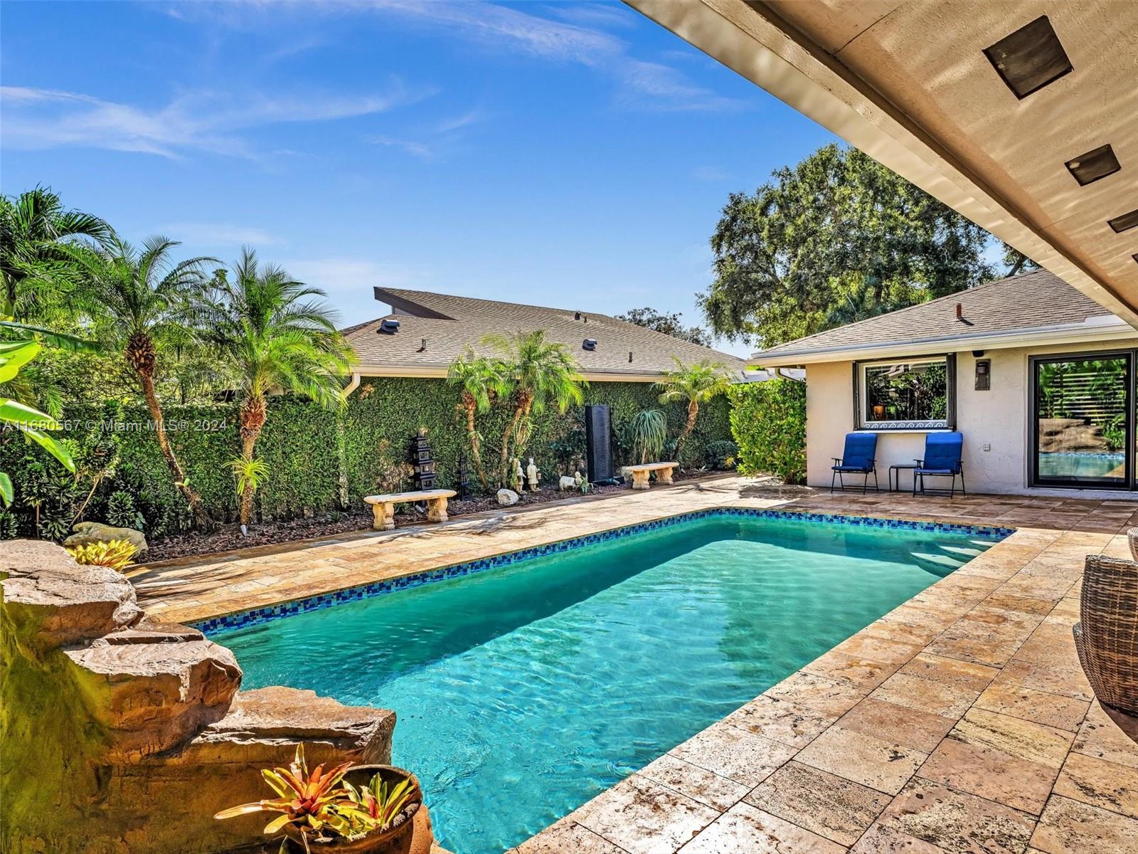 Largest 1 story , situated on a tree lined street in the Gated community of the Greens of Emerald Hills! This fabulous home has vaulted ceilings, stone Fireplace, Granite kitchen counters and bar, double ovens, lush landscaping overlooking a resort style pool with waterfall+ travertine pool deck! The home has a one-of-a-kind backyard that is a must see +has been meticulously cared for + updated and upgraded + 4 ton just installed air conditioner. Enjoy a 2-car garage, Full hurricane protection, High impact doors and accordion shutter combination. The large family room flows smoothly into to kitchen + bar + living area making this home the perfect layout. Community is close to shopping adjacent to emerald hills golf course a short drive to hard Rock makes this a must see!