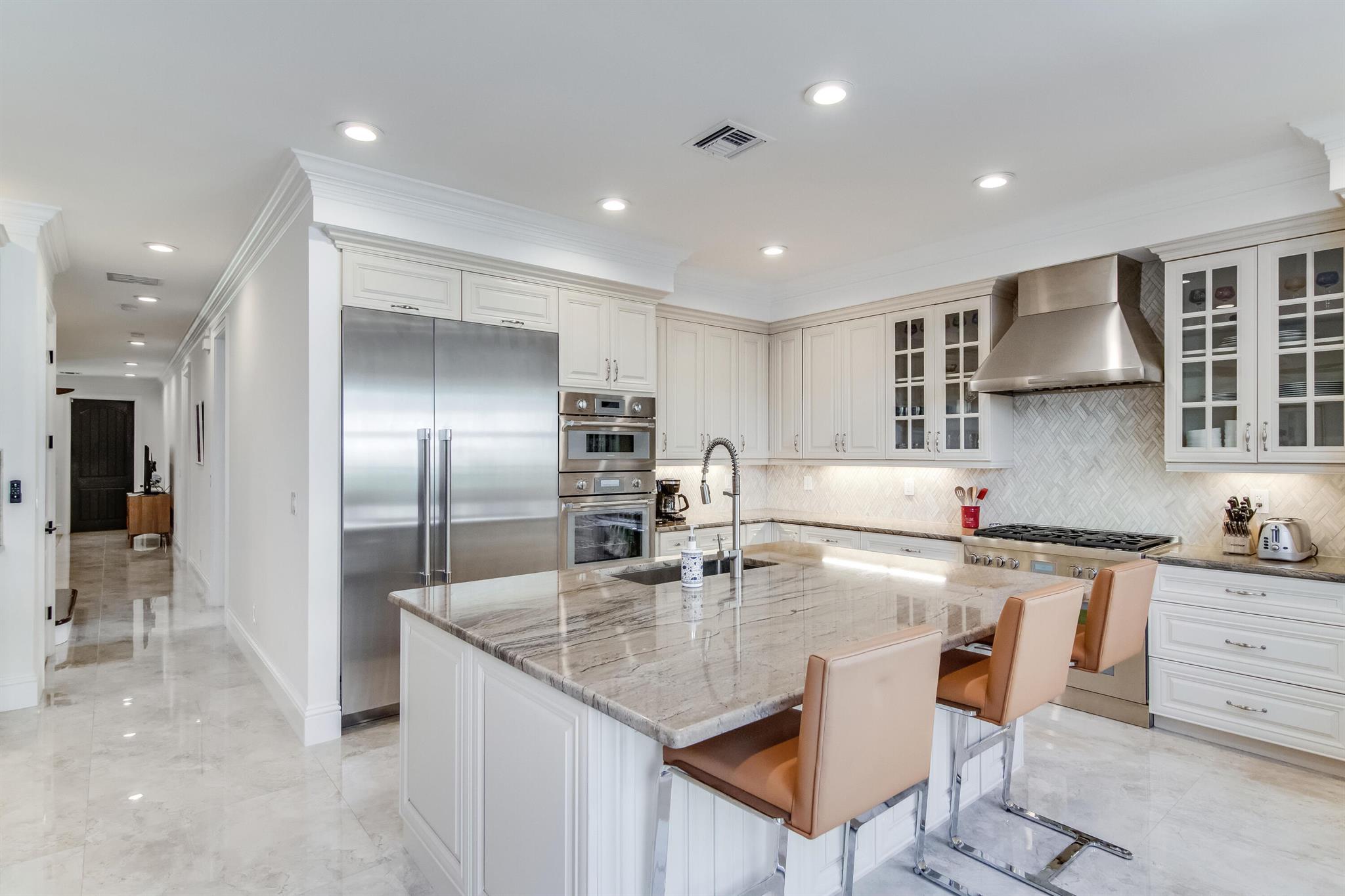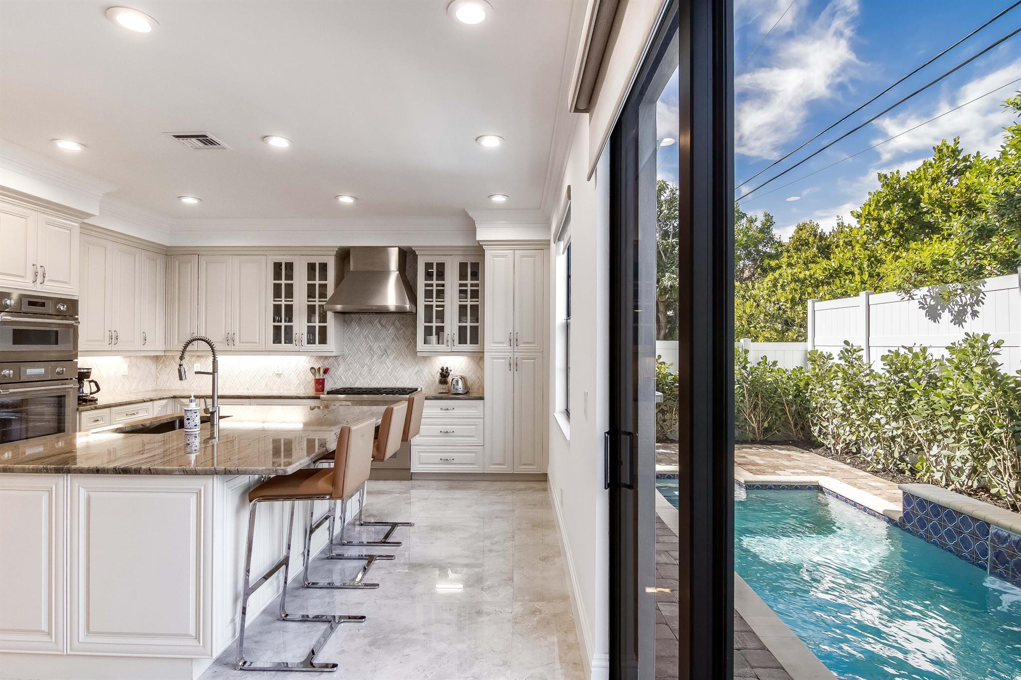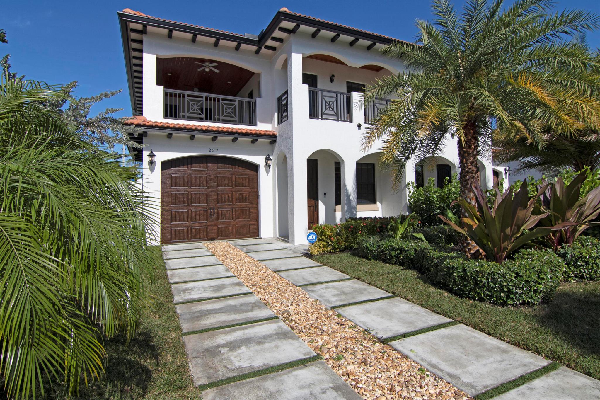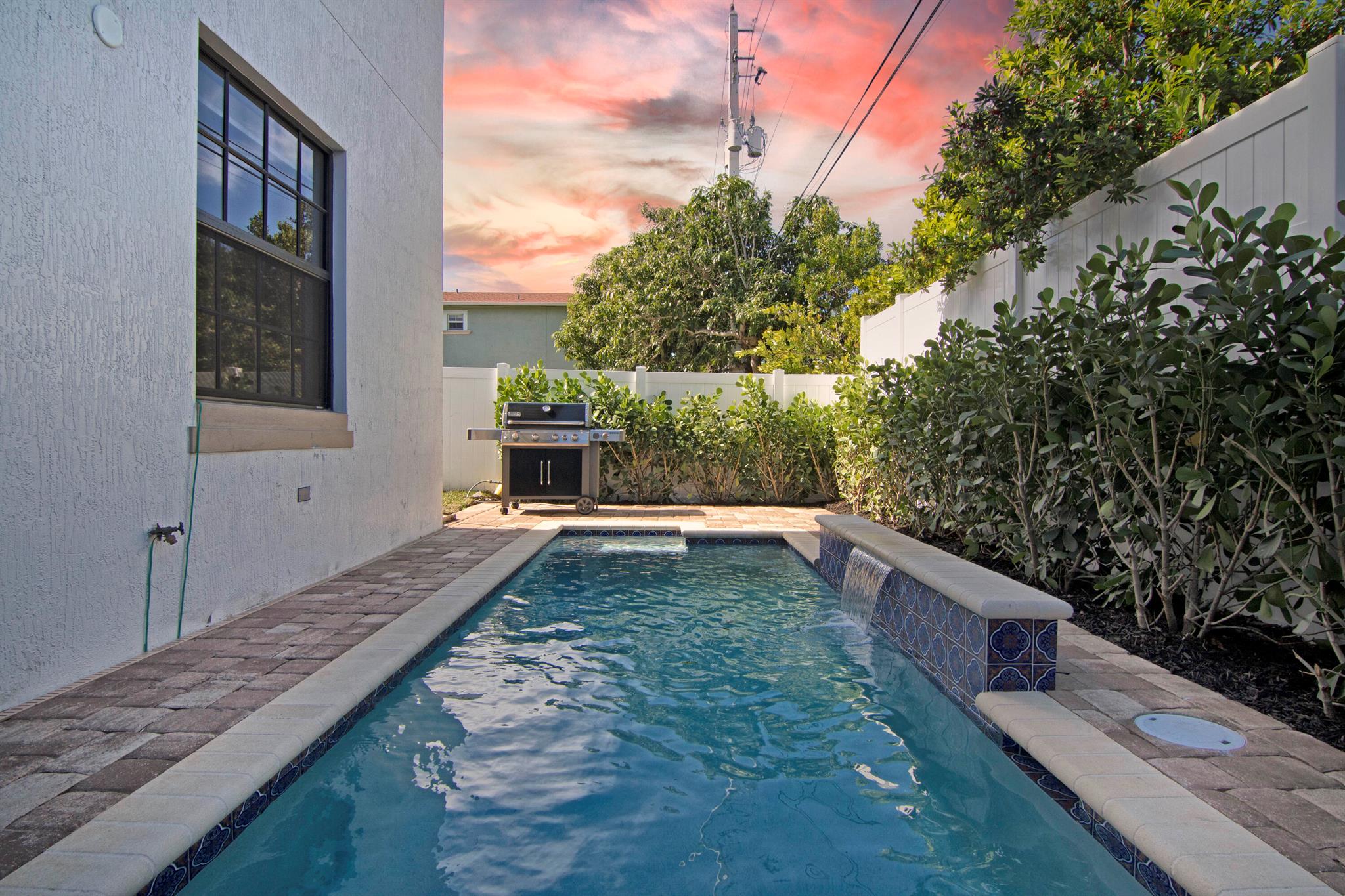 Presenting a luxurious Mediterranean-style townhome in the heart of West Palm Beach, ideally located in SoSo between Olive Avenue and Flagler Drive. Built in 2020, this sunlit home features spacious, open living areas and offers 4 bedrooms and 3.5 baths. The custom kitchen is outfitted with premium Thermador appliances, natural gas cooking and oversized island. Large glass doors open to a private outdoor oasis, complete with a recently installed pool. The living areas are adorned with imported porcelain tile, while the rest of the home showcases stunning wood floors. The primary suite boasts an expansive walk-in closet, a generous bathroom with a custom glass-enclosed shower, a separate tub, and two private balconies. A convenient laundry area is located on the second floor