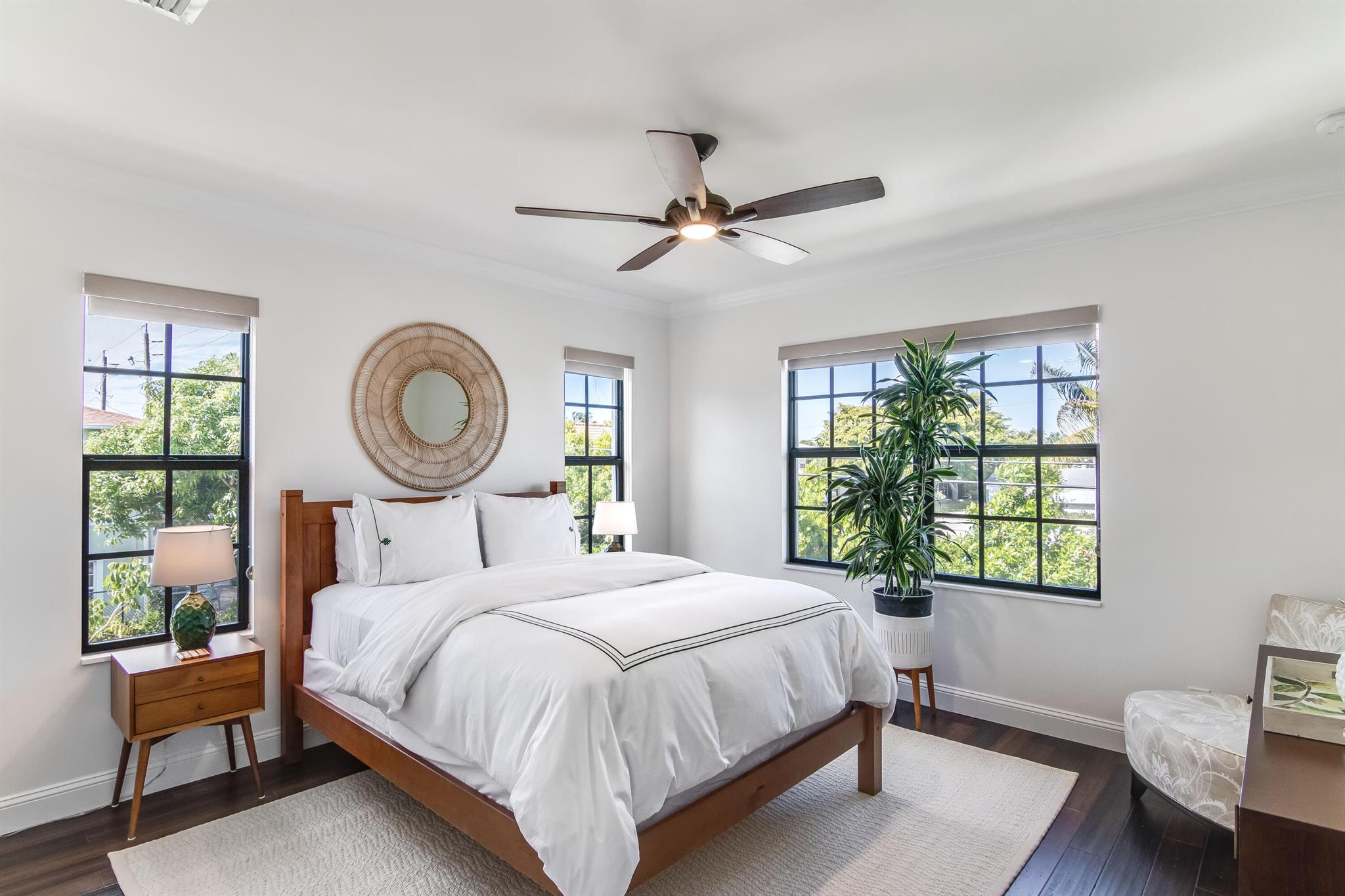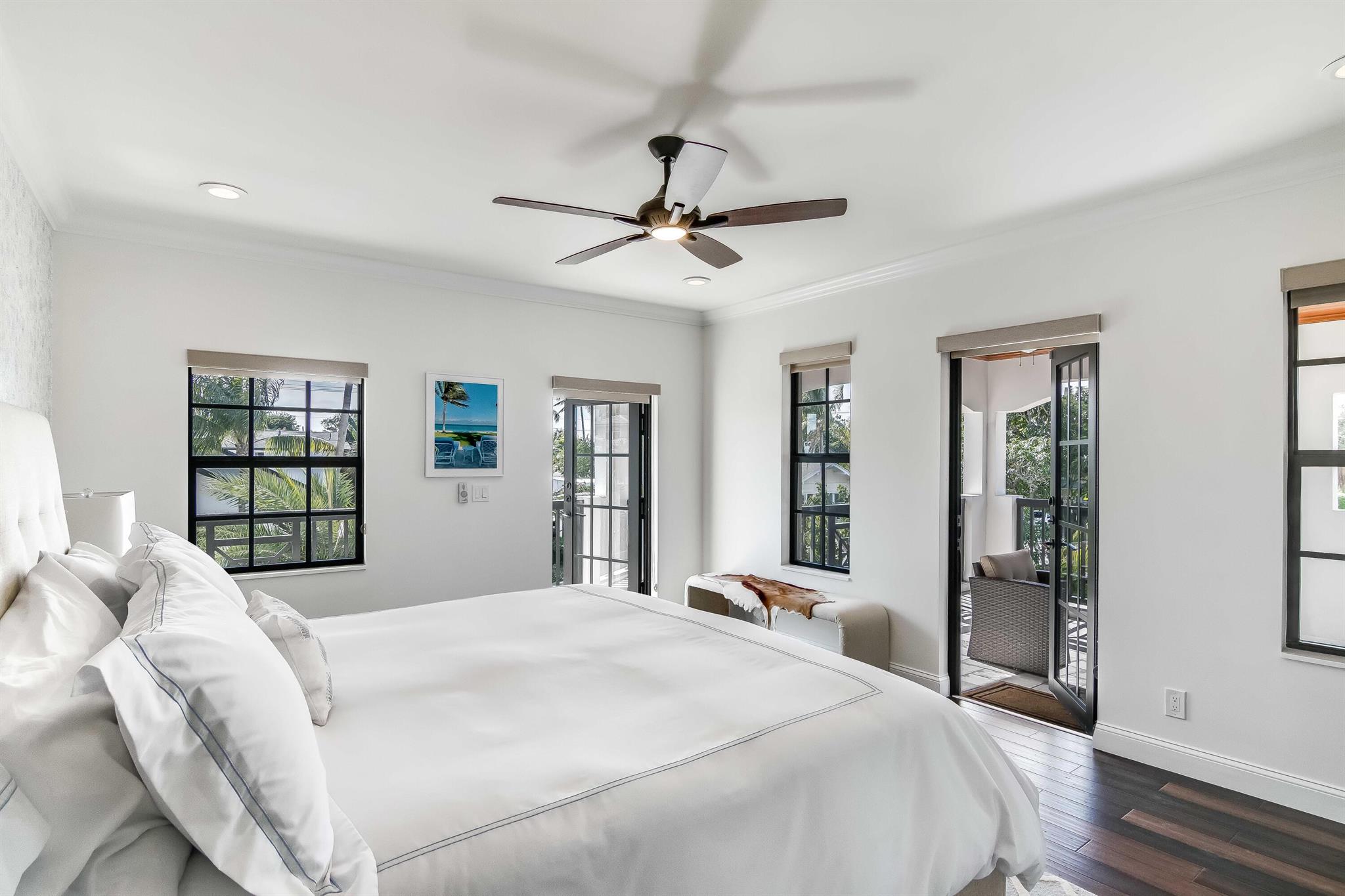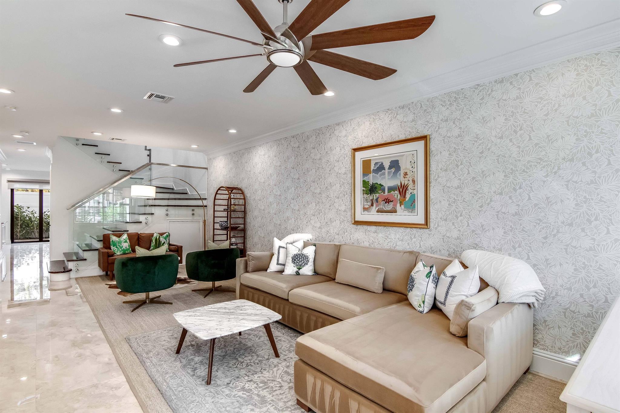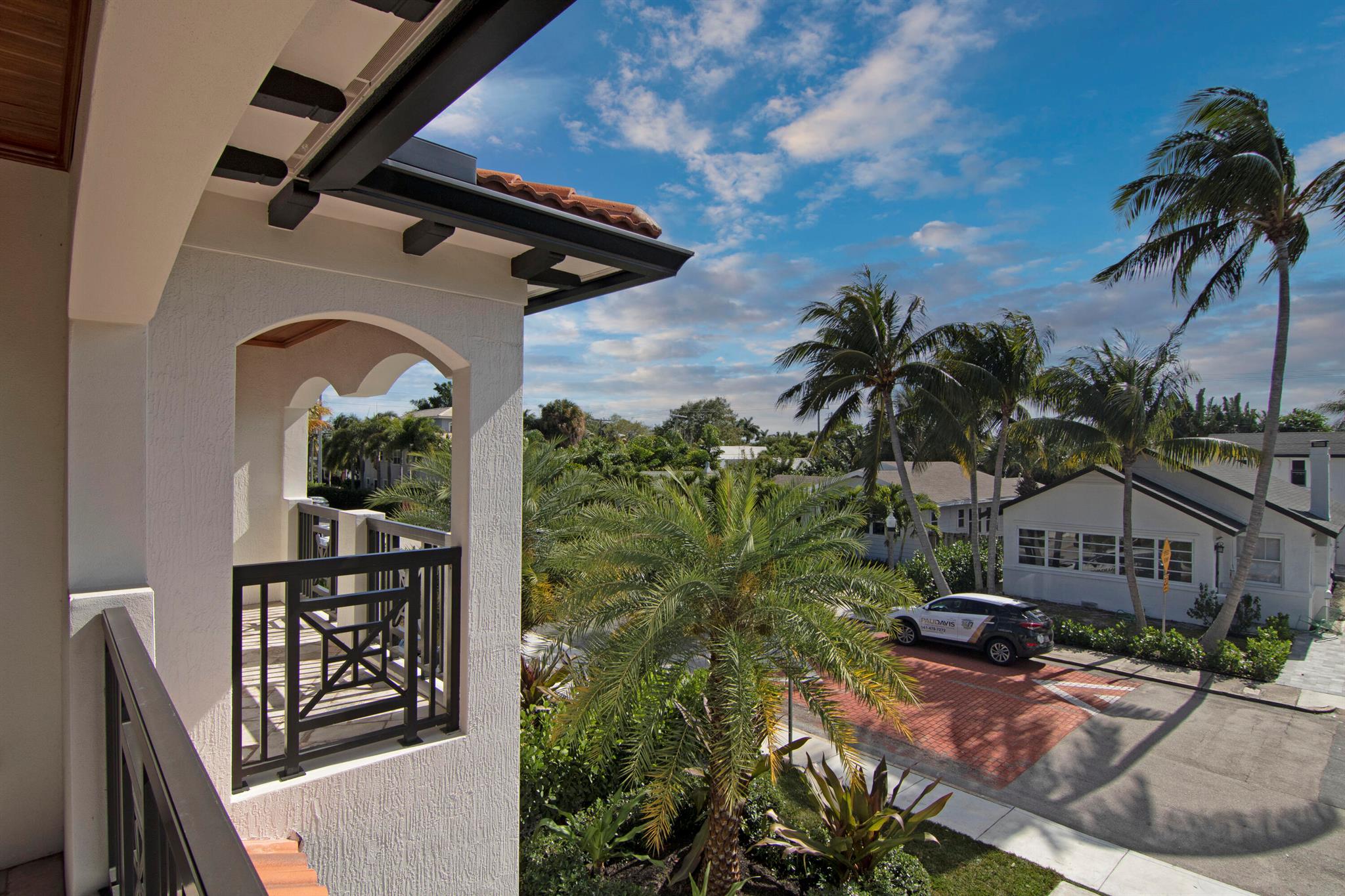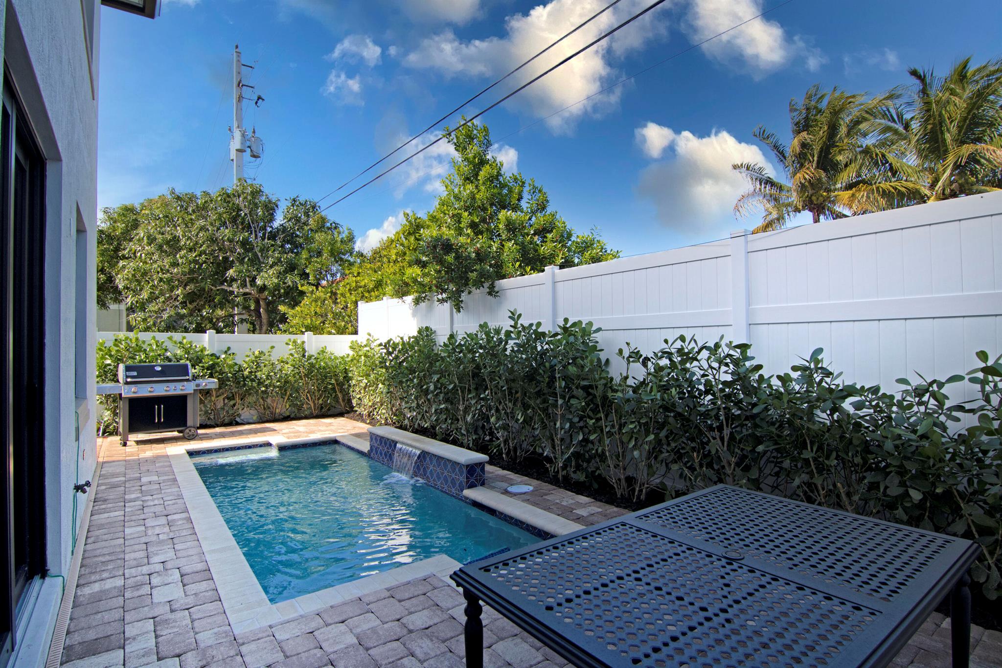 Presenting a luxurious Mediterranean-style townhome in the heart of West Palm Beach, ideally located in SoSo between Olive Avenue and Flagler Drive. Built in 2020, this sunlit home features spacious, open living areas and offers 4 bedrooms and 3.5 baths. The custom kitchen is outfitted with premium Thermador appliances, natural gas cooking and oversized island. Large glass doors open to a private outdoor oasis, complete with a recently installed pool. The living areas are adorned with imported porcelain tile, while the rest of the home showcases stunning wood floors. The primary suite boasts an expansive walk-in closet, a generous bathroom with a custom glass-enclosed shower, a separate tub, and two private balconies. A convenient laundry area is located on the second floor