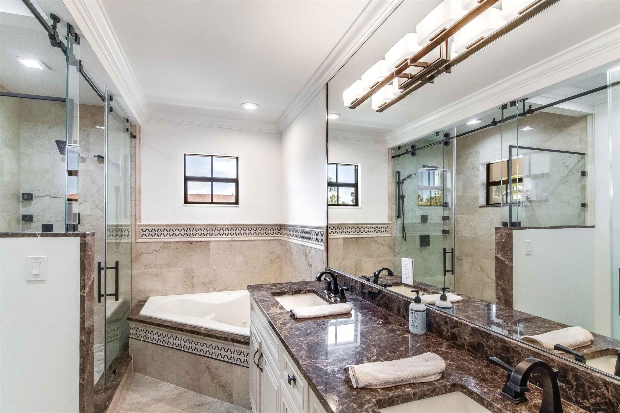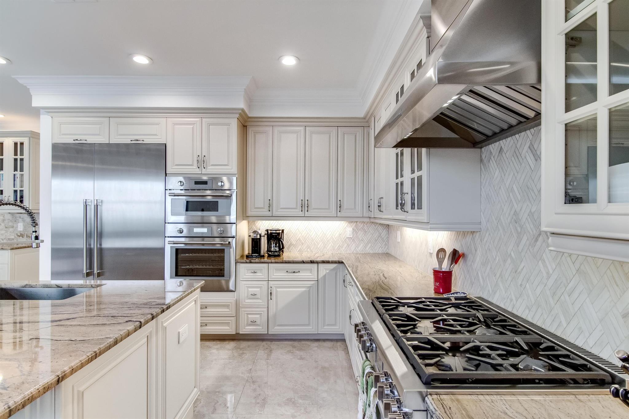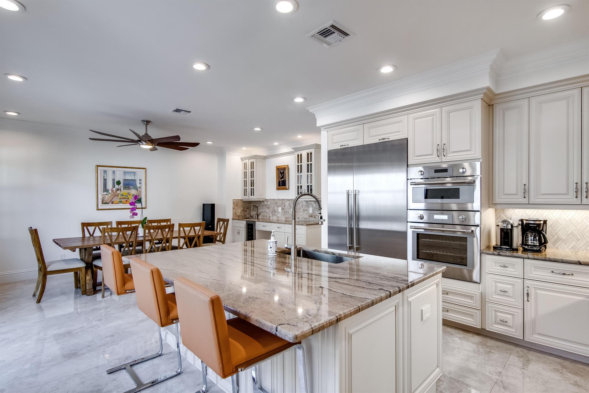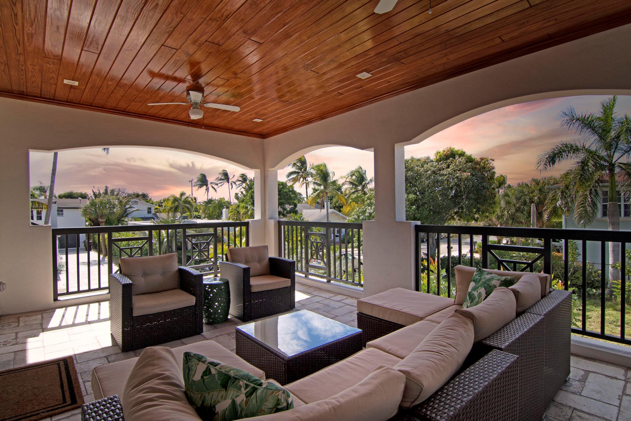 Presenting a luxurious Mediterranean-style townhome in the heart of West Palm Beach, ideally located in SoSo between Olive Avenue and Flagler Drive. Built in 2020, this sunlit home features spacious, open living areas and offers 4 bedrooms and 3.5 baths. The custom kitchen is outfitted with premium Thermador appliances, natural gas cooking and oversized island. Large glass doors open to a private outdoor oasis, complete with a recently installed pool. The living areas are adorned with imported porcelain tile, while the rest of the home showcases stunning wood floors. The primary suite boasts an expansive walk-in closet, a generous bathroom with a custom glass-enclosed shower, a separate tub, and two private balconies. A convenient laundry area is located on the second floor