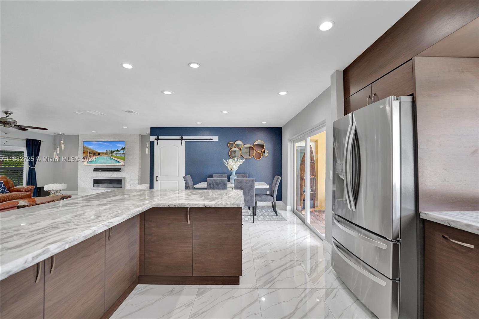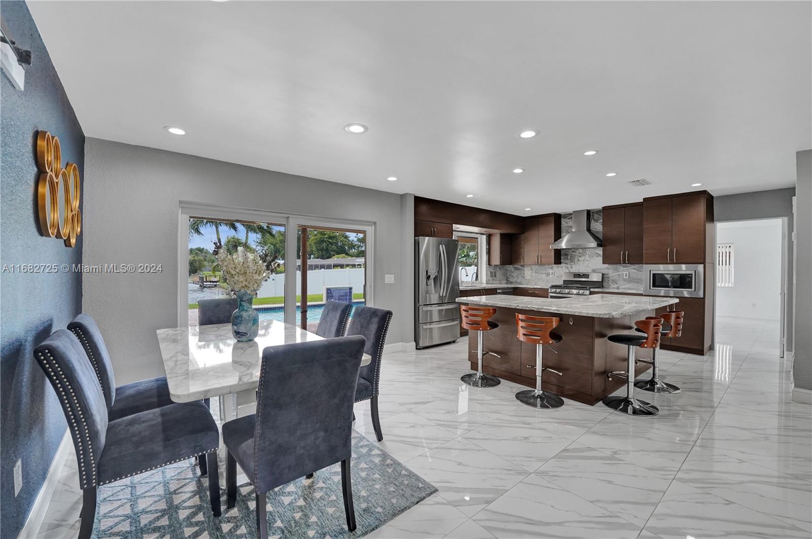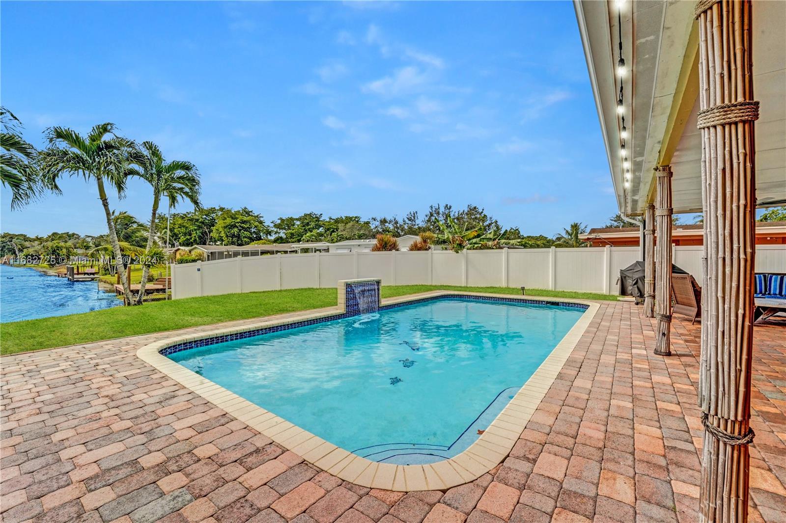 If your heart longs for a gorgeously remodeled move-in ready home, your search ends here. Designer touches throughout create an enchanting ambiance, starting in the generously sized kitchen featuring gas appliances (range 2023, refrig 2022) and kitchen island. Enjoy a new roof (Dec 2020), fresh paint (2024), tastefully remodeled baths, impact windows & doors, new AC (2022) and sprinkler pump (2021). As you step outside, the true magic of this property unfolds & provides the serenity and space you've always envisioned while the saltwater pool w/new pump (2023) & dock overlooking the lake invite you to unwind. With an extended covered patio perfect for BBQ (w/natural gas hookup), large fenced (2020) yard & circular driveway (2022) for additional parking, this home is ready for entertaining!