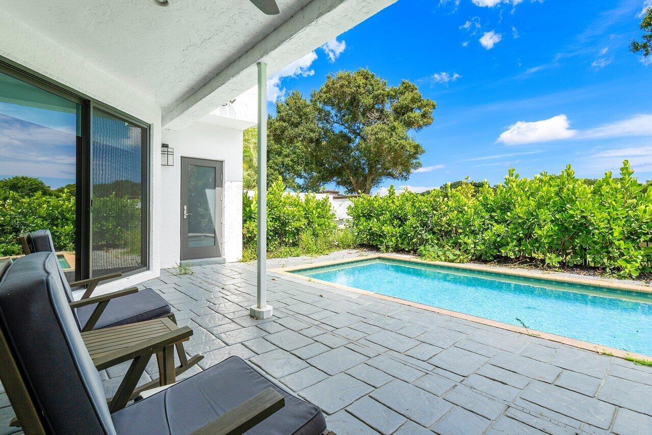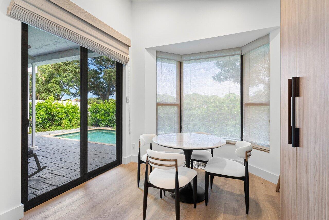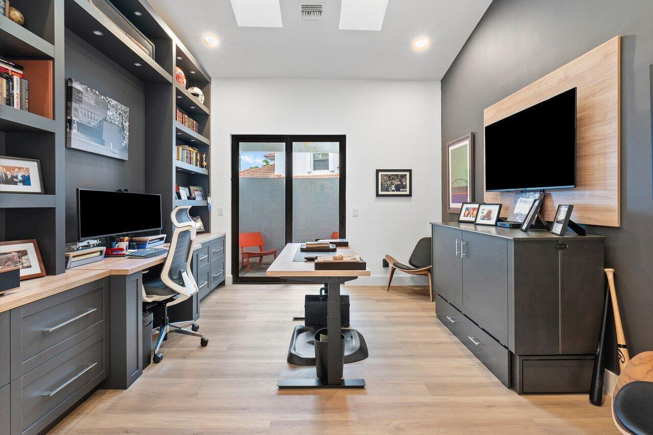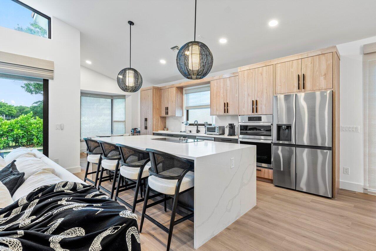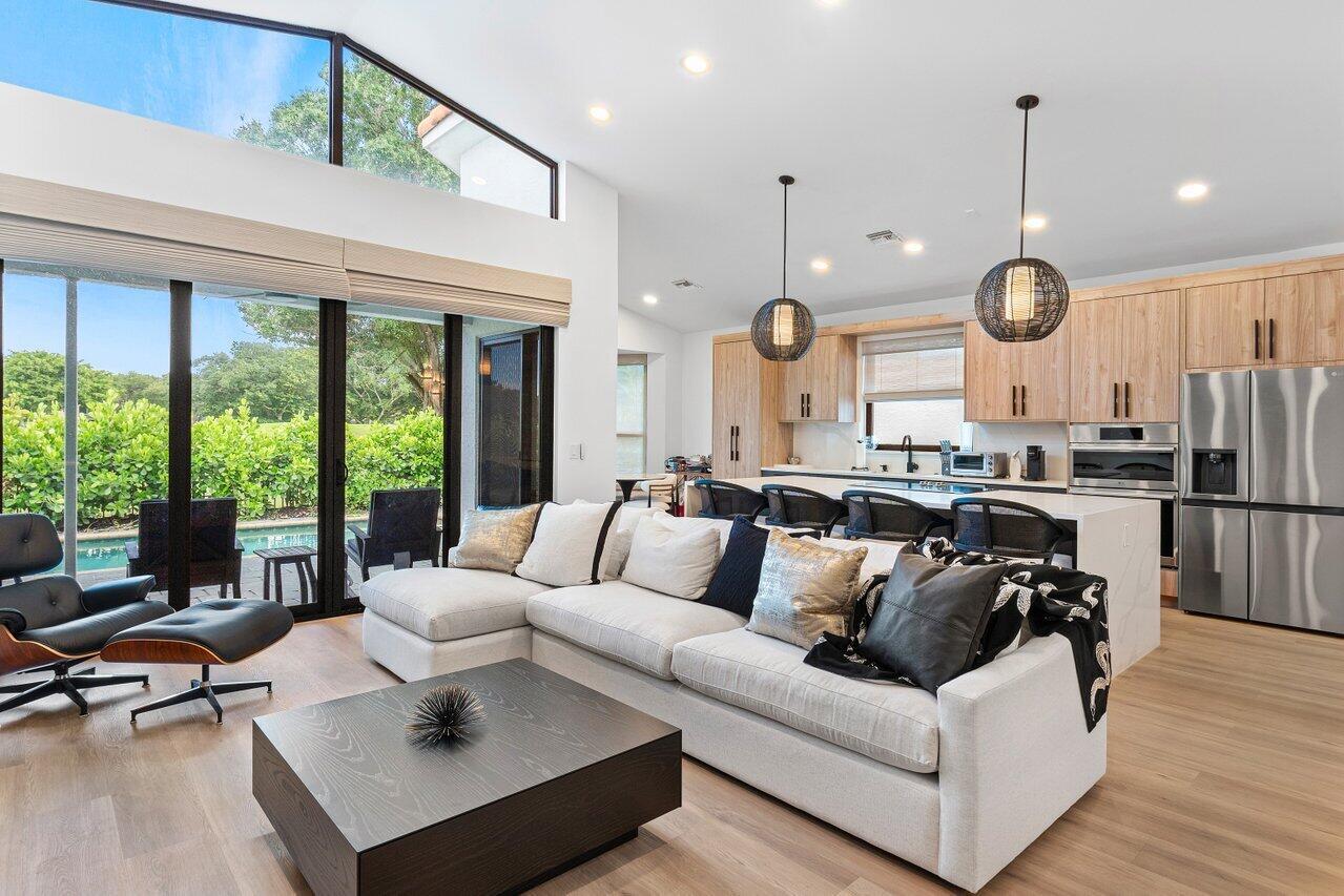 Stunning and renovated 3 BD 2.2 BA home, with a pool and golf course views. The beautiful light wood organic finishes with dark accents give a sophisticated and warm, designer look, that is consistent throughout. A completely remodeled kitchen with custom wood cabinets and quartz countertops complimented by a wet bar with a wine and beverage fridge. The spacious primary bedroom has sliding glass doors to the pool area, a large primary bathroom, and two oversized walk-in closets. A large gray built-in with wood finishes makes for a highly functional home office/3rd bedroom that hosts a private side patio. Impact windows, chic light fixtures, a half-bath for guests plus a cabana bath, turfed side yard, an abundance of natural light and so much more make this home one not to be missed.