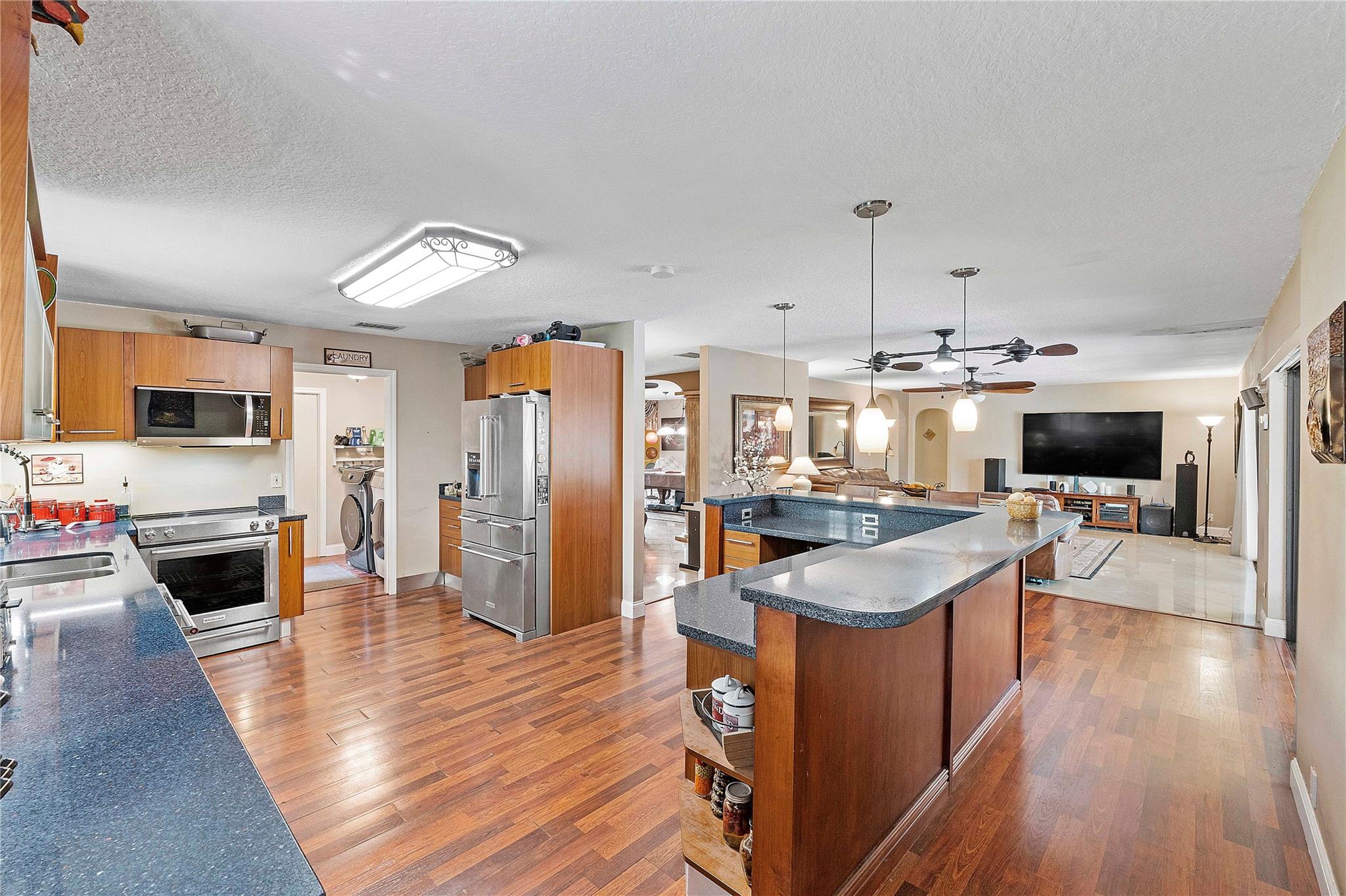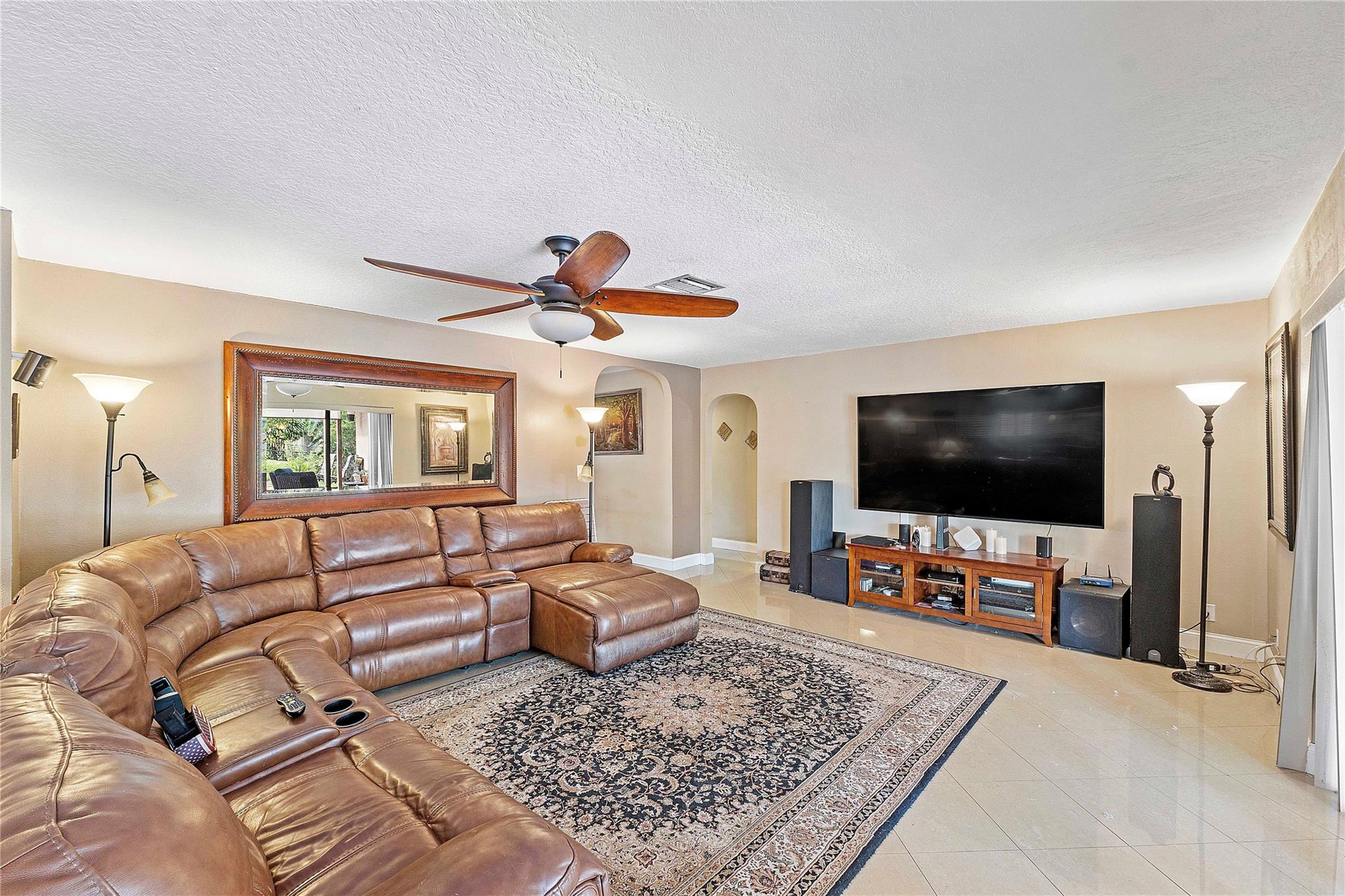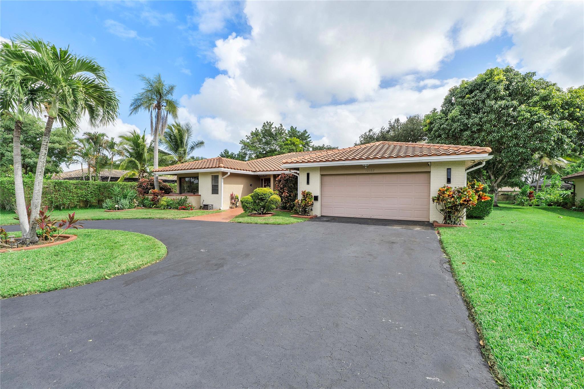 A rare opportunity to own this one story 4 bedroom plus FLEX room and 2.5 bath home with a NEW ROOF (2020) in the heart of Coral Springs. NO HOA! Huge lot with CIRCULAR drive and amazing RESORT style fenced back yard with stamped concrete pool deck. Large covered entertaining area. Newer kitchen open to GREAT room with loads of soft close cabinets and drawers plus turntables and pull outs. A unique blue STONE counter top, newer SS appliances, plantation shutters, snack bar and more. So MANY FEATURES: Fans, custom lights, cameras, tv mounts, 2 extra freezers, sprinkler on well for free watering of the lawn, shutters, mango and coconut trees, shed, garage AC, gutters, triple sliders in Great room, Front load washer and dryer. Furniture available for sale. Seller relocating out of state.