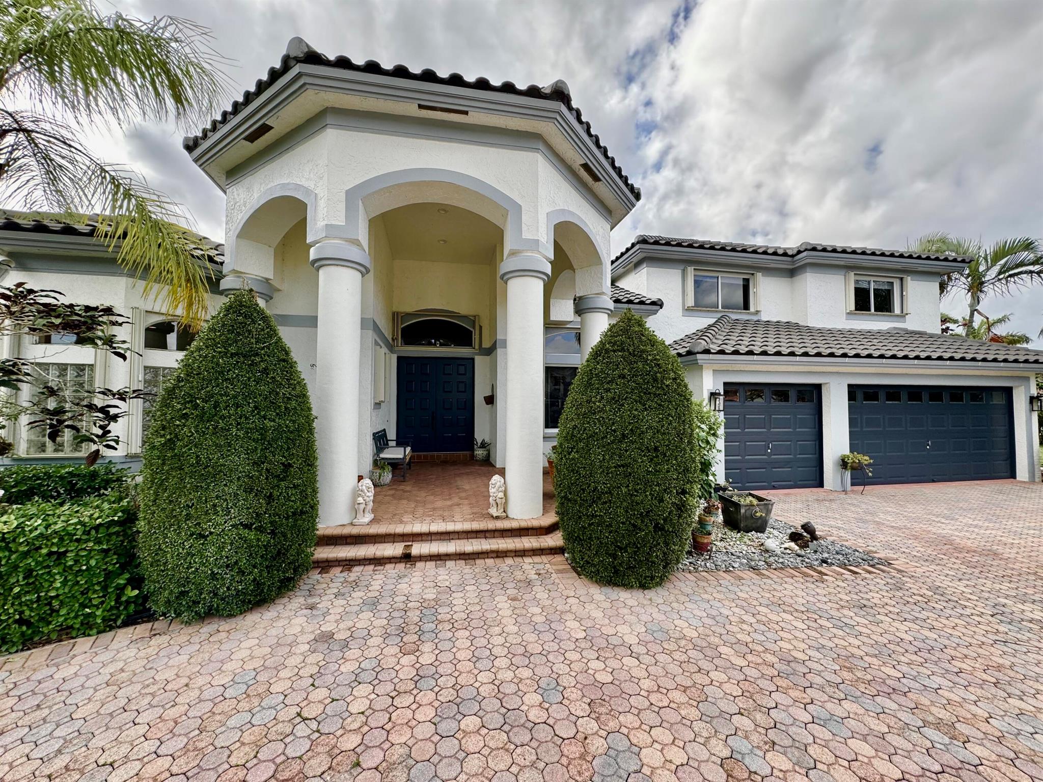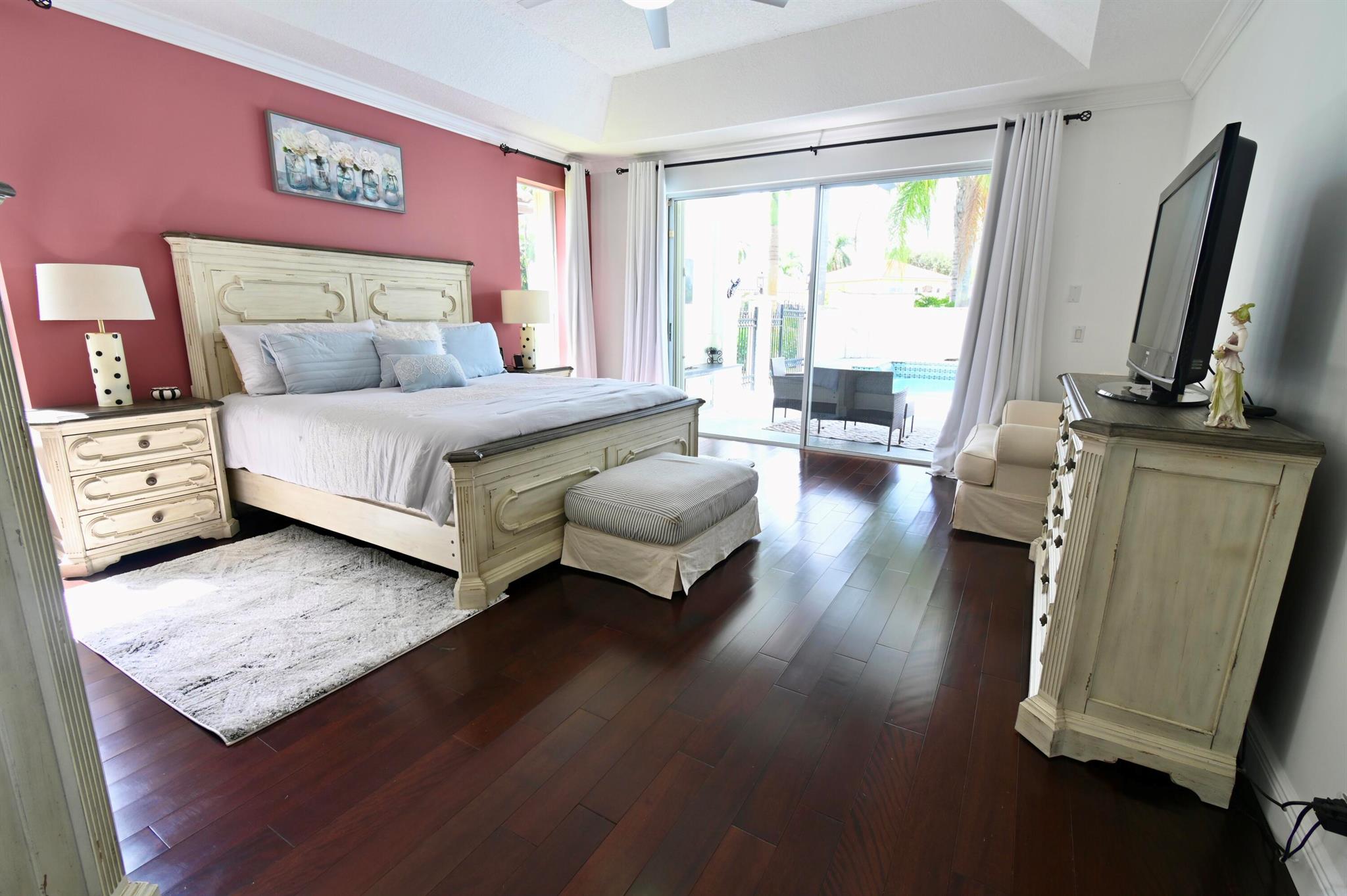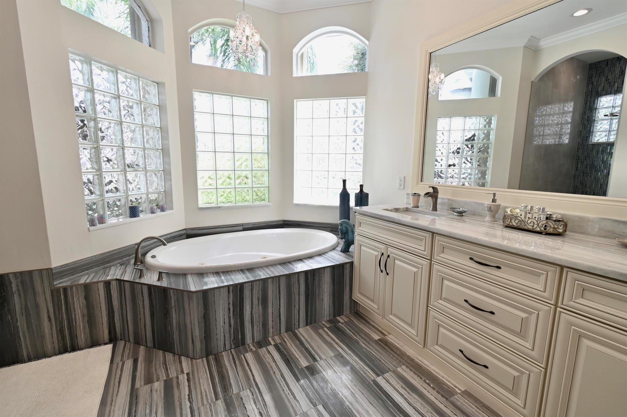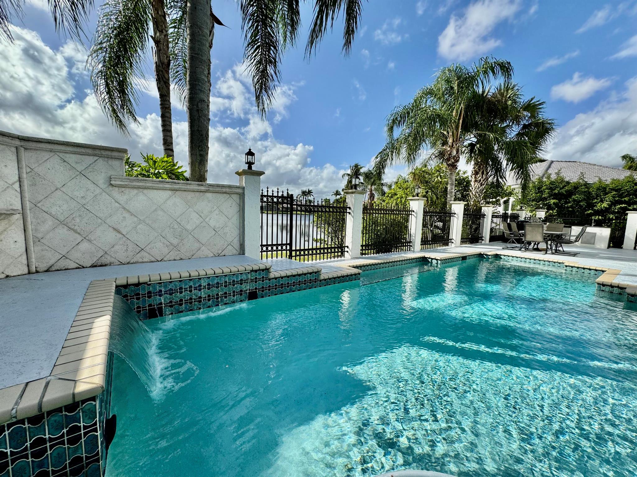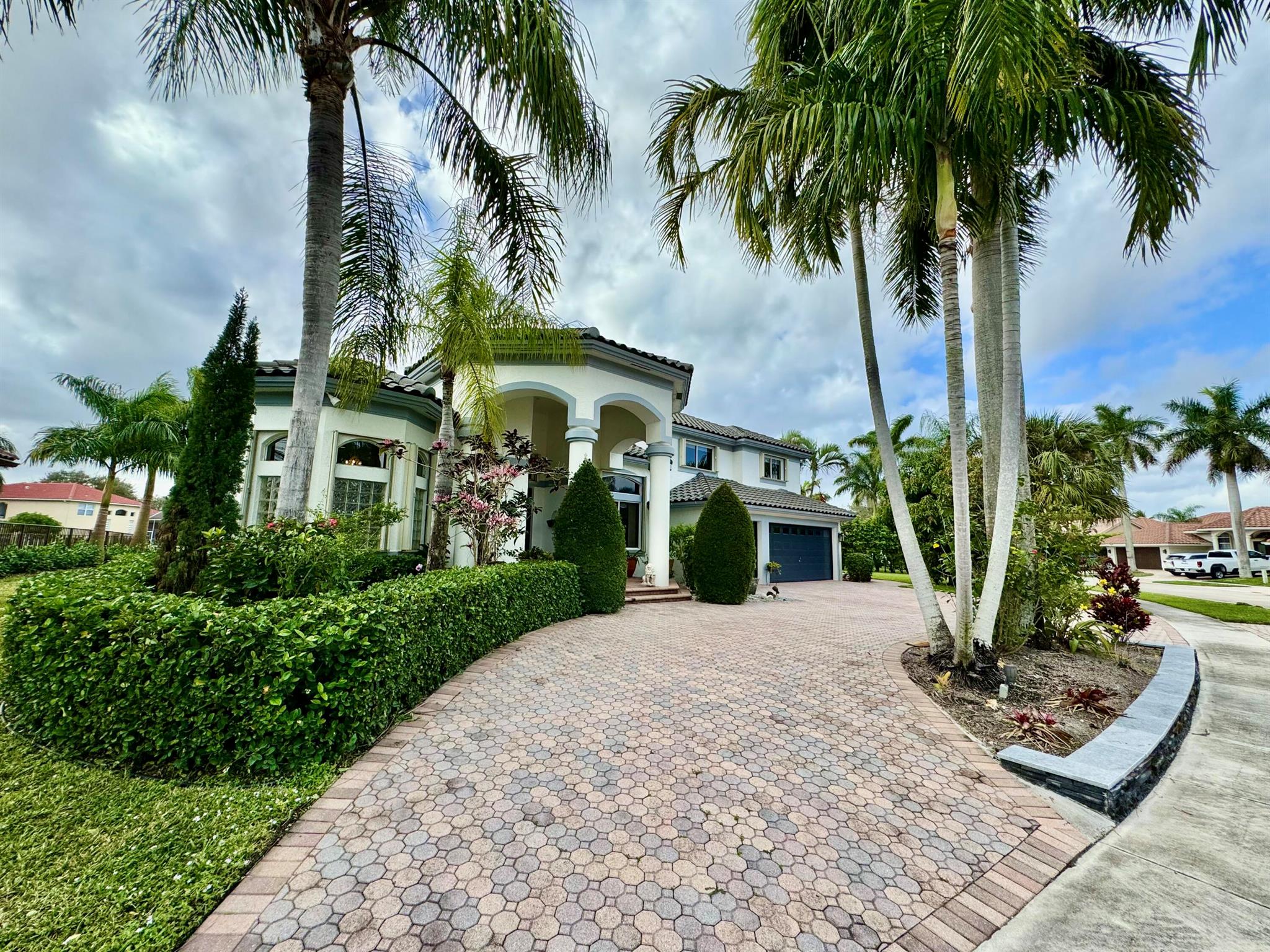 Nestled in the prestigious RESERVE section of Boca Isles South, this Palm Beacher model has the LARGEST LOT available in the neighborhood. The 5-bed, 3-bath waterfront home offers a luxurious & serene lifestyle with a magnificent pool overlooking the lake. An elegant circular driveway & 3-car garage welcome you to this home of distinction & elegance. The move-in-ready residence exudes sophistication with tile & hardwood flooring flowing seamlessly throughout. The kitchen, a chef's delight featuring granite countertops, farmhouse sink, stainless steel appliances, & convection stove. The kitchen offers seating at the counter, a separate breakfast area & a formal dining area. First floor primary suite is complete with walk-in closet, jetted tub, dual sinks, and a separate shower.