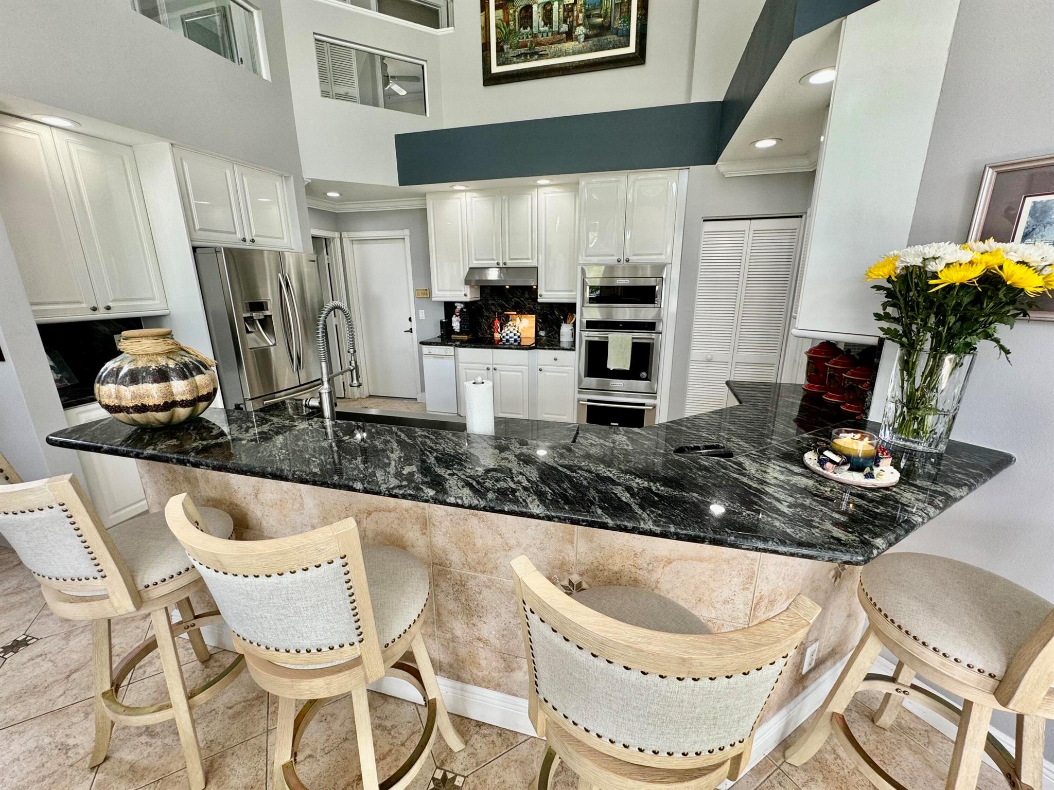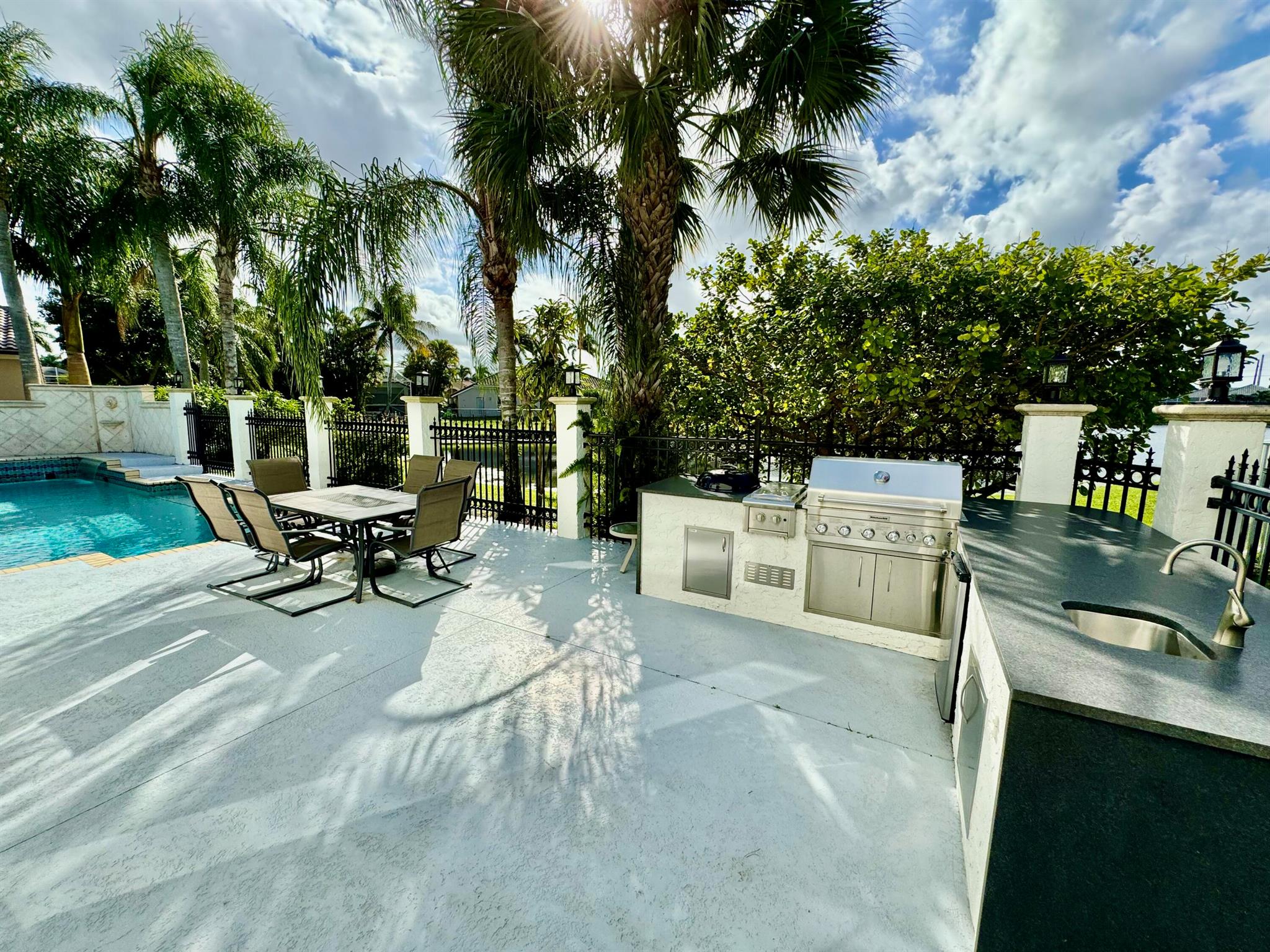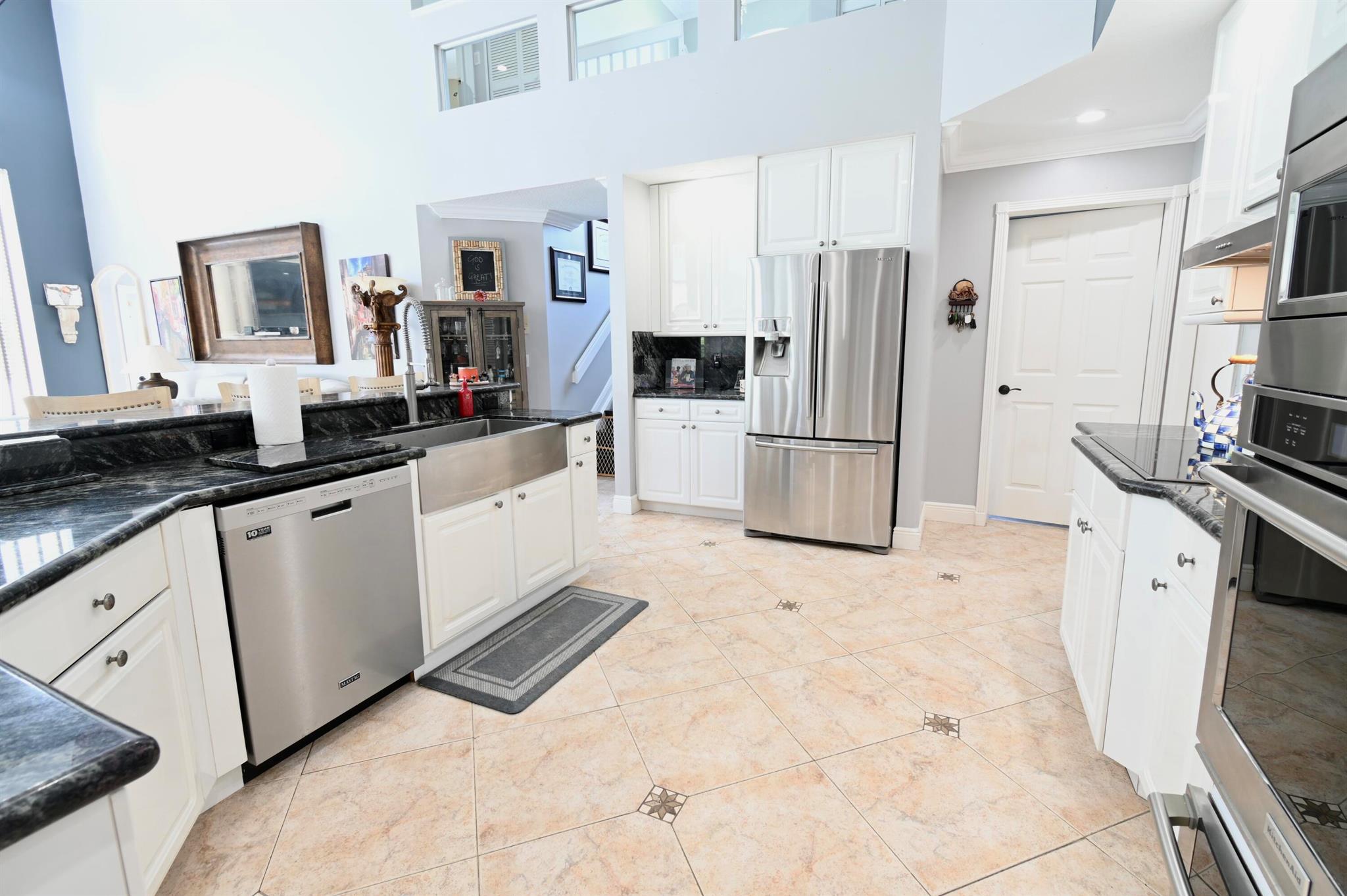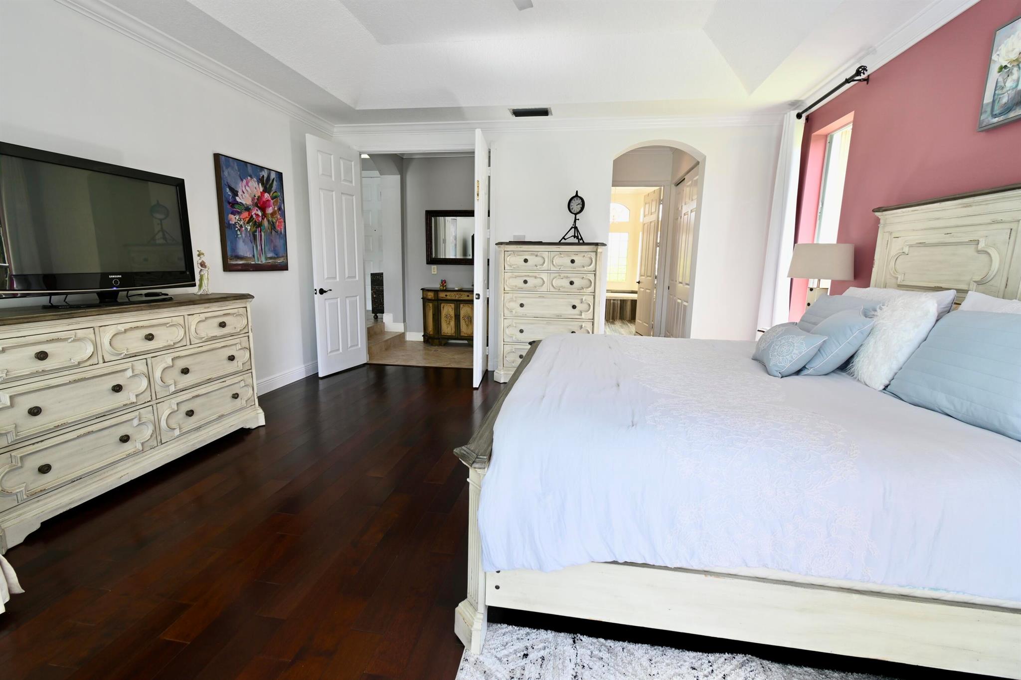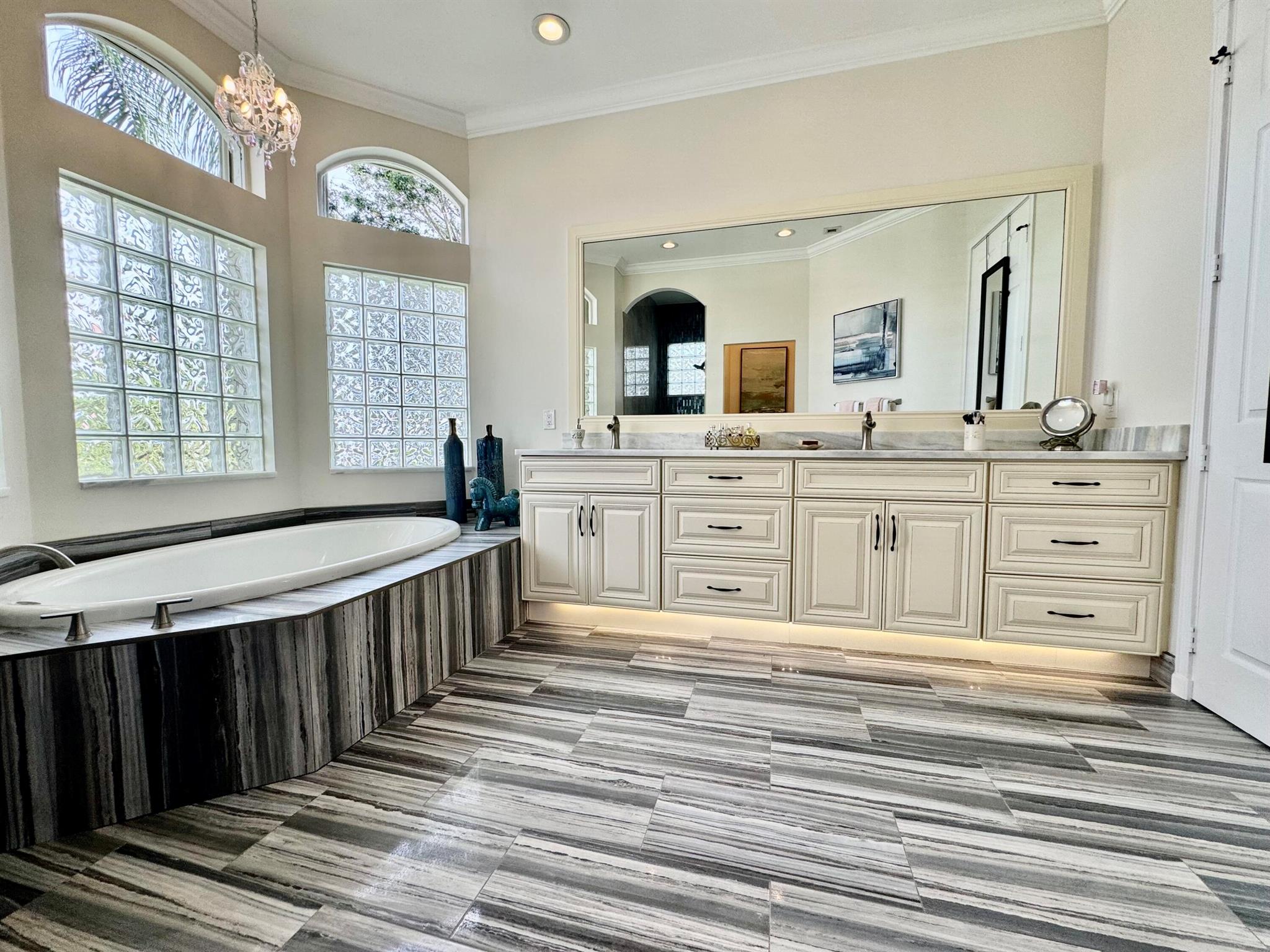 Nestled in the prestigious RESERVE section of Boca Isles South, this Palm Beacher model has the LARGEST LOT available in the neighborhood. The 5-bed, 3-bath waterfront home offers a luxurious & serene lifestyle with a magnificent pool overlooking the lake. An elegant circular driveway & 3-car garage welcome you to this home of distinction & elegance. The move-in-ready residence exudes sophistication with tile & hardwood flooring flowing seamlessly throughout. The kitchen, a chef's delight featuring granite countertops, farmhouse sink, stainless steel appliances, & convection stove. The kitchen offers seating at the counter, a separate breakfast area & a formal dining area. First floor primary suite is complete with walk-in closet, jetted tub, dual sinks, and a separate shower.