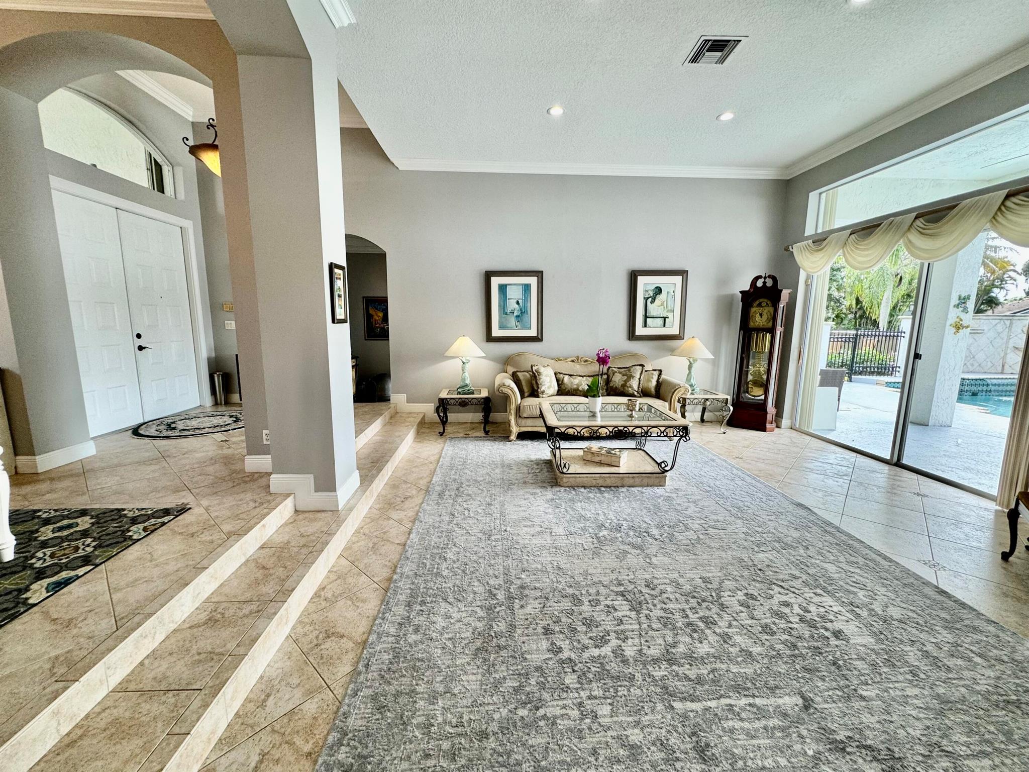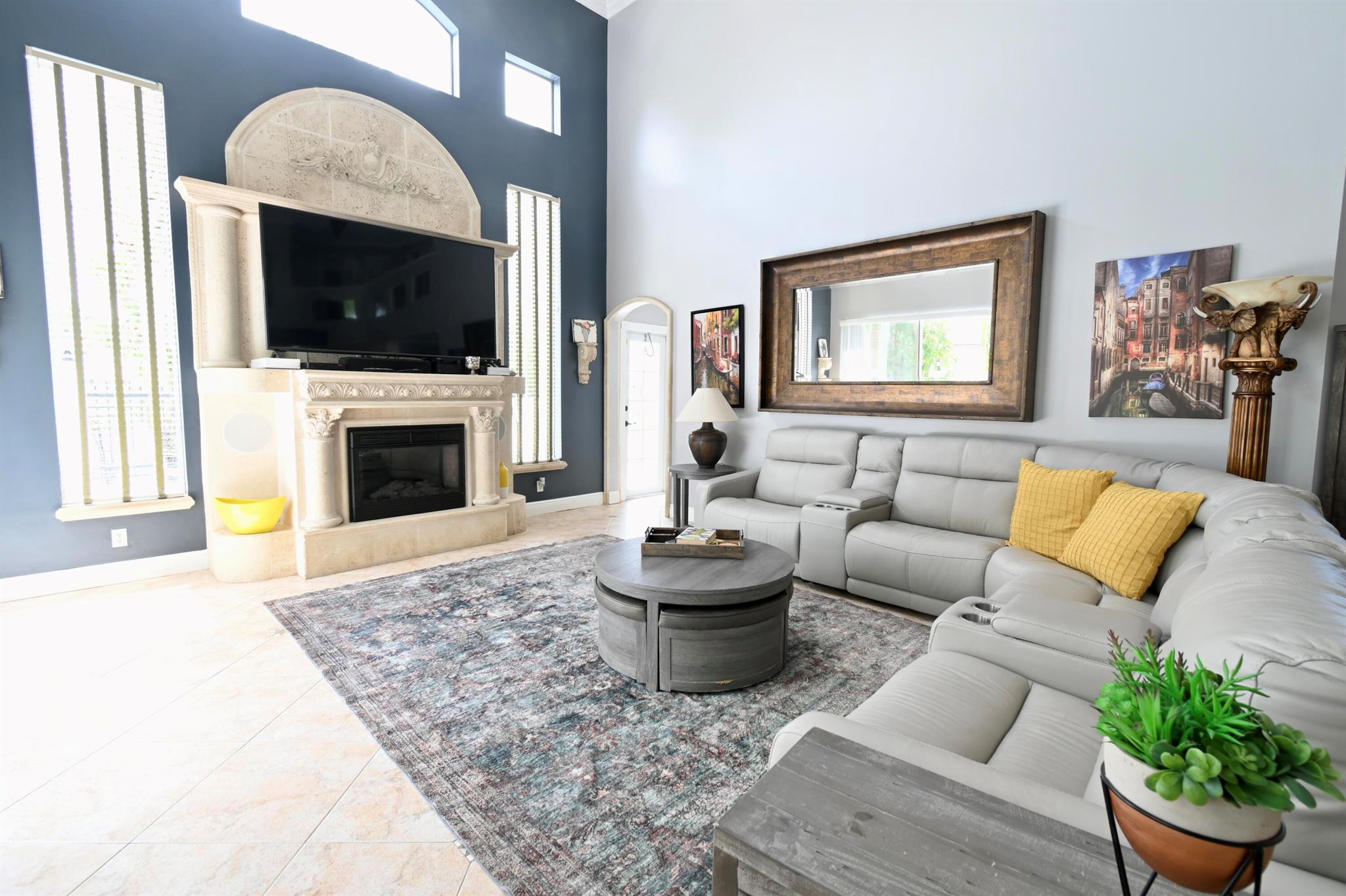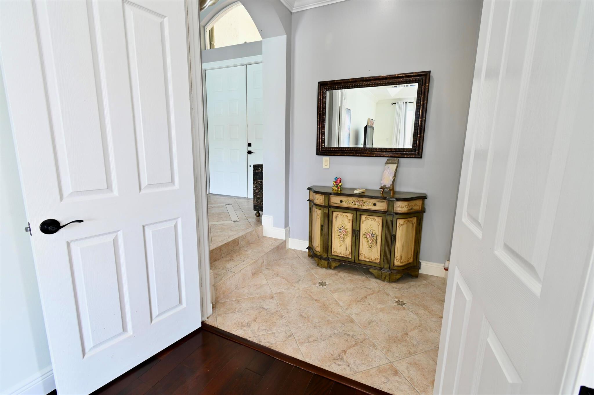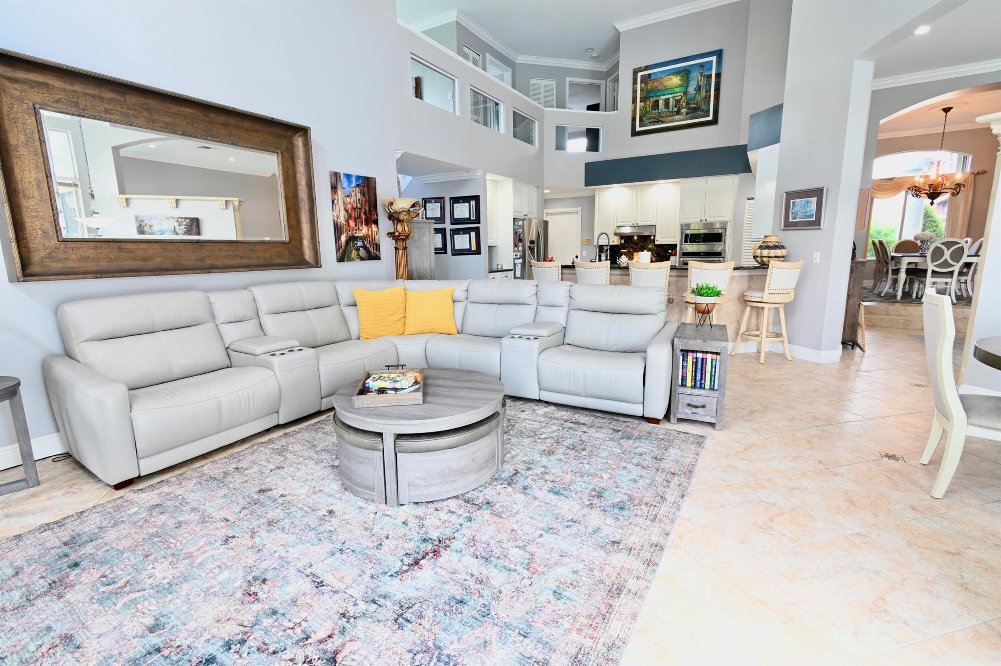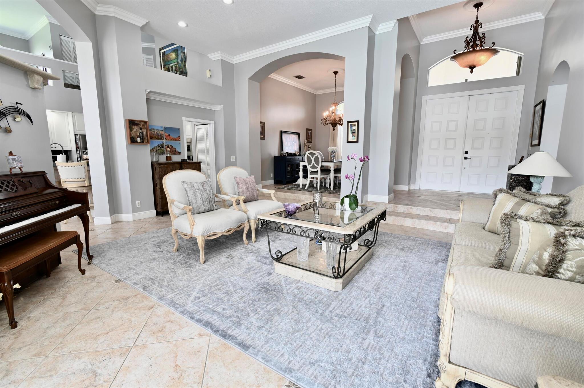 Nestled in the prestigious RESERVE section of Boca Isles South, this Palm Beacher model has the LARGEST LOT available in the neighborhood. The 5-bed, 3-bath waterfront home offers a luxurious & serene lifestyle with a magnificent pool overlooking the lake. An elegant circular driveway & 3-car garage welcome you to this home of distinction & elegance. The move-in-ready residence exudes sophistication with tile & hardwood flooring flowing seamlessly throughout. The kitchen, a chef's delight featuring granite countertops, farmhouse sink, stainless steel appliances, & convection stove. The kitchen offers seating at the counter, a separate breakfast area & a formal dining area. First floor primary suite is complete with walk-in closet, jetted tub, dual sinks, and a separate shower.
