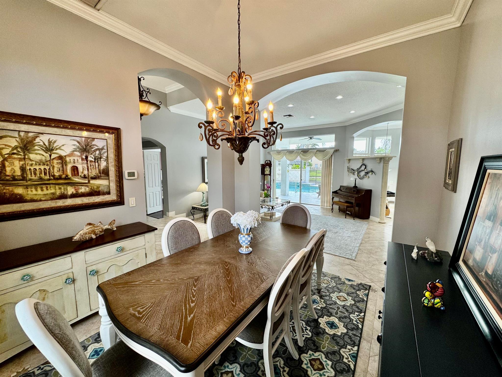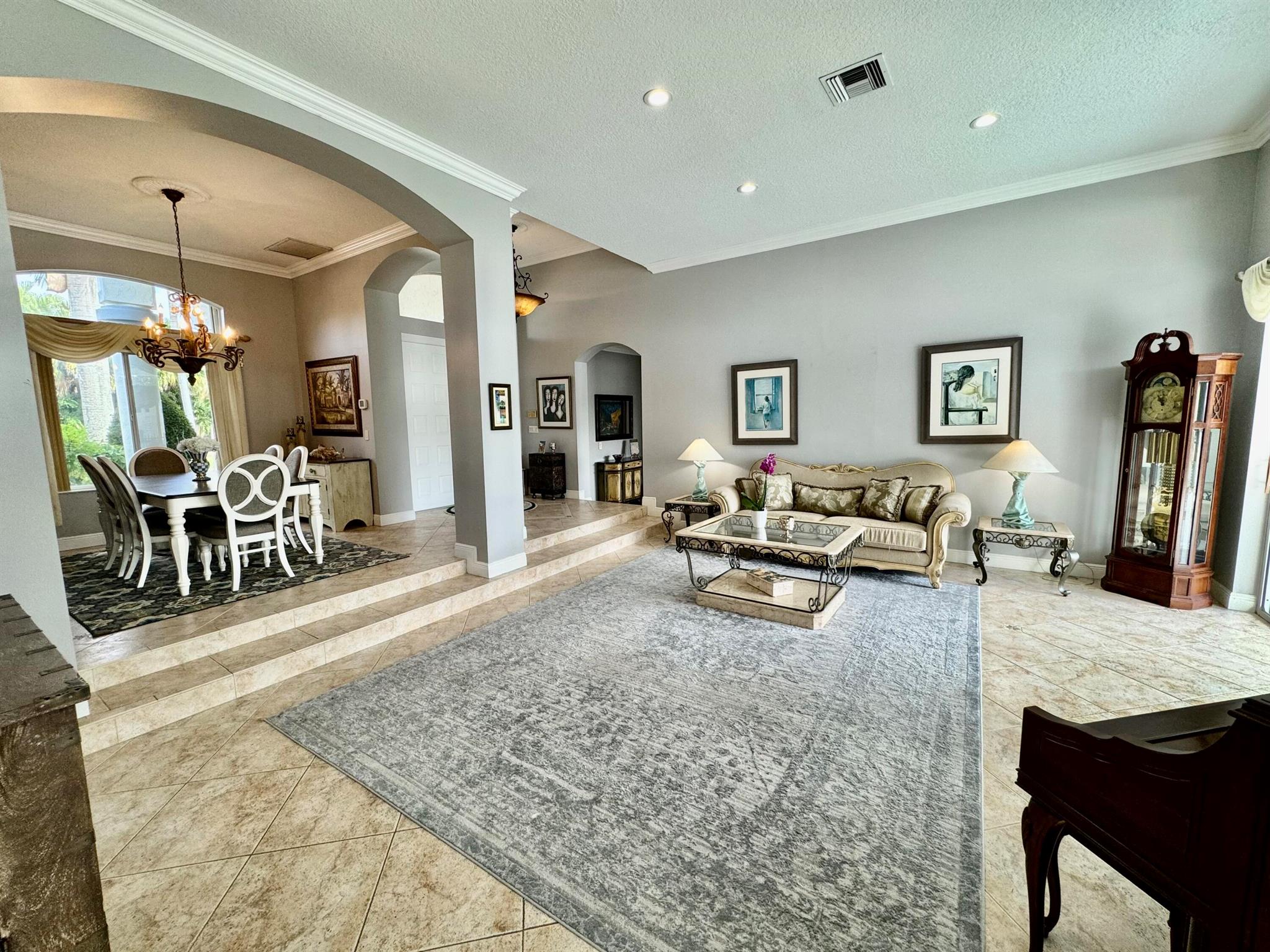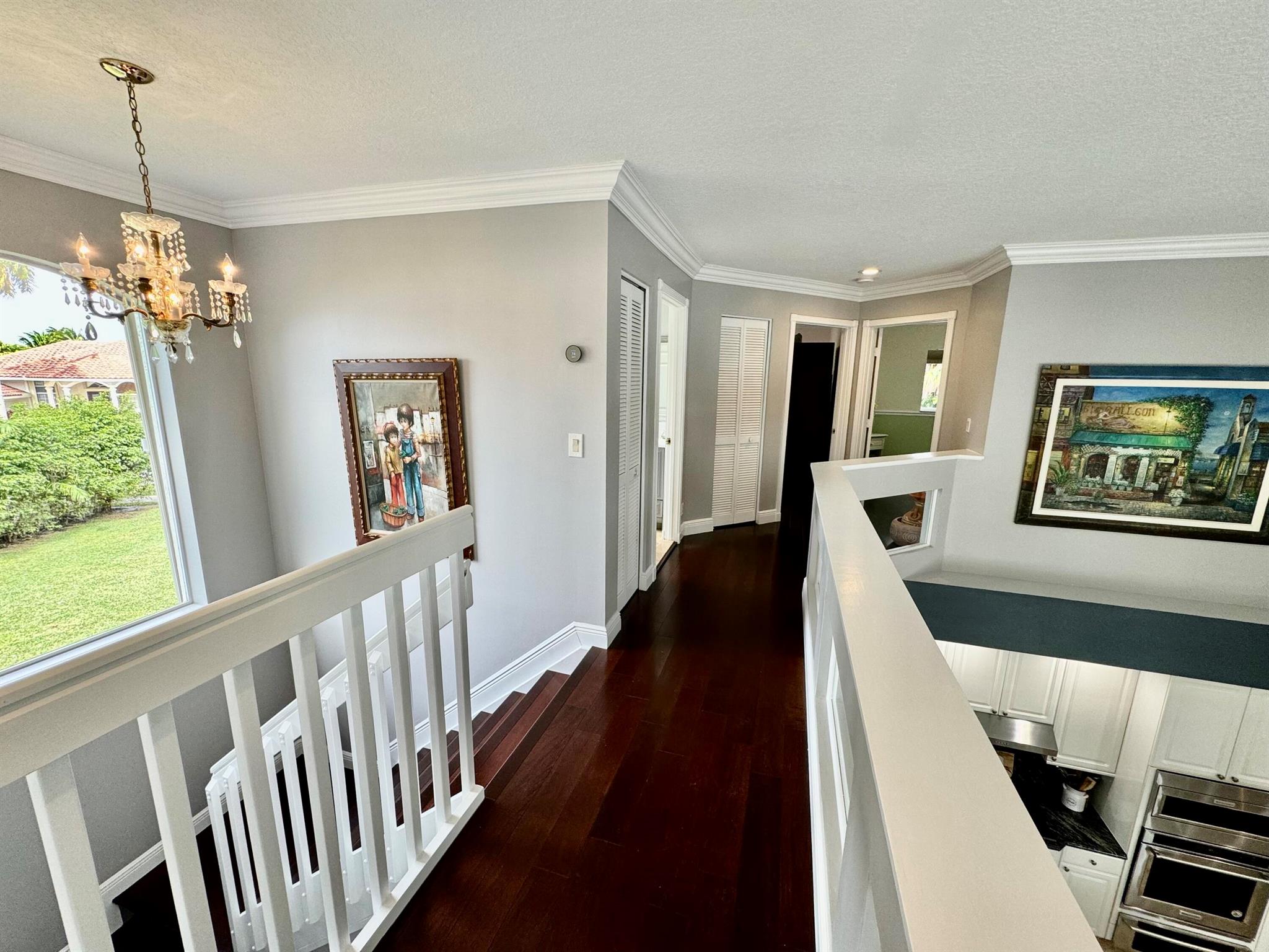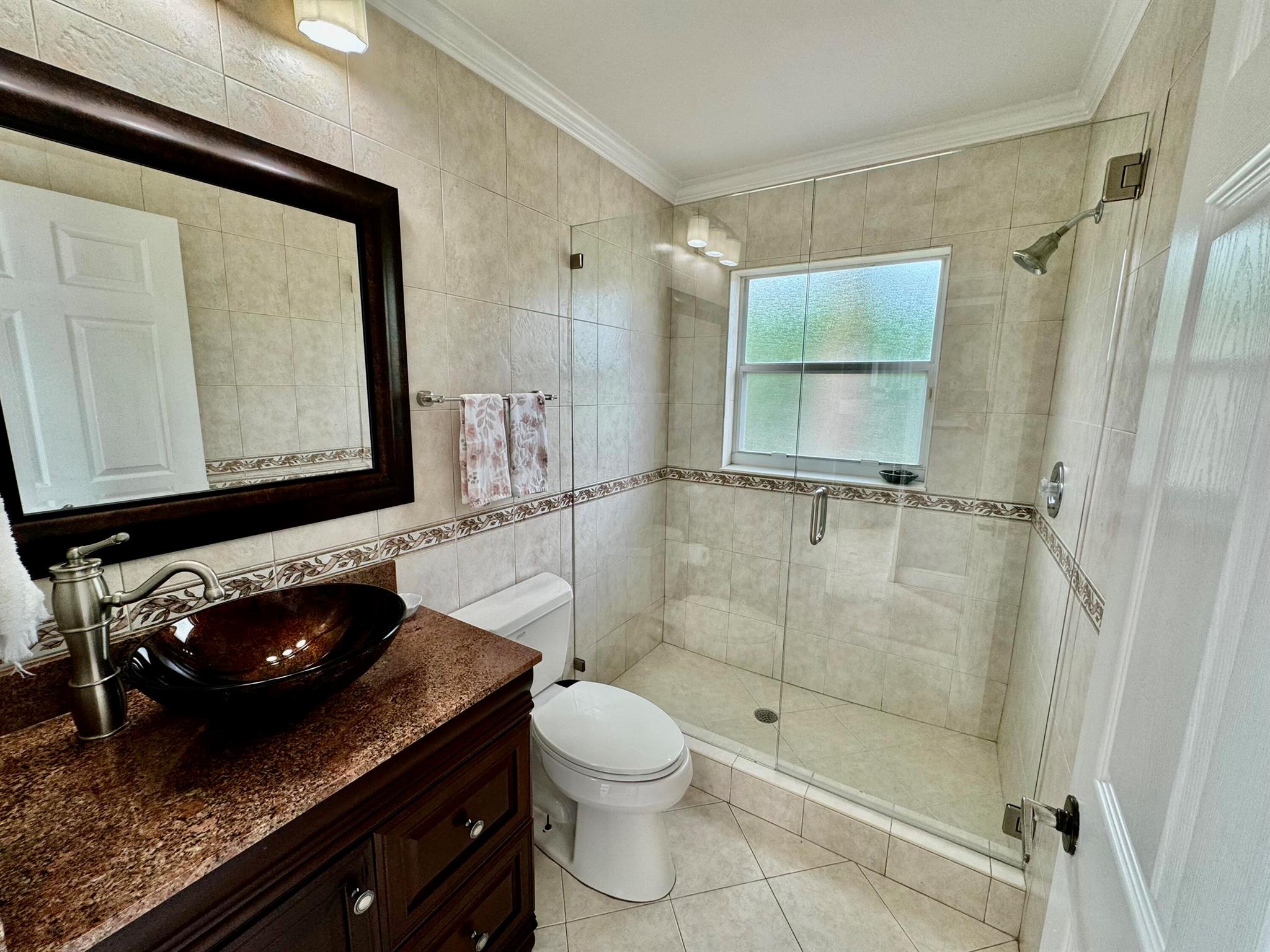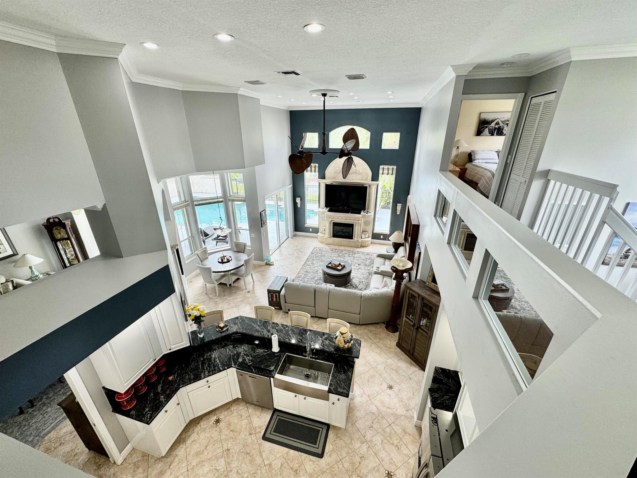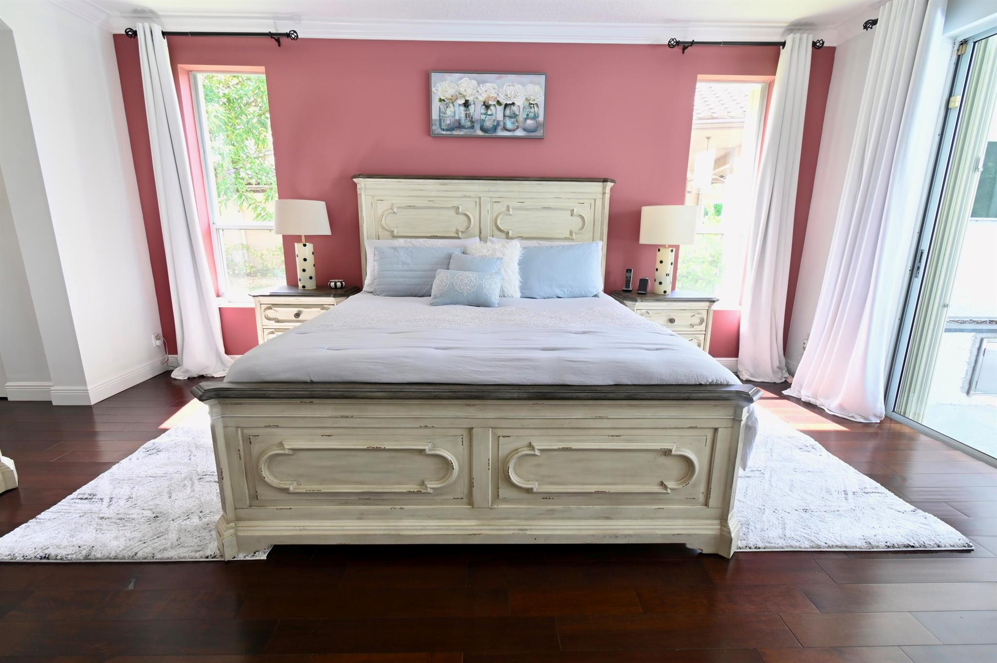 Nestled in the prestigious RESERVE section of Boca Isles South, this Palm Beacher model has the LARGEST LOT available in the neighborhood. The 5-bed, 3-bath waterfront home offers a luxurious & serene lifestyle with a magnificent pool overlooking the lake. An elegant circular driveway & 3-car garage welcome you to this home of distinction & elegance. The move-in-ready residence exudes sophistication with tile & hardwood flooring flowing seamlessly throughout. The kitchen, a chef's delight featuring granite countertops, farmhouse sink, stainless steel appliances, & convection stove. The kitchen offers seating at the counter, a separate breakfast area & a formal dining area. First floor primary suite is complete with walk-in closet, jetted tub, dual sinks, and a separate shower.