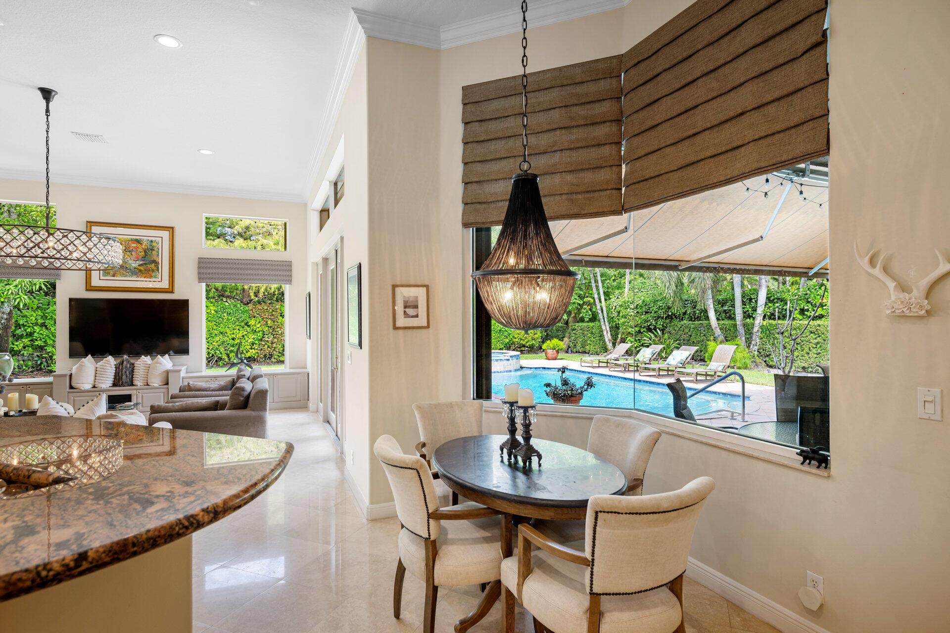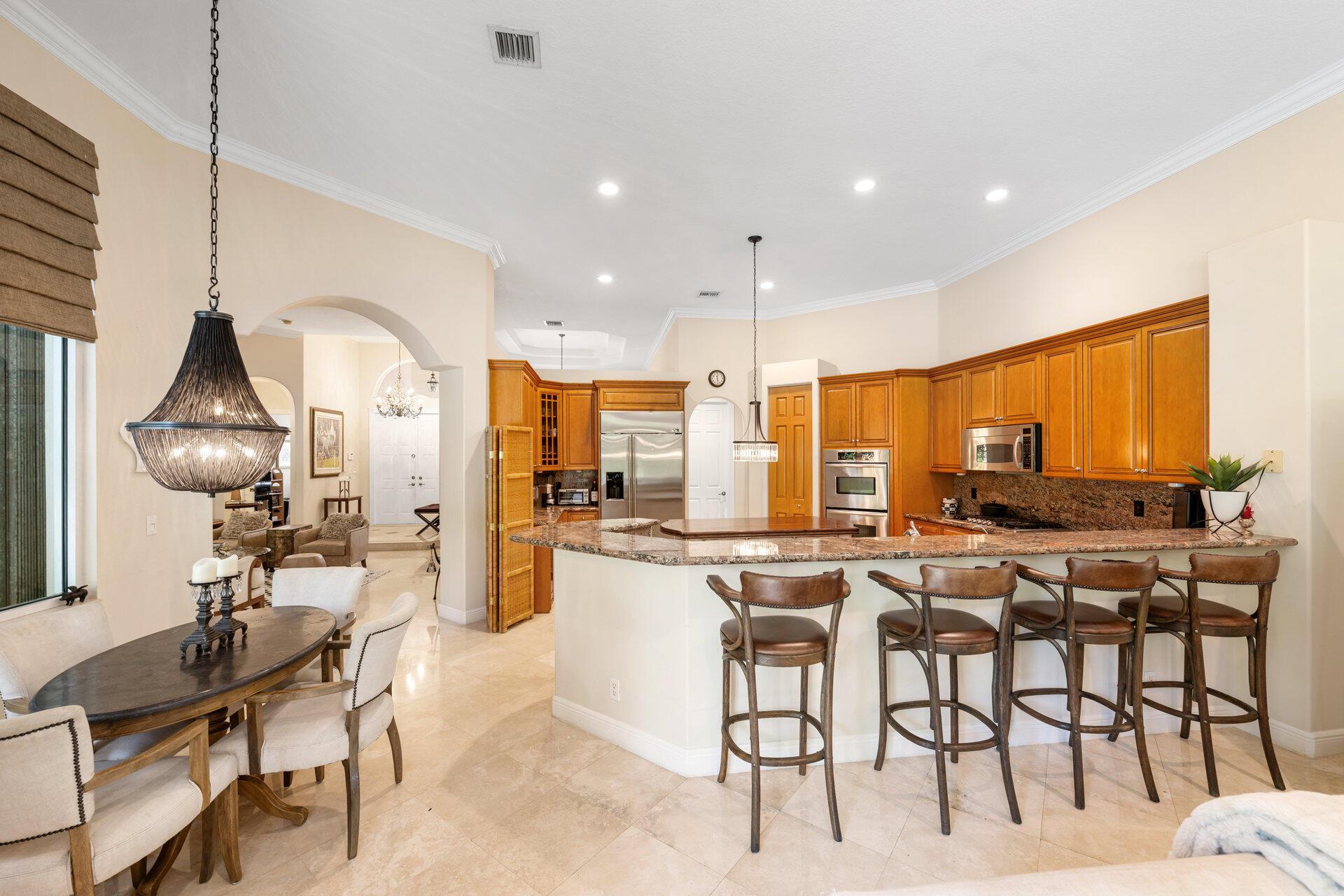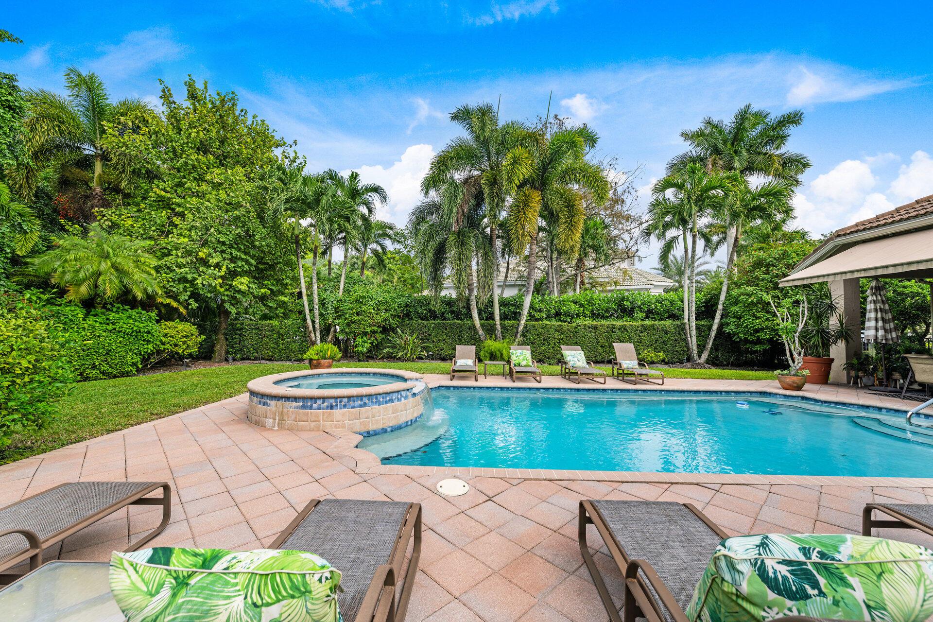 Elegant Former Model is located in the quant guard-gated community of Grand Cypress Estates. On .45 of an acre! This stunning home offers 4 spacious bedrooms, a versatile den/office, & 3 beautifully appointed bathrooms, all enhanced by luxurious Saturnia marble flooring that flow throughout the main areas. Step into an open-concept layout featuring a bright & inviting living space designed for comfort & effortless entertaining. The heart of the home is an expanded gourmet kitchen, fully equipped with a gas stove, that opens to both the family room & a cozy dinette area. The family room features a stunning stone wood-burning fireplace, adding warmth & charm to the space. With a seamless flow & picturesque views of the beautiful saltwater pool & fully-fenced in backyard.