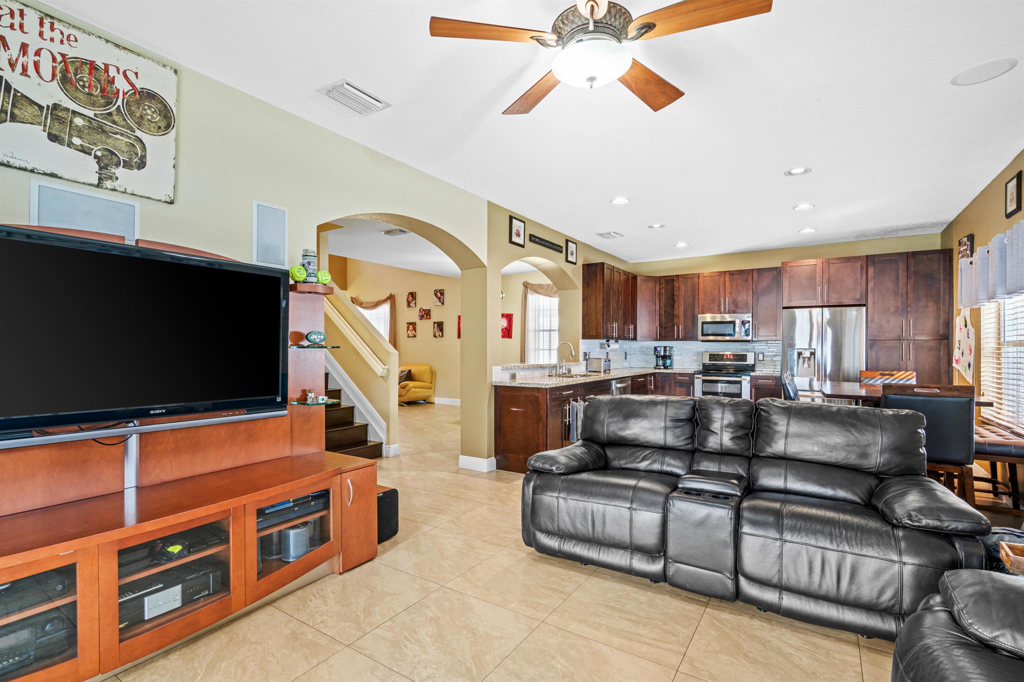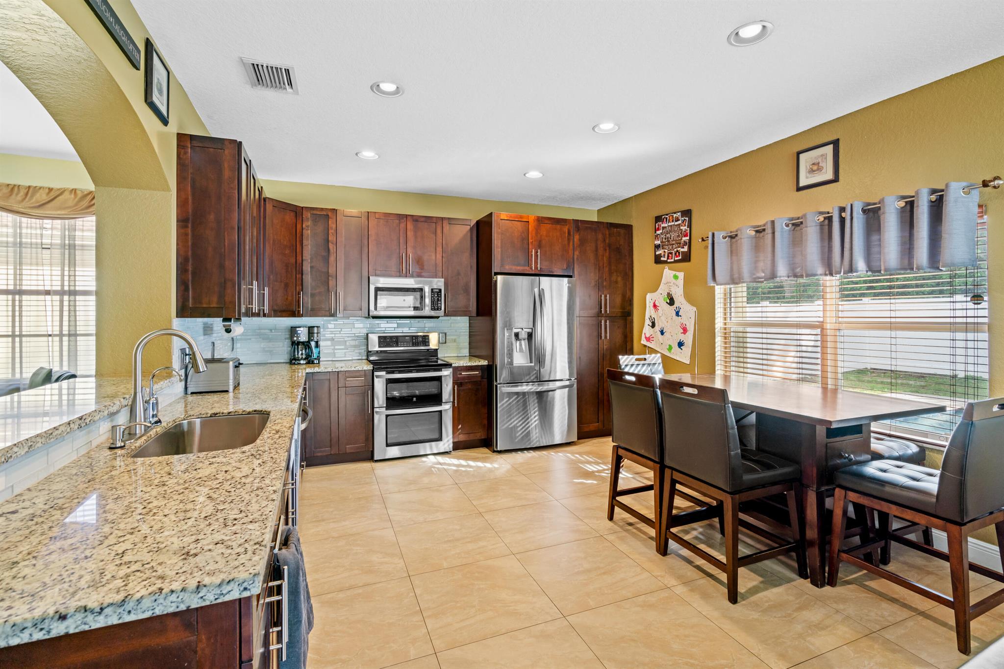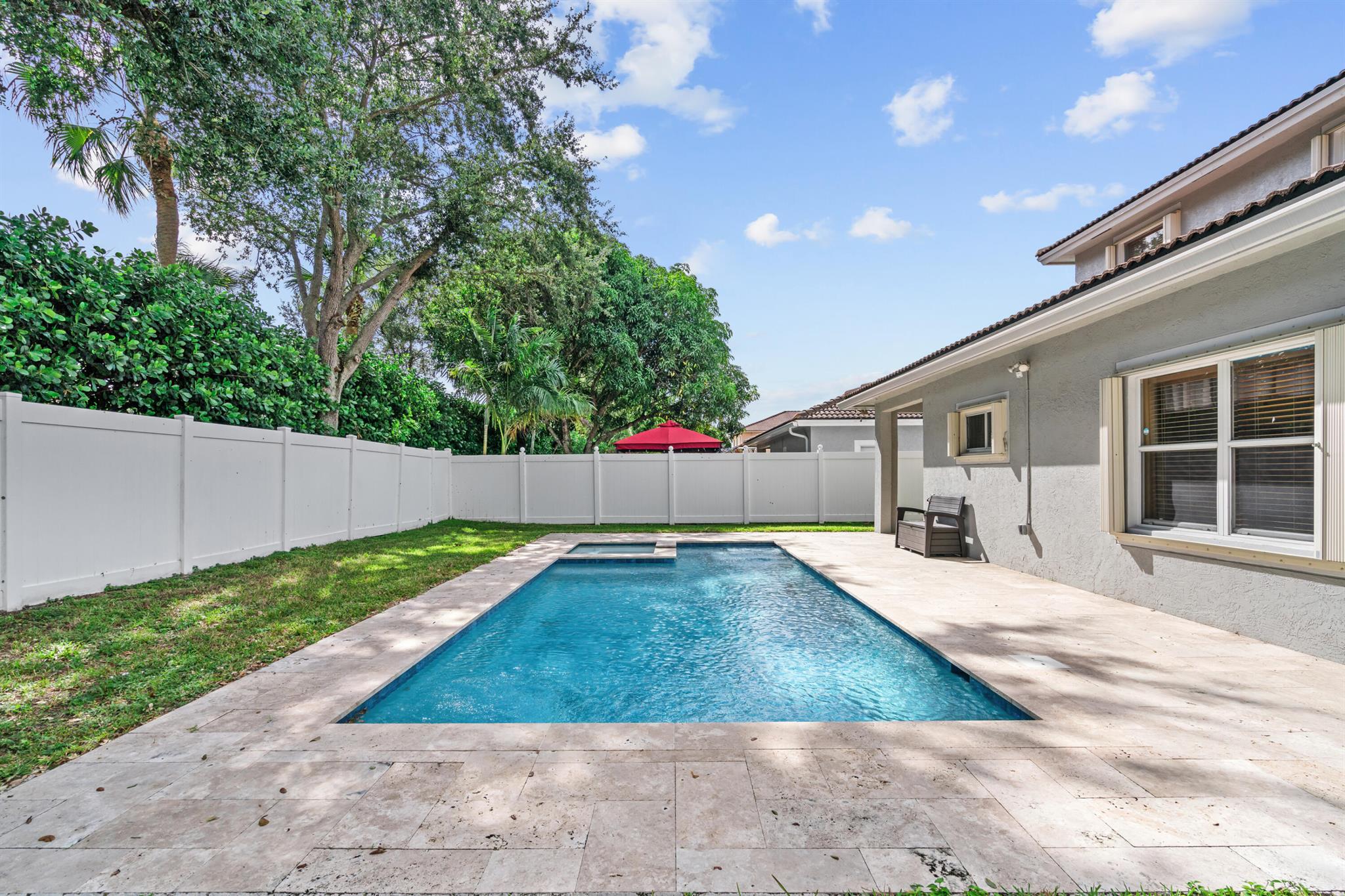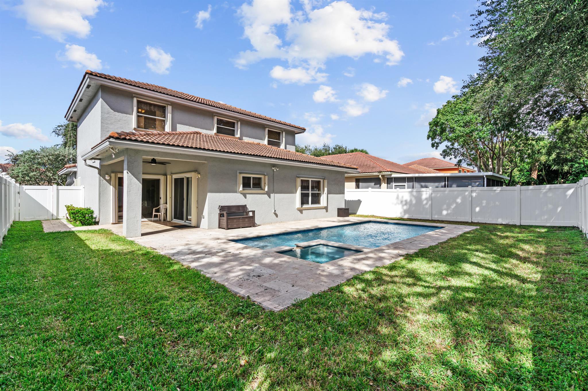 Set in the sought-after Walnut Creek community of Pembroke Pines, this refined two-story home spans 2180 sq ft w/ 4 bedrooms, 2 and a half baths, & a spacious 3-car garage. Community perks include a pool, playground, & clubhouse, ideal for an active lifestyle. Inside, tile flooring flows through the main level's airy layout, complemented by vaulted ceilings & stylish arched wall cutouts. The gourmet kitchen shines w/ granite countertops, stainless steel appliances & rich wood cabinetry. The primary suite, w/ direct pool access, offers serene luxury, while the private, fenced backyard boasts an electric-heated saltwater pool, spa & a covered patio for ultimate relaxation or entertaining. Upstairs, bedrooms feature a flex space for versatile use & a full bath w/ double vanities.