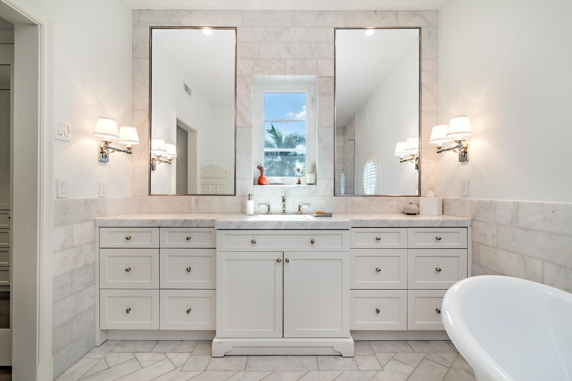 Stylishly remastered and beautifully appointed with gracious luxury details, this casually elegant Bermuda-style estate is enhanced by charming architectural features that deliver a fashion-forward look. On nearly an acre on a private cul-de-sac near ocean beach access, the fabulous backyard oasis is highlighted by a gas fireplace, while sparkling fountains arc over the new 50+/--ft. pool.