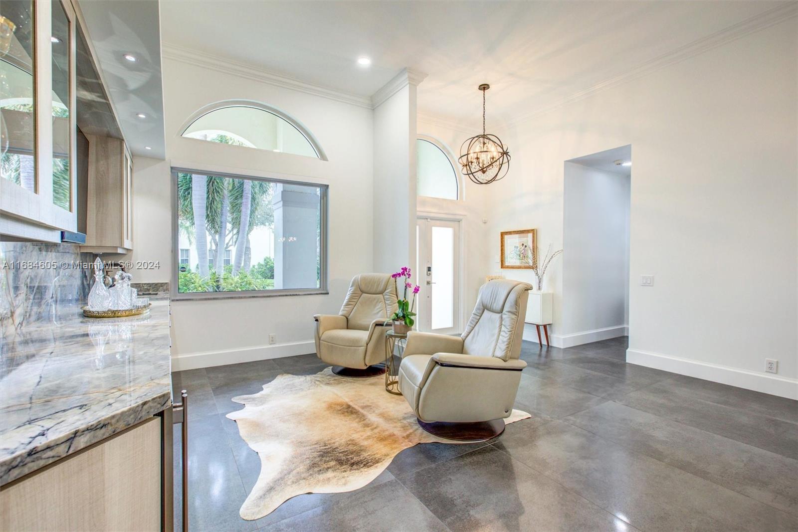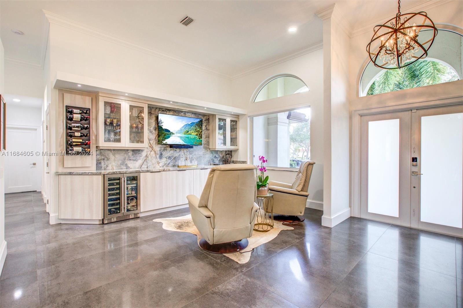 Welcome to this fully renovated, like-new home in Weston! Highlights include NEW ROOF (22), SOLAR PANELS, HVAC, IMPACT WINDOWS AND DOORS, and new paver driveway. Inside, 12-ft ceilings, imported Spanish porcelain tiles, and open concept with high-end finishes, built-in bar with Quartzite countertops, wine cooler, and bar sink. Gourmet kitchen features custom shaker cabinets, Diamante Quartz counters and backsplash, custom farmhouse sink, expansive island, and premium GE Profile appliances. Primary suite offers custom shades, built-in closets, spa-like bath with frameless shower and freestanding tub. Outdoors, heated saltwater pool/spa, covered patio, and fully fenced yard. Garage features epoxy flooring, ceiling storage racks, and 220V outlet for EV. (See attached full upgrade booklet)