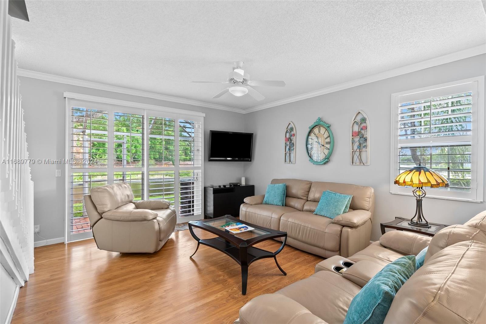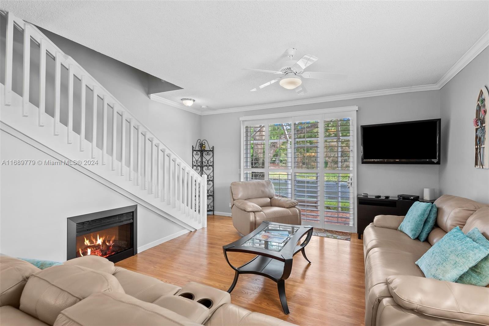 Townhome in the highly sought-after San Sebastian community in Weston! This end-unit boasts water views from every window, situated on a peaceful dead-end street. Inside, find freshly painted interiors, laminate wood flooring, crown molding throughout, and plantation shutters. The updated kitchen features granite countertops, stainless steel appliances, eat-in area perfect for casual dining. The house includes an attached garage and a comfortable living area with an electric fireplace and ceiling fans for added comfort. Step out onto the screened lanai to enjoy serene water views on both sides of the home. For peace of mind, hurricane shutters are also included. Enjoy community amenities, such as a sparkling pool and playground. Known for its A-rated schools. Quick access to I-75.