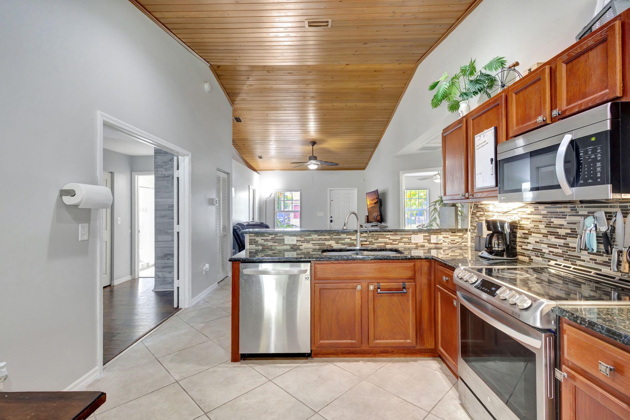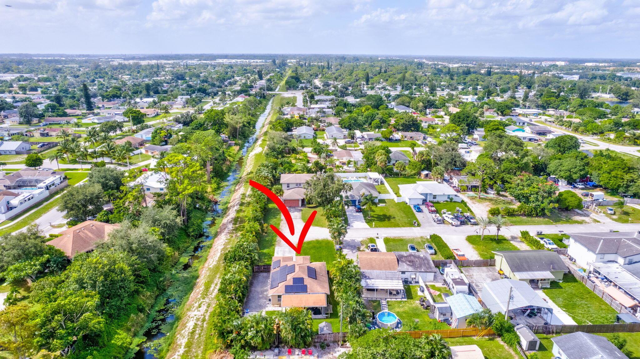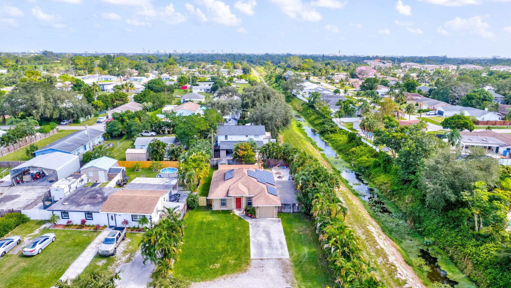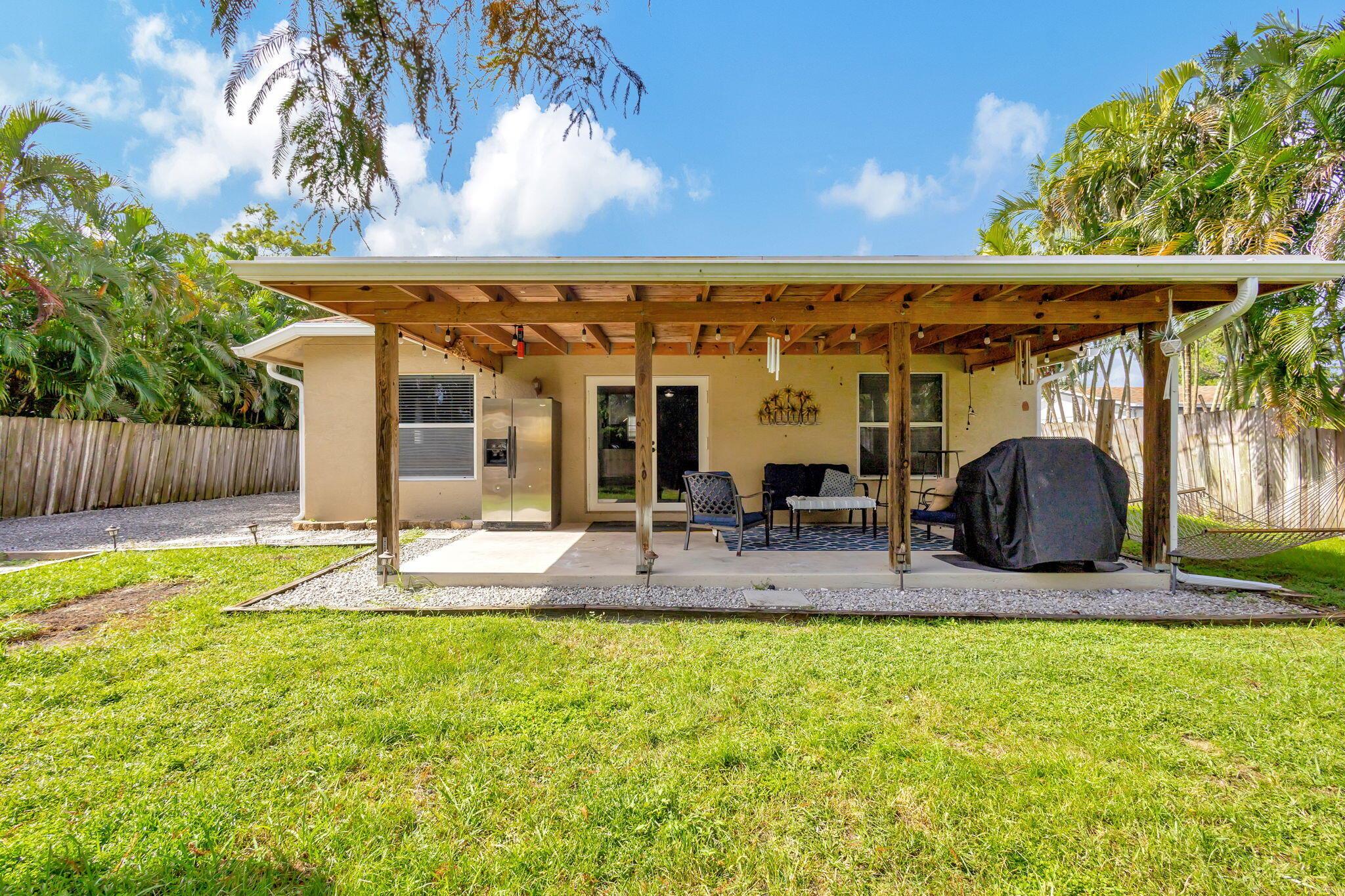 Escape to this beautifully updated 3-bedroom, 2-bath gem, nestled on a quiet, end-of-street location in the heart of West Palm Beach. This nearly 1/4-acre property offers peace, privacy, and a modern touch, perfect for those who crave a serene lifestyle. Step inside to find tile flooring throughout, a sleek kitchen with granite countertops, and stainless steel appliances--all designed to impress. The open floor plan is highlighted by a vaulted ceiling with wood shiplap, adding warmth and character to the space. The layout seamlessly flows into a spacious covered lanai with elegant twilight lighting, blending indoor and outdoor living beautifully. Outside, a privacy fence encloses the lush, landscaped backyard that backs up to a tranquil canal, enhancing the sense of seclusion.