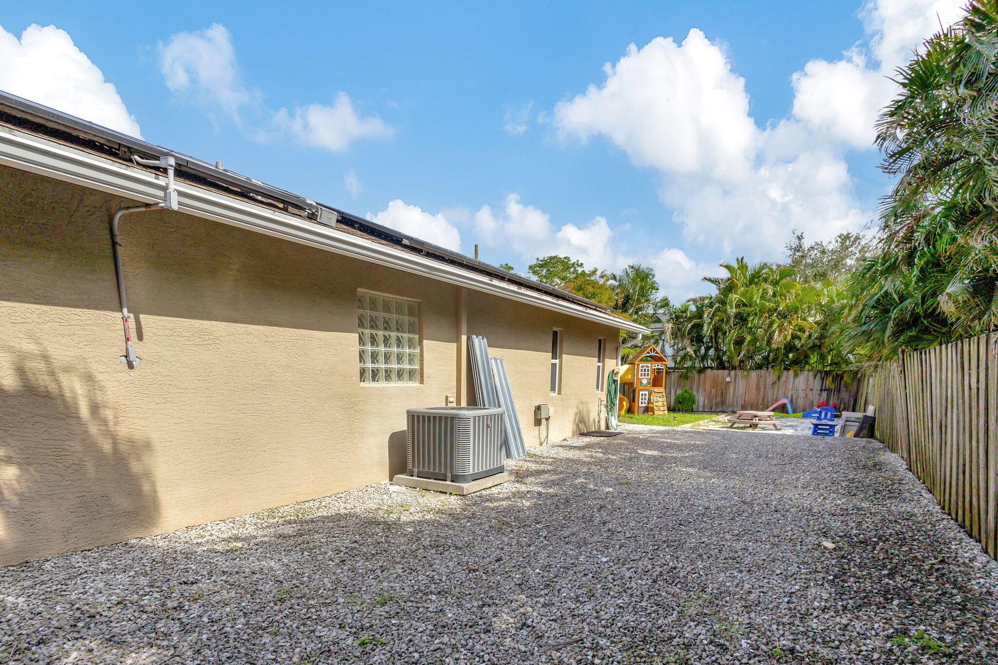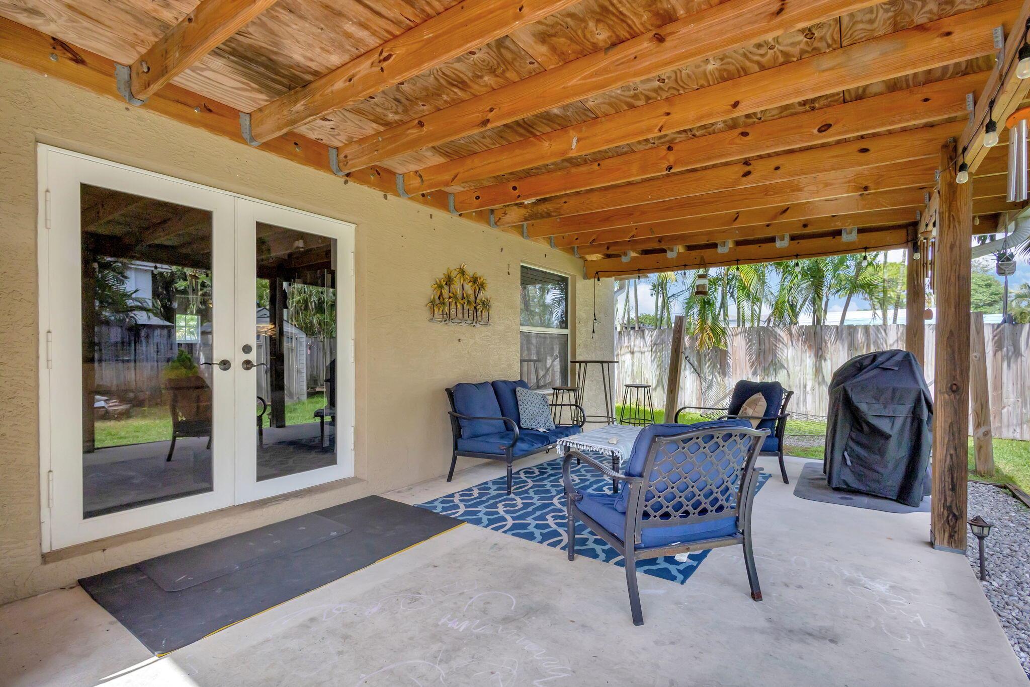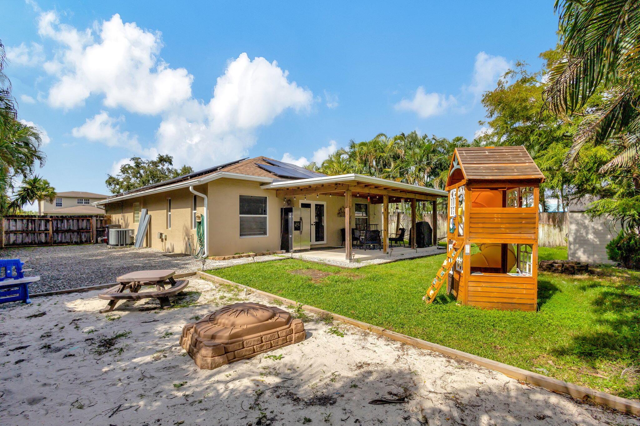 Escape to this beautifully updated 3-bedroom, 2-bath gem, nestled on a quiet, end-of-street location in the heart of West Palm Beach. This nearly 1/4-acre property offers peace, privacy, and a modern touch, perfect for those who crave a serene lifestyle. Step inside to find tile flooring throughout, a sleek kitchen with granite countertops, and stainless steel appliances--all designed to impress. The open floor plan is highlighted by a vaulted ceiling with wood shiplap, adding warmth and character to the space. The layout seamlessly flows into a spacious covered lanai with elegant twilight lighting, blending indoor and outdoor living beautifully. Outside, a privacy fence encloses the lush, landscaped backyard that backs up to a tranquil canal, enhancing the sense of seclusion.