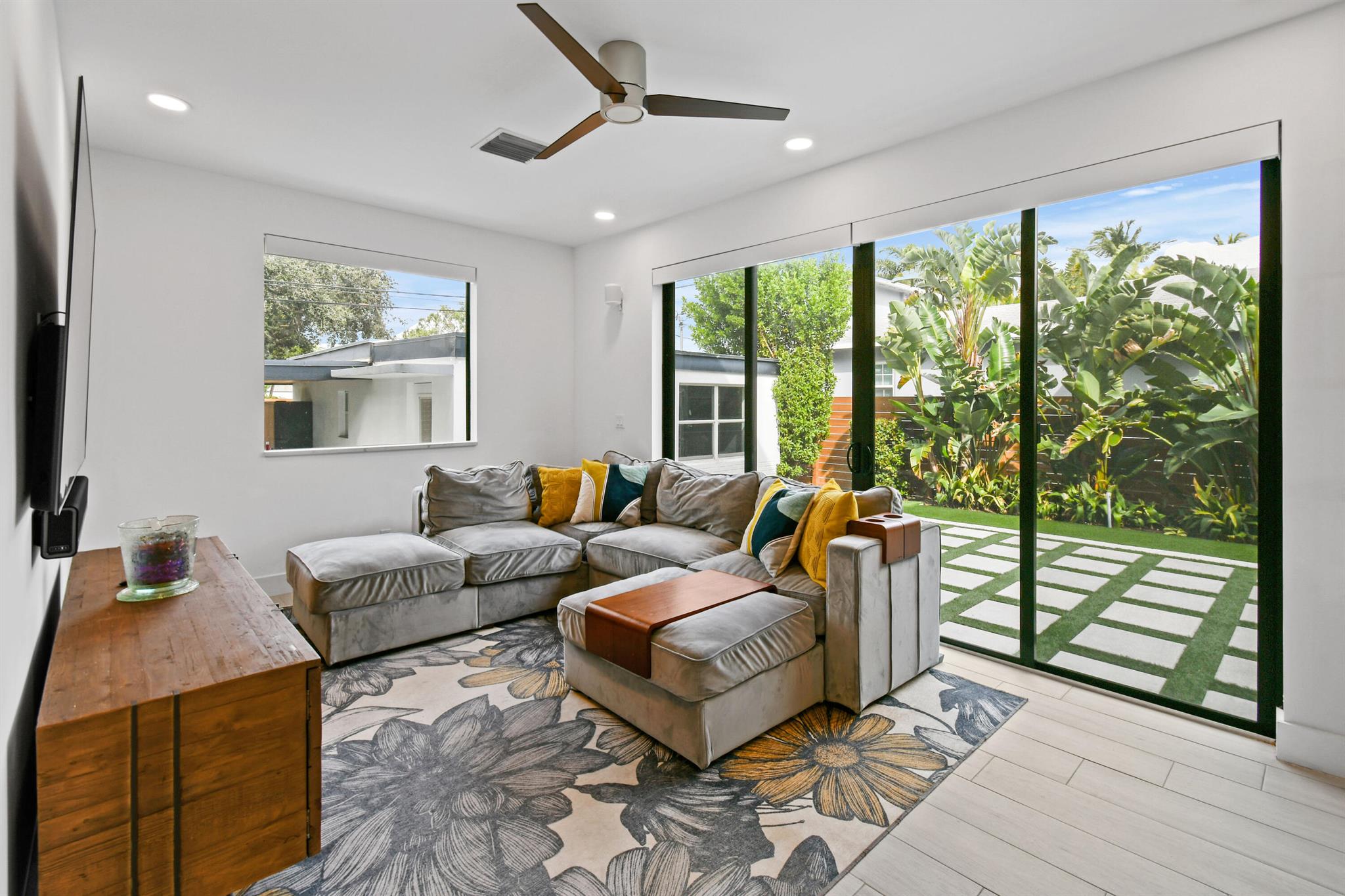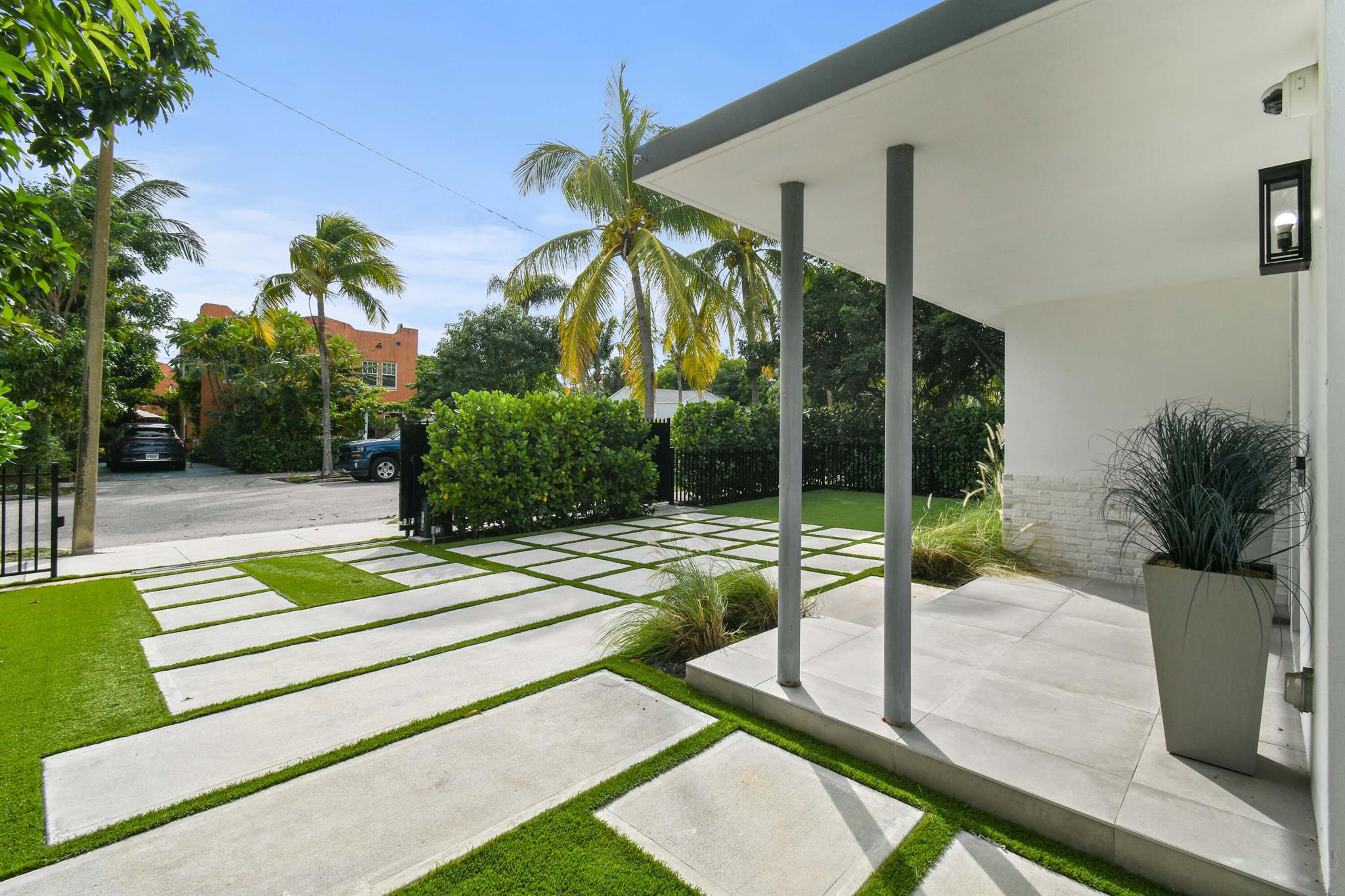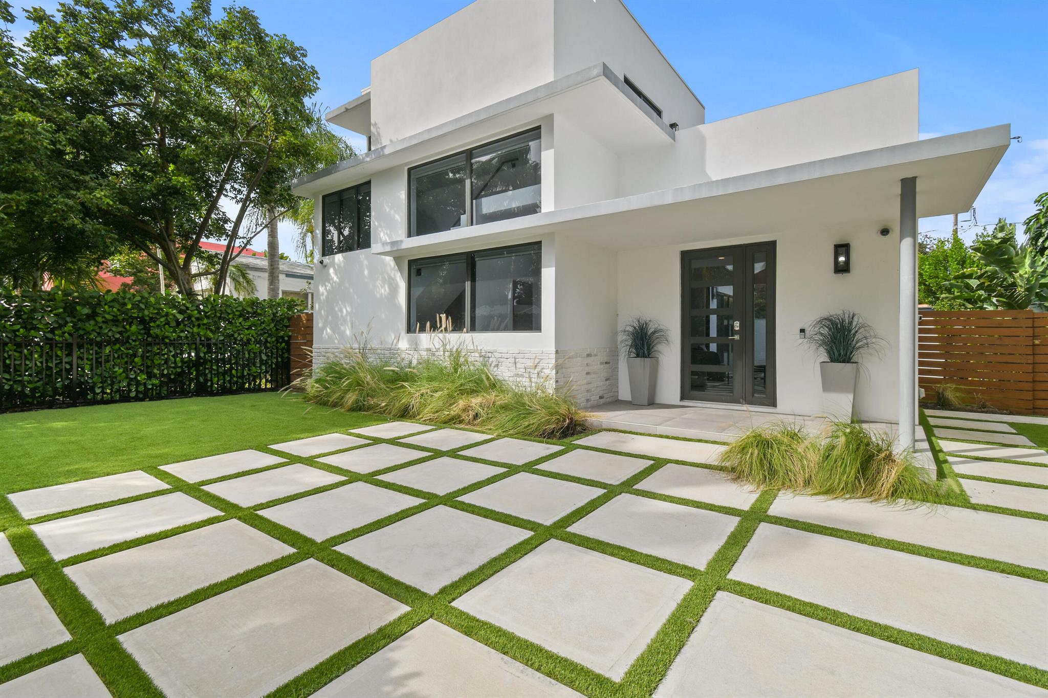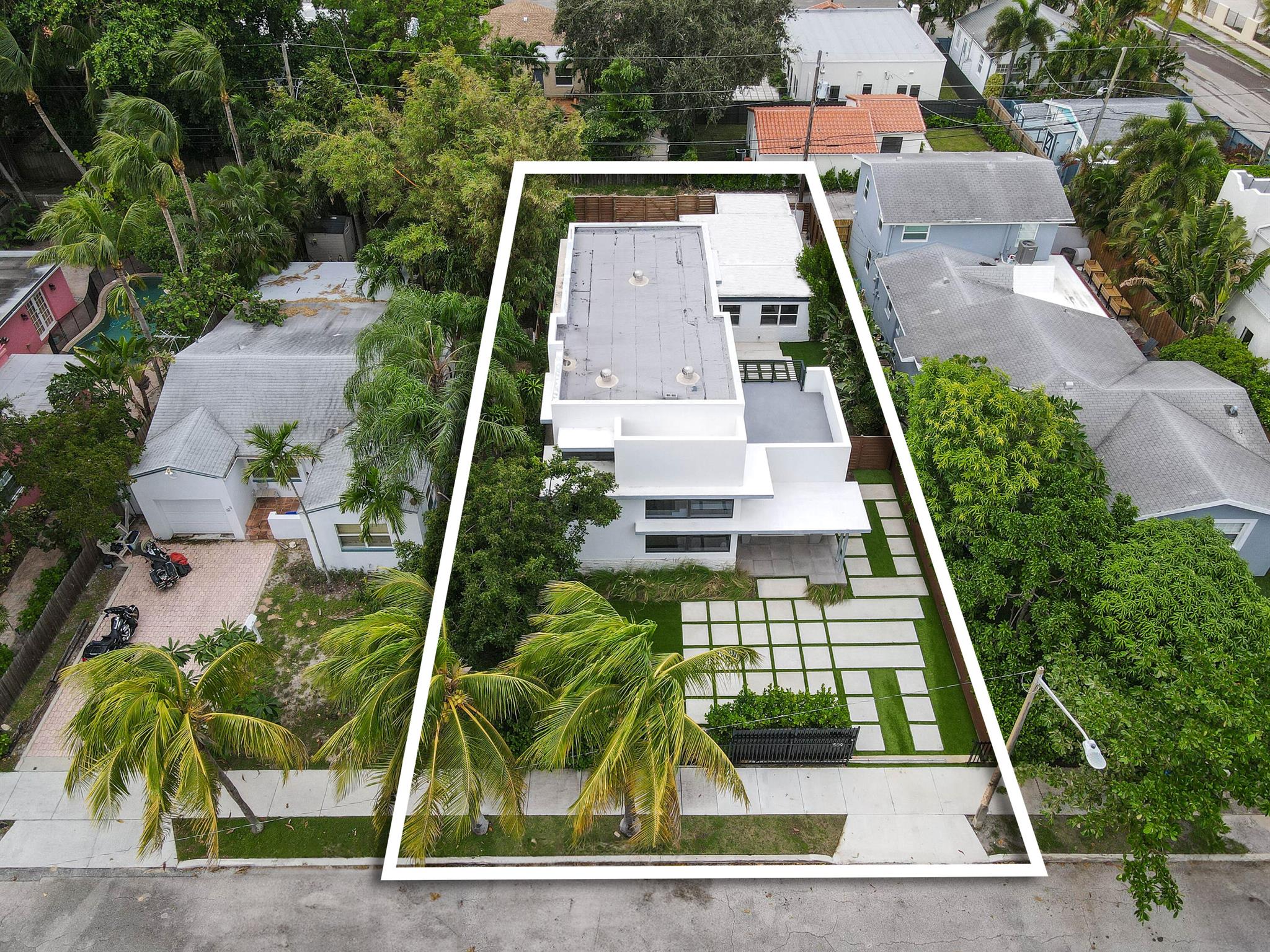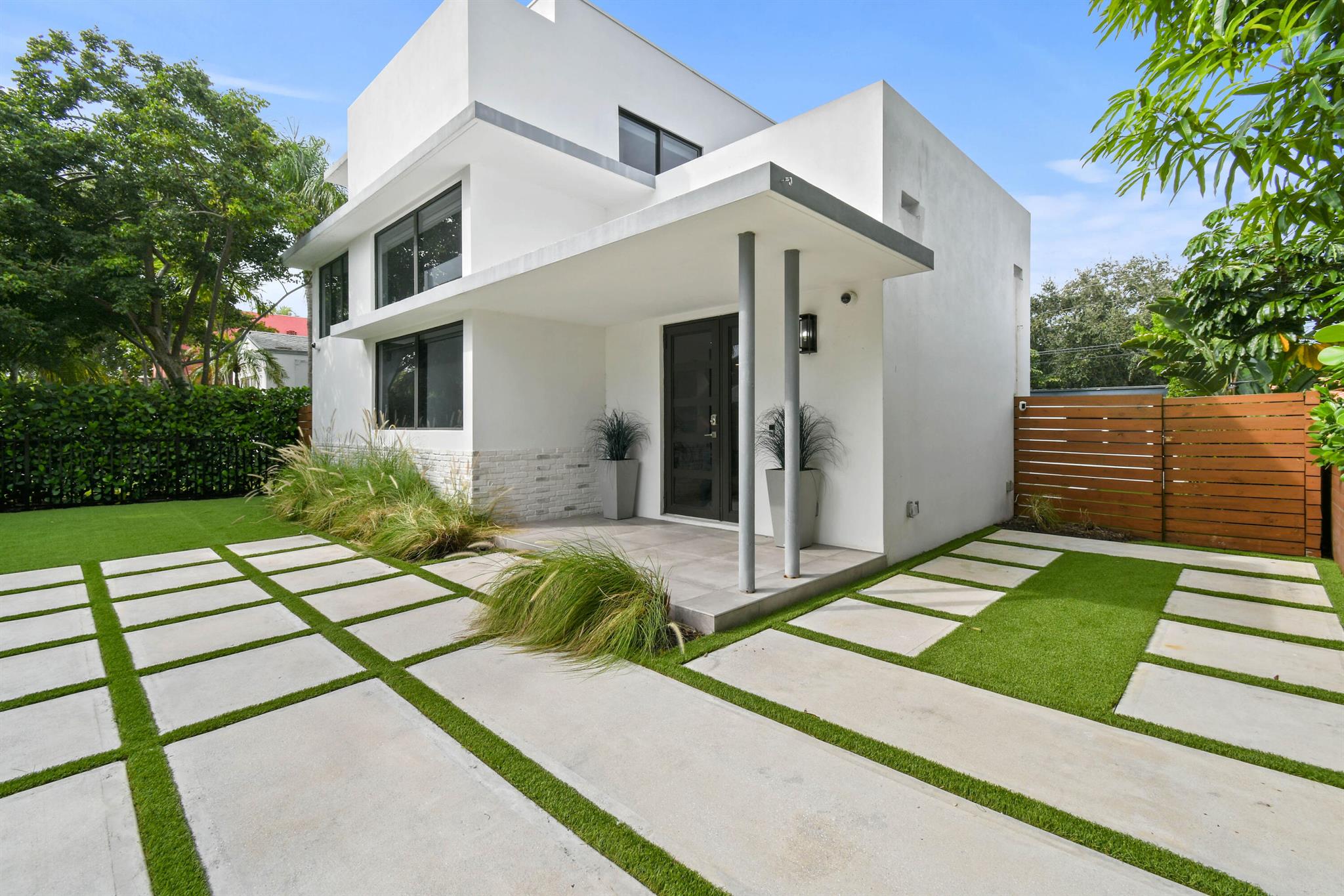 Stunning newer construction, contemporary CBS home with a private guest house sits just two streets from Flagler Drive in the historic Northwood neighborhood. Offering nearly 2,800 square feet of combined living space, this unique property includes both a main residence and a guest house. The main home spans approximately 2,100 square feet and features 3 bedrooms, 2.5 bathrooms, and elegant porcelain tile throughout. The kitchen showcases a spacious quartz island with a waterfall edge, a farmhouse sink, stainless steel appliances including a top-of-the-line dishwasher. Surrounded by privacy hedges with an electronic front gate, fully turfed yard, this home also features Lutron shades, impact-resistant glass, brand new A/C and security system in both houses including Ring & CCTV with