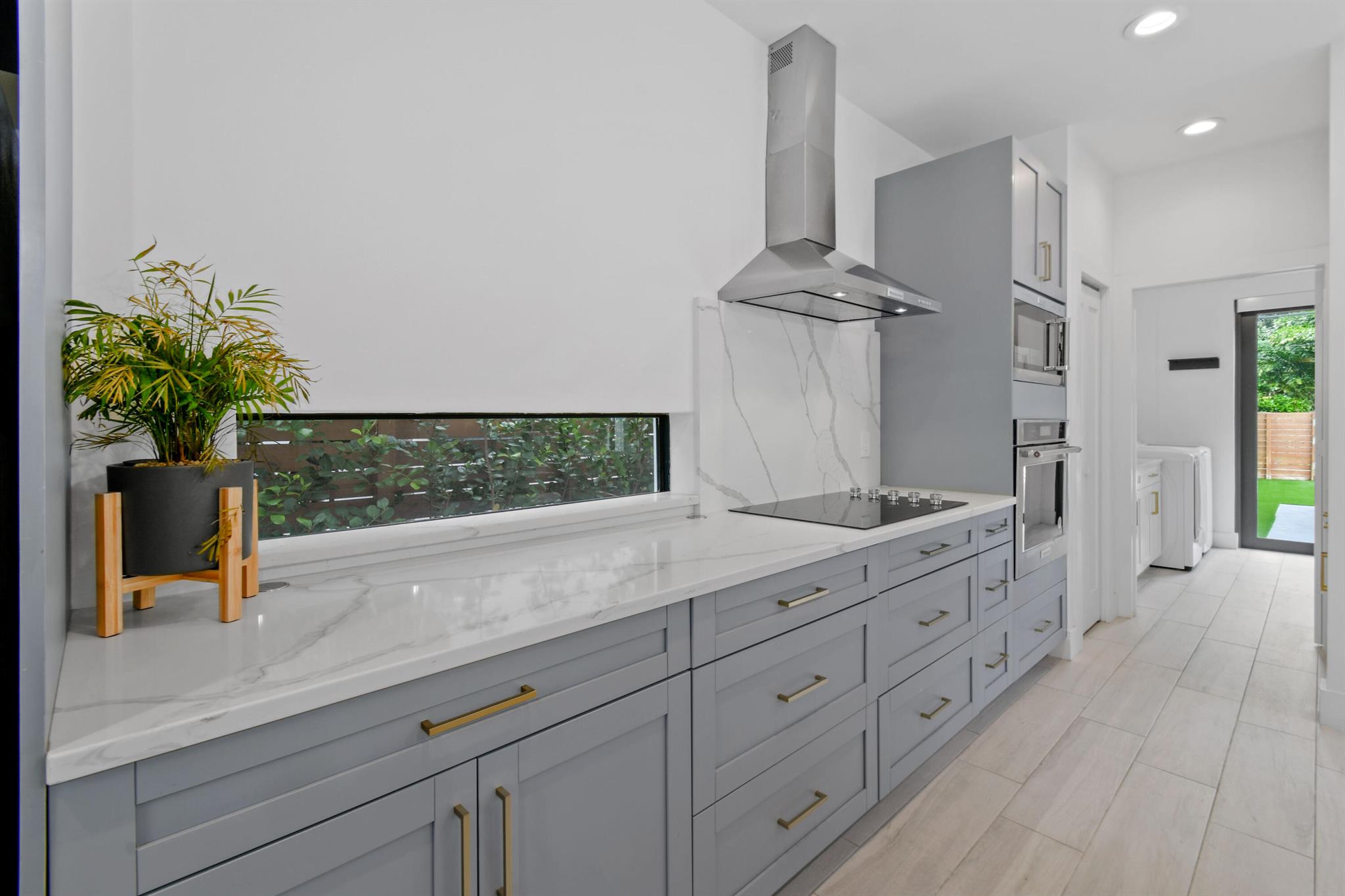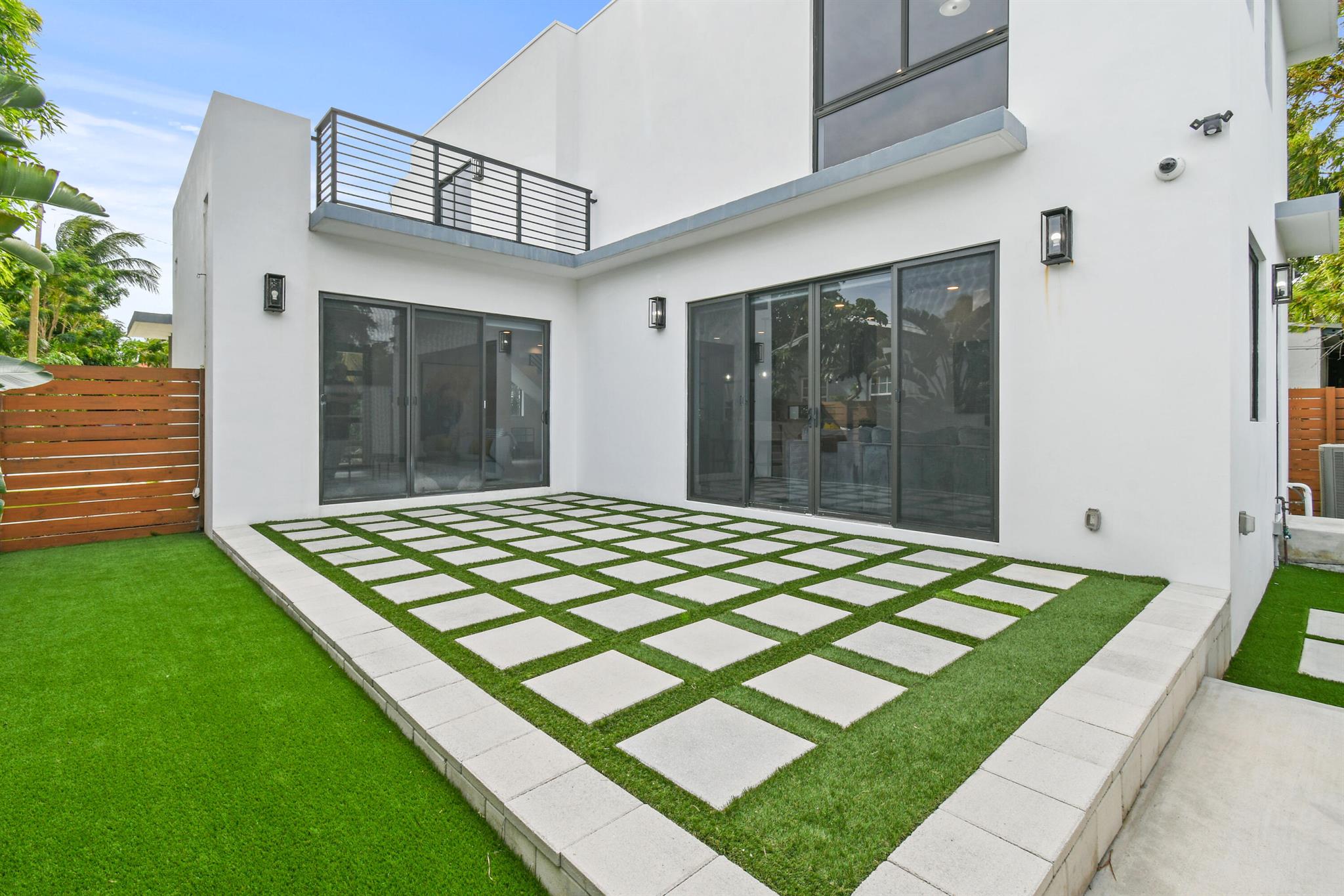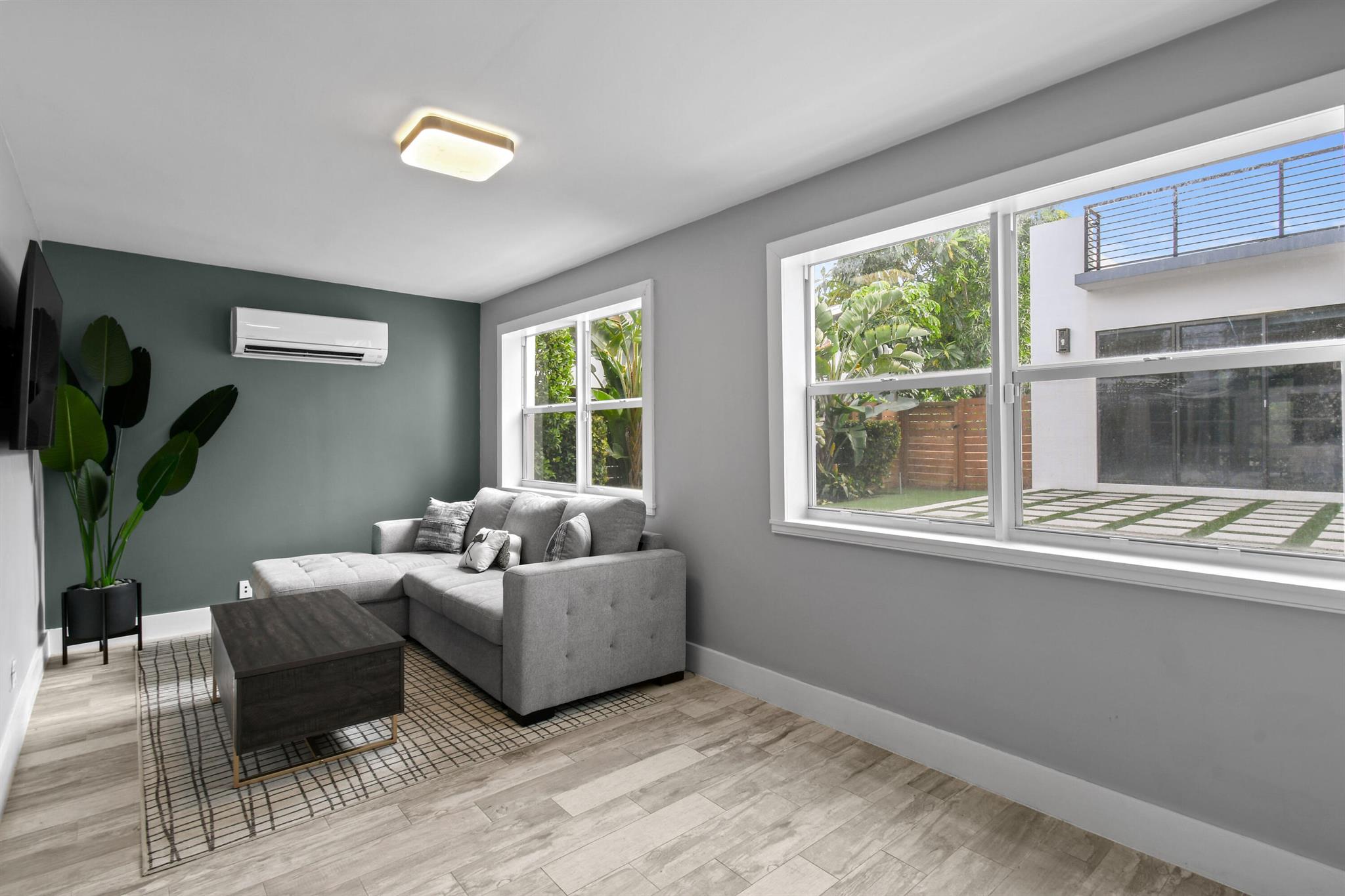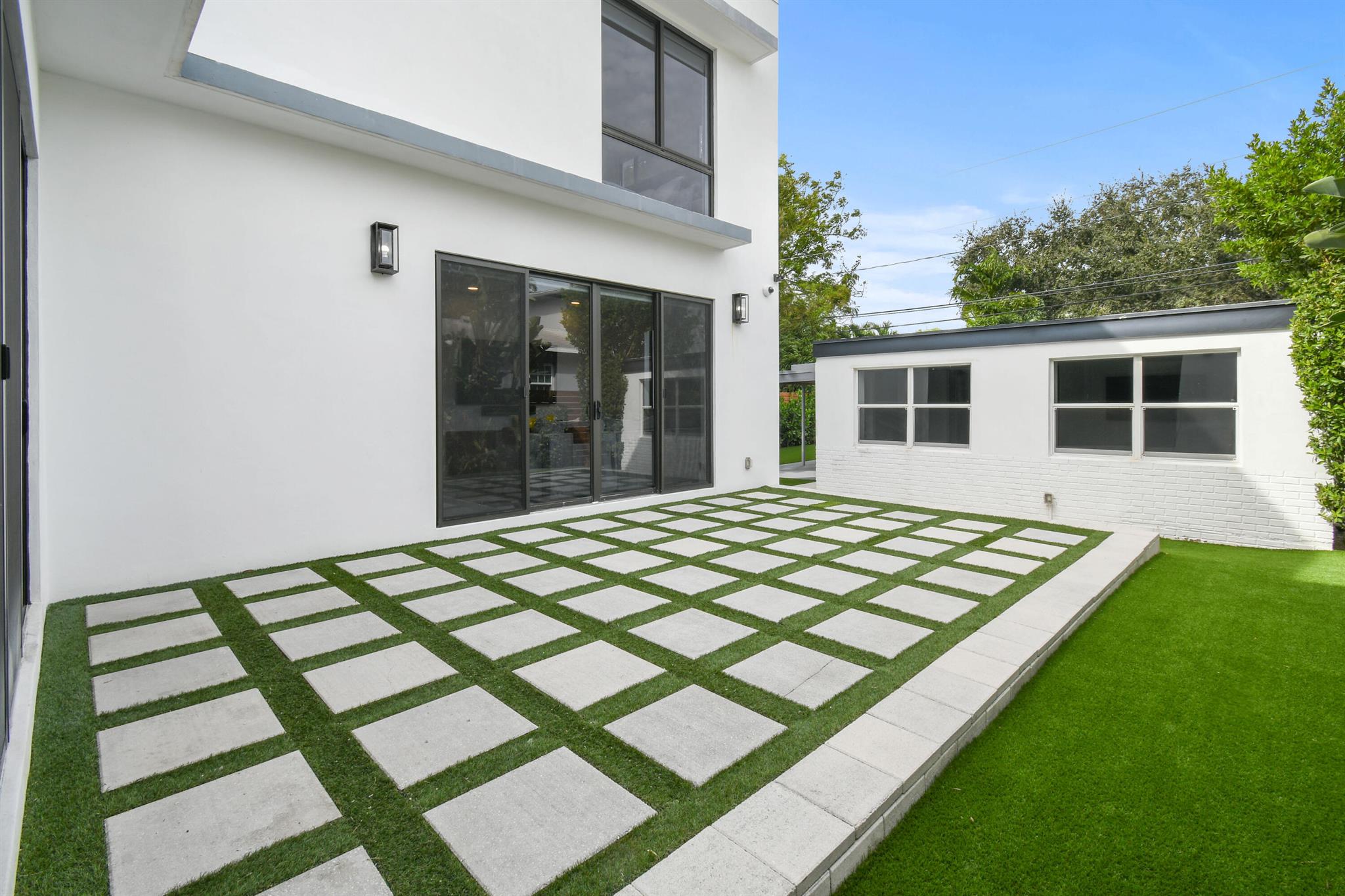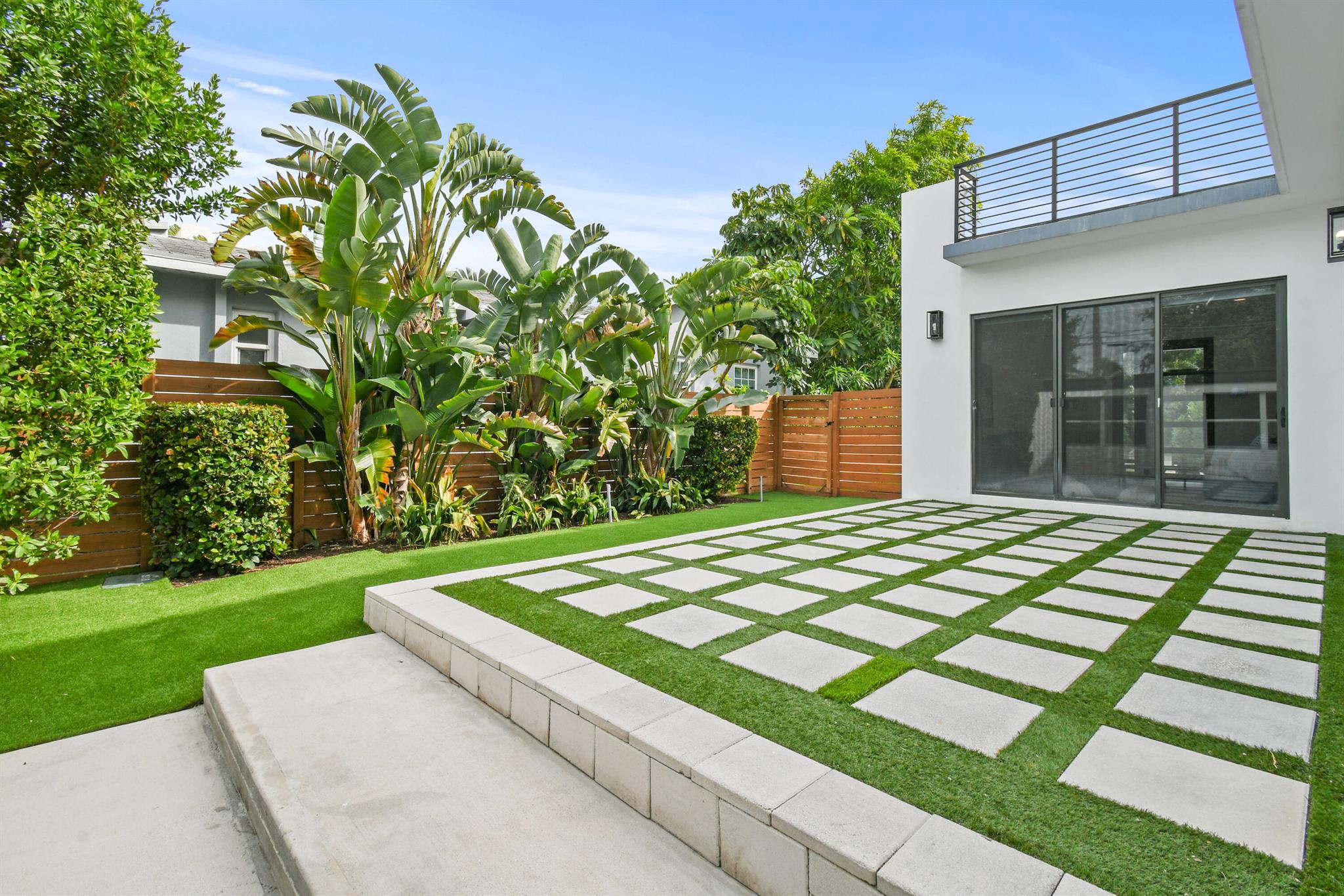 Stunning newer construction, contemporary CBS home with a private guest house sits just two streets from Flagler Drive in the historic Northwood neighborhood. Offering nearly 2,800 square feet of combined living space, this unique property includes both a main residence and a guest house. The main home spans approximately 2,100 square feet and features 3 bedrooms, 2.5 bathrooms, and elegant porcelain tile throughout. The kitchen showcases a spacious quartz island with a waterfall edge, a farmhouse sink, stainless steel appliances including a top-of-the-line dishwasher. Surrounded by privacy hedges with an electronic front gate, fully turfed yard, this home also features Lutron shades, impact-resistant glass, brand new A/C and security system in both houses including Ring & CCTV with