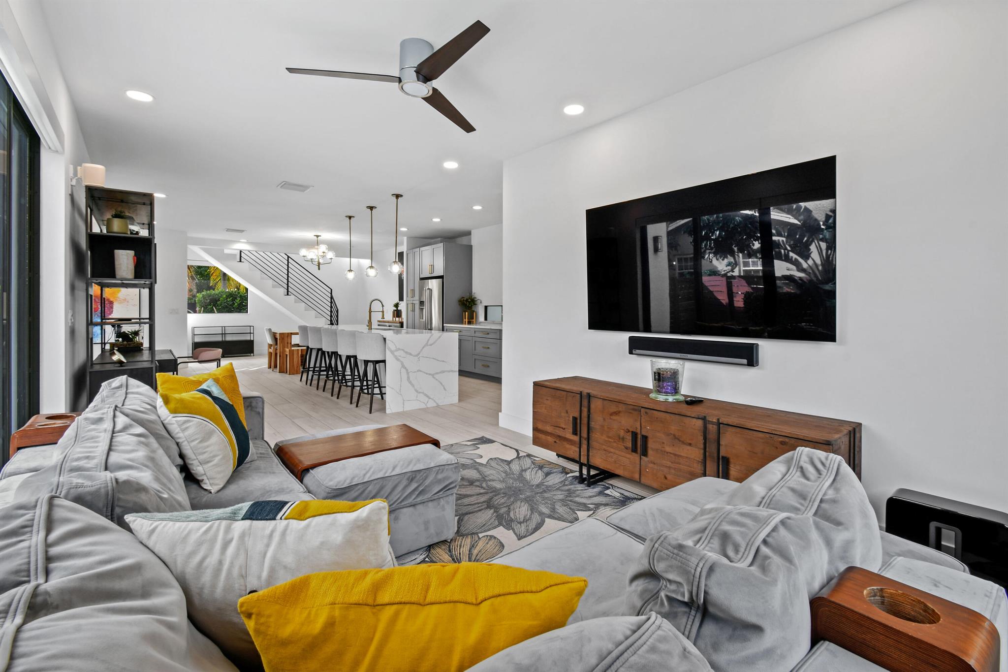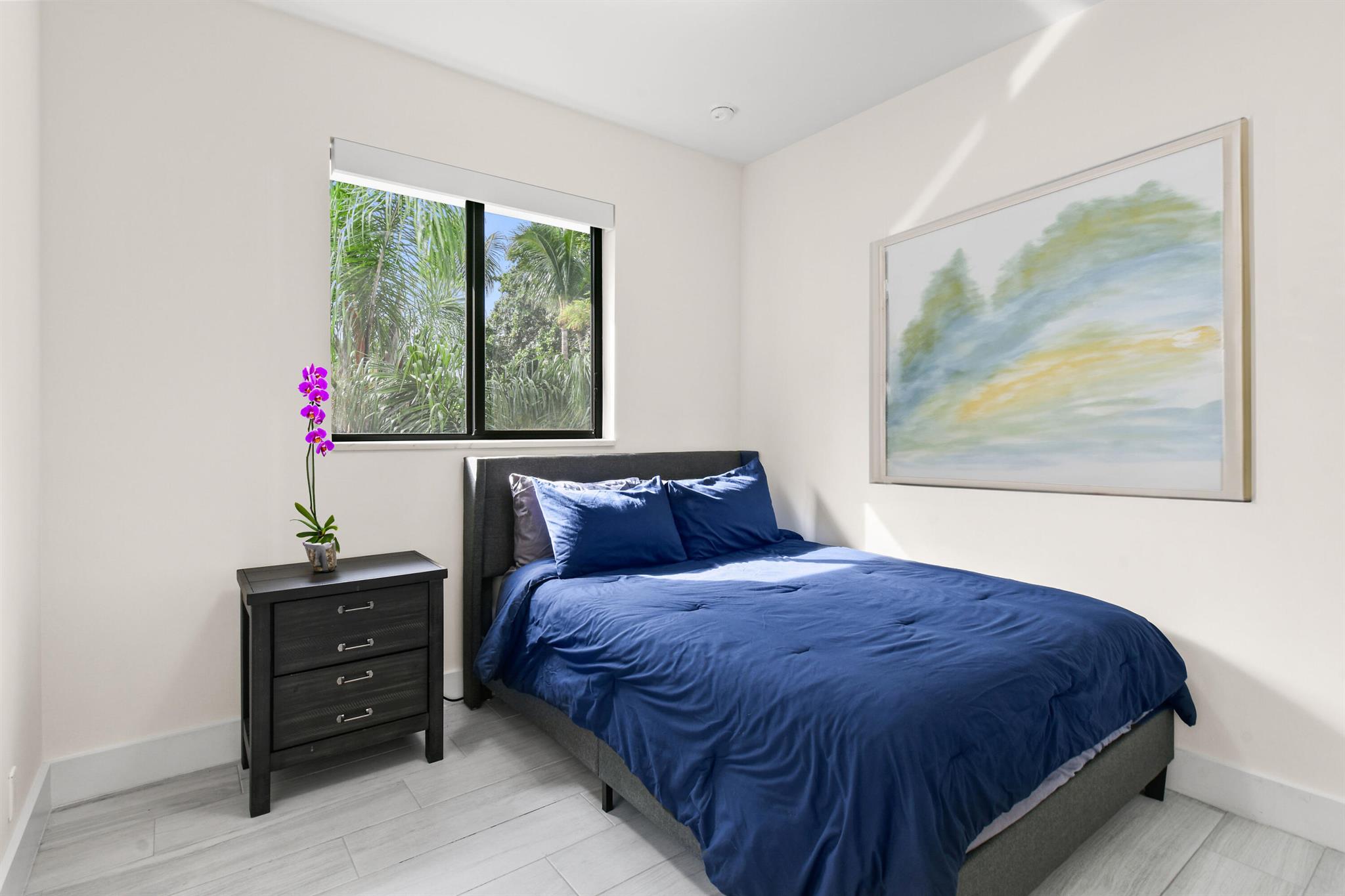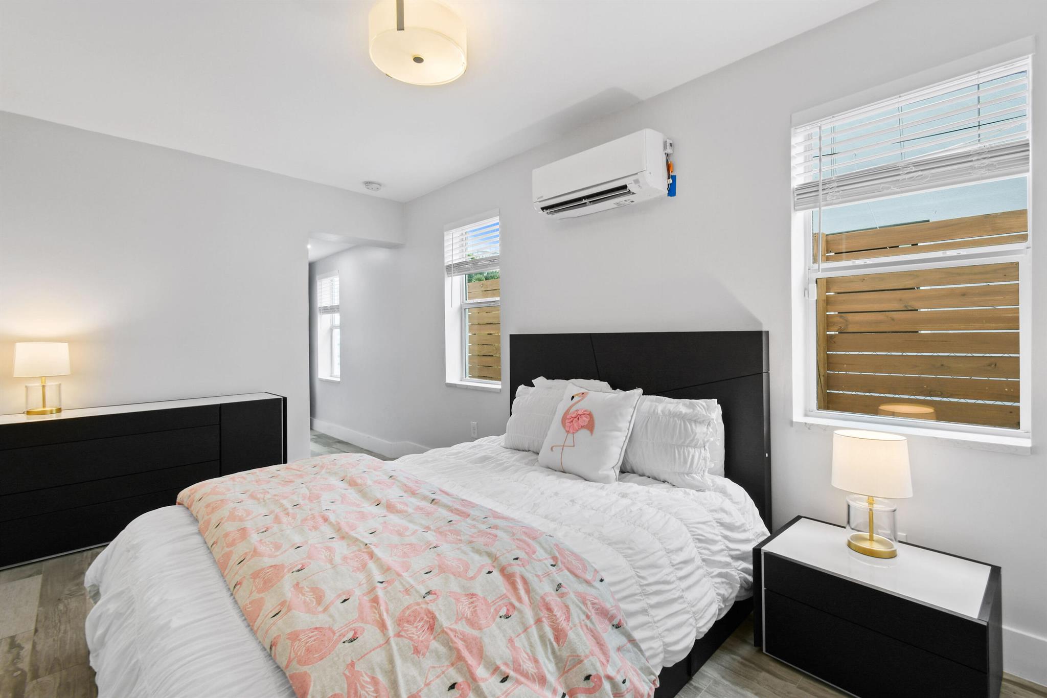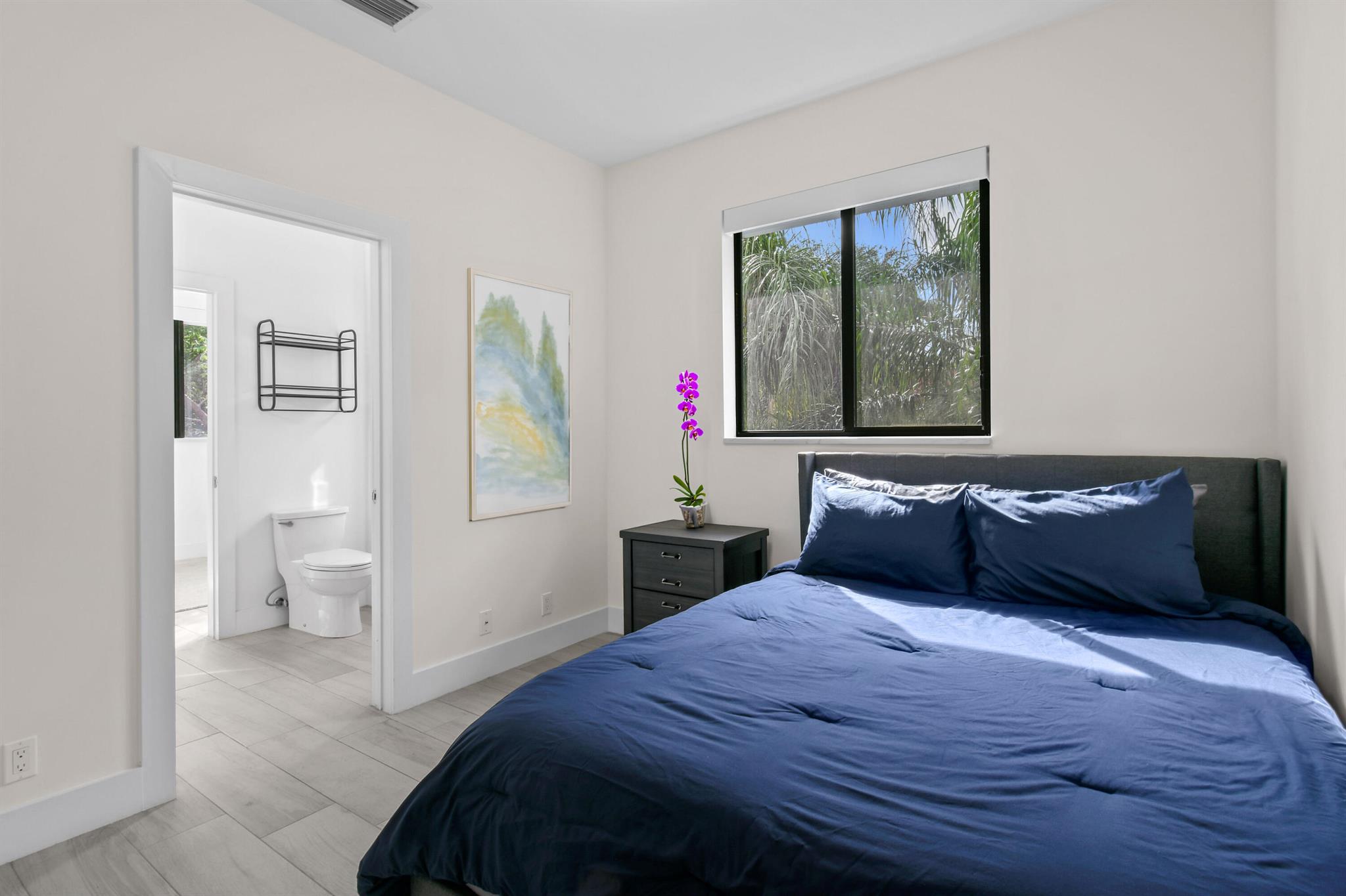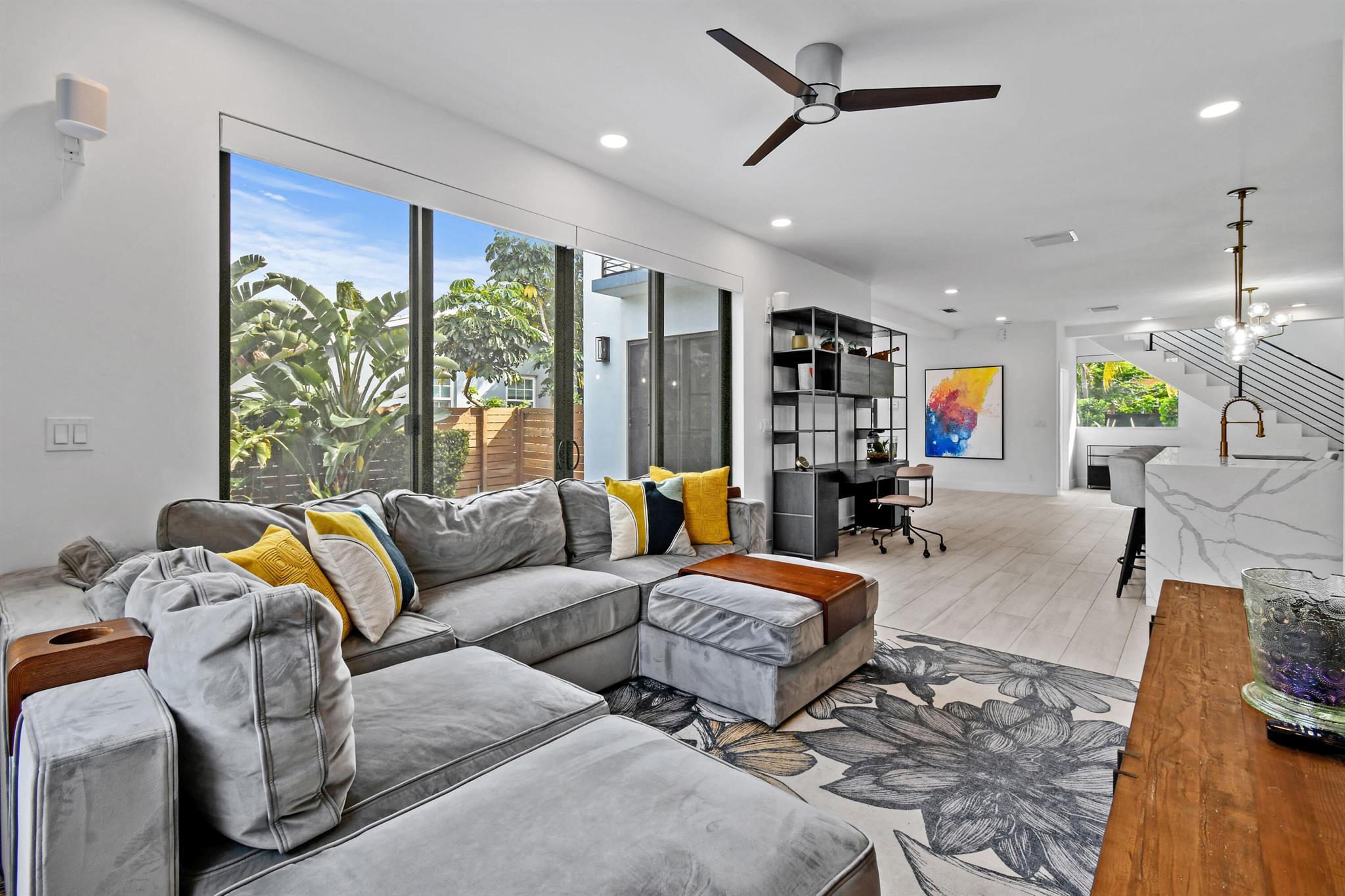 Stunning newer construction, contemporary CBS home with a private guest house sits just two streets from Flagler Drive in the historic Northwood neighborhood. Offering nearly 2,800 square feet of combined living space, this unique property includes both a main residence and a guest house. The main home spans approximately 2,100 square feet and features 3 bedrooms, 2.5 bathrooms, and elegant porcelain tile throughout. The kitchen showcases a spacious quartz island with a waterfall edge, a farmhouse sink, stainless steel appliances including a top-of-the-line dishwasher. Surrounded by privacy hedges with an electronic front gate, fully turfed yard, this home also features Lutron shades, impact-resistant glass, brand new A/C and security system in both houses including Ring & CCTV with