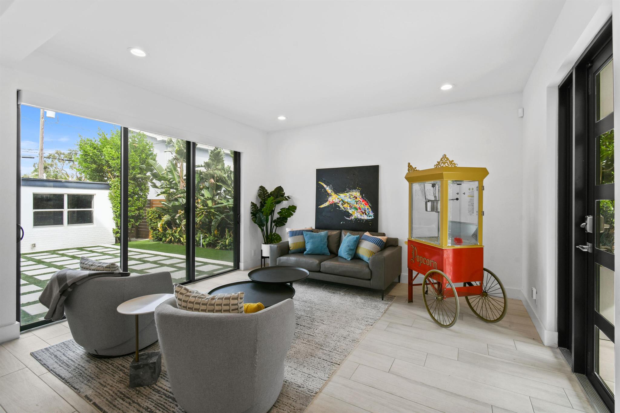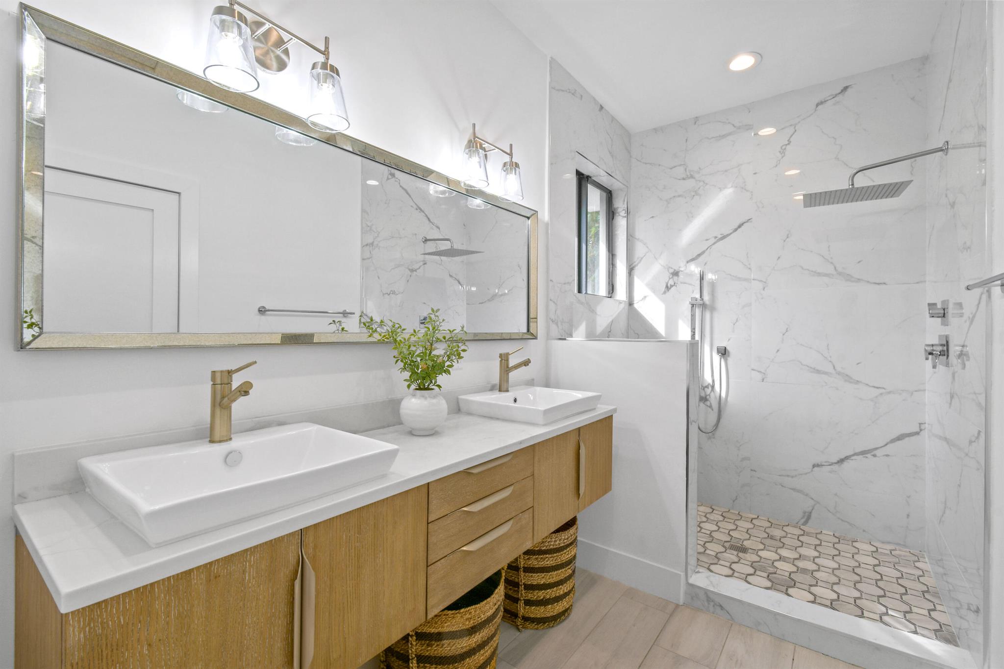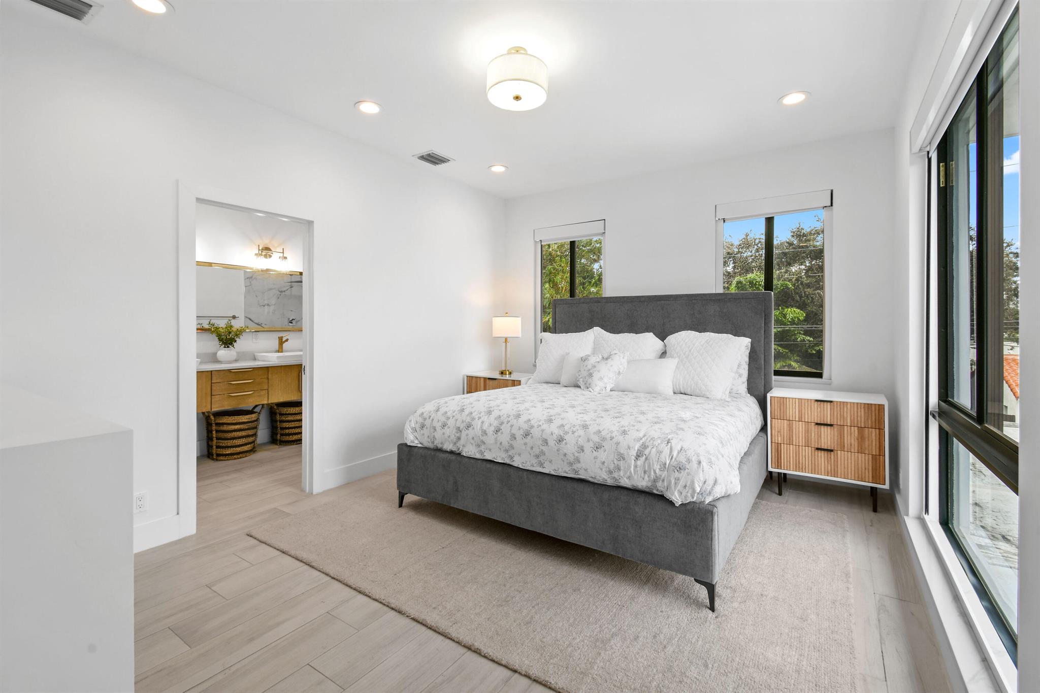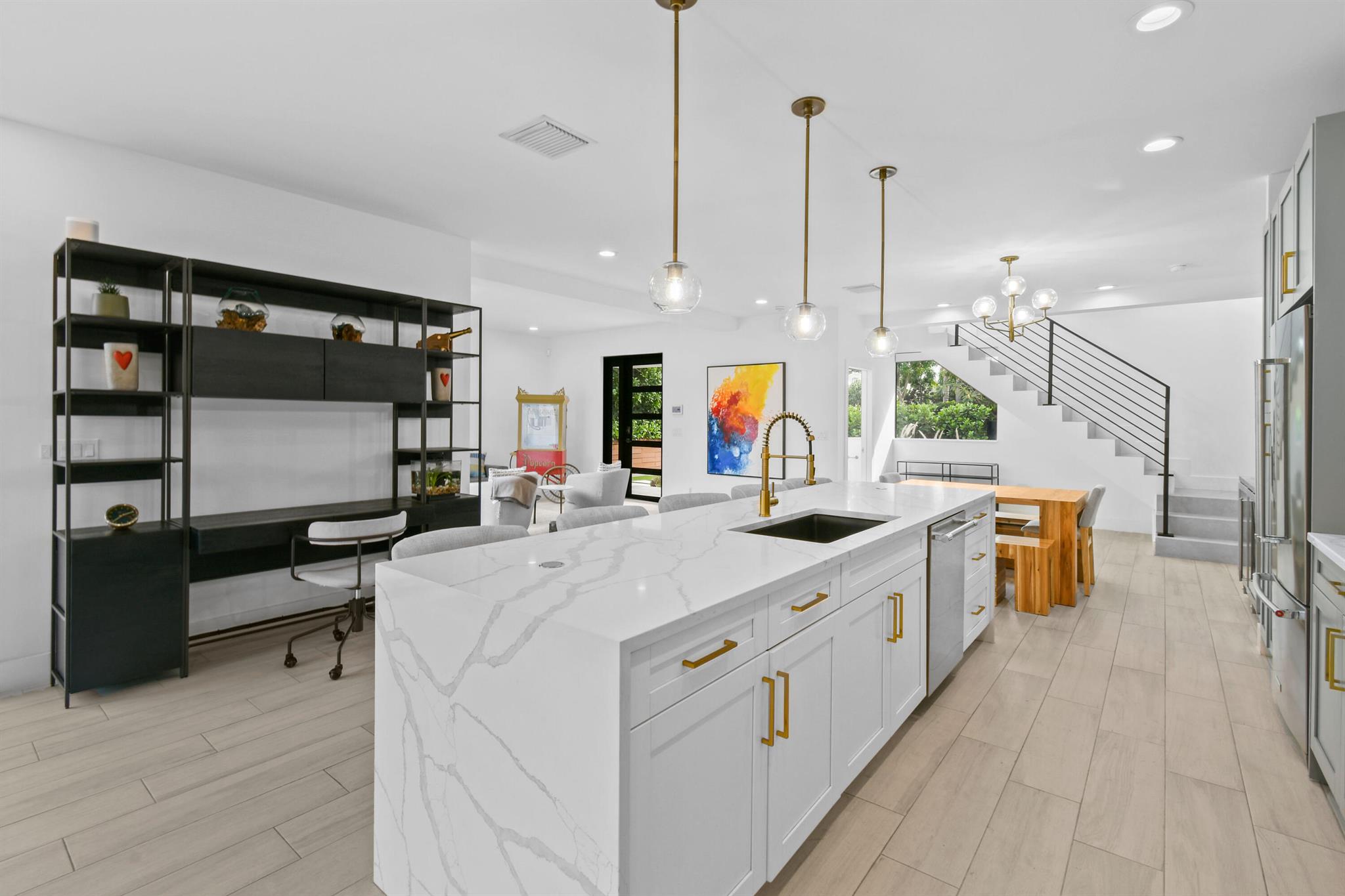 Stunning newer construction, contemporary CBS home with a private guest house sits just two streets from Flagler Drive in the historic Northwood neighborhood. Offering nearly 2,800 square feet of combined living space, this unique property includes both a main residence and a guest house. The main home spans approximately 2,100 square feet and features 3 bedrooms, 2.5 bathrooms, and elegant porcelain tile throughout. The kitchen showcases a spacious quartz island with a waterfall edge, a farmhouse sink, stainless steel appliances including a top-of-the-line dishwasher. Surrounded by privacy hedges with an electronic front gate, fully turfed yard, this home also features Lutron shades, impact-resistant glass, brand new A/C and security system in both houses including Ring & CCTV with