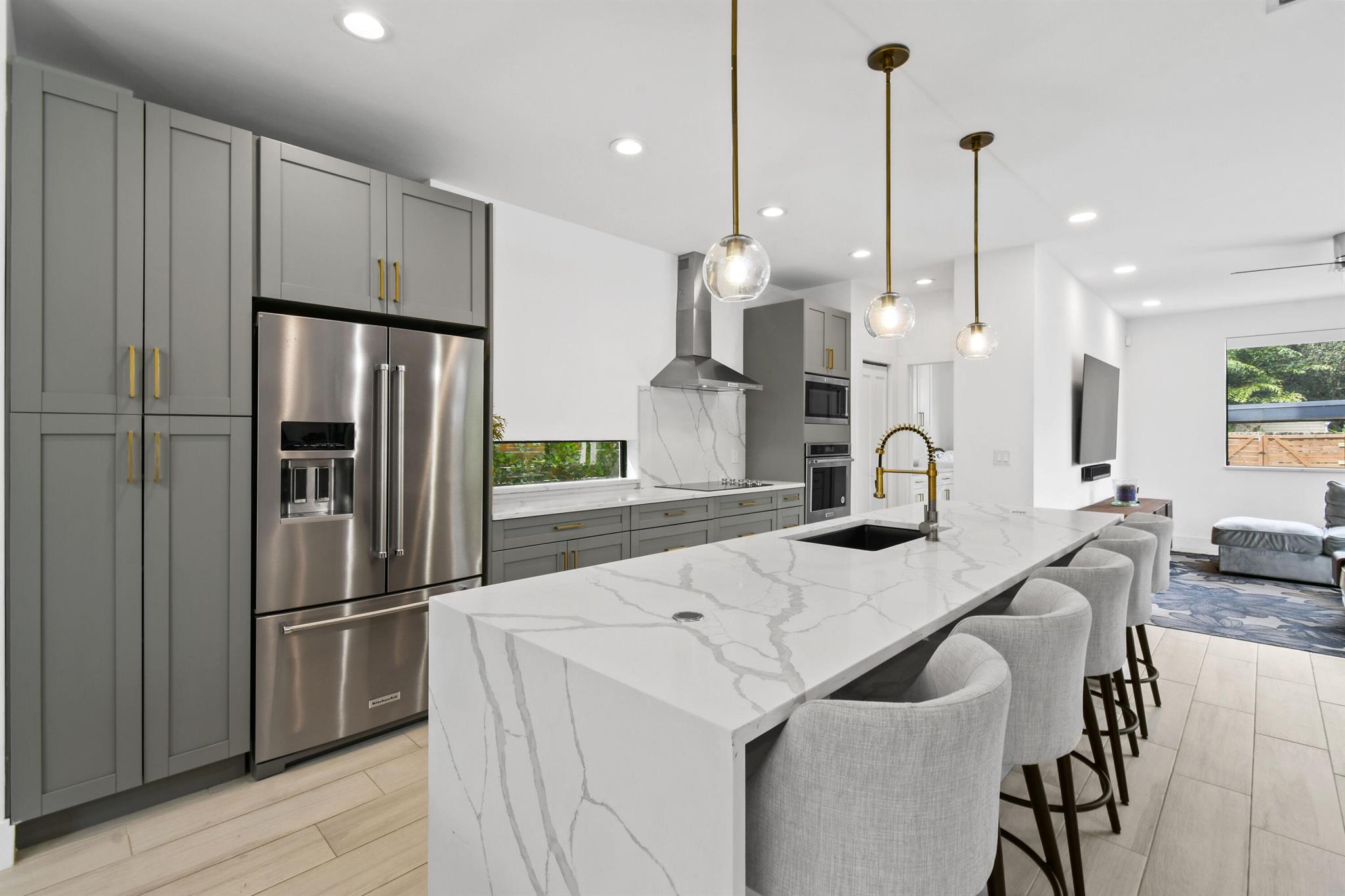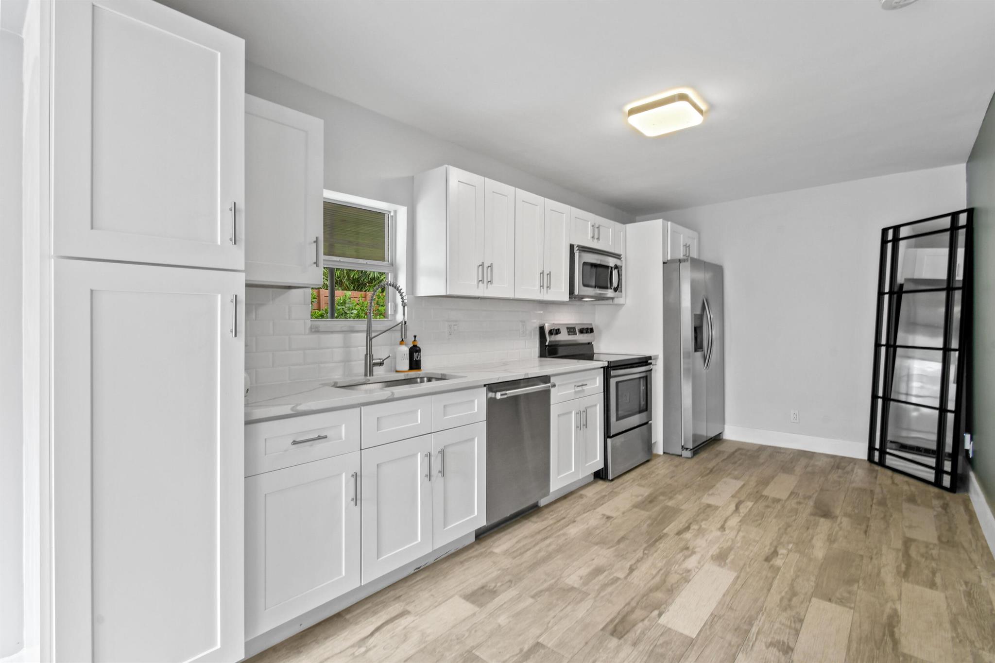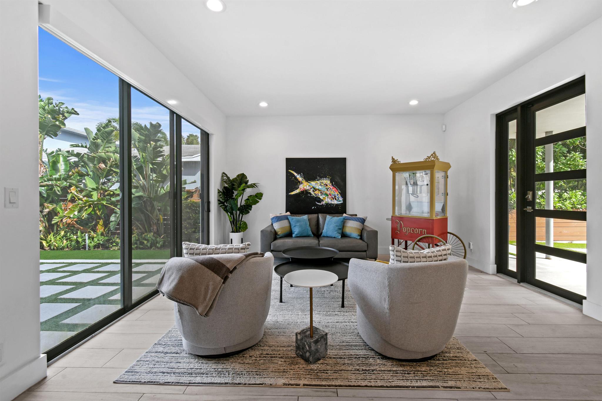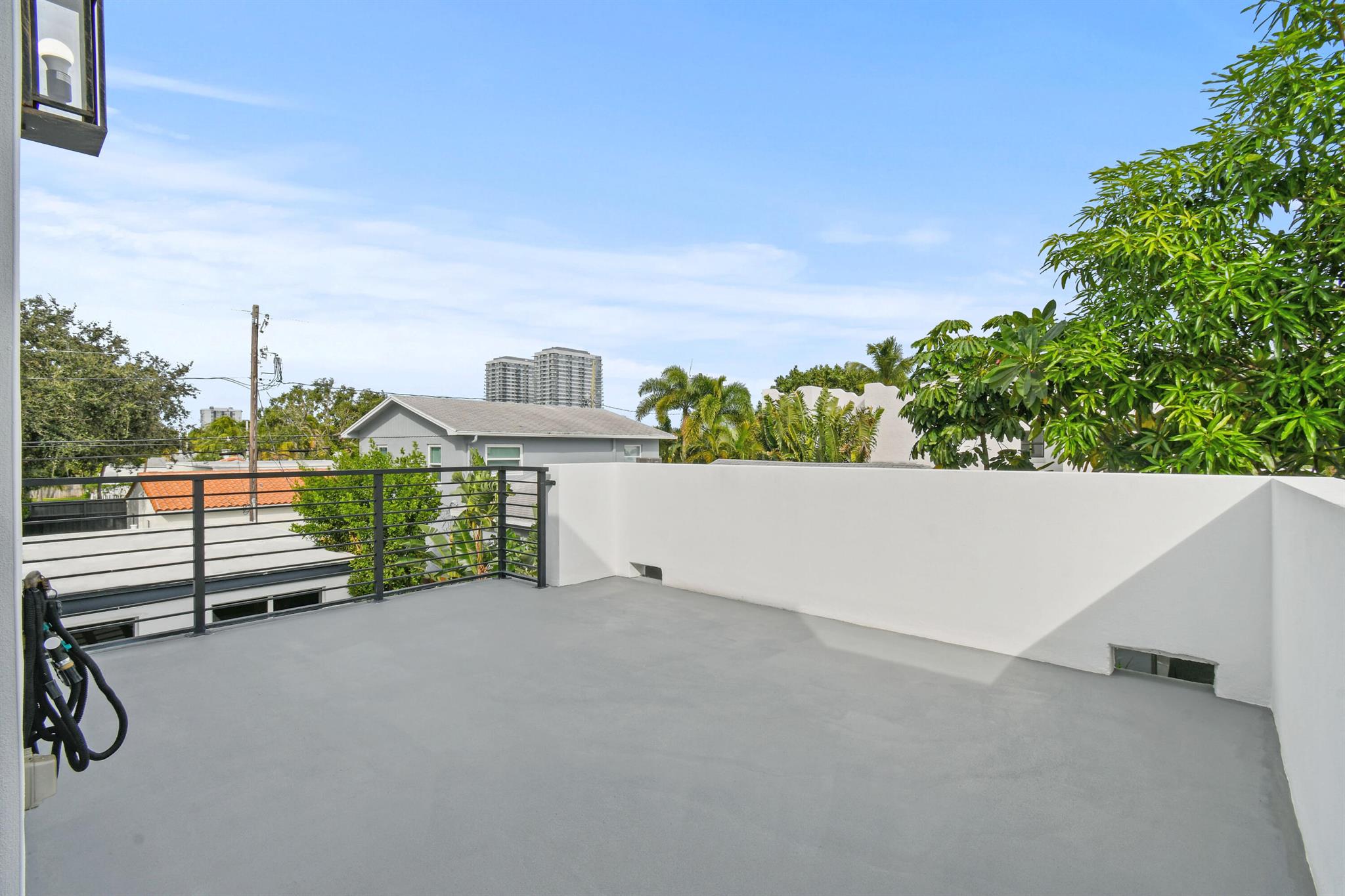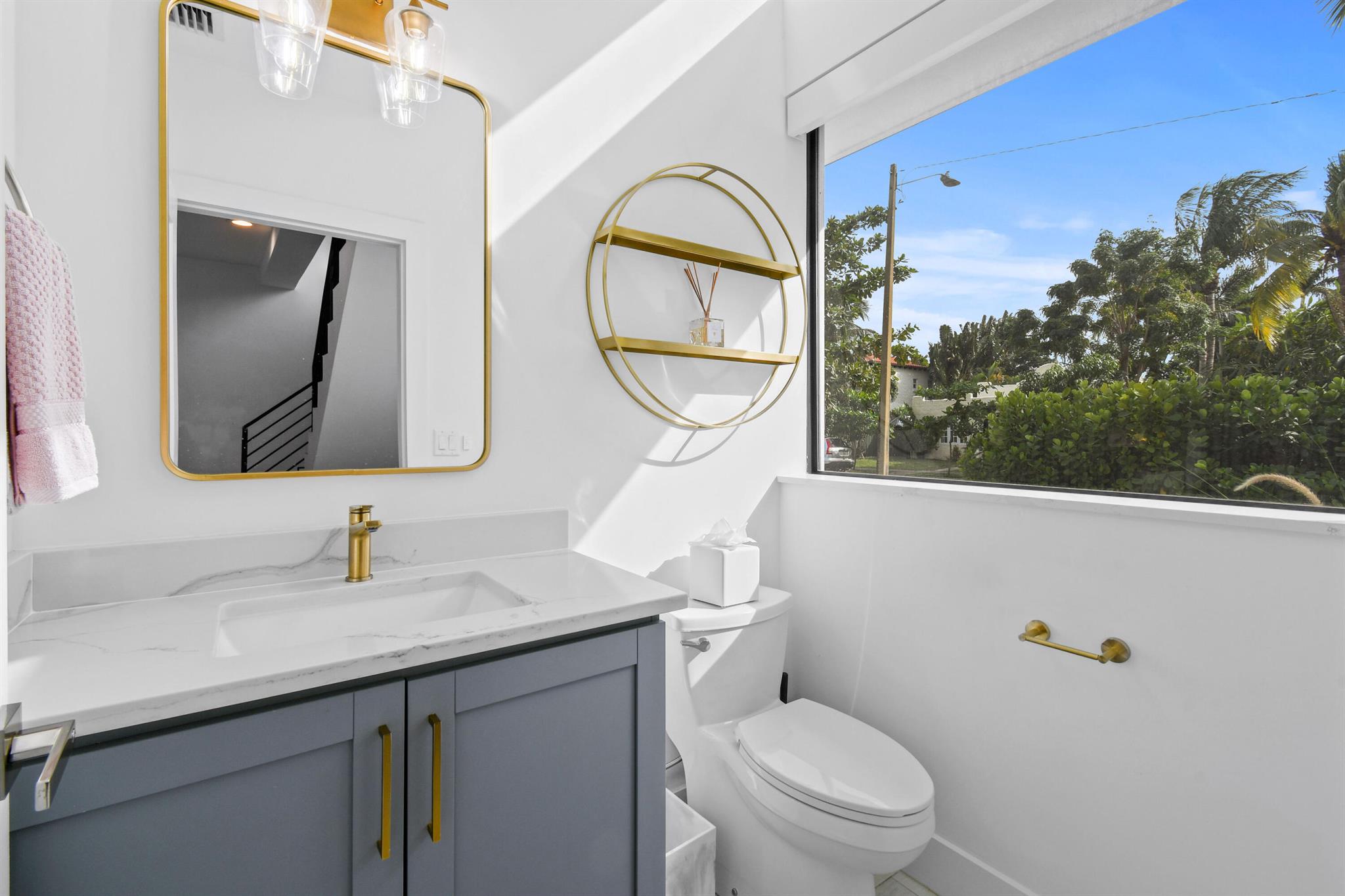 Stunning newer construction, contemporary CBS home with a private guest house sits just two streets from Flagler Drive in the historic Northwood neighborhood. Offering nearly 2,800 square feet of combined living space, this unique property includes both a main residence and a guest house. The main home spans approximately 2,100 square feet and features 3 bedrooms, 2.5 bathrooms, and elegant porcelain tile throughout. The kitchen showcases a spacious quartz island with a waterfall edge, a farmhouse sink, stainless steel appliances including a top-of-the-line dishwasher. Surrounded by privacy hedges with an electronic front gate, fully turfed yard, this home also features Lutron shades, impact-resistant glass, brand new A/C and security system in both houses including Ring & CCTV with