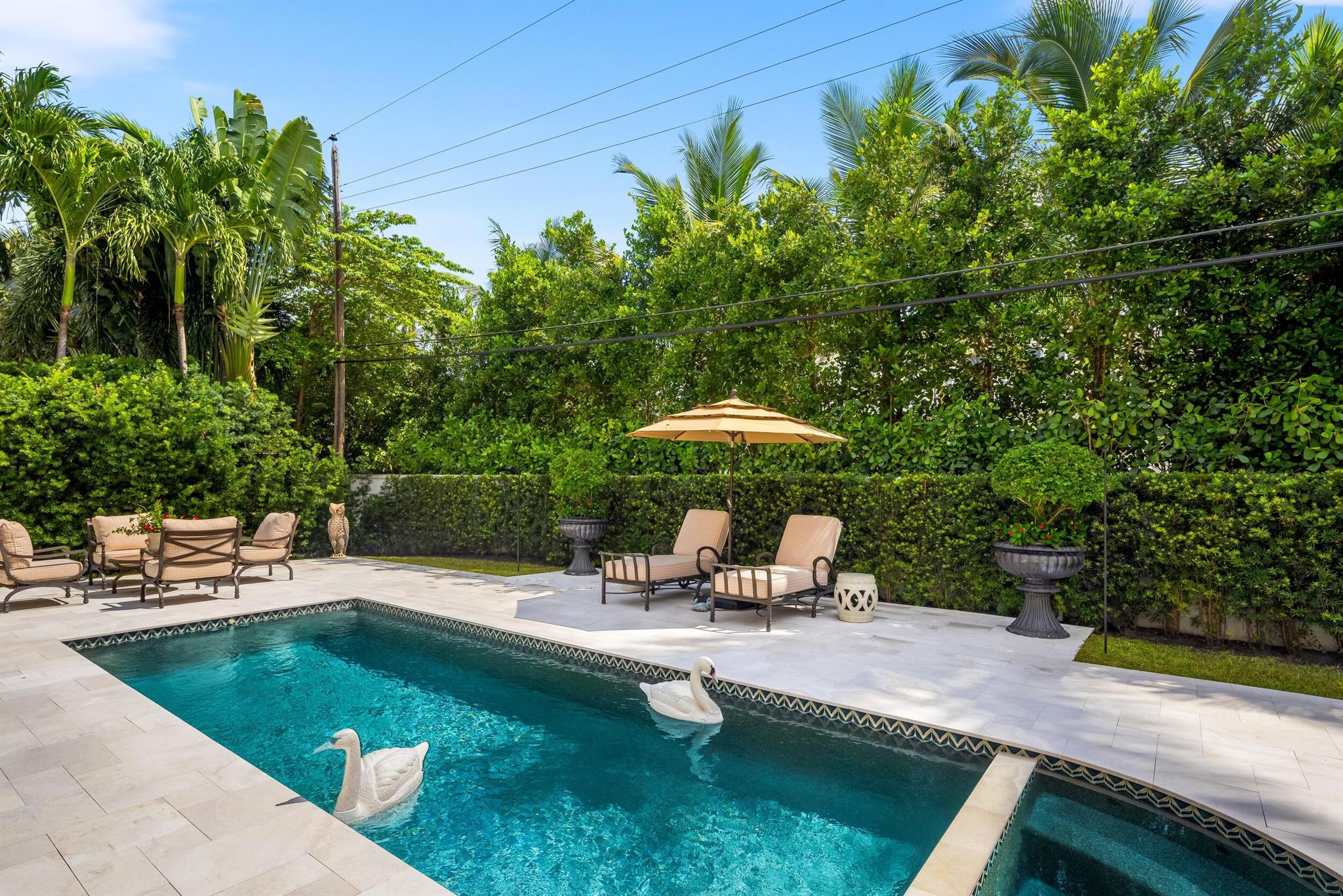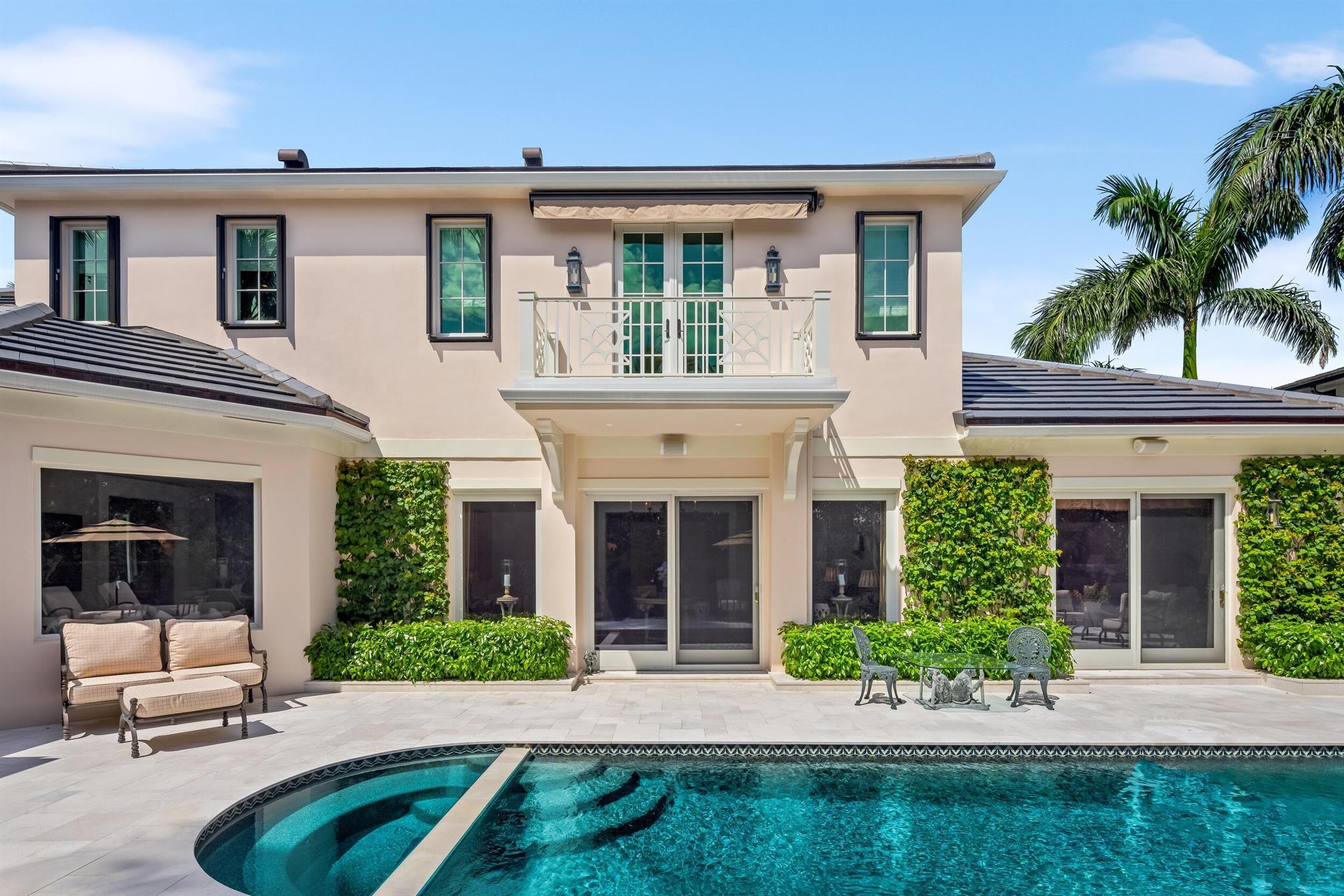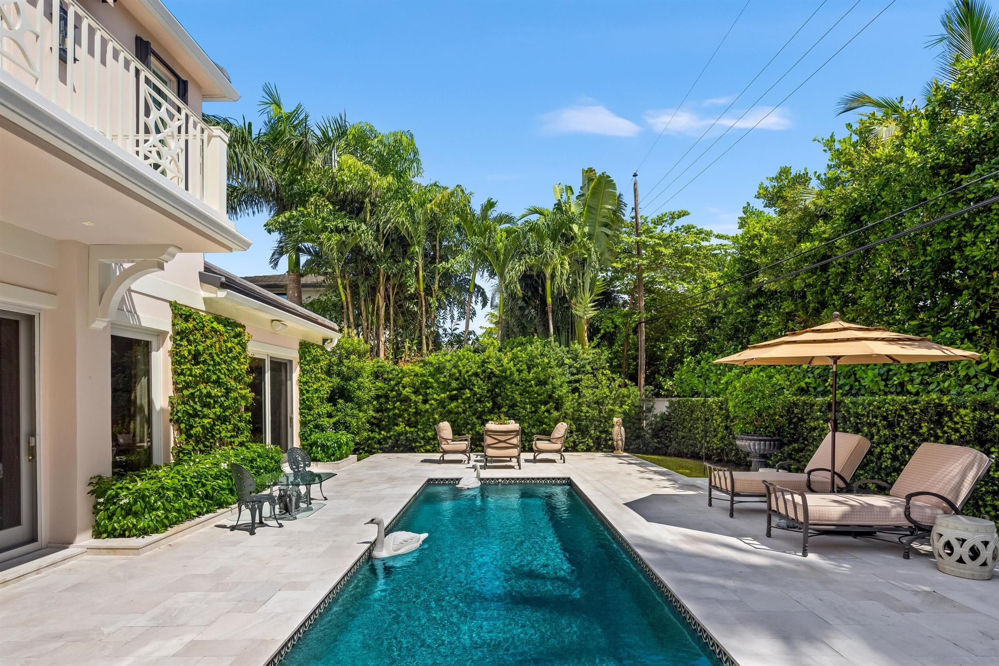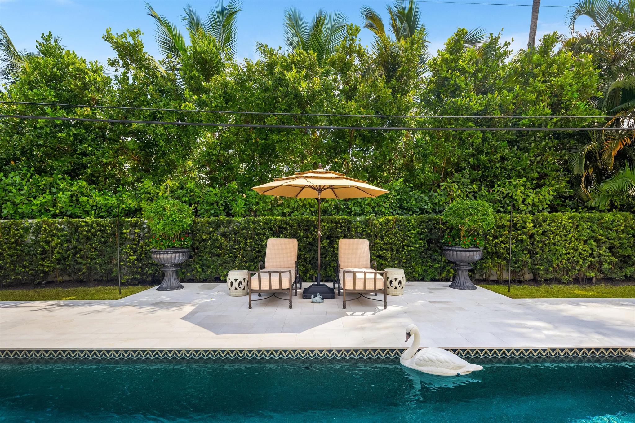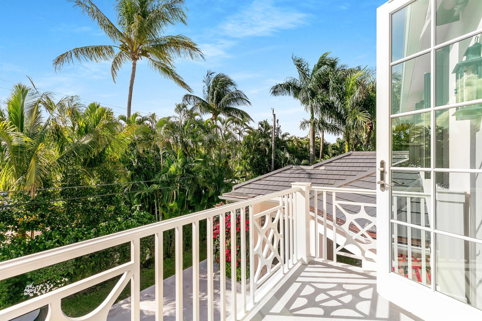 Gorgeous quintessential Palm Beach home with 5BR/5.1BA plus library. Fabulous Near North End location on a sunny South Side lot. First floor Primary Suite features dual walk-in closets and spacious bath. Glamorous entry foyer welcomes you to the light and bright living room perfect for entertaining. Elegant formal dining room and beautiful eat-in kitchen with chef's island. Breakfast area features banquette and panoramic window overlooking serene pool and backyard. Beautiful landscaping surrounds fantastic outdoor spaces including open patio, balconies, and pool with spa.