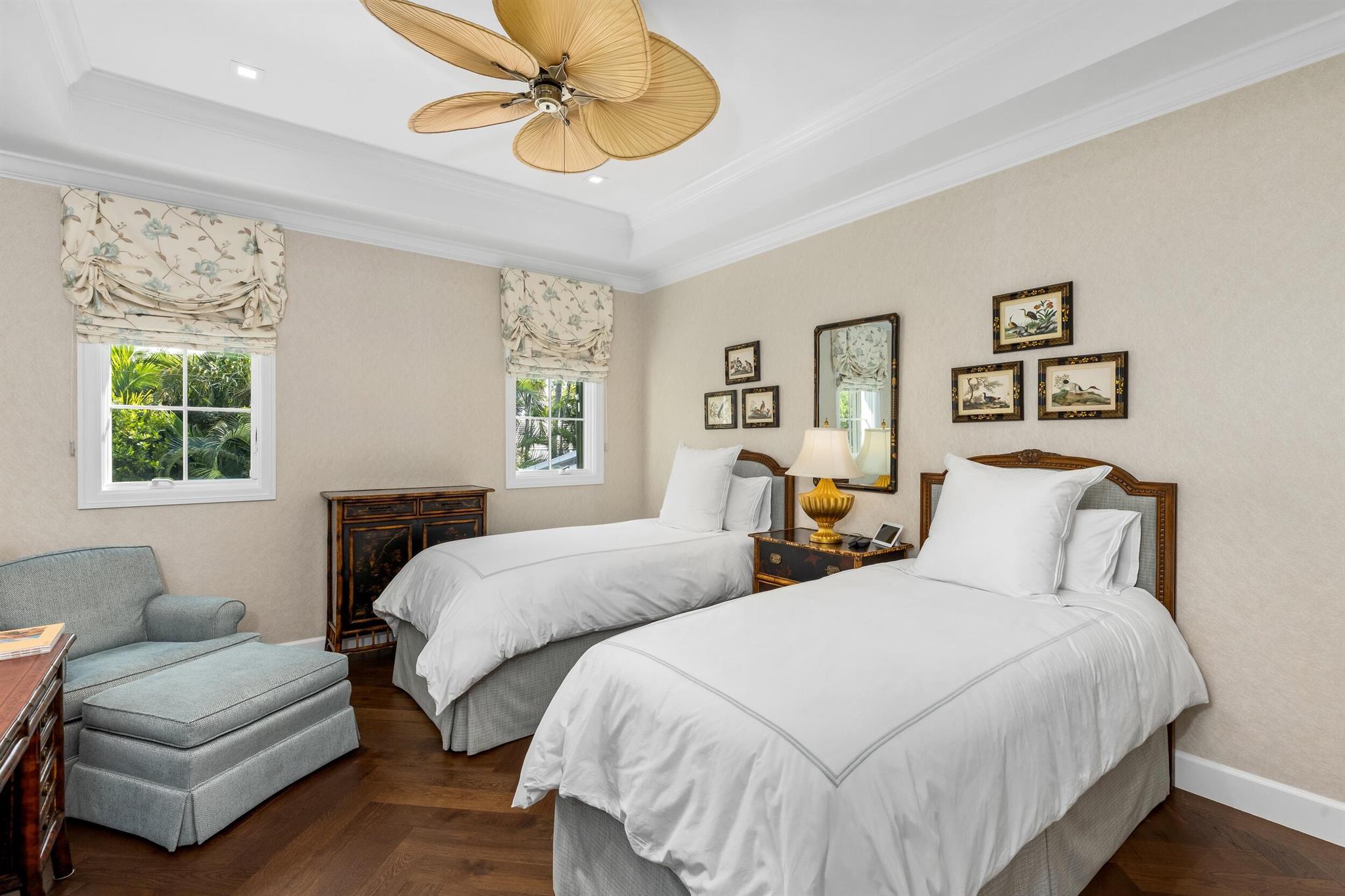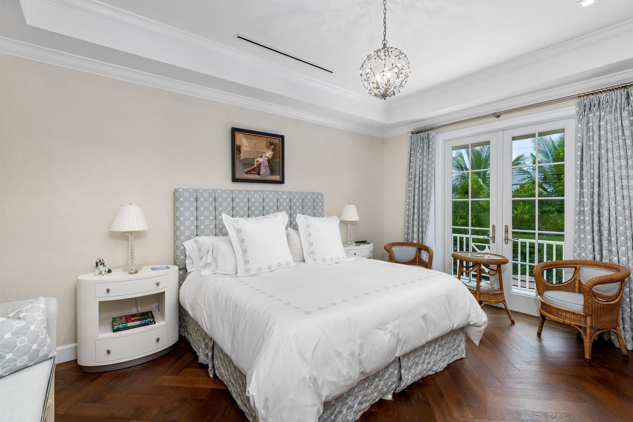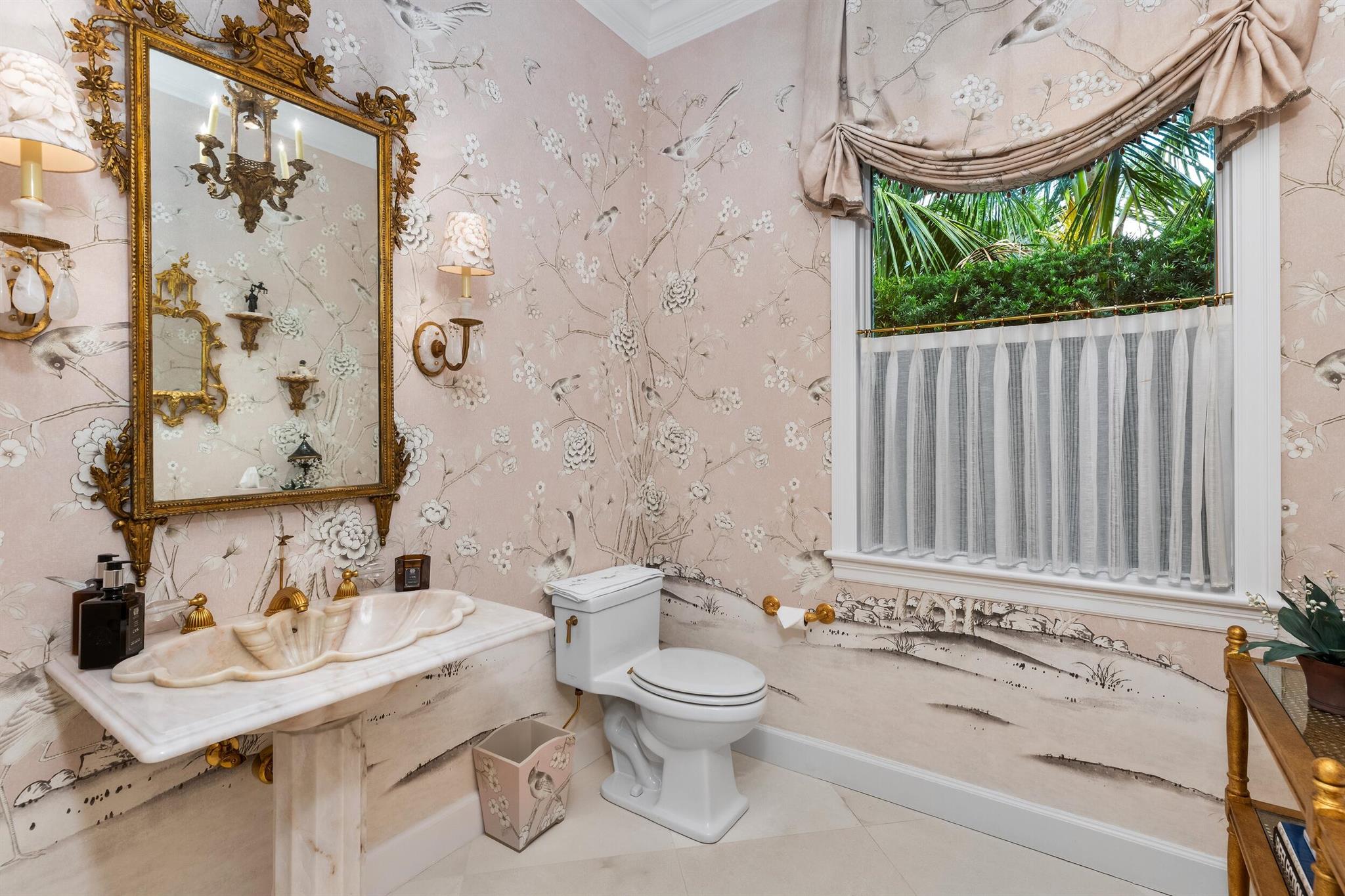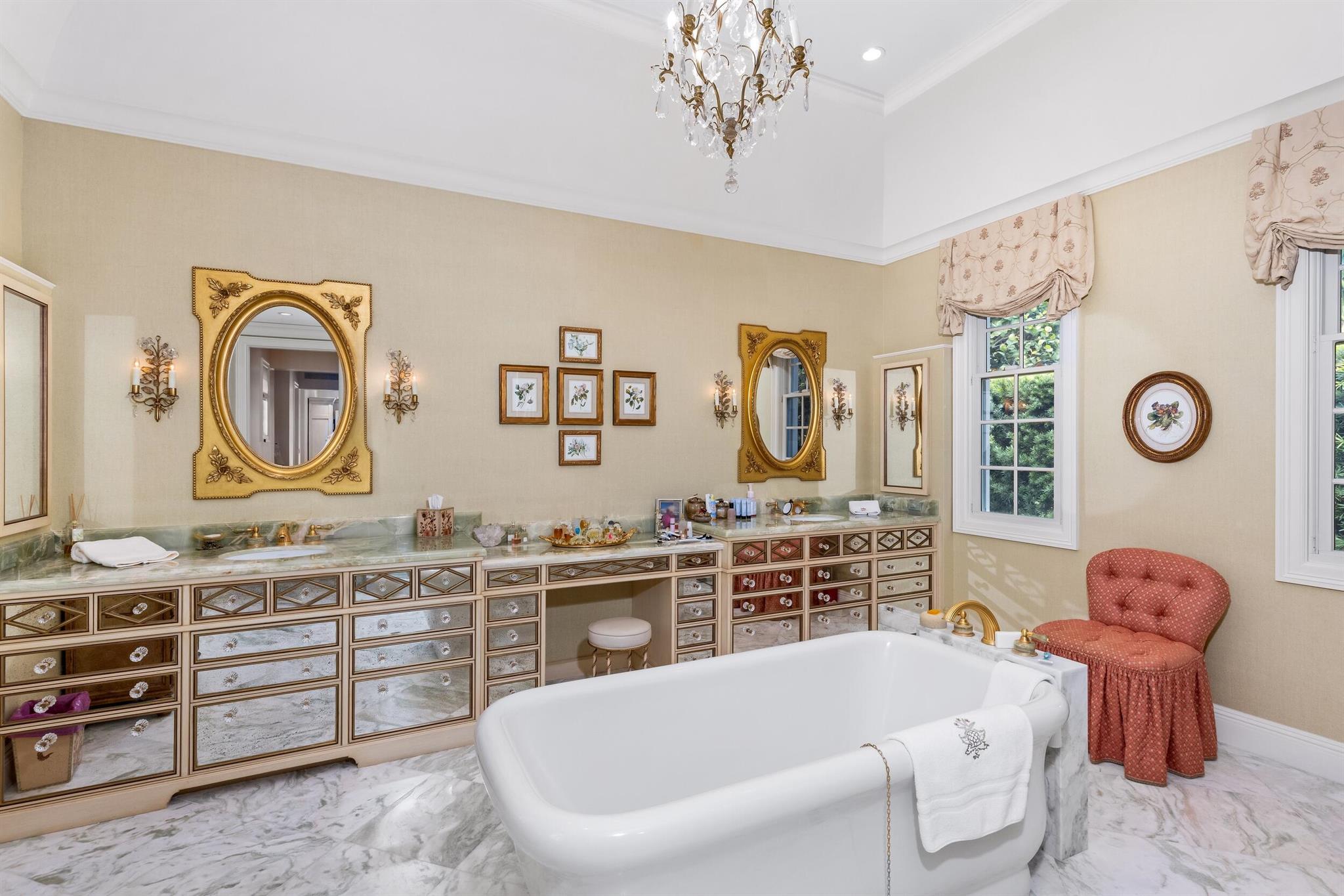 Gorgeous quintessential Palm Beach home with 5BR/5.1BA plus library. Fabulous Near North End location on a sunny South Side lot. First floor Primary Suite features dual walk-in closets and spacious bath. Glamorous entry foyer welcomes you to the light and bright living room perfect for entertaining. Elegant formal dining room and beautiful eat-in kitchen with chef's island. Breakfast area features banquette and panoramic window overlooking serene pool and backyard. Beautiful landscaping surrounds fantastic outdoor spaces including open patio, balconies, and pool with spa.