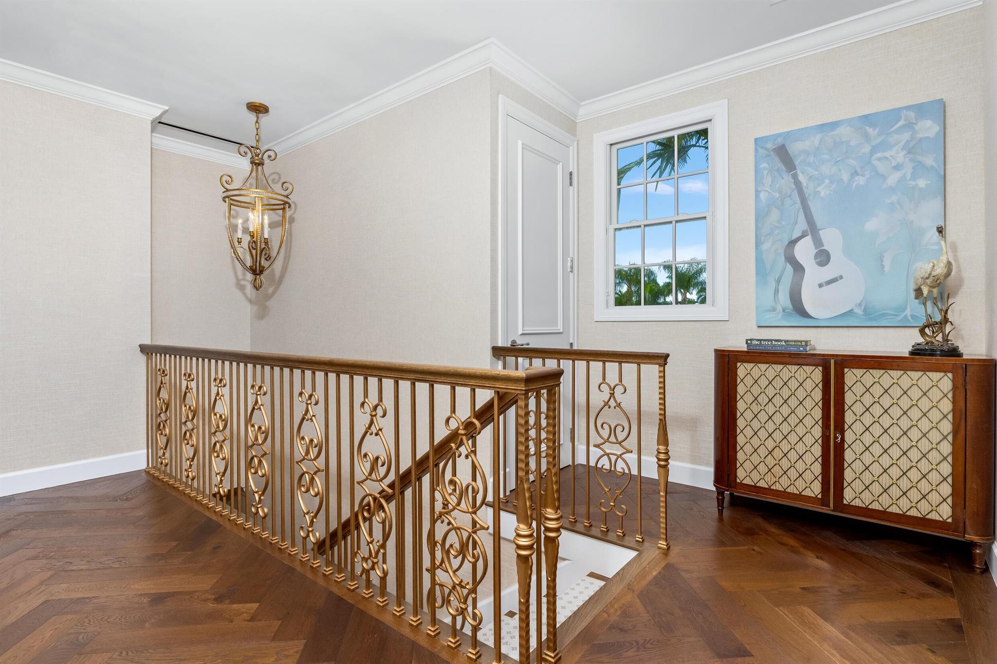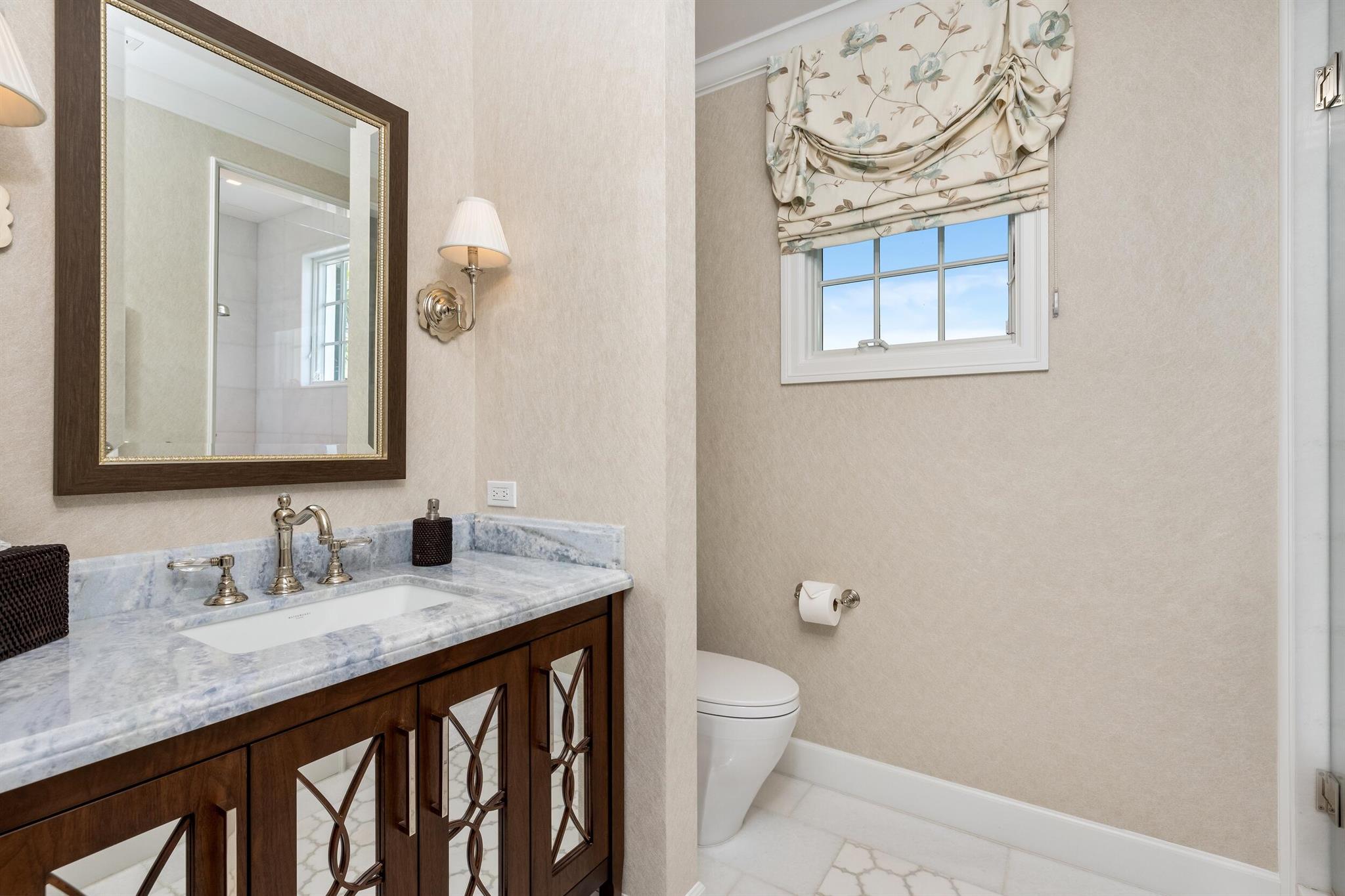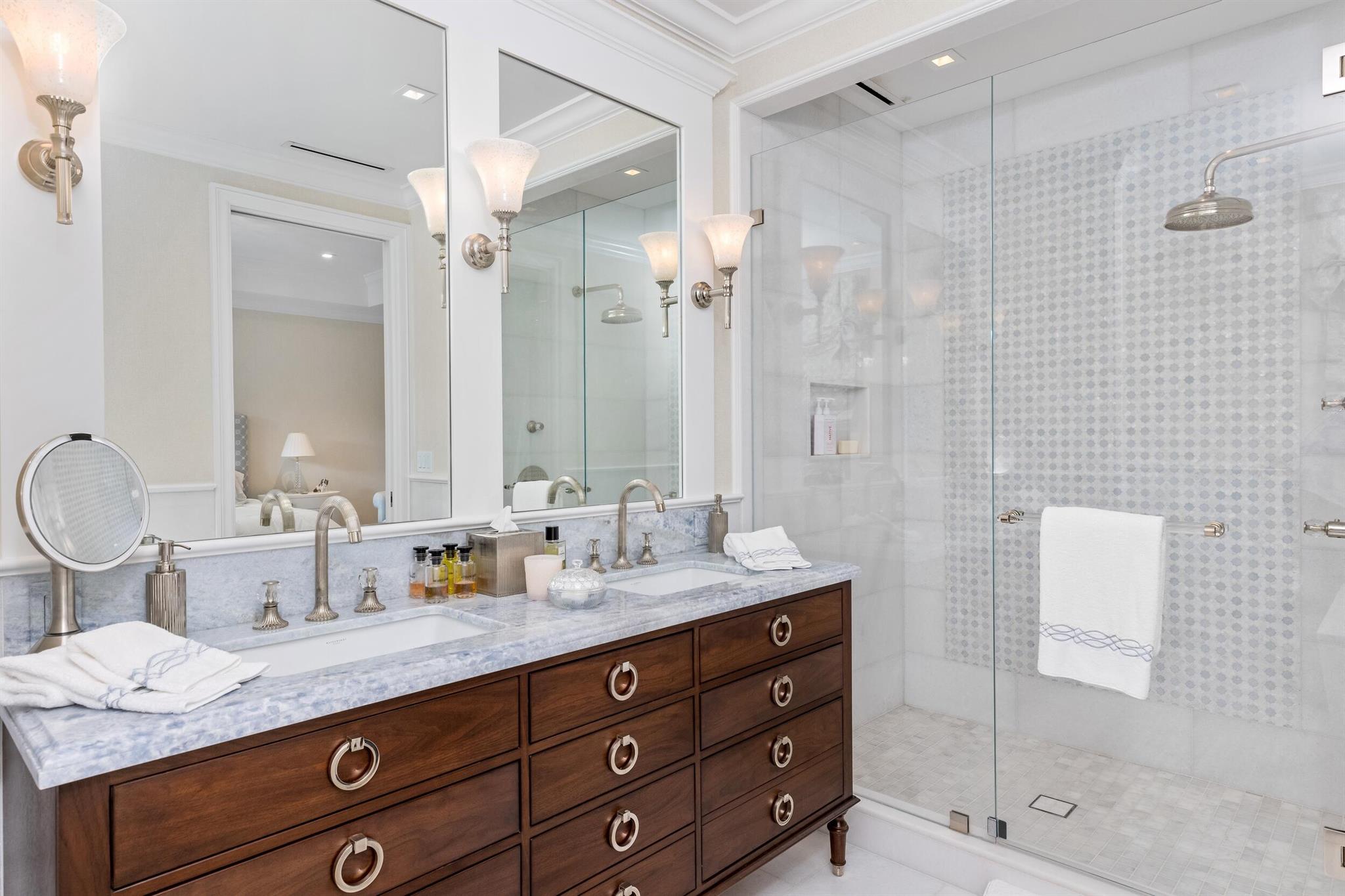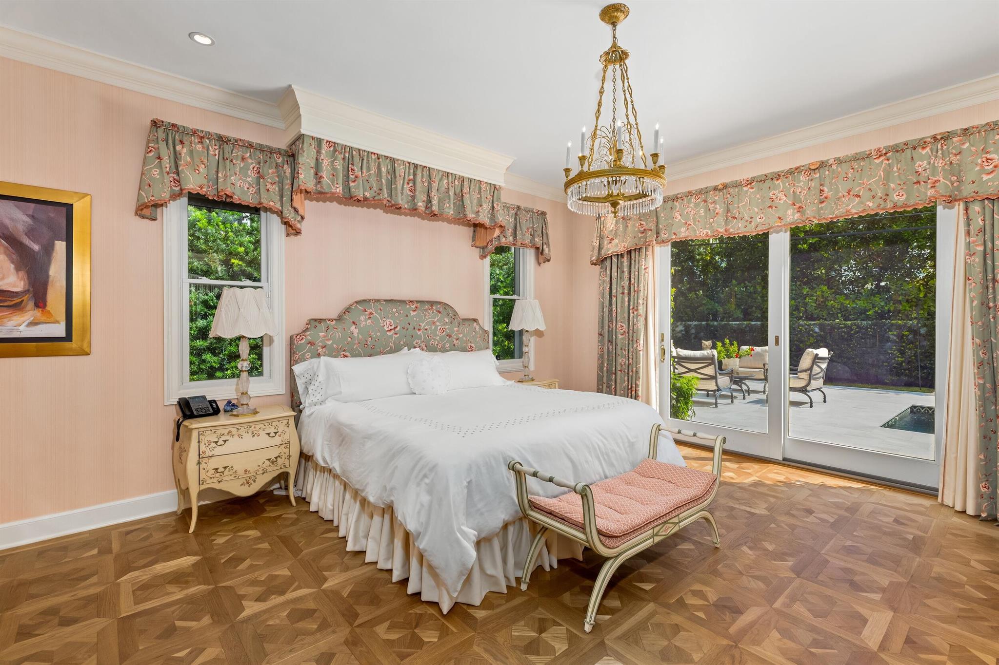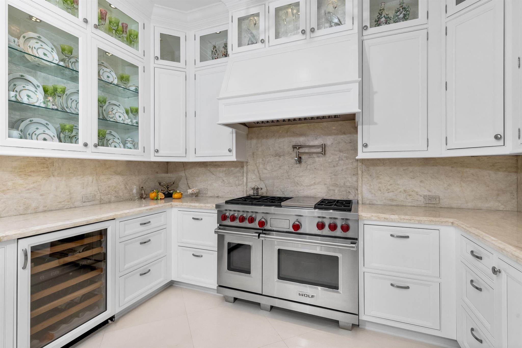 Gorgeous quintessential Palm Beach home with 5BR/5.1BA plus library. Fabulous Near North End location on a sunny South Side lot. First floor Primary Suite features dual walk-in closets and spacious bath. Glamorous entry foyer welcomes you to the light and bright living room perfect for entertaining. Elegant formal dining room and beautiful eat-in kitchen with chef's island. Breakfast area features banquette and panoramic window overlooking serene pool and backyard. Beautiful landscaping surrounds fantastic outdoor spaces including open patio, balconies, and pool with spa.