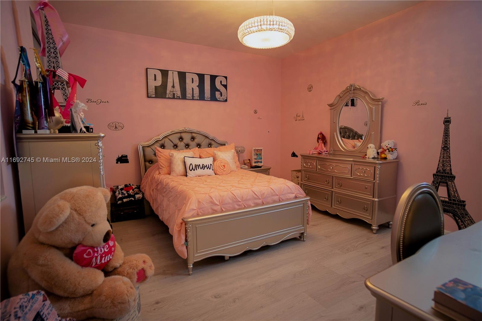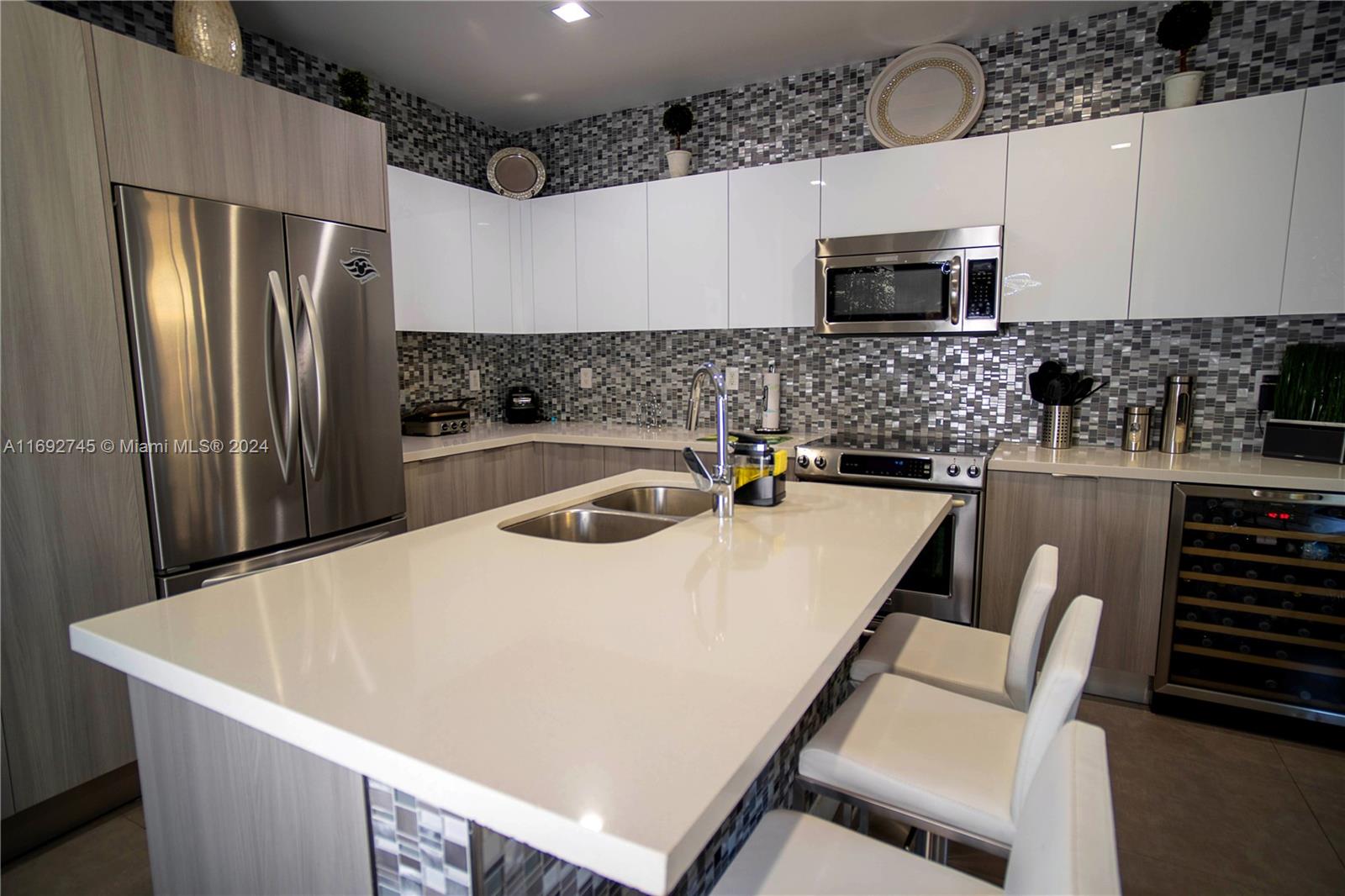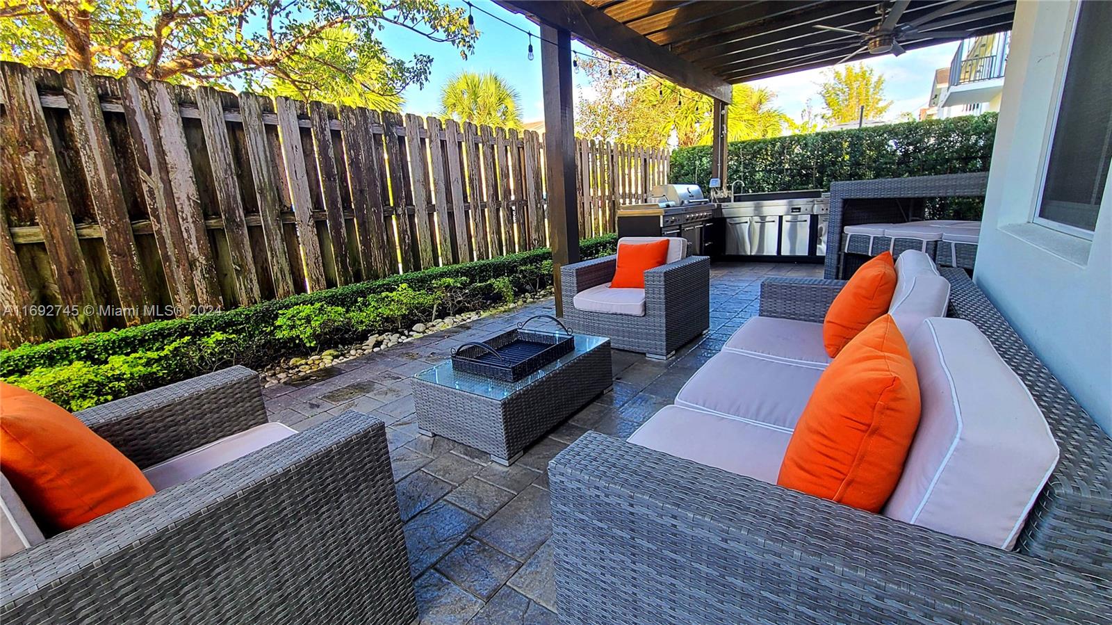 The property description in the image reads: **Dream Home Turnkey** This stunning property features 4 bedrooms and 4 bathrooms, all meticulously updated for modern living. Enjoy the elegance of Spanish porcelain flooring on the first floor and stylish glass staircase railings. The home boasts 8-foot high Italian doors and a beautifully redesigned kitchen. The second floor is enhanced with luxury waterproof vinyl throughout. Step outside to your private patio, complete with a pergola and barbecue area with built-in speakers—perfect for entertaining. Residents also have access to a Clubhouse that includes a gym, pool, and BBQ area, all within a secure, gated community. Please note that furniture is sold separately. For showings, kindly give 24 hours' notice.