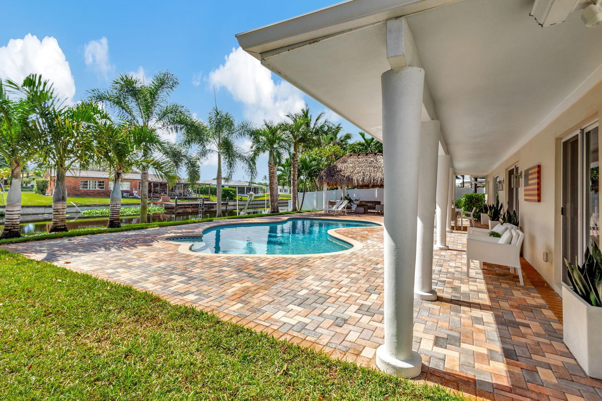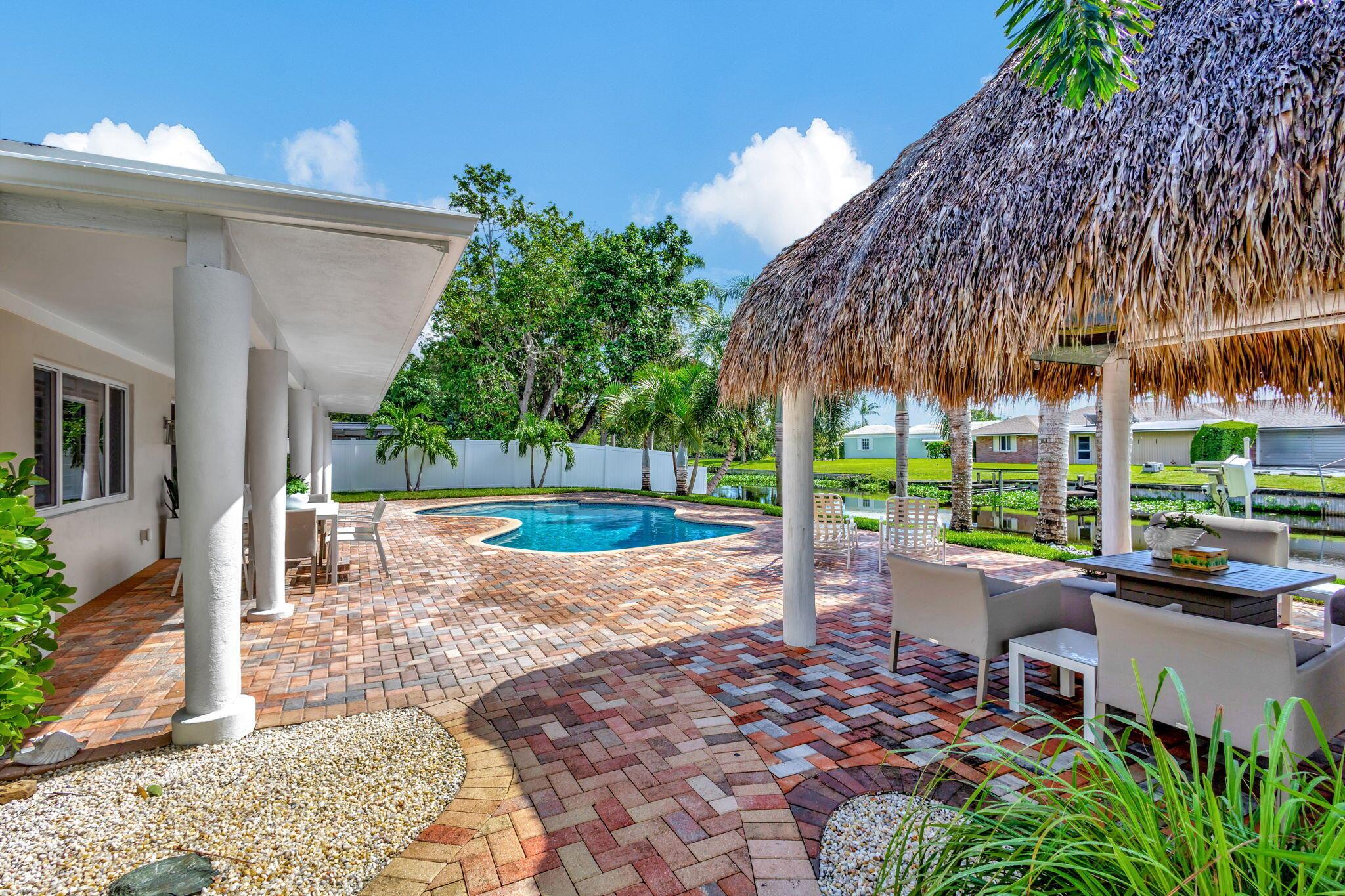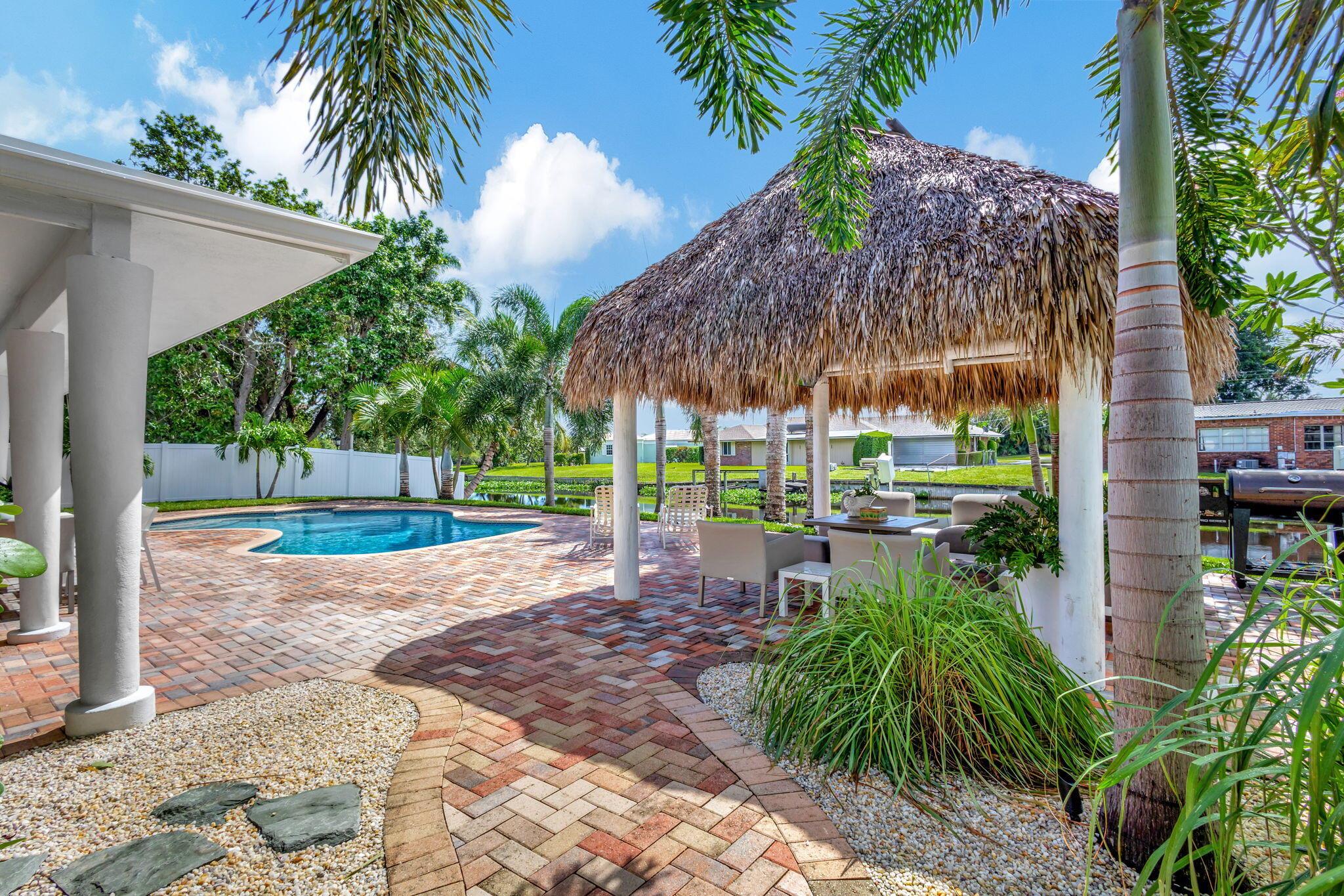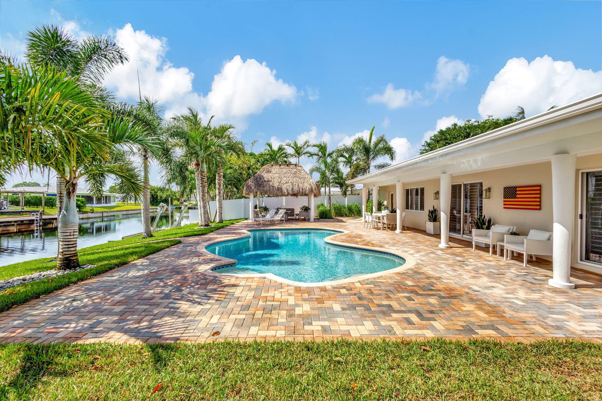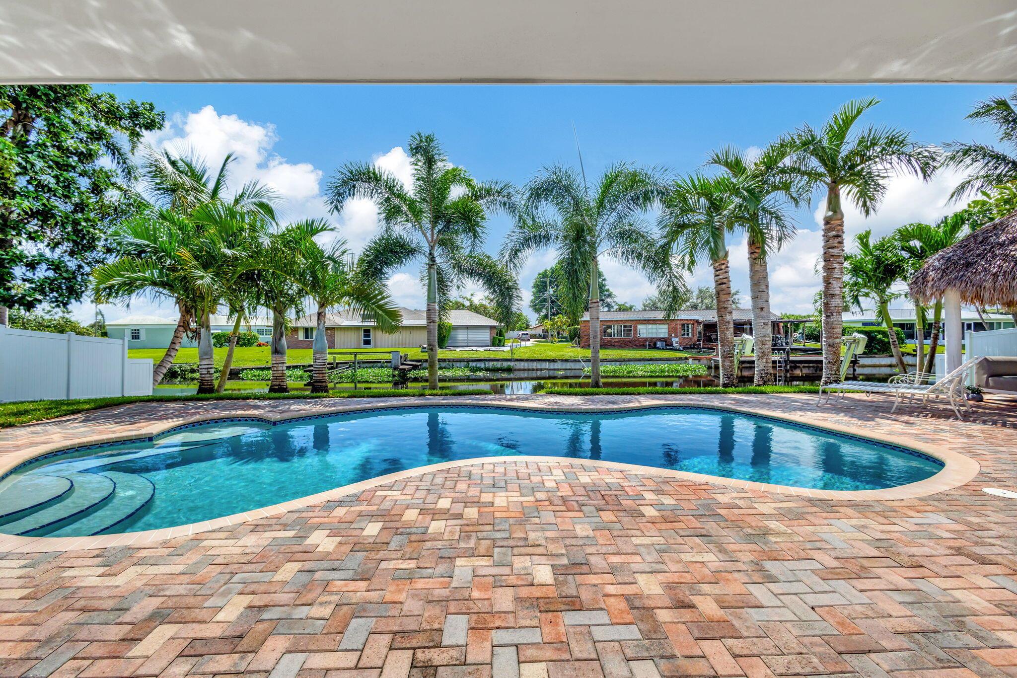 Welcome Home to this Stunning Waterfront Pool Home in Desirable Lake Clarke Shores! This completely updated 2 Bedroom, 2 bath, 1 car garage, brick paver driveway and patio. New oversized engineered wood flooring throughout, spacious living area, separate dining room, oversized baseboards throughout. Open kitchen, great for entertaining, white shaker cabinets, quartz countertops, floating shelves with under lighting, under cabinet lighting, Island with Waterfall Edge, Marble backsplash. Two master suites with white shaker cabinets, quartz countertops, mirror lighting. Spacious master suite, modern closets, glass shower, floating shelves. Breathtaking views of the pool/waterfront. Enjoy your morning coffee and entertaining in your own Tiki Hut with two tv's, updated electric, overlooking