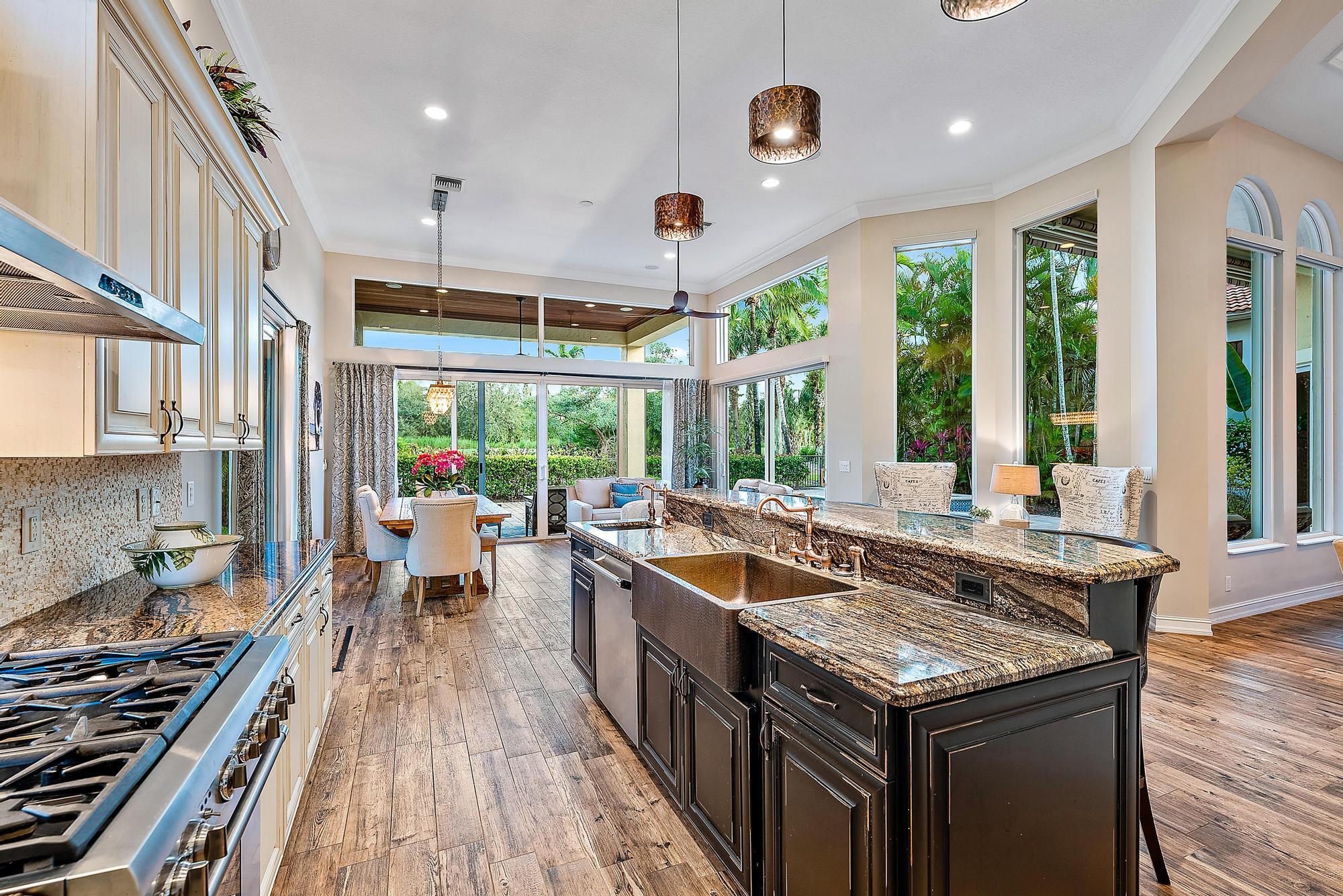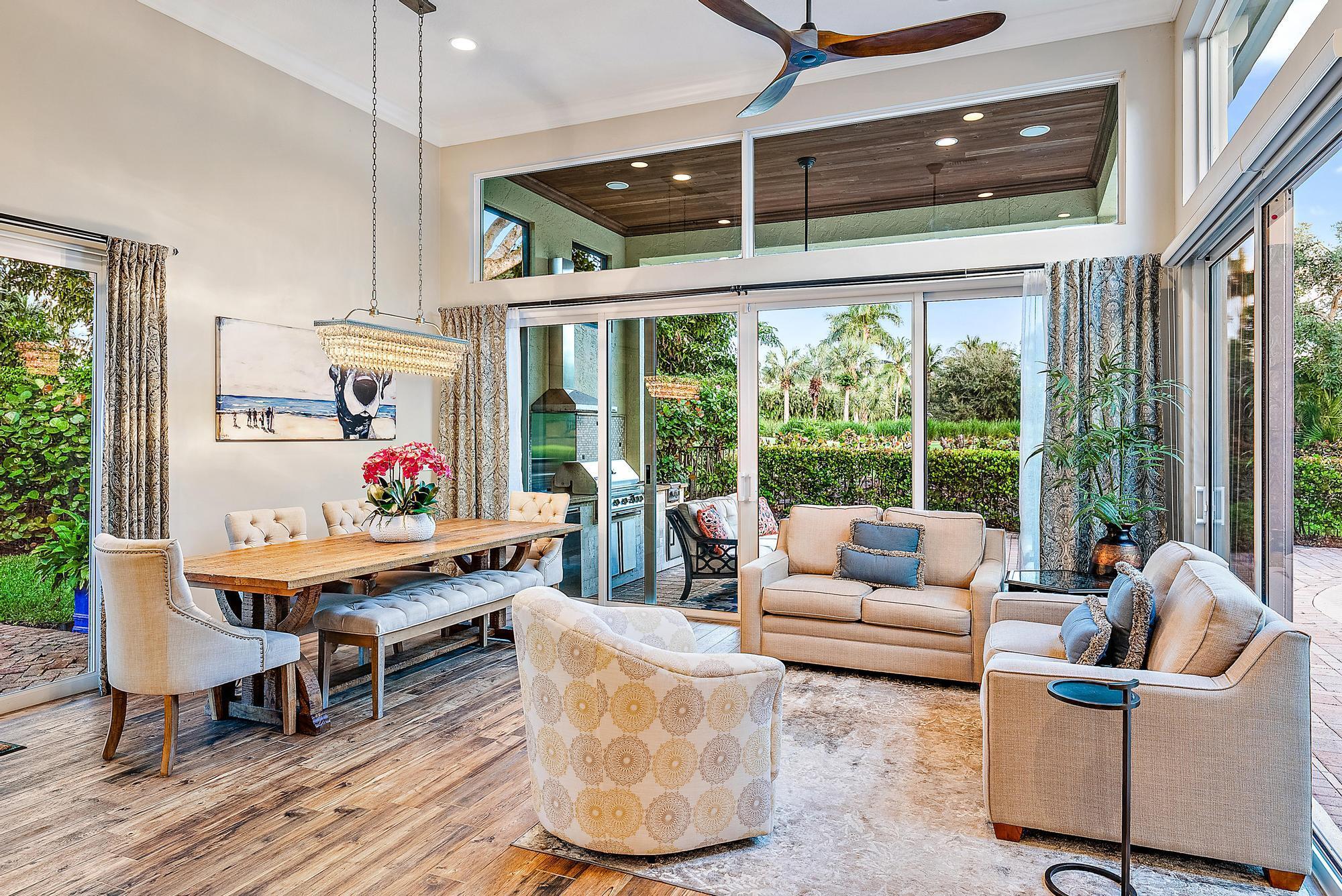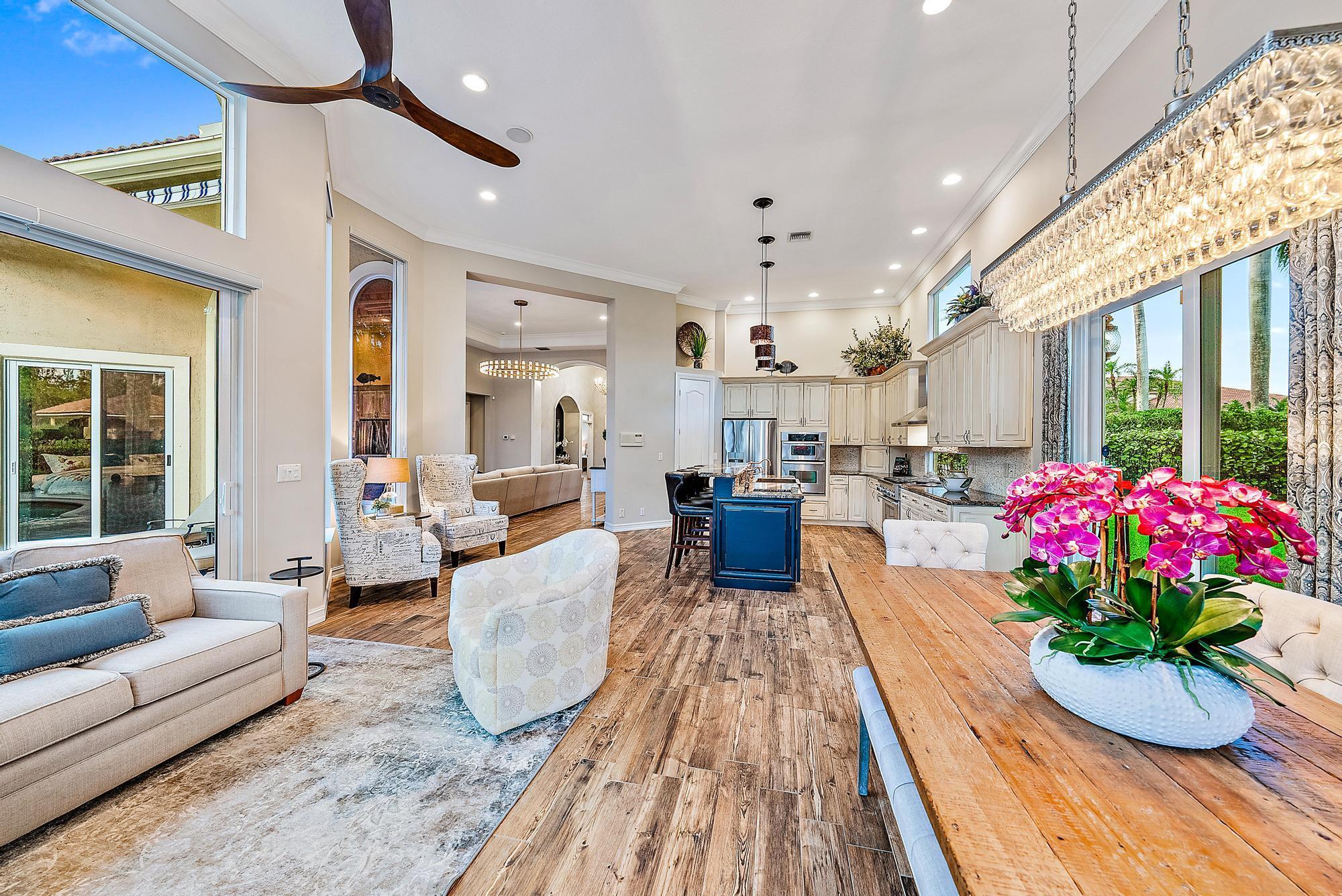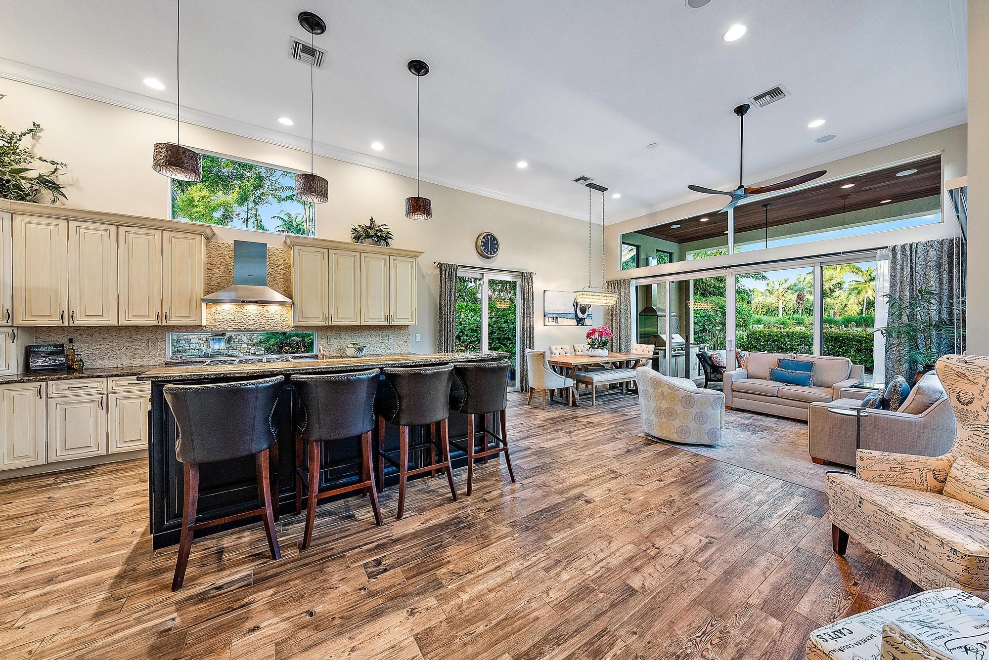Featuring one of the largest lots in Tradition Cove, this one-of-a-kind, FULLY RENOVATED home offers incredible upgrades, luxurious finishes and fixtures. Everything has been done for you. The NEW ROOF was installed in 2023, along with all new IMPACT GLASS throughout, installed in 2023 as well. The magnificent .34-ACRE LOT offers an enormous fenced in side yard and a tranquil stone waterfall that provides a unique focal point from inside the home. The interior has been fully reimagined and beautifully renovated in a warm transitional aesthetic. Featuring Italian porcelain wood-look tile flooring throughout, there is no carpet in this home. Available FULLY FURNISHED with designer curated furnishings.