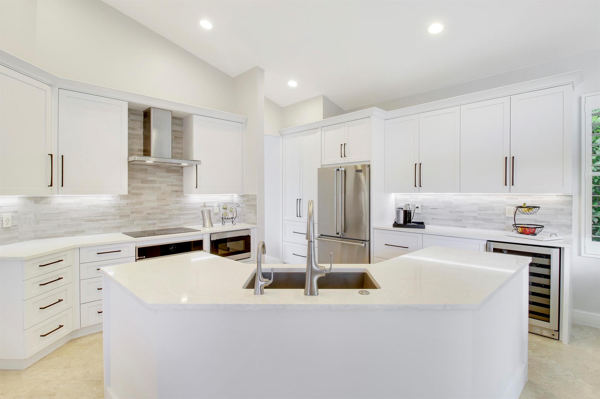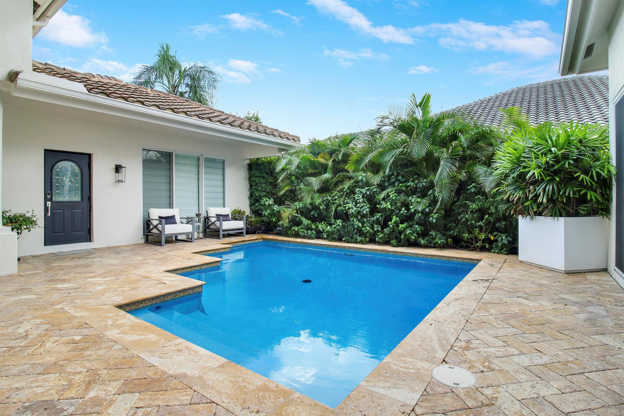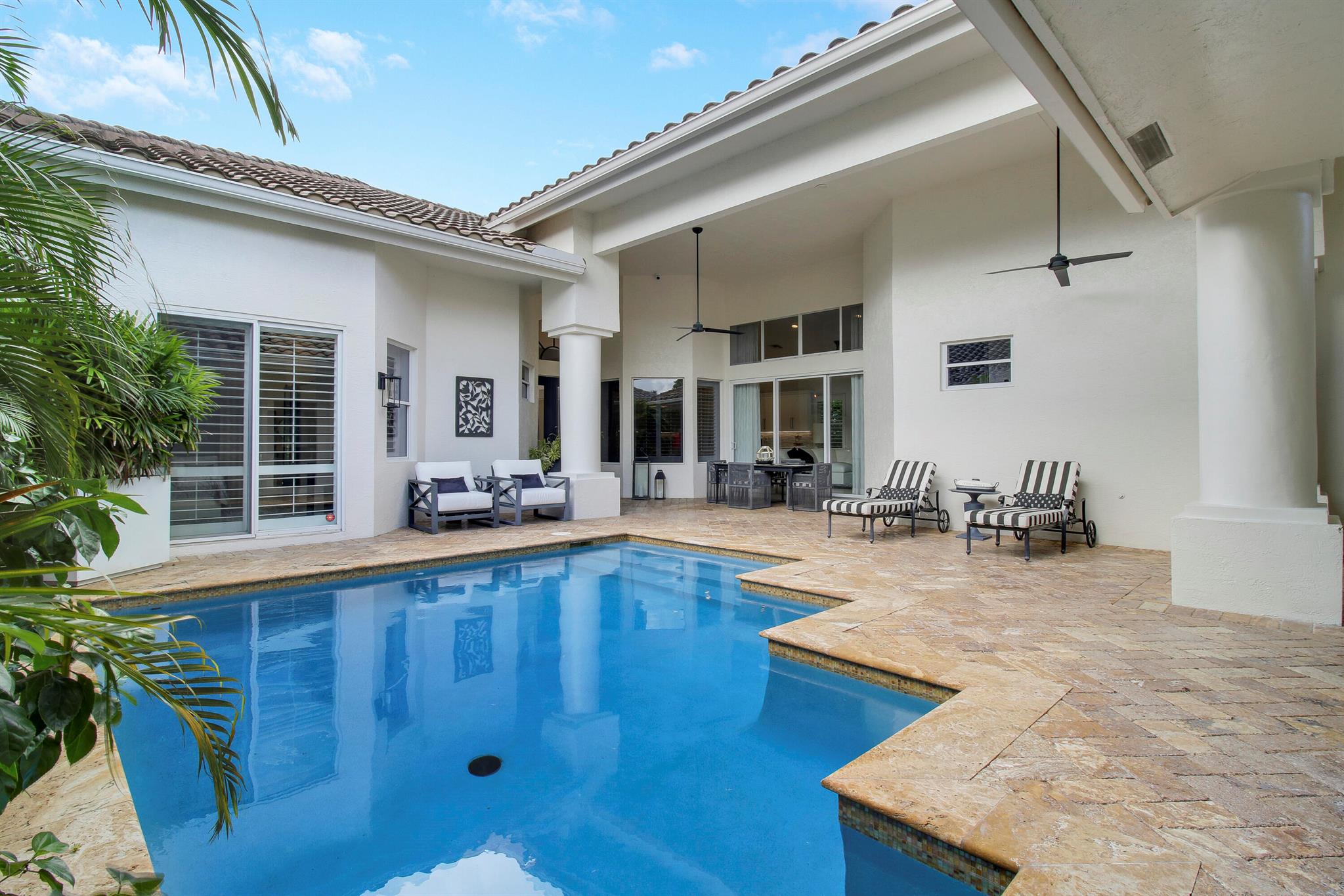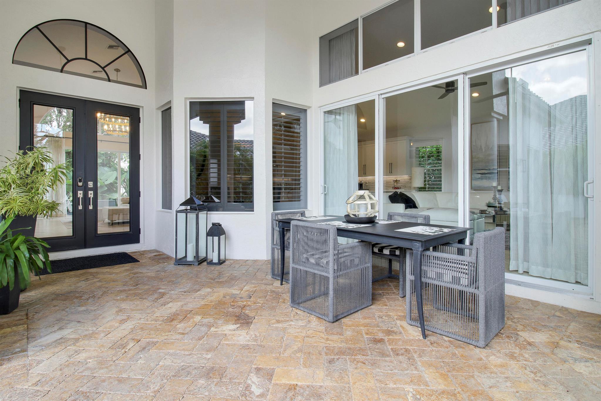 Stunning & private courtyard home is the desired community of La Corniche. No expense has been spared. Open floor plan, brand new kitchen, induction cooktop, stainless steel appliance Viking refrigerator, wine bar. Eat in kitchen, open family room. Amazing primary bedroom, and bath. Walk in shower free standing tub, his, and her sinks. 2 large walk-in -closets. State of the art sound systems throughout the home. New diamond bright pool, salt, /heated pool. new pool equipment. impact sliders. Roof 2015. 2023 impact garage doors, new garage epoxy floor. New landscaping, front courtyard, and backyard.