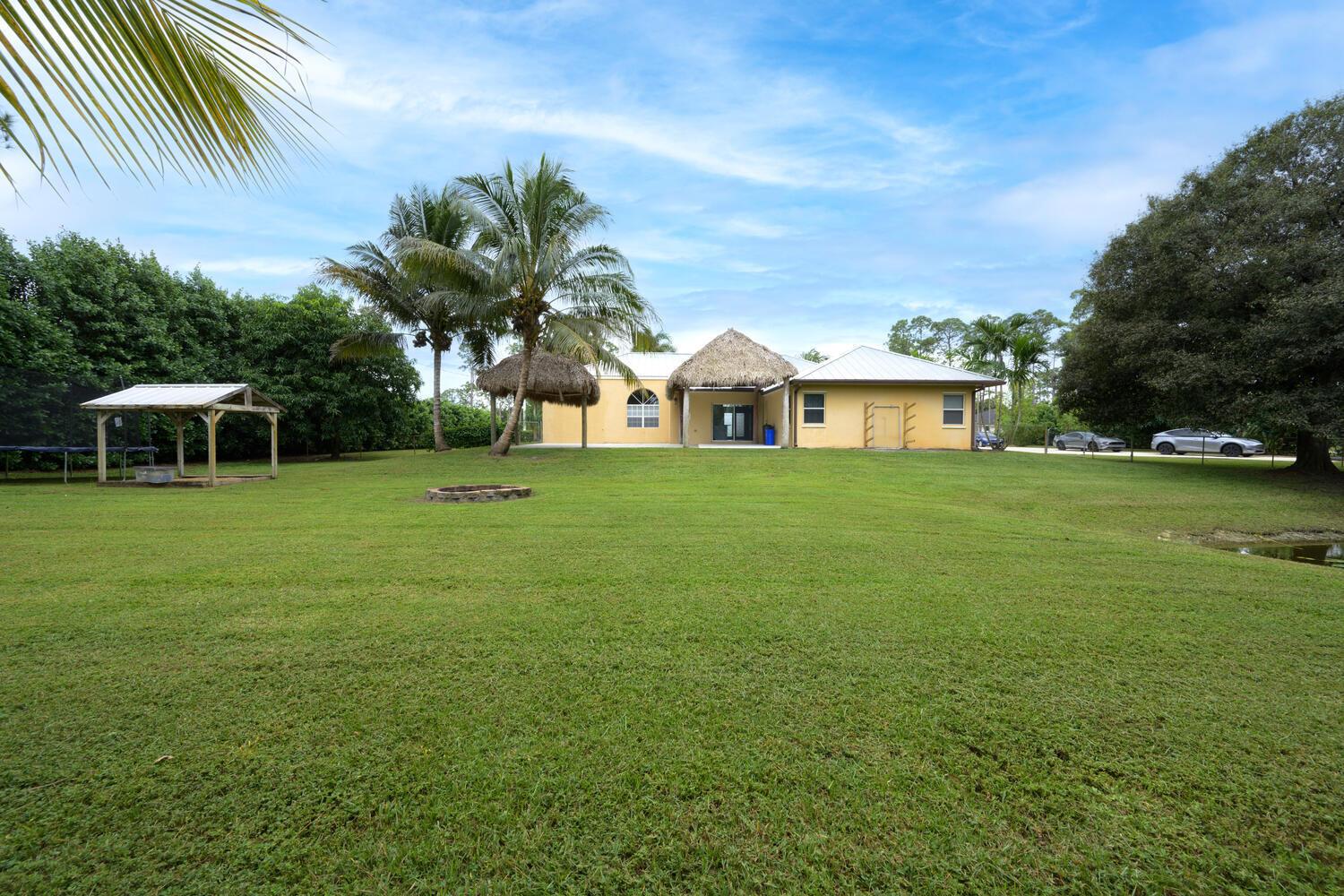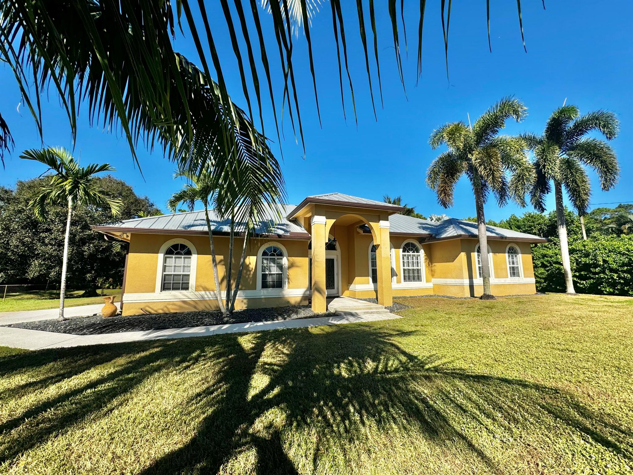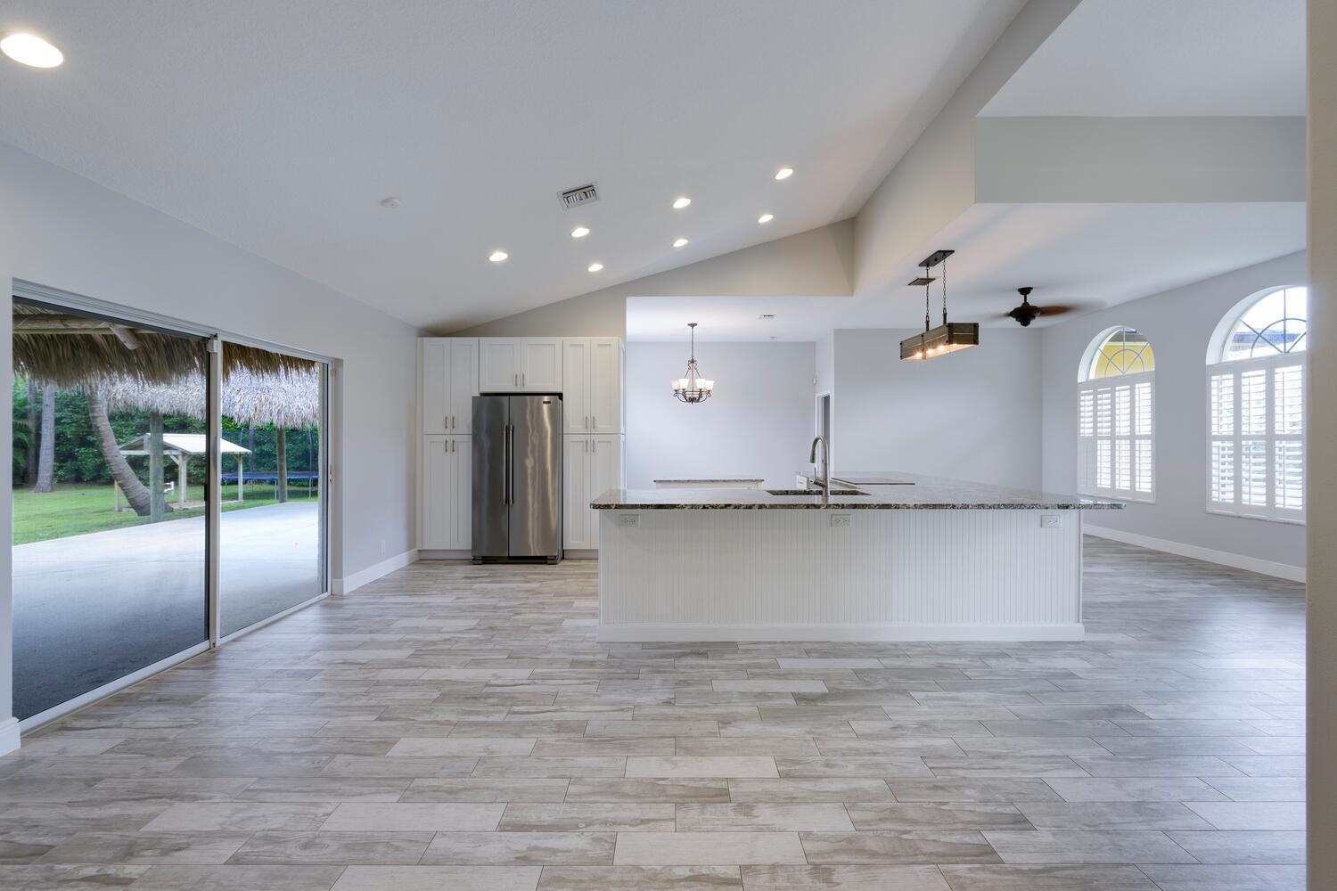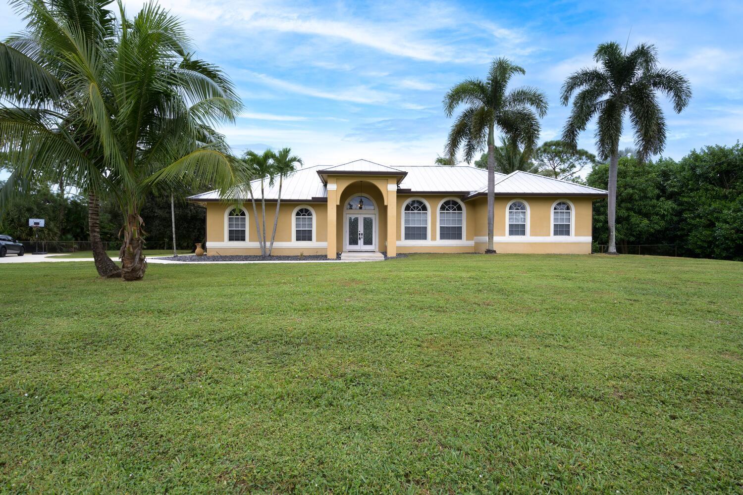 WELCOME HOME to this beautifully upgraded 4 bedroom 2 bathroom house nestled on 1.15 acres in Loxahatchee! Spacious with a newer metal roof installed in 2018 and sleek renovations throughout, this open-concept home is designed for modern living and entertainment. This home features an expansive chef's kitchen with white shaker cabinetry, granite countertops, a cooktop, and brand-new stainless steel appliances.The home's split floor plan offers privacy and functionality, including multiple living spaces, enhanced by vaulted ceilings, ceramic plank tiles throughout, and abundant natural light. The luxurious master suite is a private retreat with a spa-inspired bathroom, complete with a large soaking tub, rainfall shower, granite countertop, a custom mirror, and stacked stone accents.