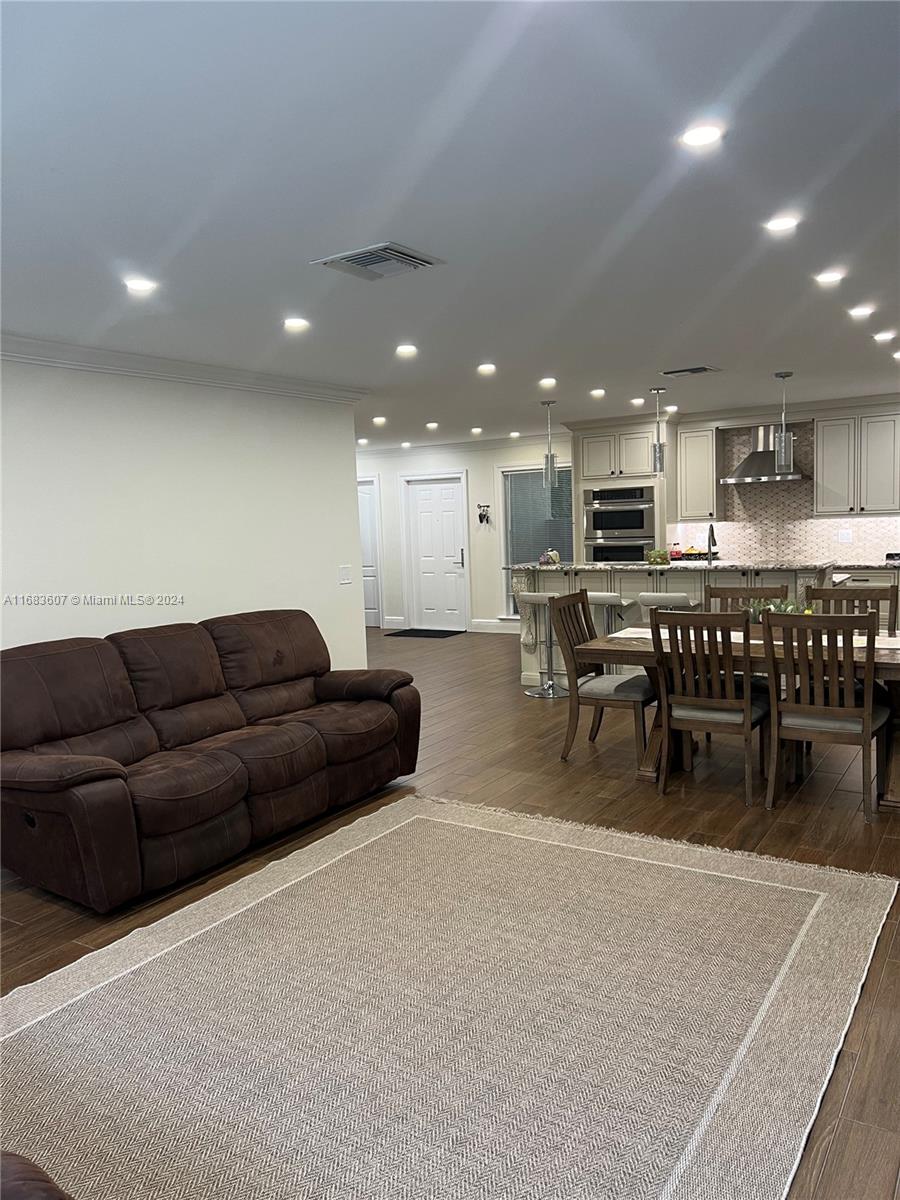 Very spacious 3 bedroom, 1 office and 2 bath pool home. Roof installed in 2020, AC and water heater in 2021, electrical including electrical panel was redone in 2019, all smooth ceiling , no popcorn ceiling here, new LED dimmable high hat lightning, coffered crown moulding in 3 bedrooms, wood plank porcelain tile throughout the house, baseboards, all interior solid doors, 12 feet impact sliding door, built-in wall unit with tv and electric fireplace, fully renovated kitchen with stainless steel appliances, granite countertops, travertine backsplash, wall oven and microwave combo, solid wood and soft closing cabinetry, garage is been used as a gym with mirrored wall, waterproof laminate flooring, extra pantry and cabinets.
