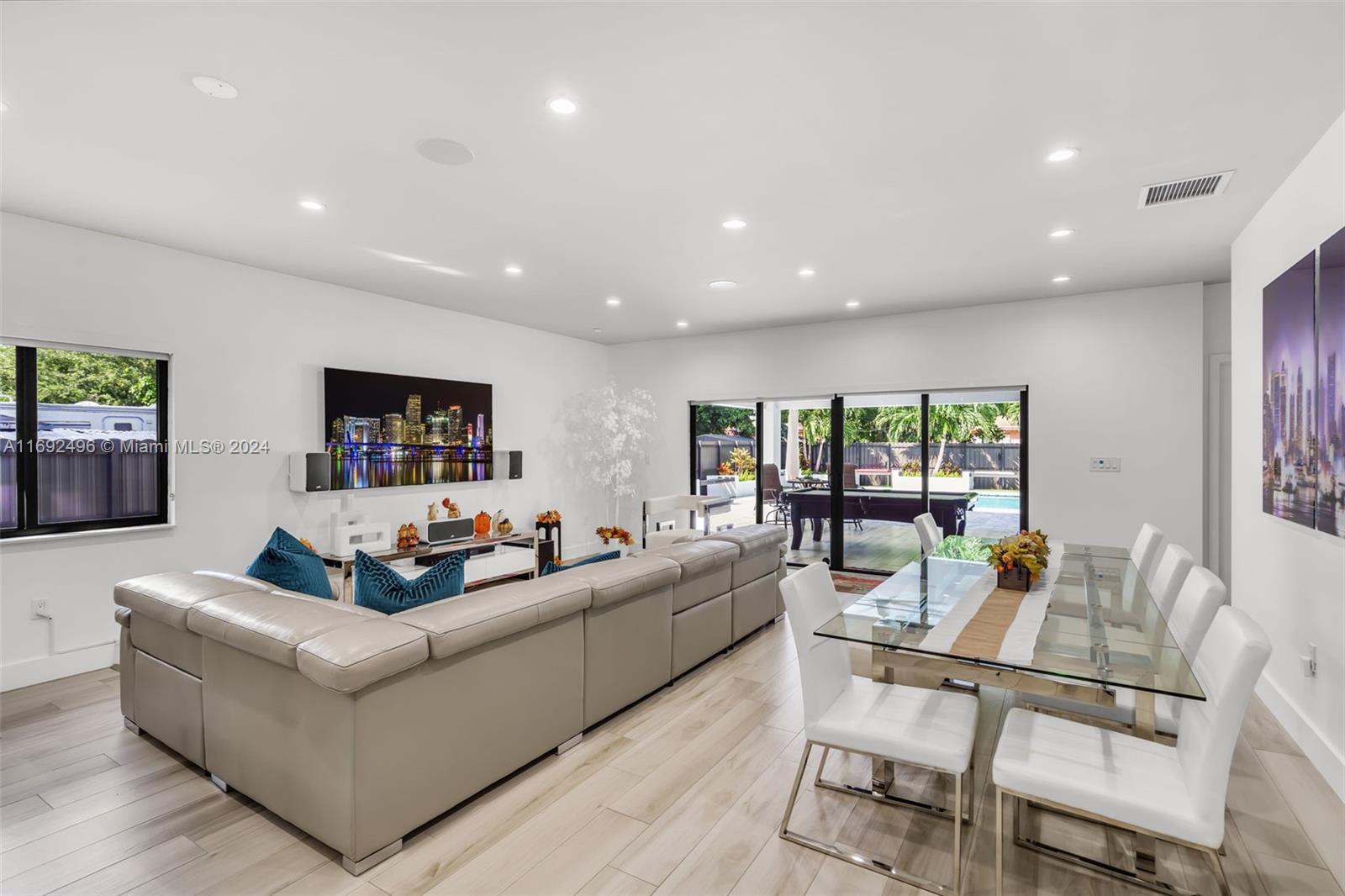 Beautiful 3 bedroom/3 bath built in 2018 w/open floorplan, 30x15 swimming pool, gazebo with built-in outdoor kitchen. Large outdoor area great for entertaining w/plenty of seating. Space on both sides of property for RV and/or boat storage. Large kitchen w/new SS appliances (2023), new A/C unit (2024), impact windows/doors. Laundry room w/new washer and dryer (2023). Large primary suite w/access to backyard/pool, walk-in closet, and large on-suite bathroom with rainfall shower, double sinks, and large tub. New oversized driveway (2024), 1 car garage, and attached storage shed. All furniture is included in the property price, excluding audio and video.