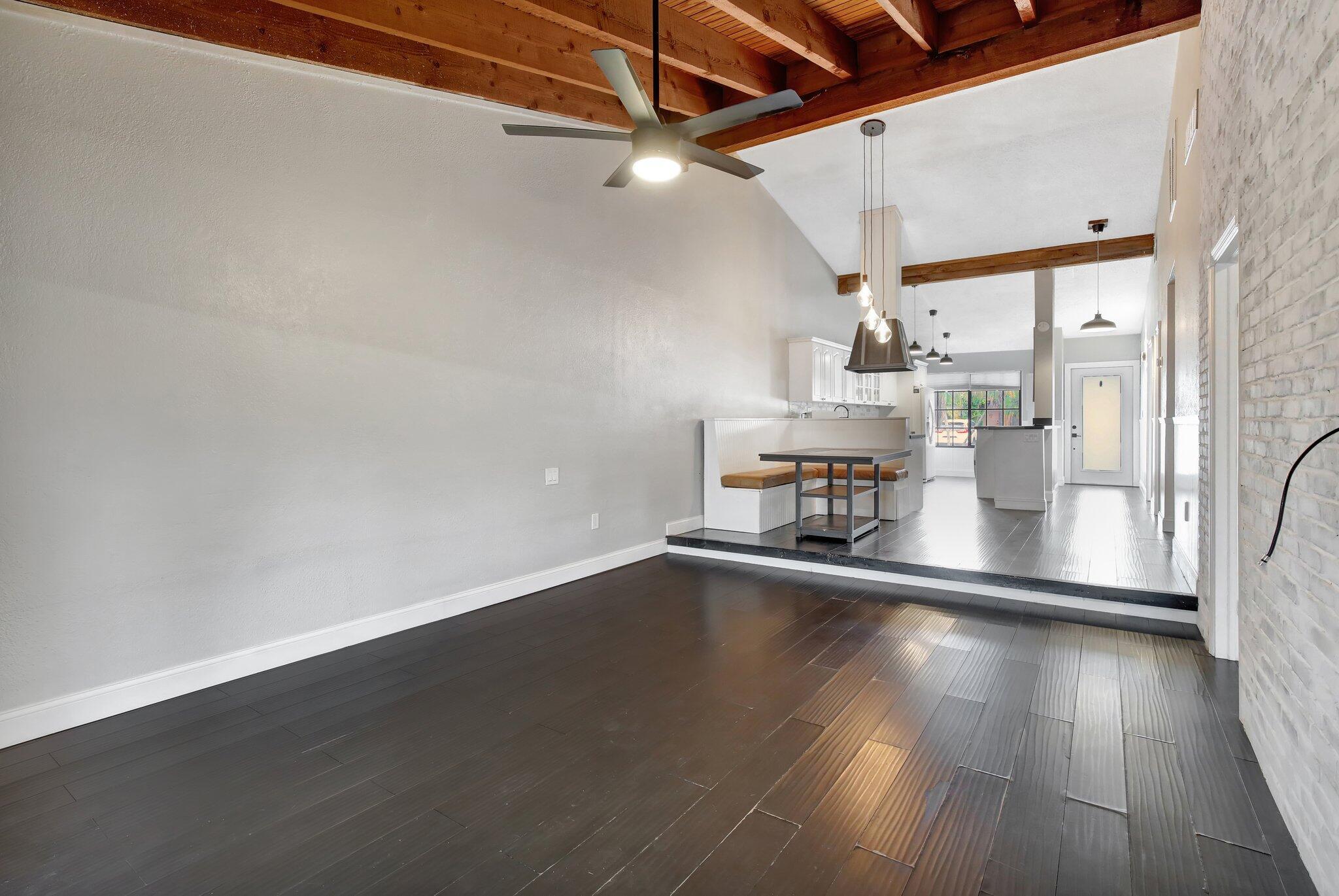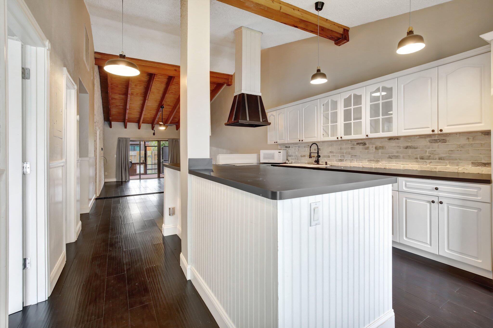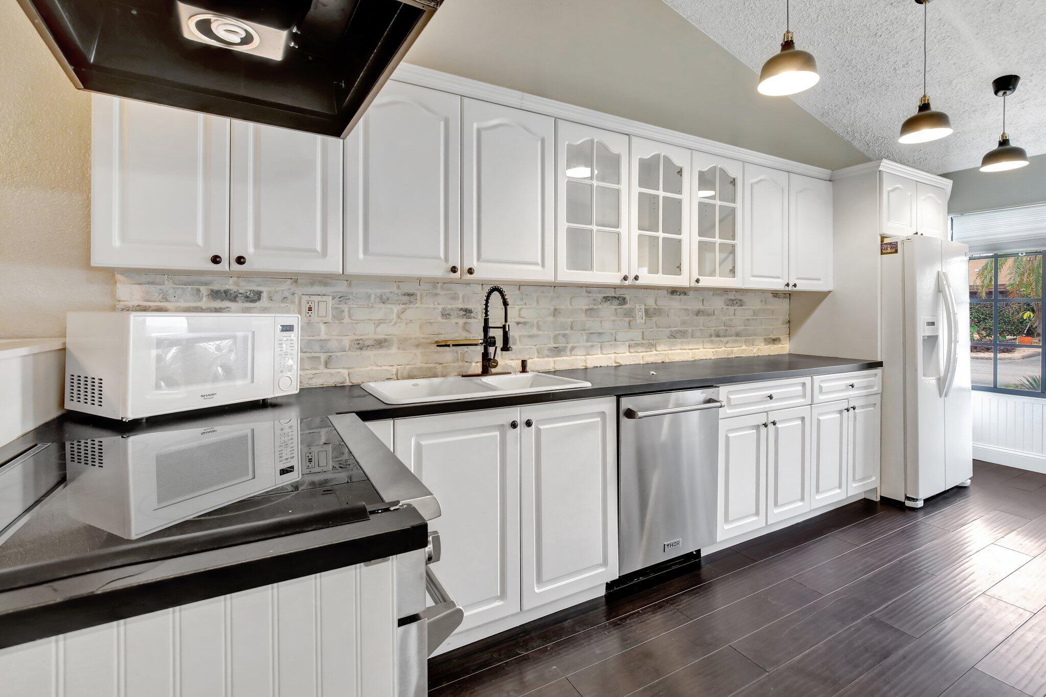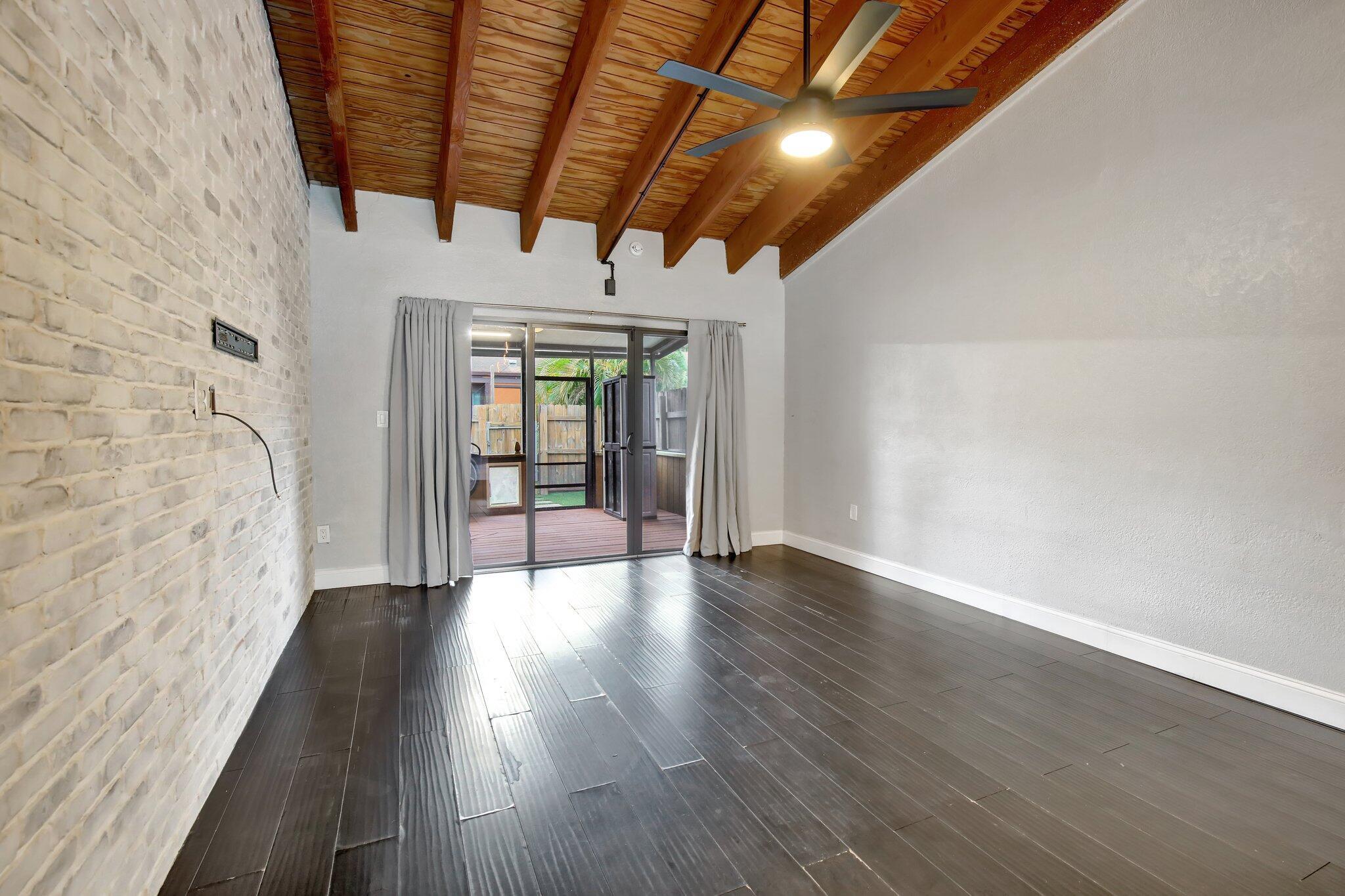 Charming 2-bedroom, 2-bathroom villa/townhouse nestled in the vibrant heart of Pembroke Pines. This prime location offers unparalleled convenience, with easy access to highways, shopping centers, parks, and a variety of dining options. The home boasts a stylish red brick backsplash and a matching feature wall in the living room, complemented by vaulted ceilings adorned with elegant wood accents for a timeless appeal. The guest bathroom has been fully remodeled, adding a modern touch. Both bedrooms feature custom walk-in closets with track lighting and reinforced attic spaces for extra storage. Enjoy the low-maintenance front and back yards, creating your own private oasis perfect for relaxation and entertainment. With impact windows and doors throughout, this home is secure!