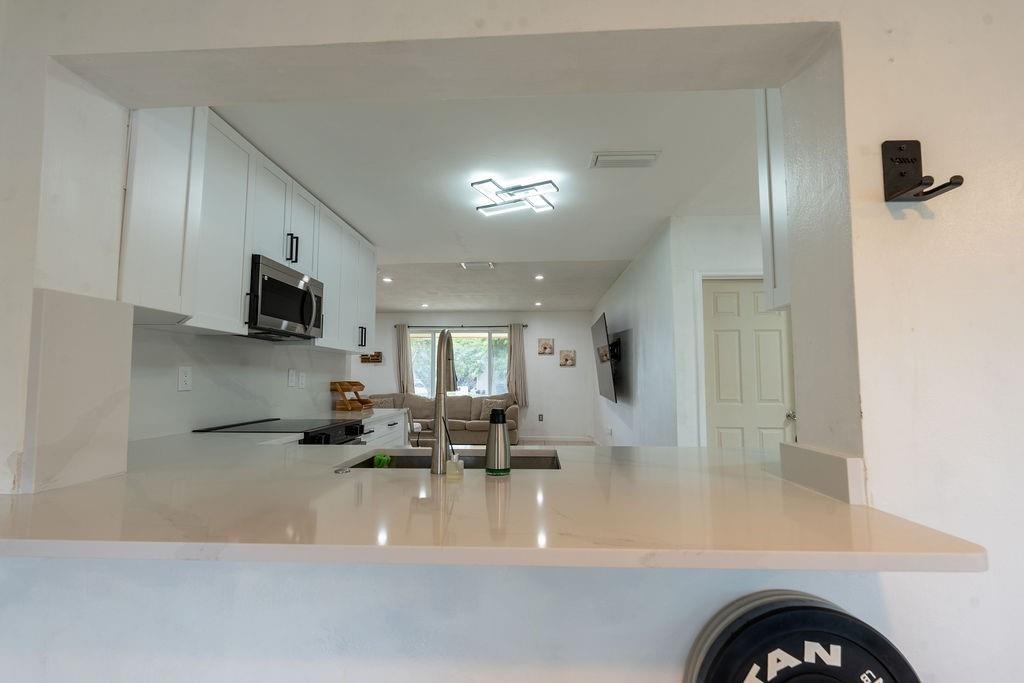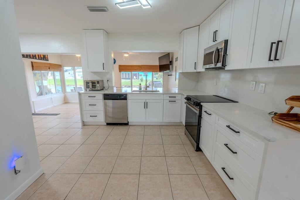 Gorgeous Fully Upgraded Single Family Home with 3 Beds/2 Baths/1 Car Garage, **PLUS A BONUS Spacious Family Room** (easily convert to 4th bedroom) Freshly painted exterior perfectly matches new enlarged driveway, Impact Windows & Doors, Solar Panels (Save $$$ instantly), Gutters, Newer AC. Nice sized living room with an Open renovated kitchen with white custom cabinets & countertops with lots of space & storage, ALL stainless-steel appliances, Primary bed on-suite bath & 2nd bath beautifully remodeled. Relax in your family room & enjoy the amazing water view. Entertain in your backyard! Nestled in a quiet neighborhood, Extremely Low Association fee, Covers lawn, Community Pool. Close to shopping, parks, schools.