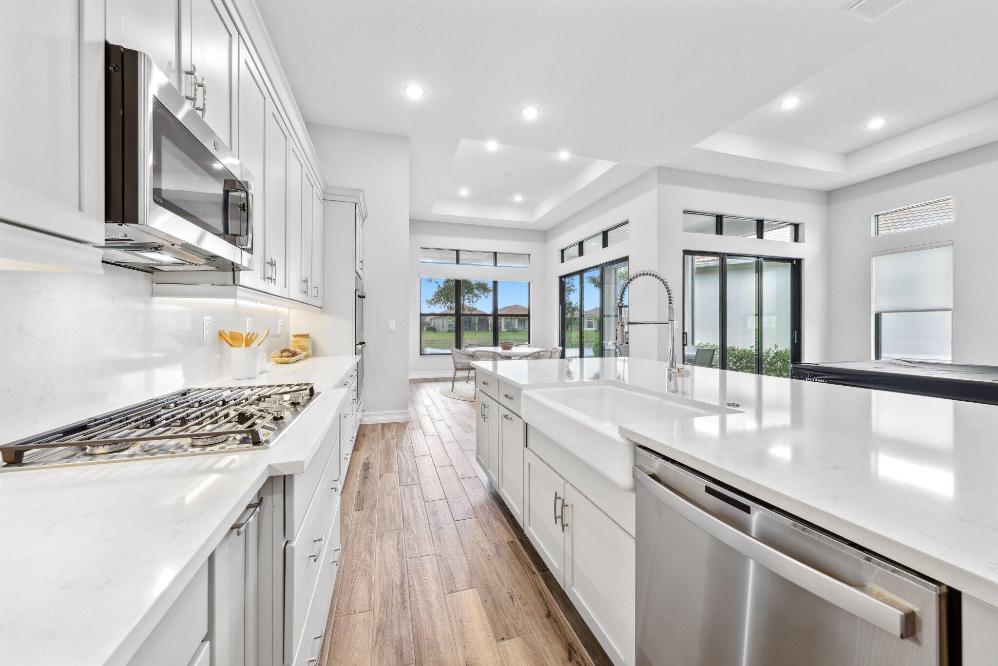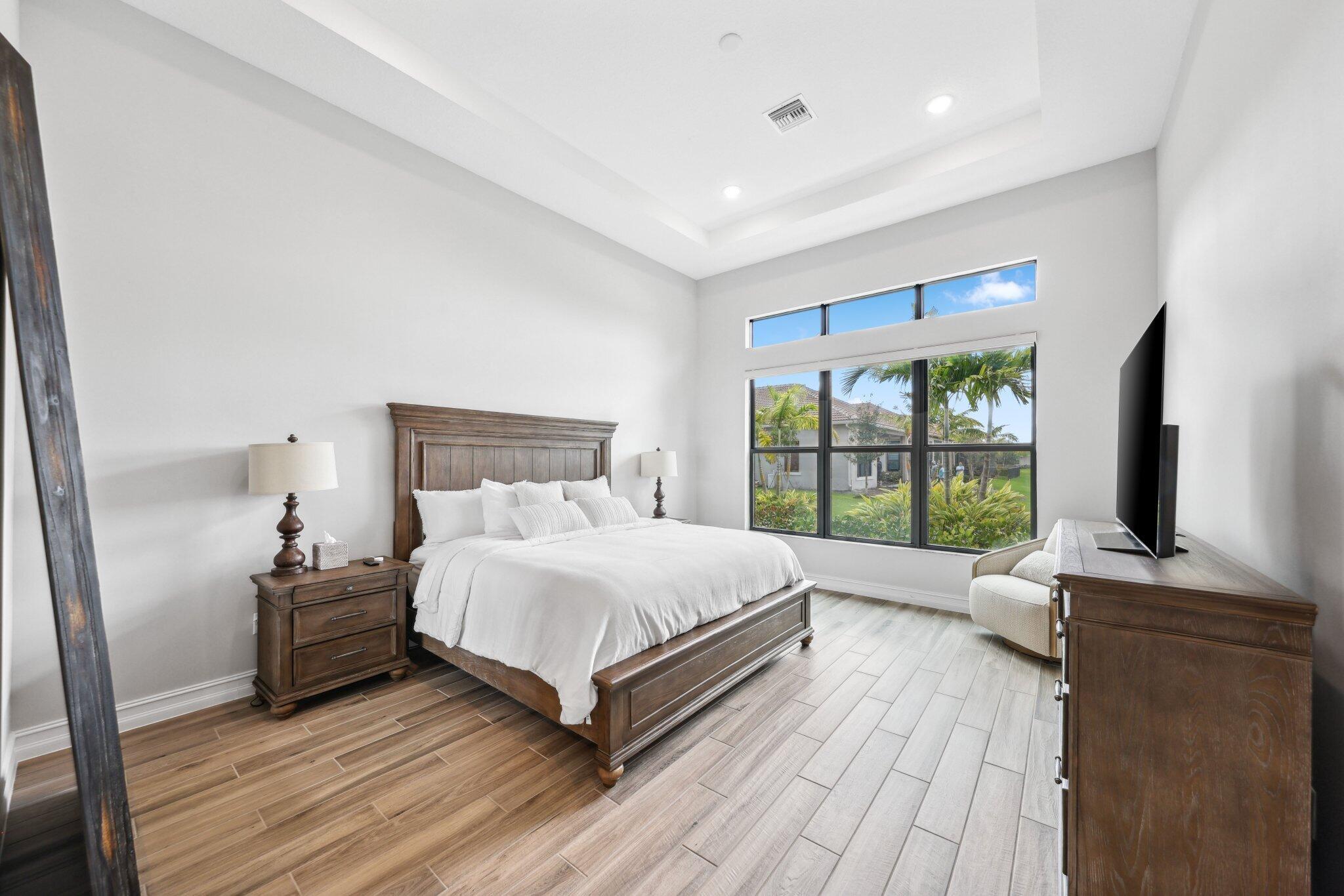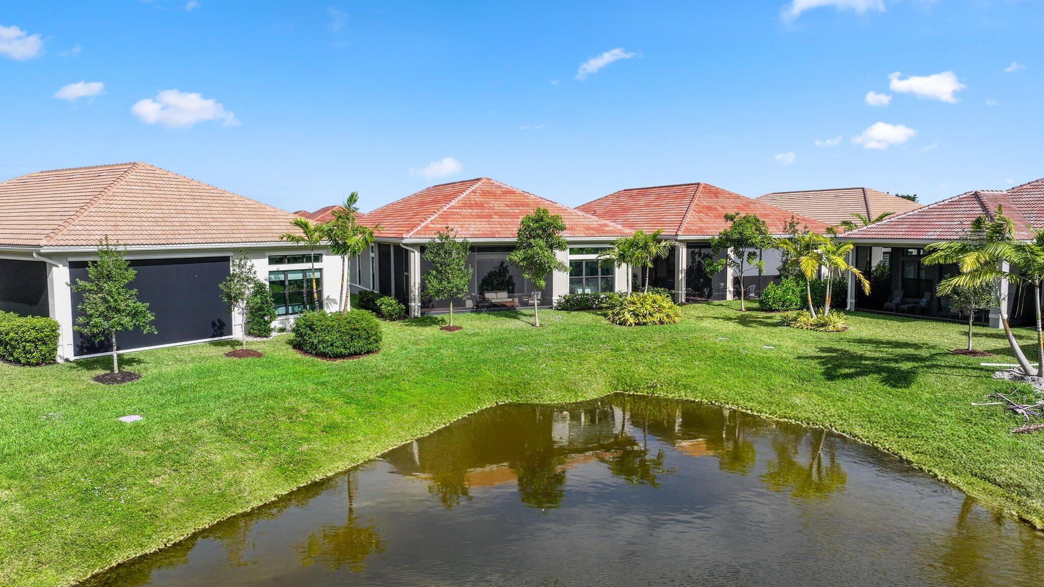 Welcome to your dream home in Four Seasons Parkland. This elegant waterfront property offers a serene escape with stunning views. This Cerelia model residence features porcelain plank flooring throughout, enhancing its neutral interiors. With 2 bedrooms, 2.5 baths, a den, and a bonus room, there's ample space for relaxation and entertainment.The highly upgraded chef's kitchen is a culinary delight, boasting quartz countertops, double ovens, a farmhouse sink and stunning cabinetry. Trey ceilings add a touch of sophistication, while custom closets and window treatments provide convenience and style. Enjoy peaceful mornings or evenings in the screened-in lanai, perfect for taking in the tranquil water views. This home is a true gem, offering luxury and comfort in a picturesque setting.