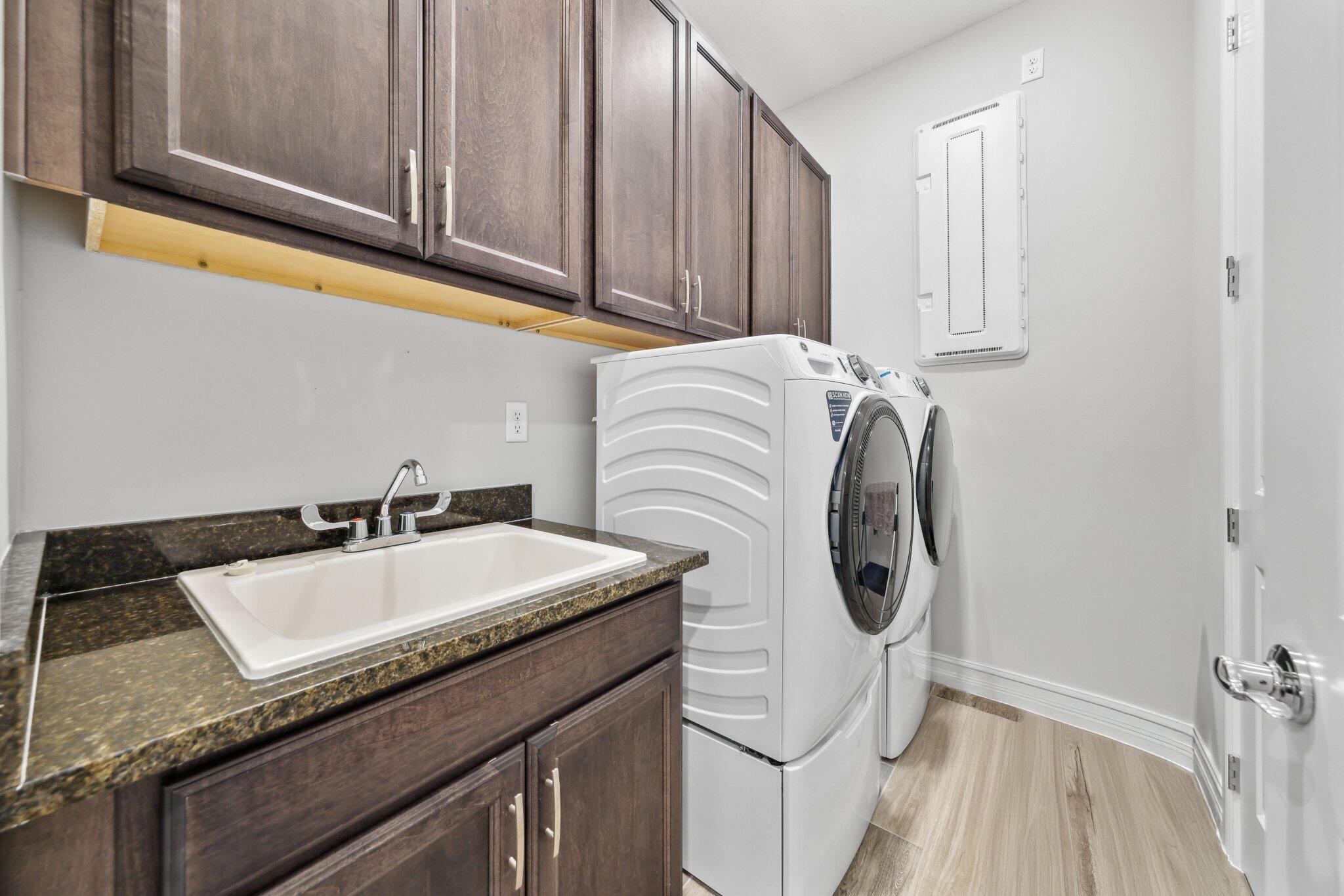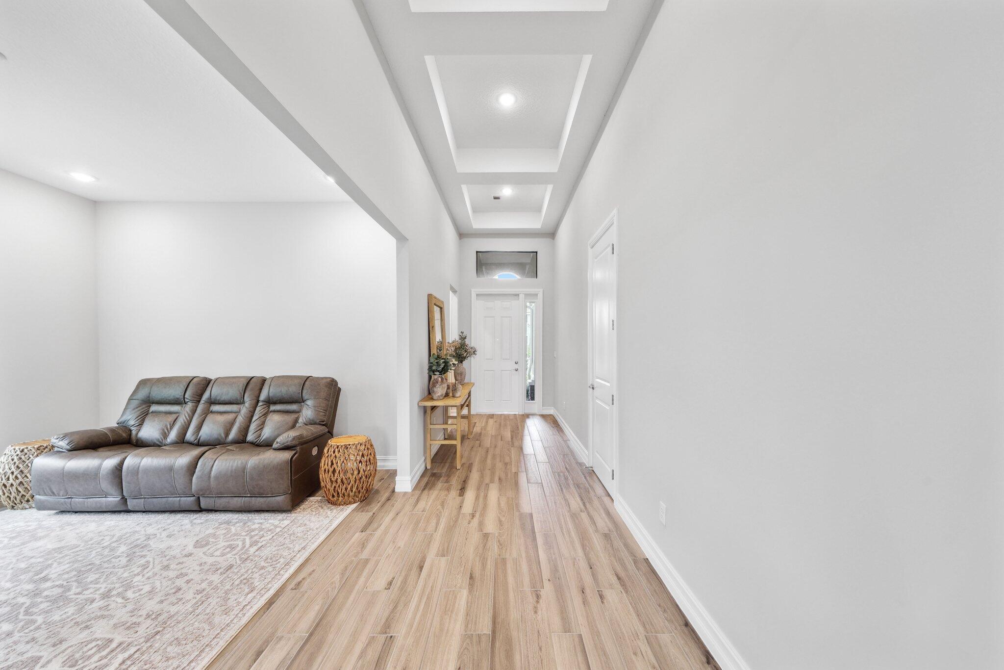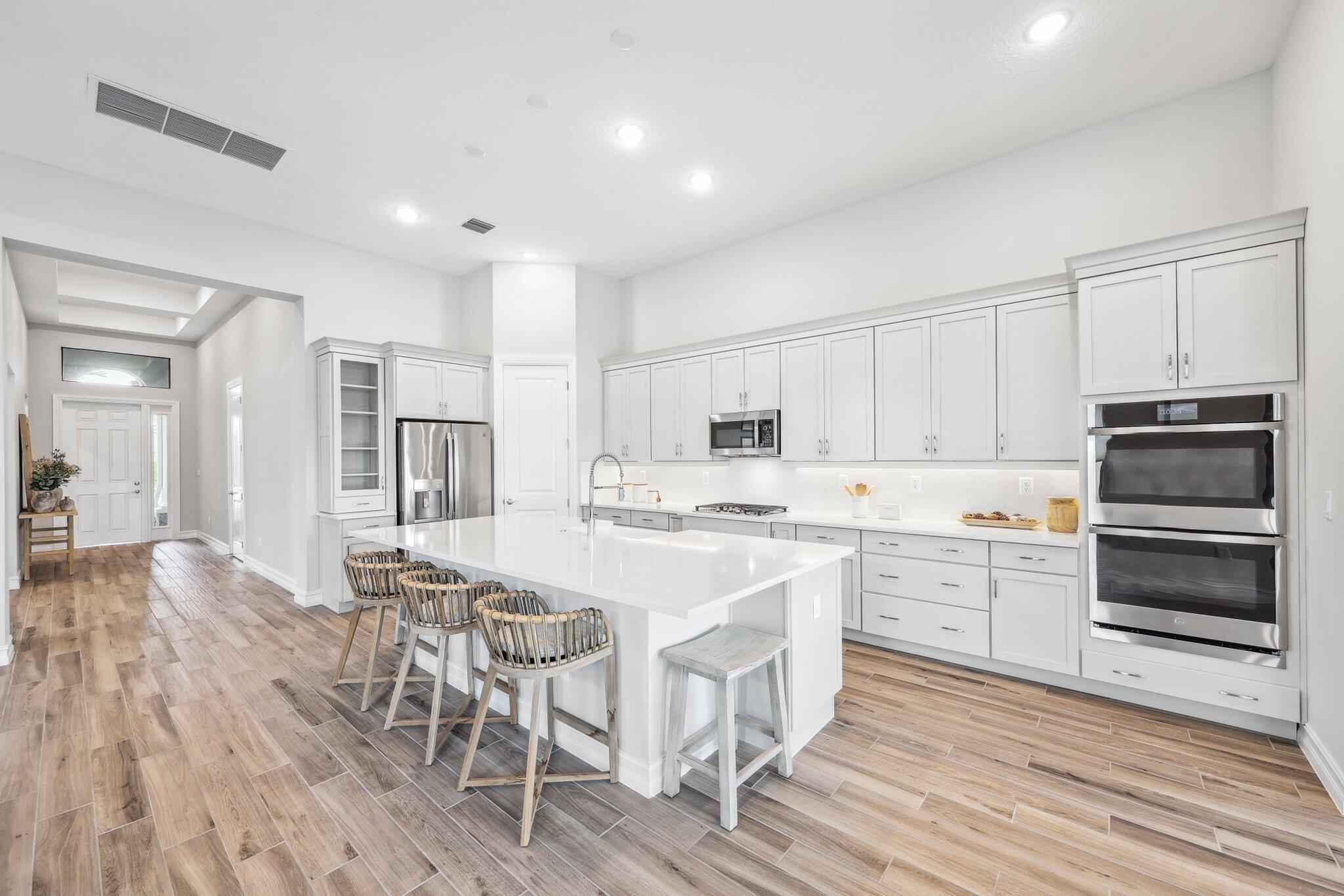 Welcome to your dream home in Four Seasons Parkland. This elegant waterfront property offers a serene escape with stunning views. This Cerelia model residence features porcelain plank flooring throughout, enhancing its neutral interiors. With 2 bedrooms, 2.5 baths, a den, and a bonus room, there's ample space for relaxation and entertainment.The highly upgraded chef's kitchen is a culinary delight, boasting quartz countertops, double ovens, a farmhouse sink and stunning cabinetry. Trey ceilings add a touch of sophistication, while custom closets and window treatments provide convenience and style. Enjoy peaceful mornings or evenings in the screened-in lanai, perfect for taking in the tranquil water views. This home is a true gem, offering luxury and comfort in a picturesque setting.