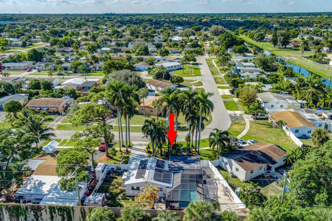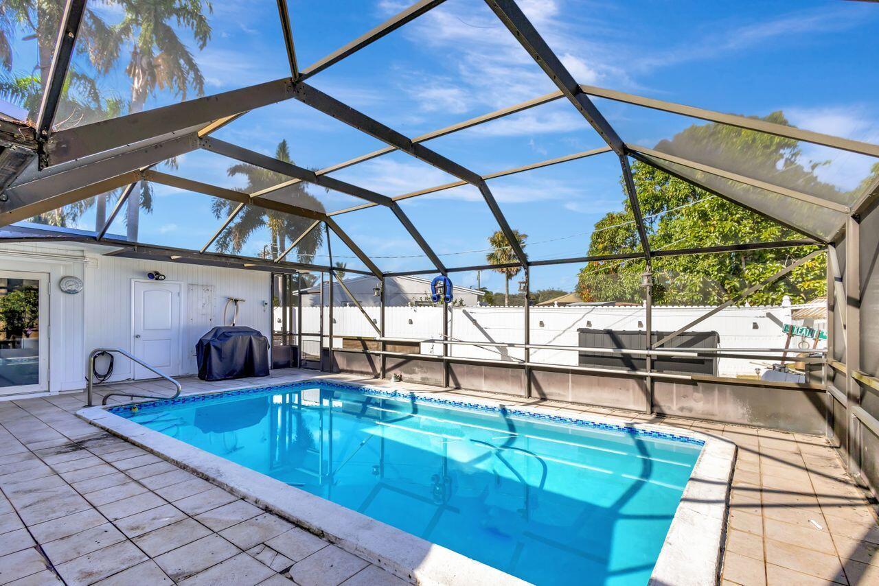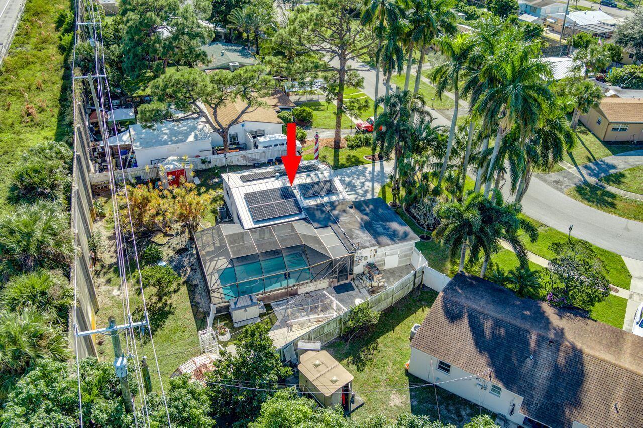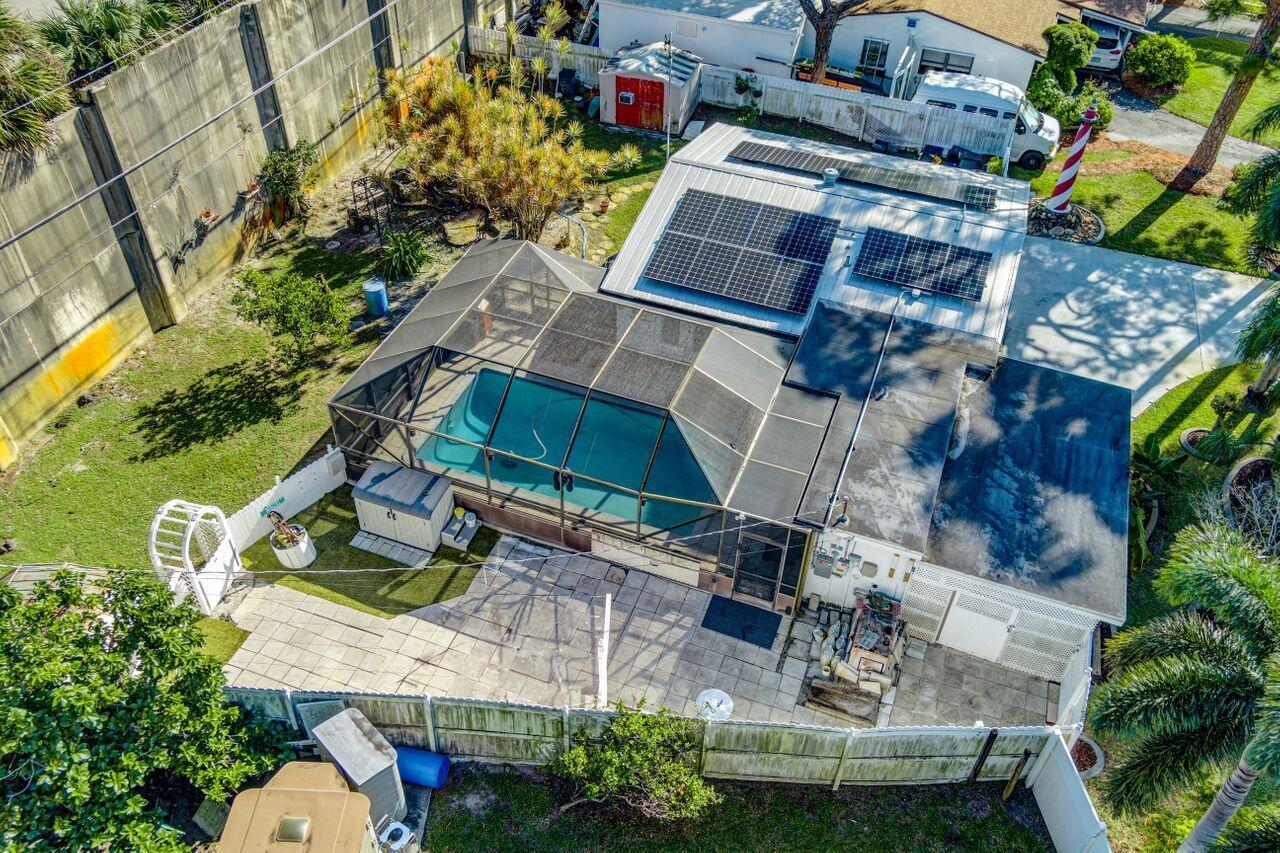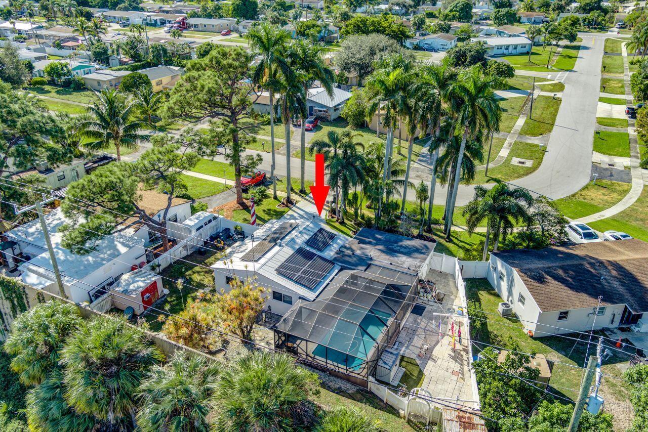 Welcome to your dream home! This beautiful 2-bedroom, 1-bathroom gem is nestled on a spacious 1/5 of an acre in The Palm Beach Square Community in Palm Beach Gardens. Offering ample space and privacy. Enjoy cooking in the newly renovated kitchen, designed with both style and functionality in mind. It features modern appliances, elegant countertops, and plenty of storage. Feel safe and secure with impact windows installed throughout the home, providing protection against extreme weather while adding a touch of modern elegance. The metal roof, equipped with solar panels, is less than three years old. Benefit from energy efficiency and lower utility bills while contributing to a sustainable environment. Dive into your private screened-in pool, perfect for relaxation and entertaining guests,