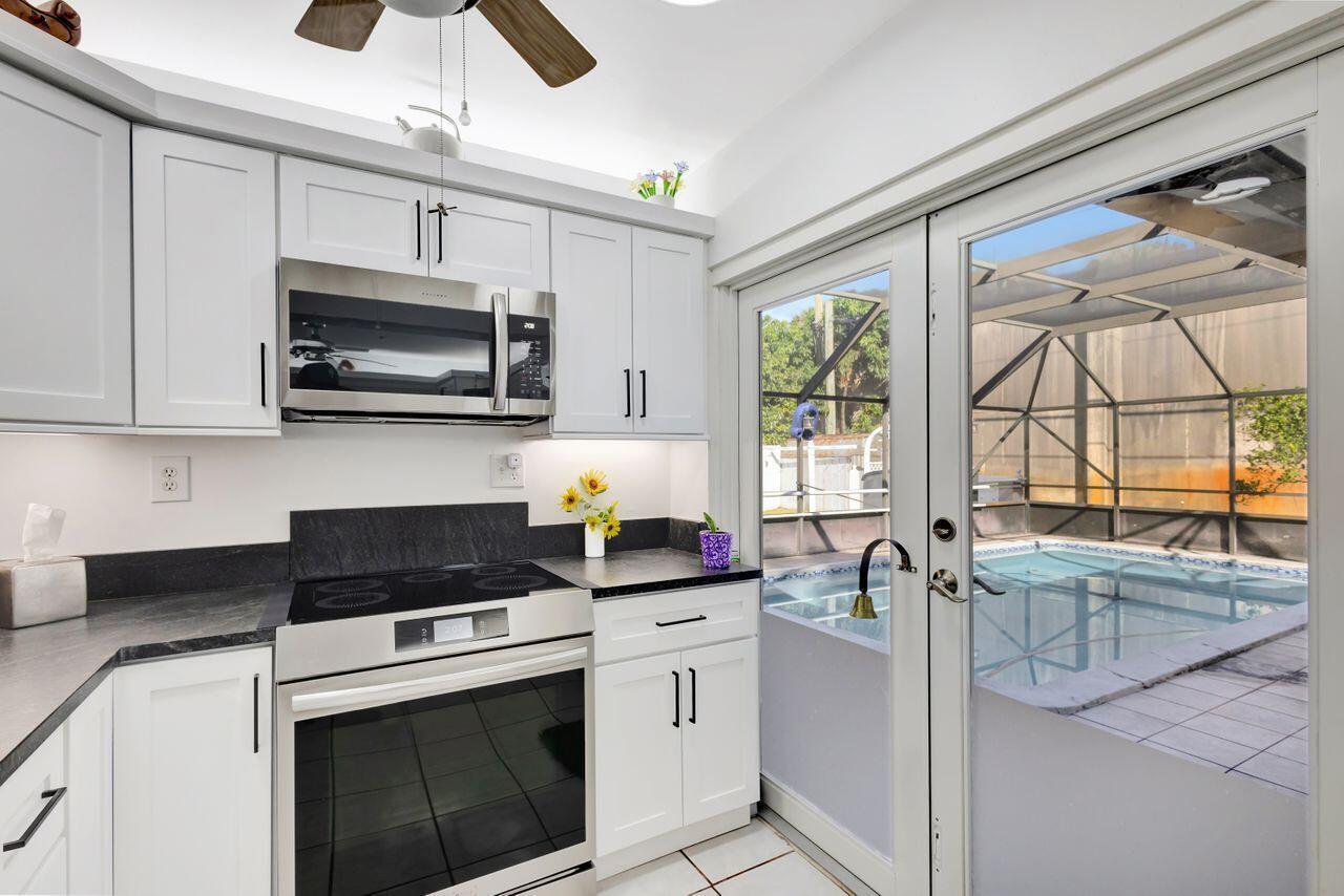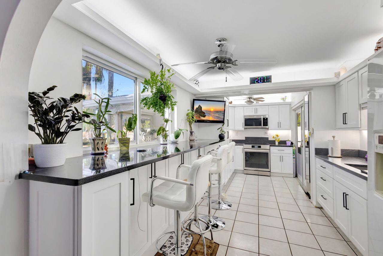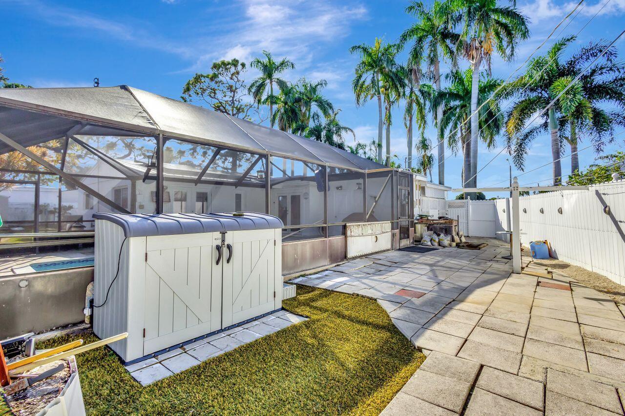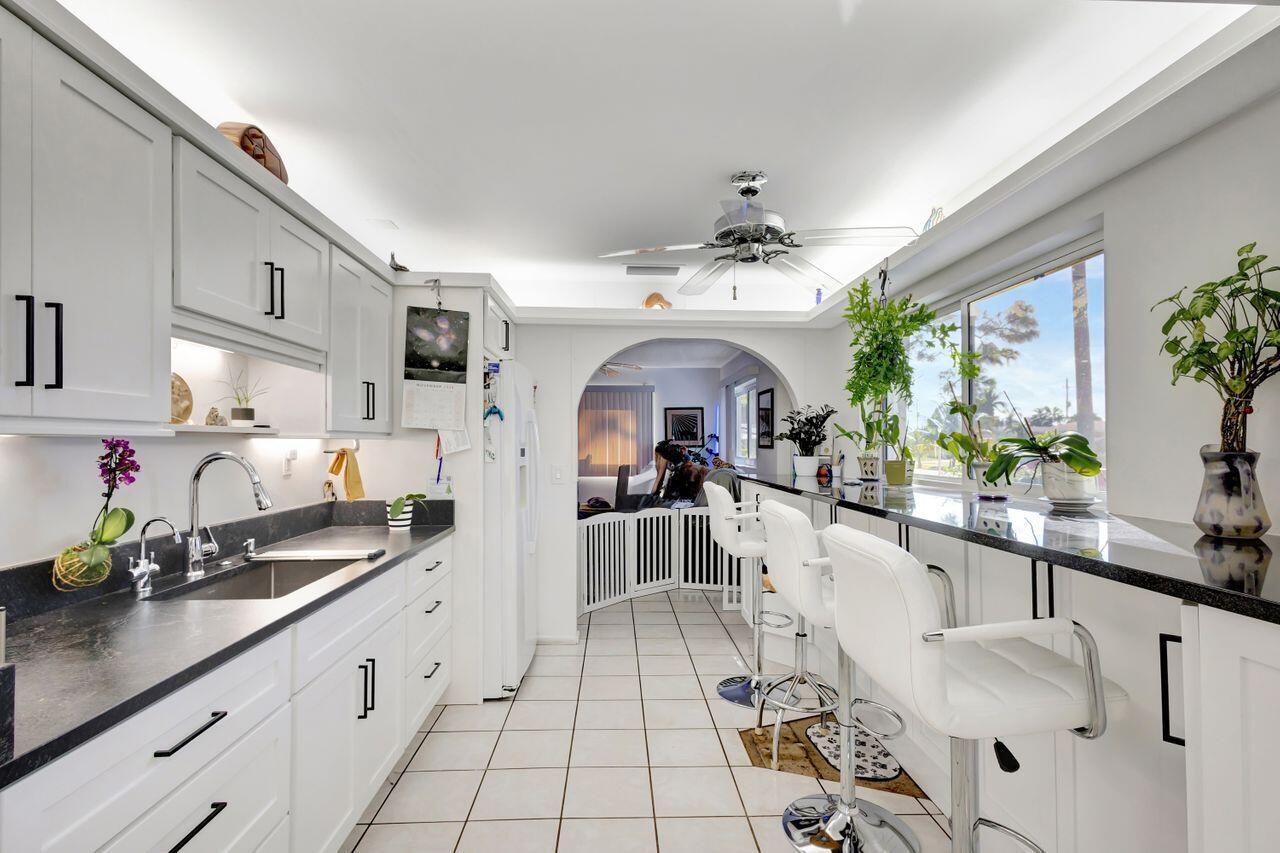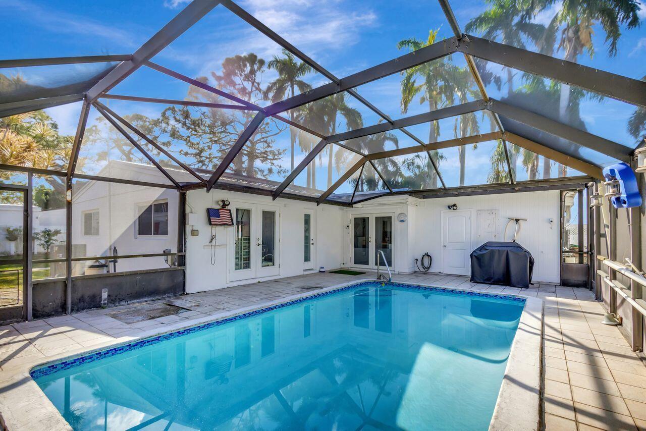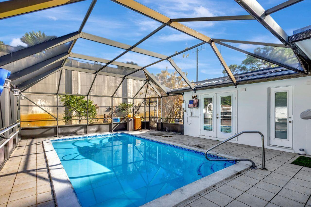 Welcome to your dream home! This beautiful 2-bedroom, 1-bathroom gem is nestled on a spacious 1/5 of an acre in The Palm Beach Square Community in Palm Beach Gardens. Offering ample space and privacy. Enjoy cooking in the newly renovated kitchen, designed with both style and functionality in mind. It features modern appliances, elegant countertops, and plenty of storage. Feel safe and secure with impact windows installed throughout the home, providing protection against extreme weather while adding a touch of modern elegance. The metal roof, equipped with solar panels, is less than three years old. Benefit from energy efficiency and lower utility bills while contributing to a sustainable environment. Dive into your private screened-in pool, perfect for relaxation and entertaining guests,